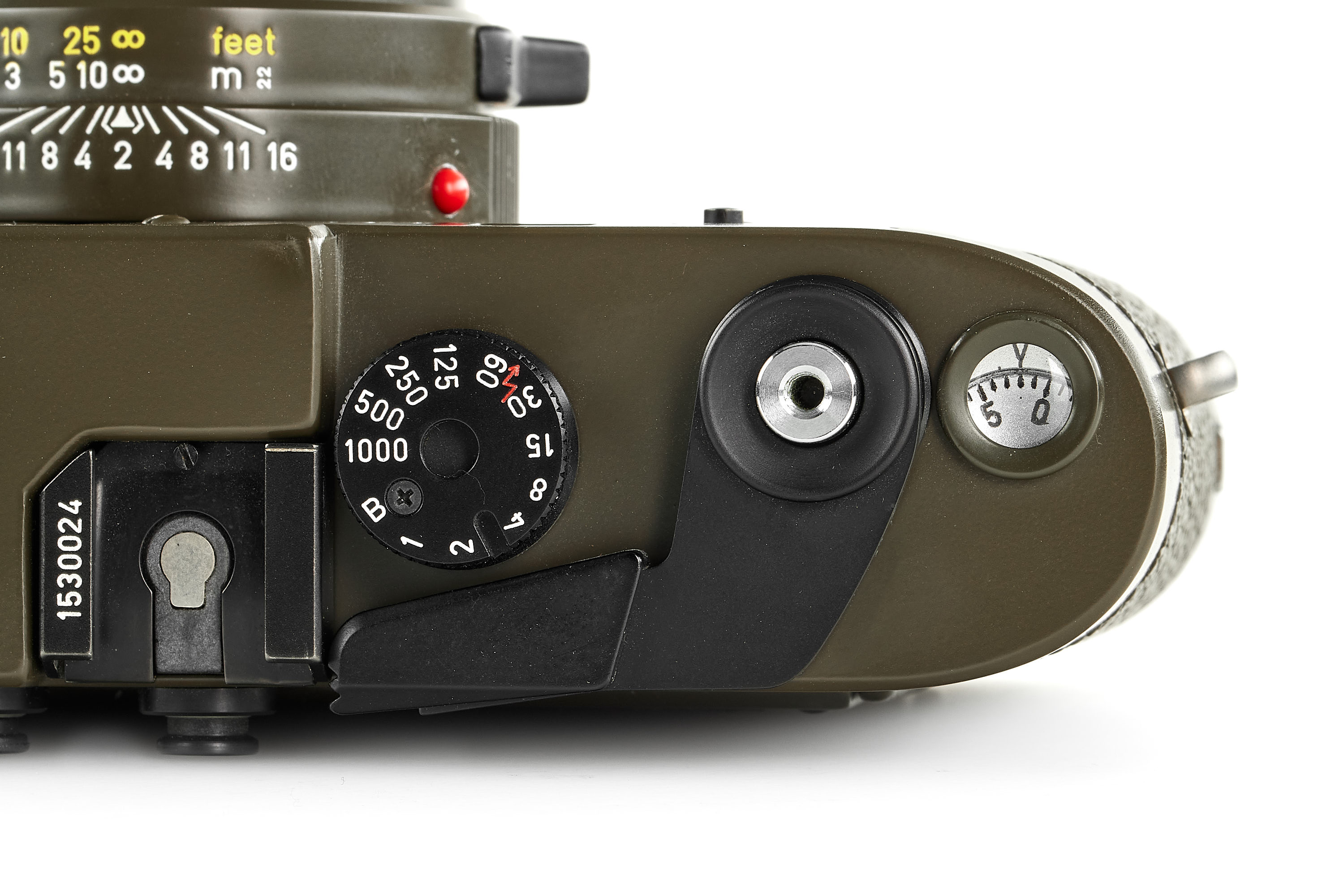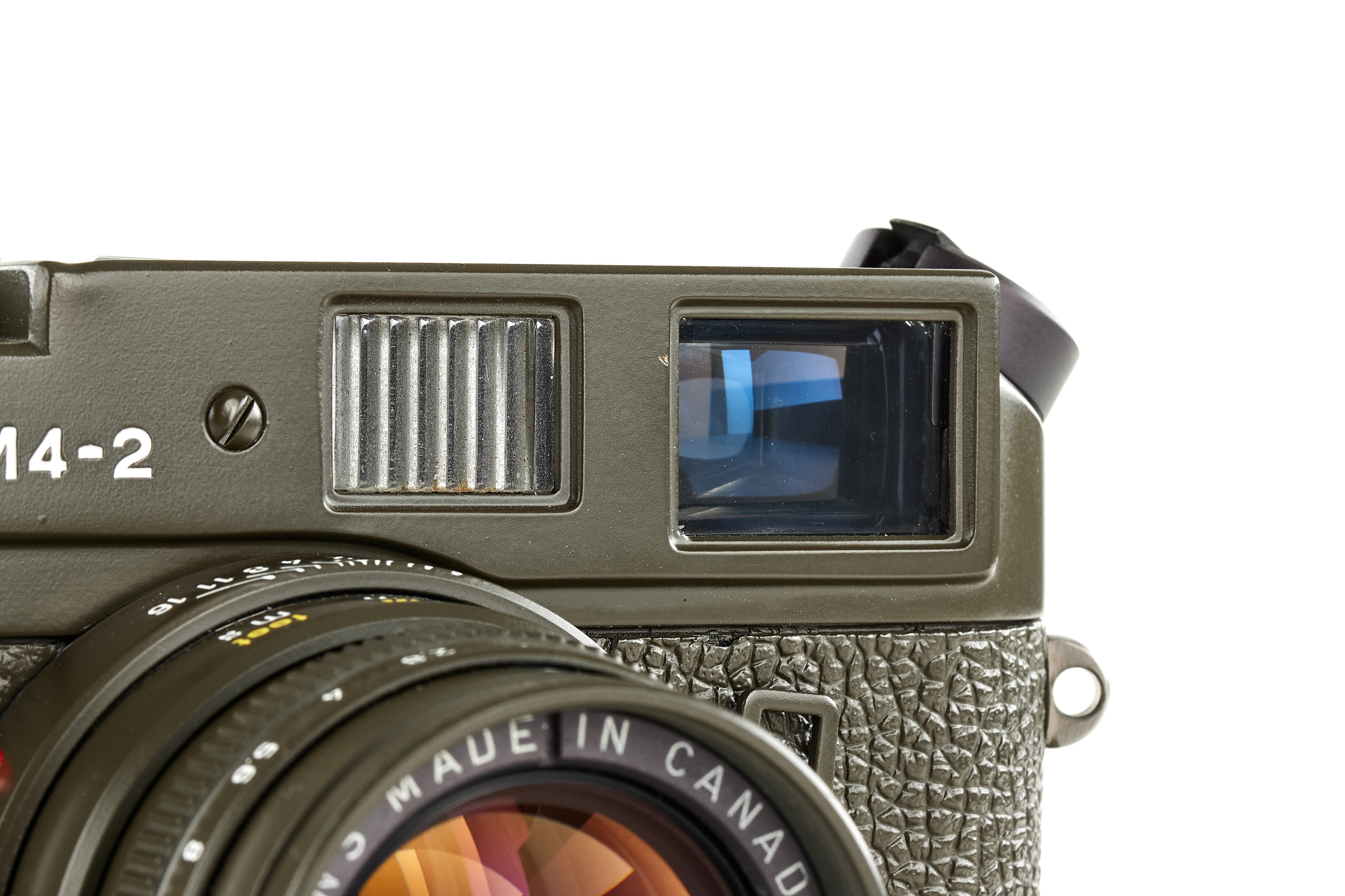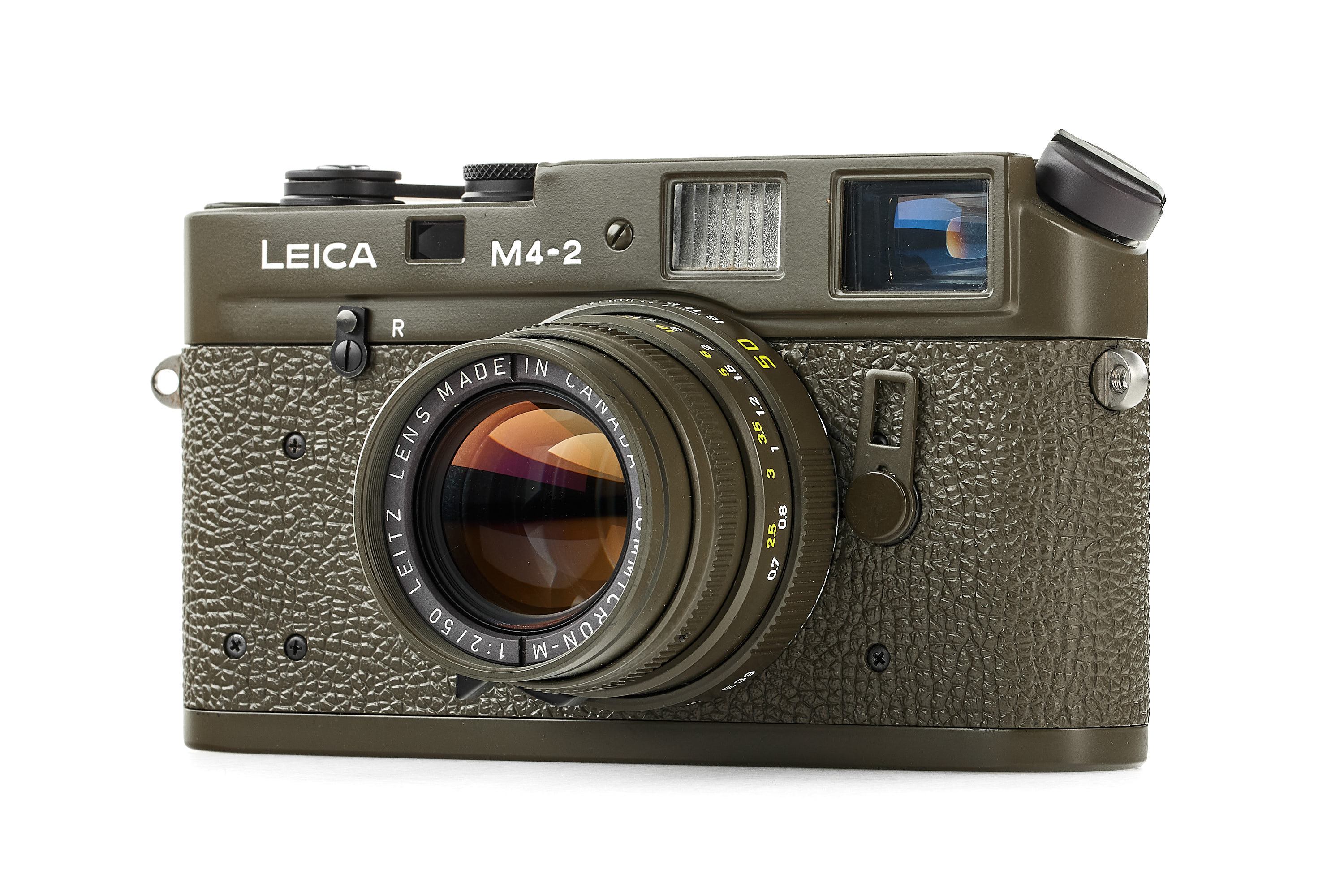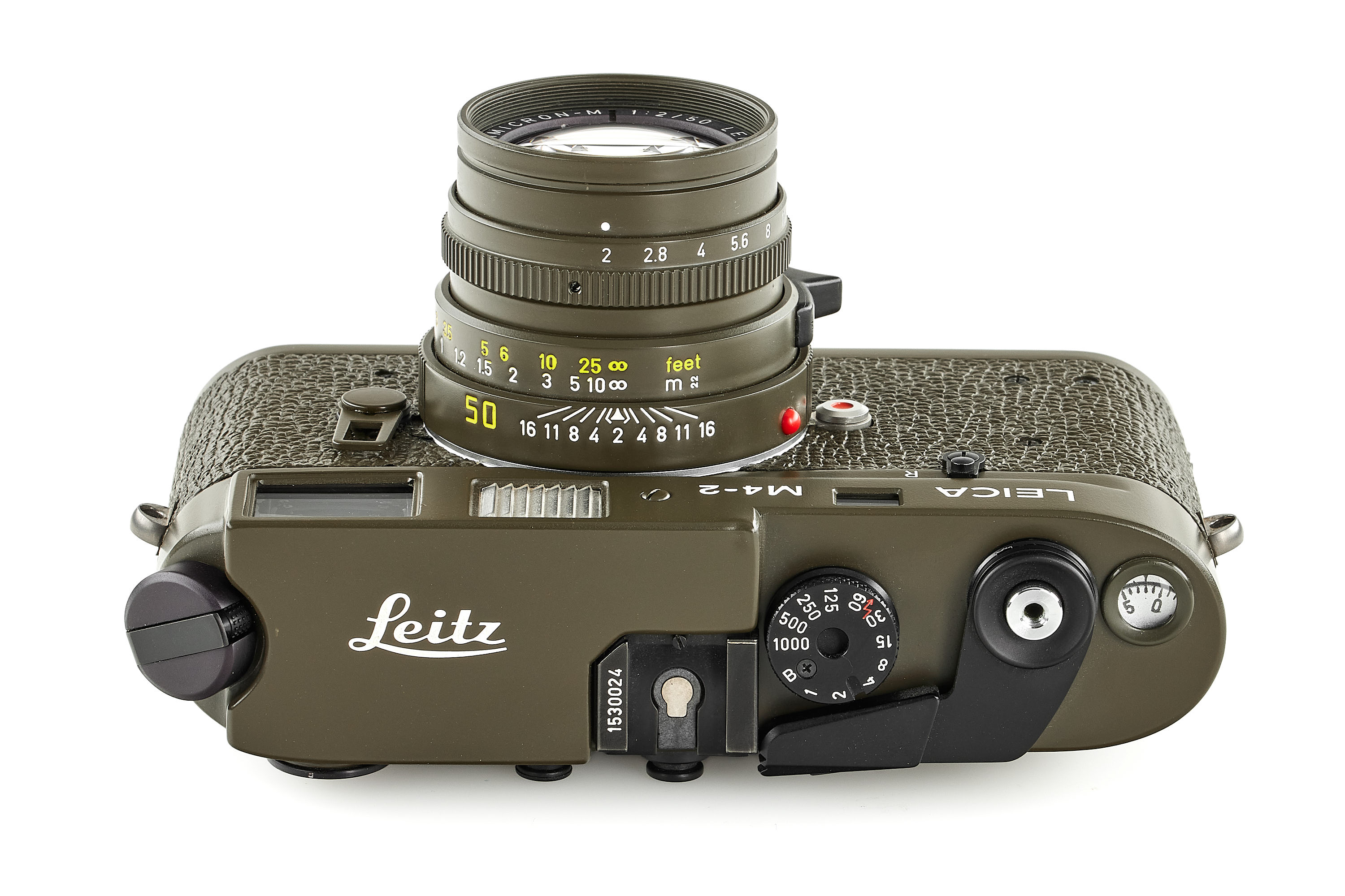 An extremely rare, olive-green Leica M4-2. Only a handful of these cameras were made, intended for the Tank Division of the Israel Army. Only a few examples are known to exist; most probably, none of them left the factory. The offered camera is in beautiful condition, with only one small dent on the top plate. It comes with a matching olive Summicron 2/50mm (no serial number). A similar camera (with a 35mm Summicron-M) can be seen in Nakamura's 'Leica Collection' on page 90.