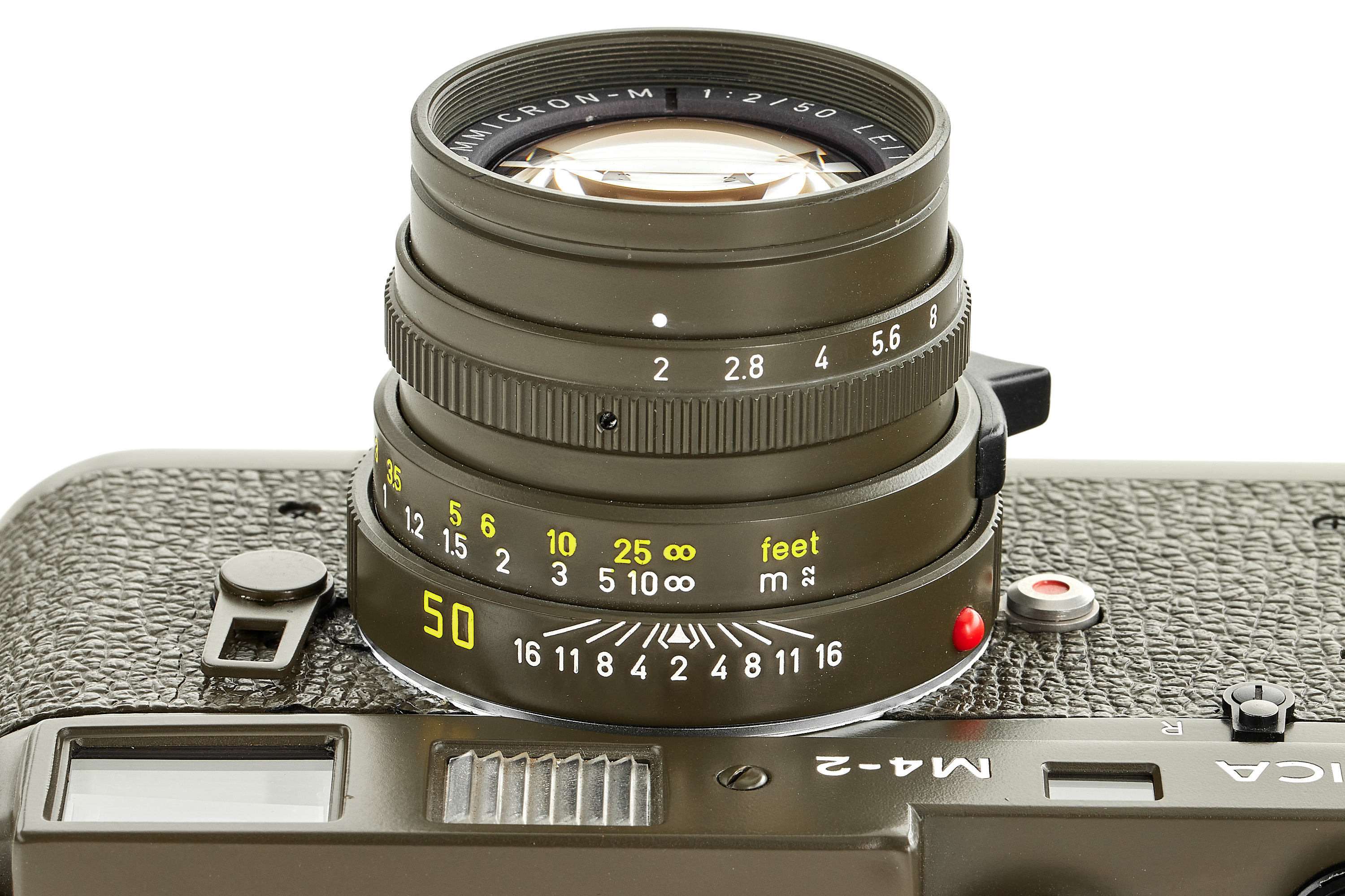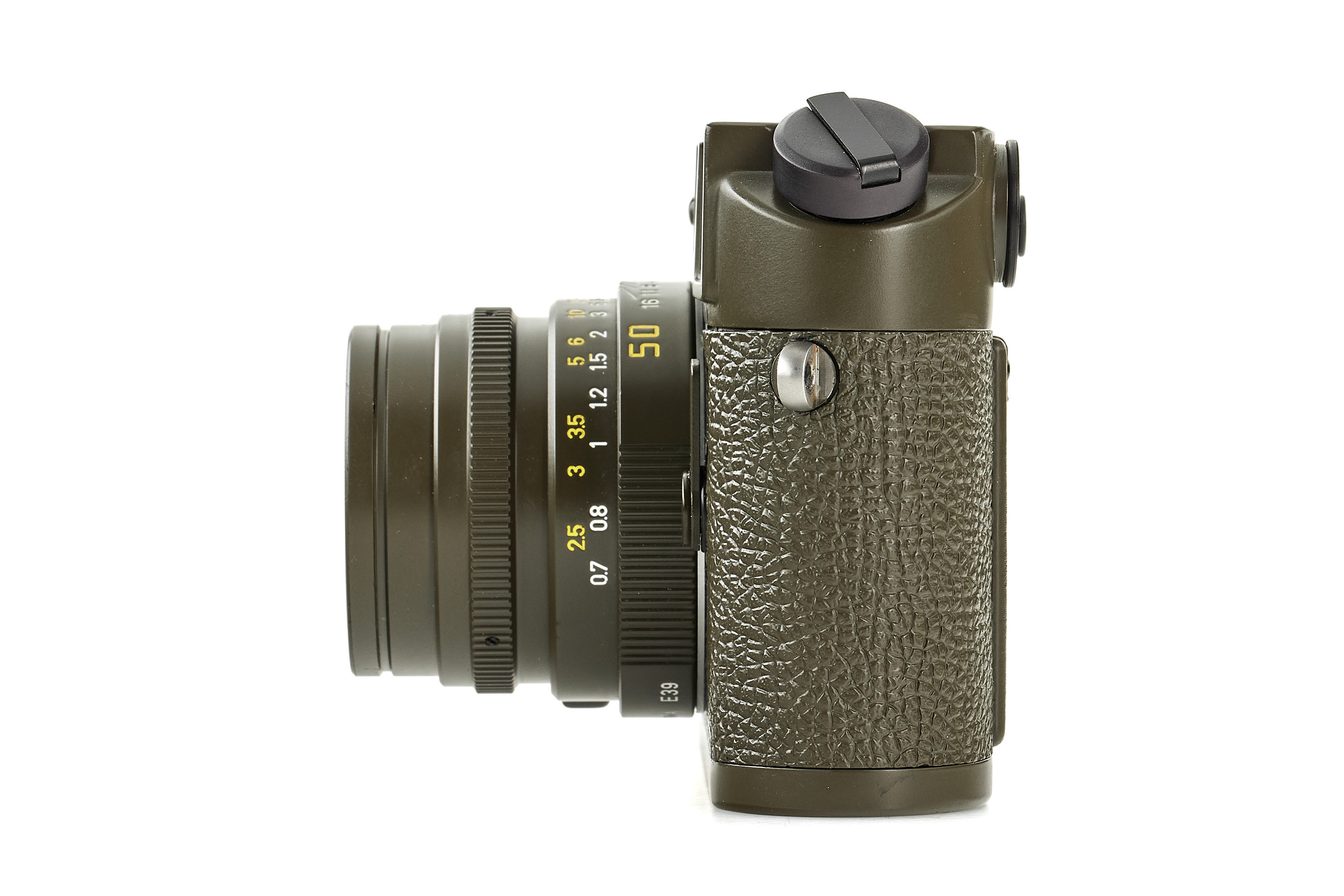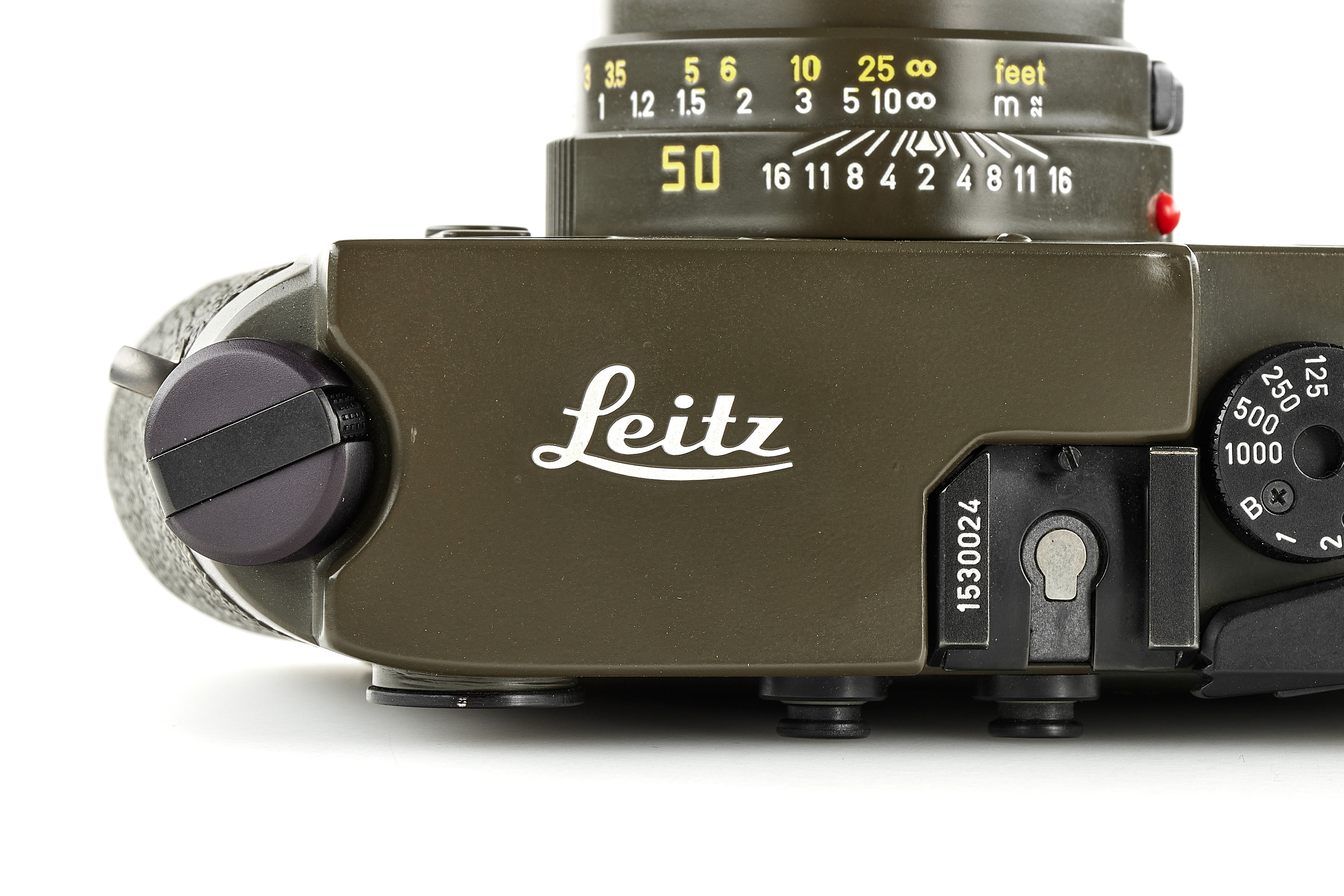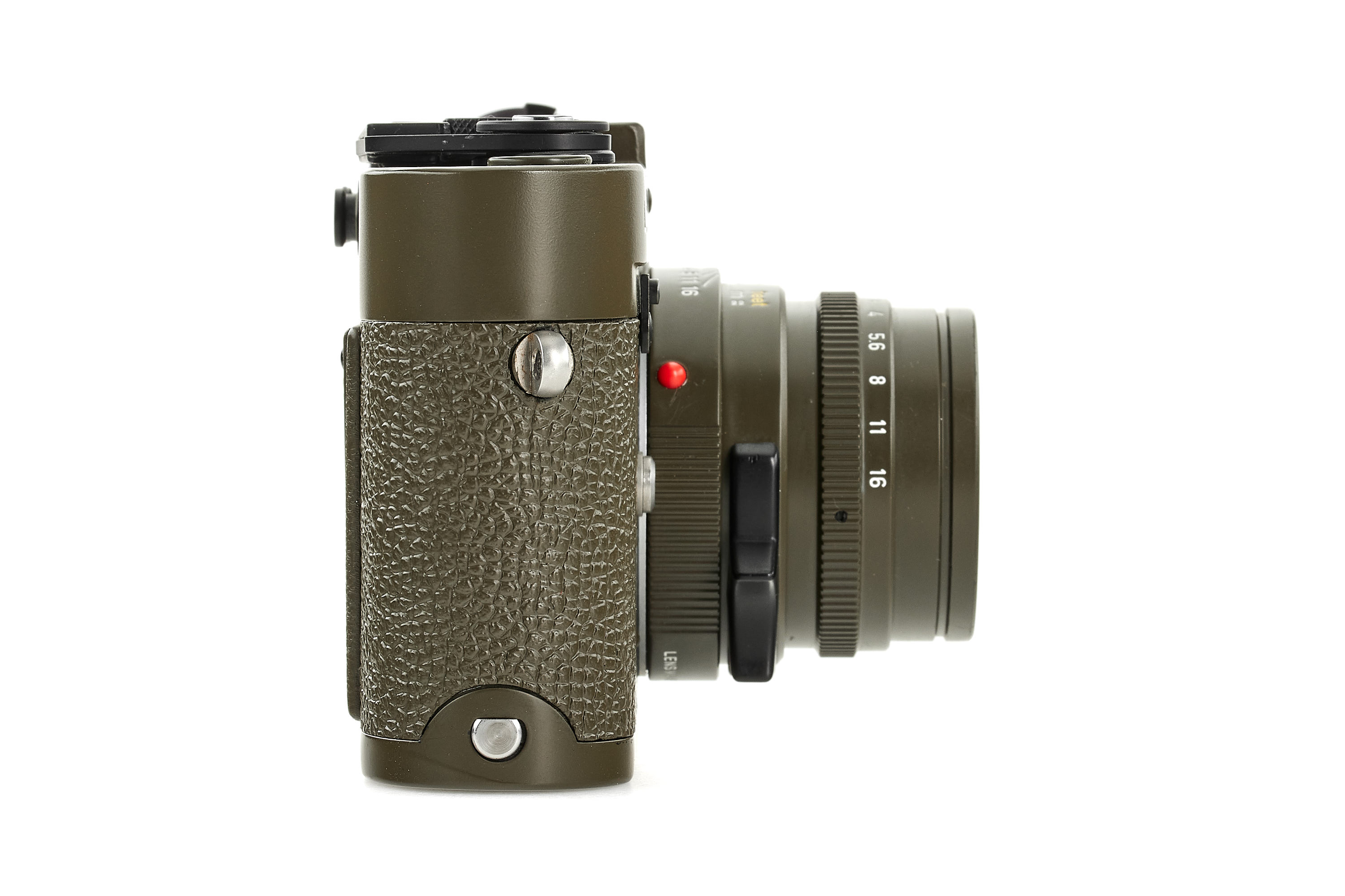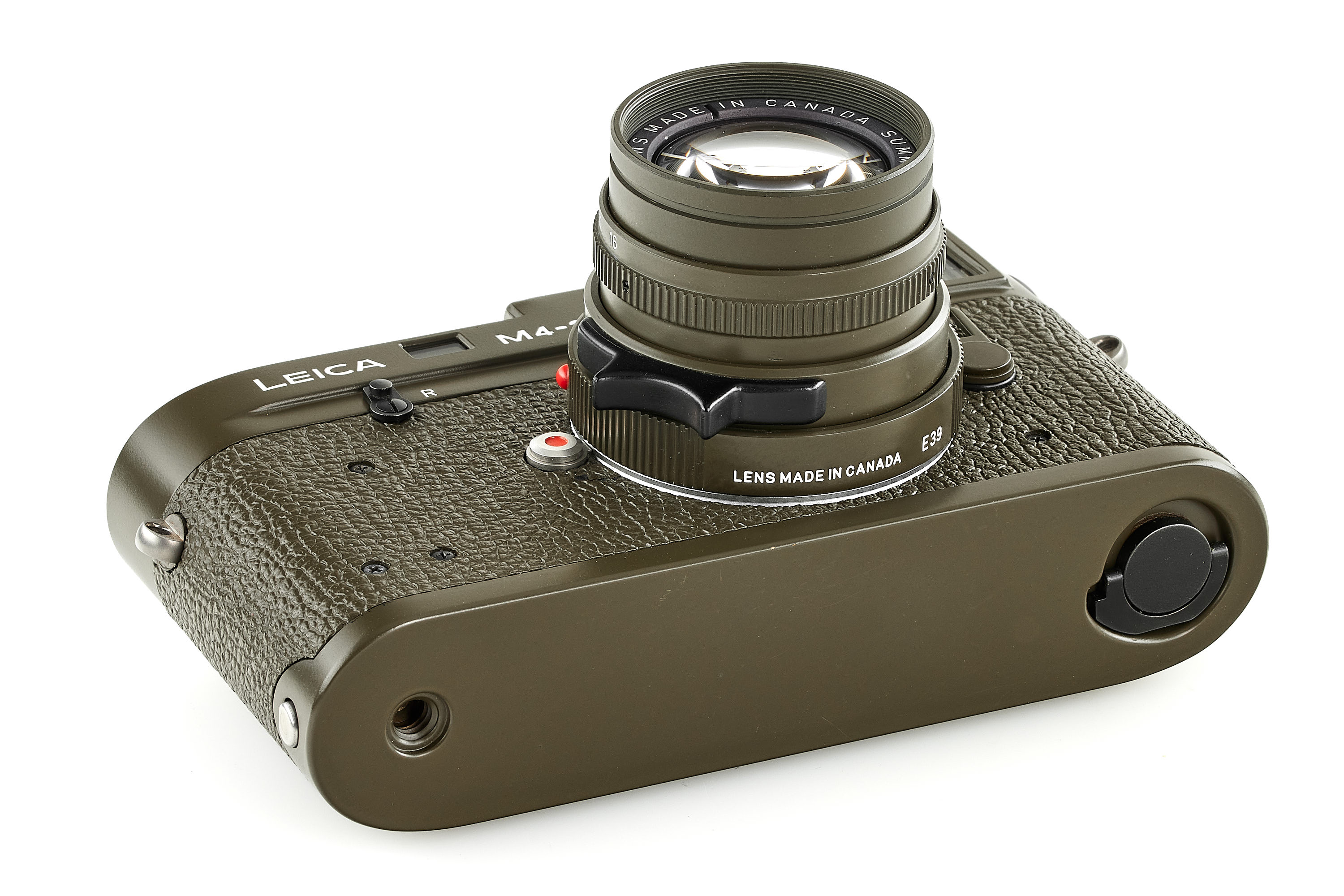 An extremely rare, olive-green Leica M4-2. Only a handful of these cameras were made, intended for the Tank Division of the Israel Army. Only a few examples are known to exist; most probably, none of them left the factory. The offered camera is in beautiful condition, with only one small dent on the top plate. It comes with a matching olive Summicron 2/50mm (no serial number). A similar camera (with a 35mm Summicron-M) can be seen in Nakamura's 'Leica Collection' on page 90.