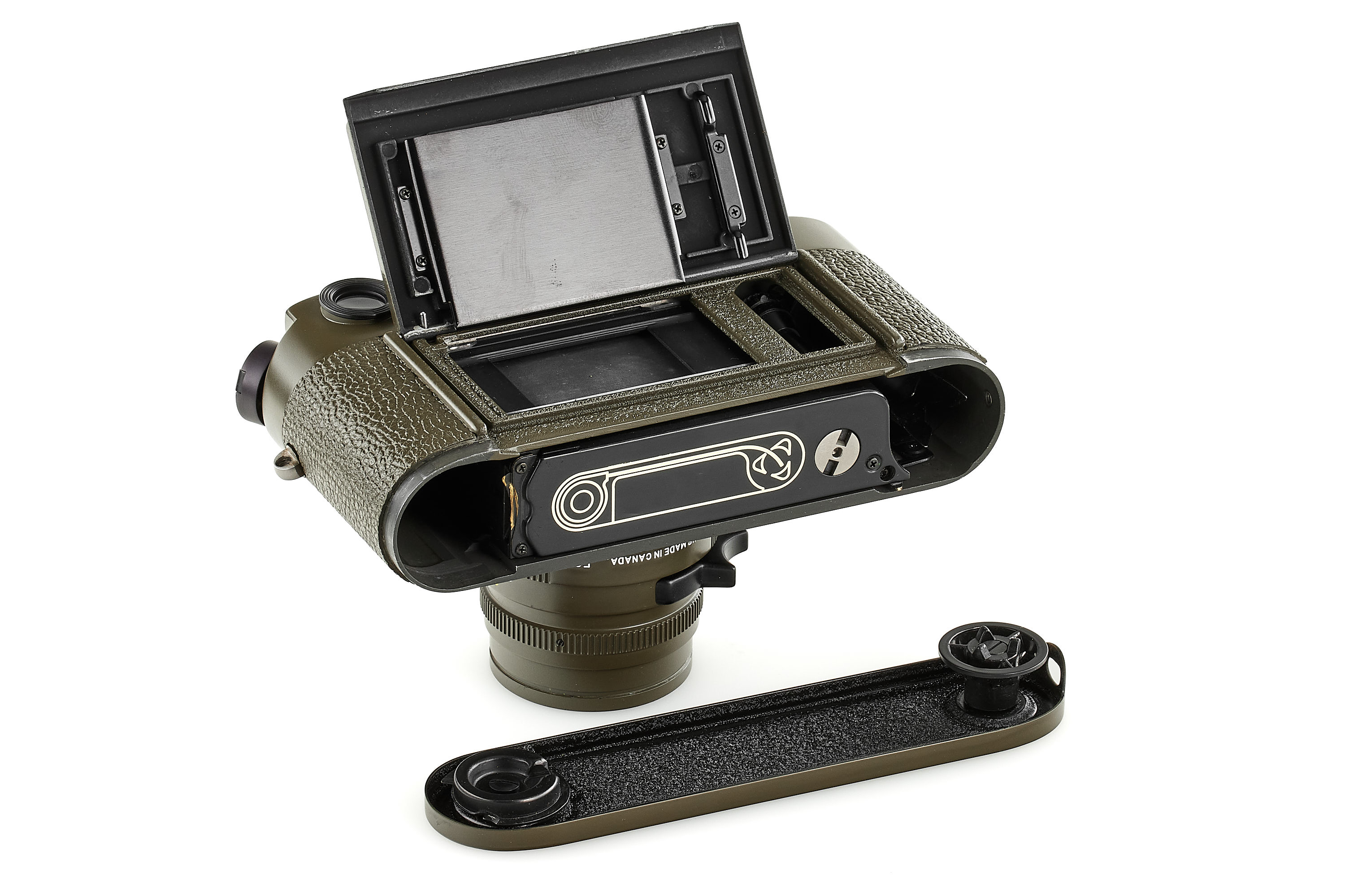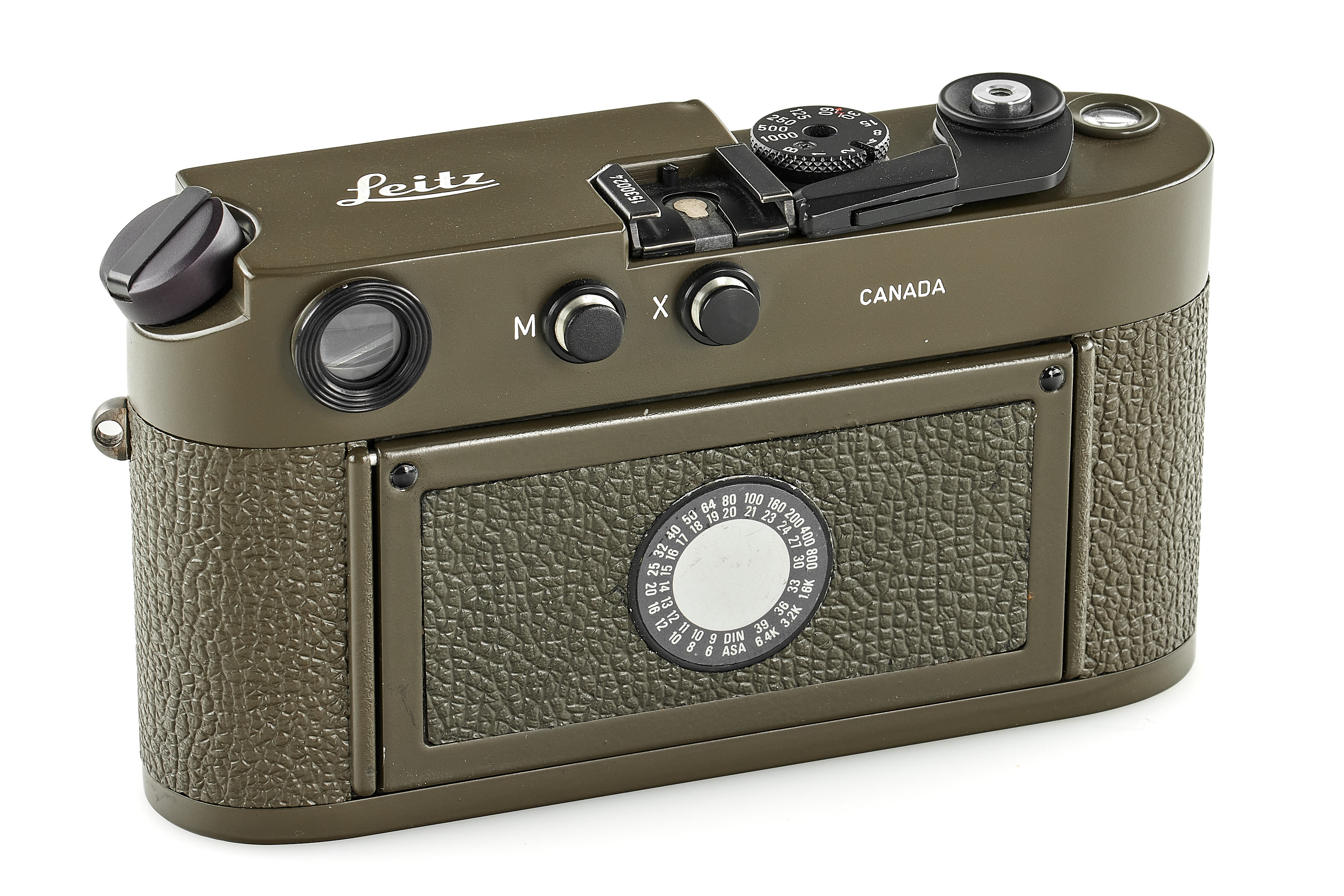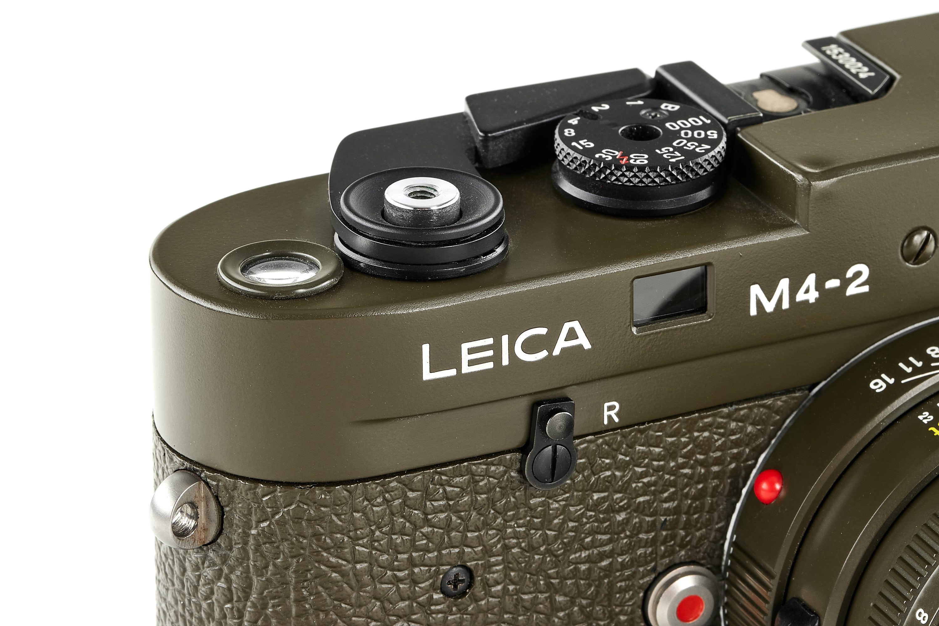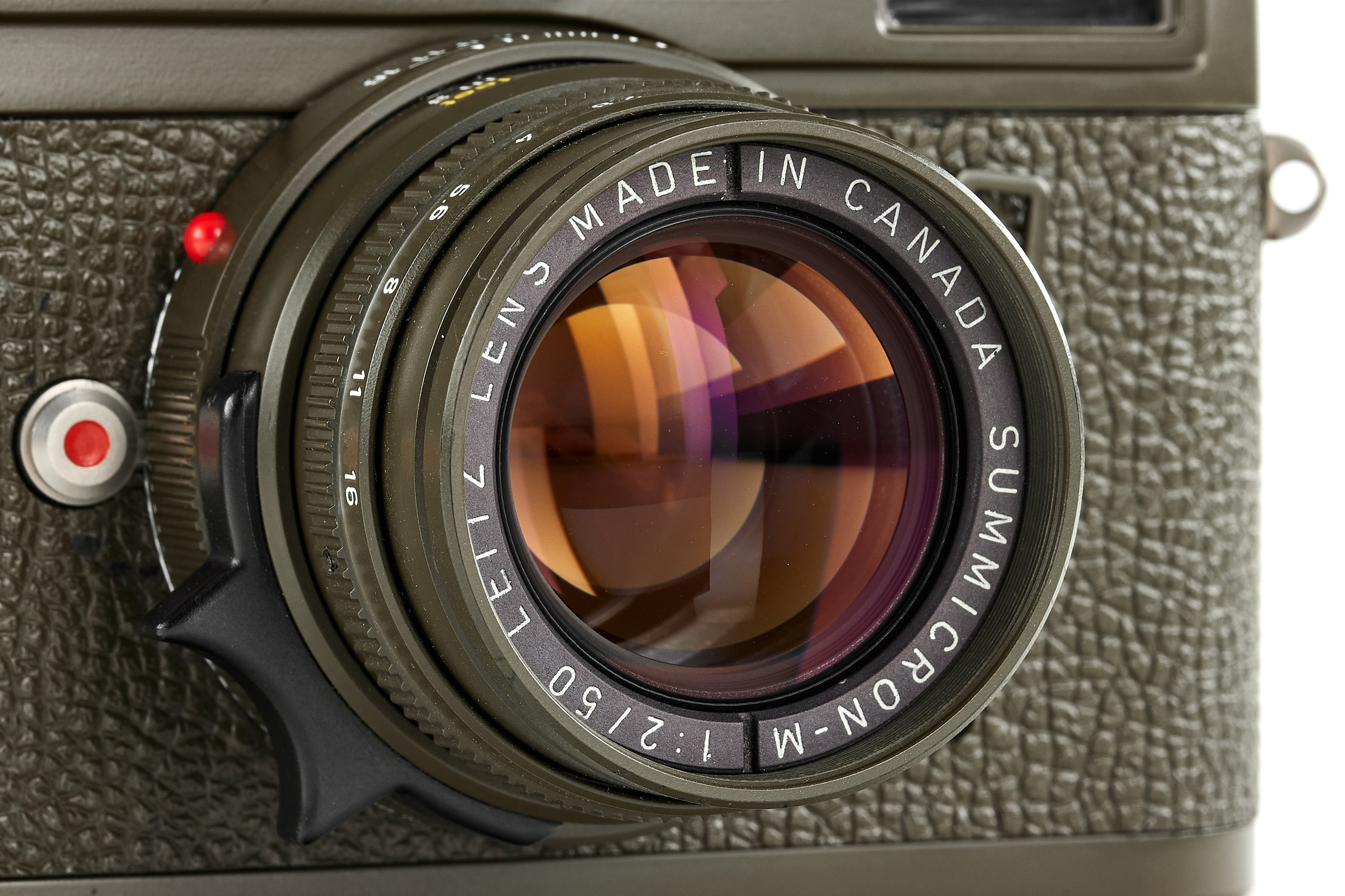 An extremely rare, olive-green Leica M4-2. Only a handful of these cameras were made, intended for the Tank Division of the Israel Army. Only a few examples are known to exist; most probably, none of them left the factory. The offered camera is in beautiful condition, with only one small dent on the top plate. It comes with a matching olive Summicron 2/50mm (no serial number). A similar camera (with a 35mm Summicron-M) can be seen in Nakamura's 'Leica Collection' on page 90.
