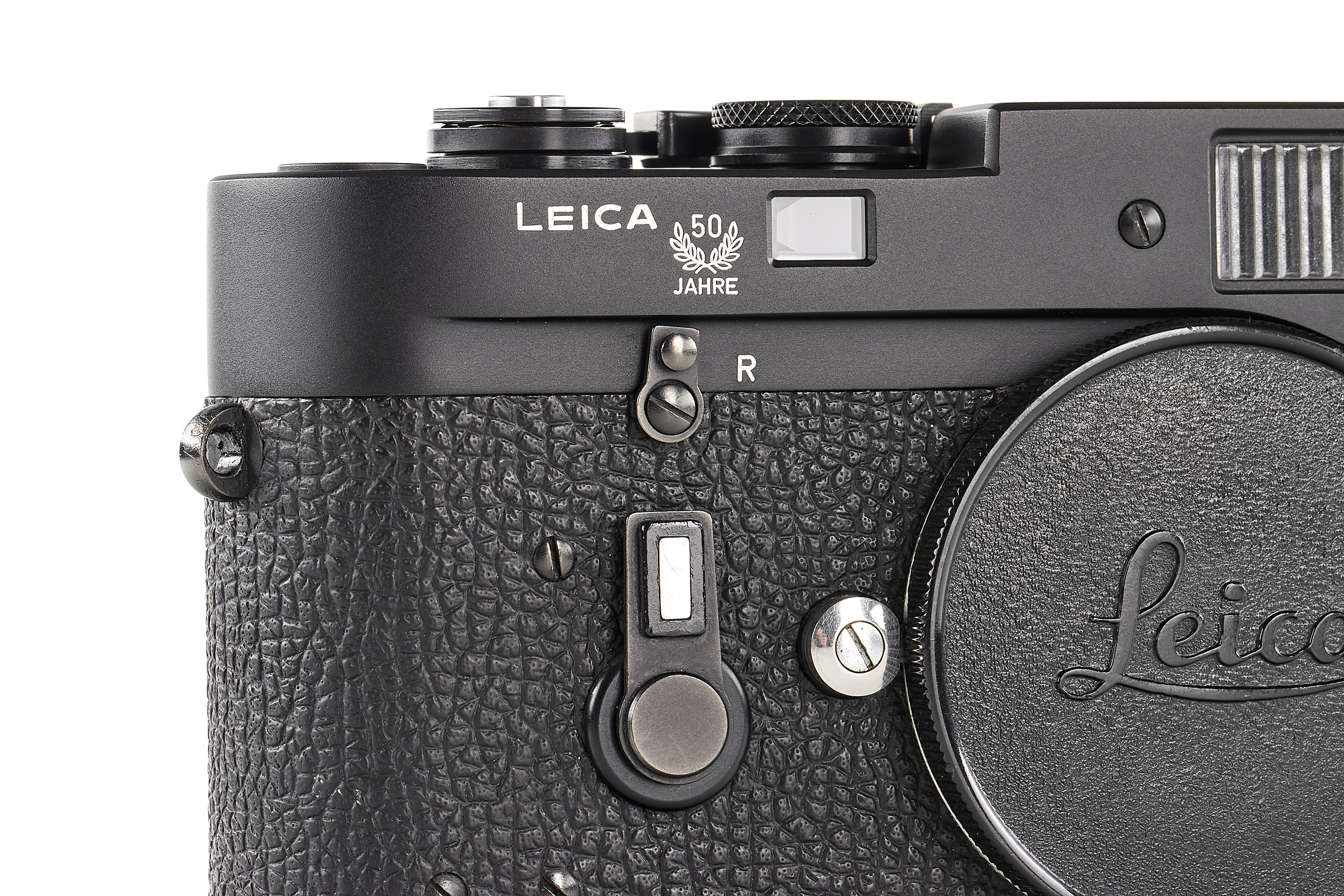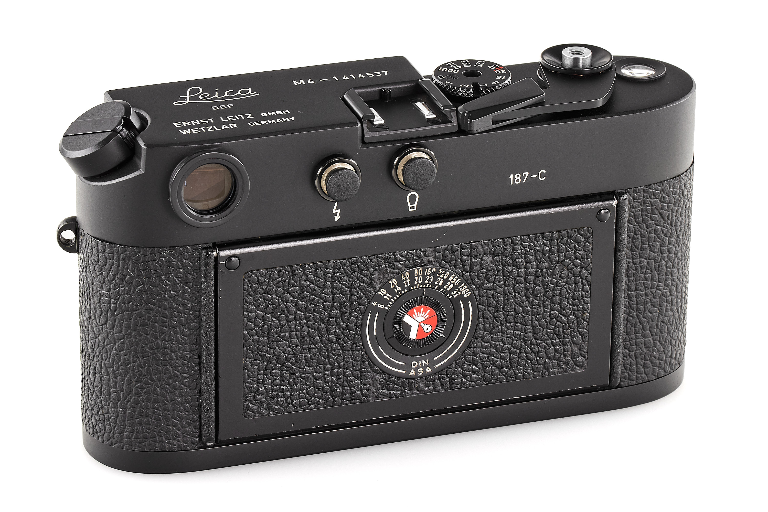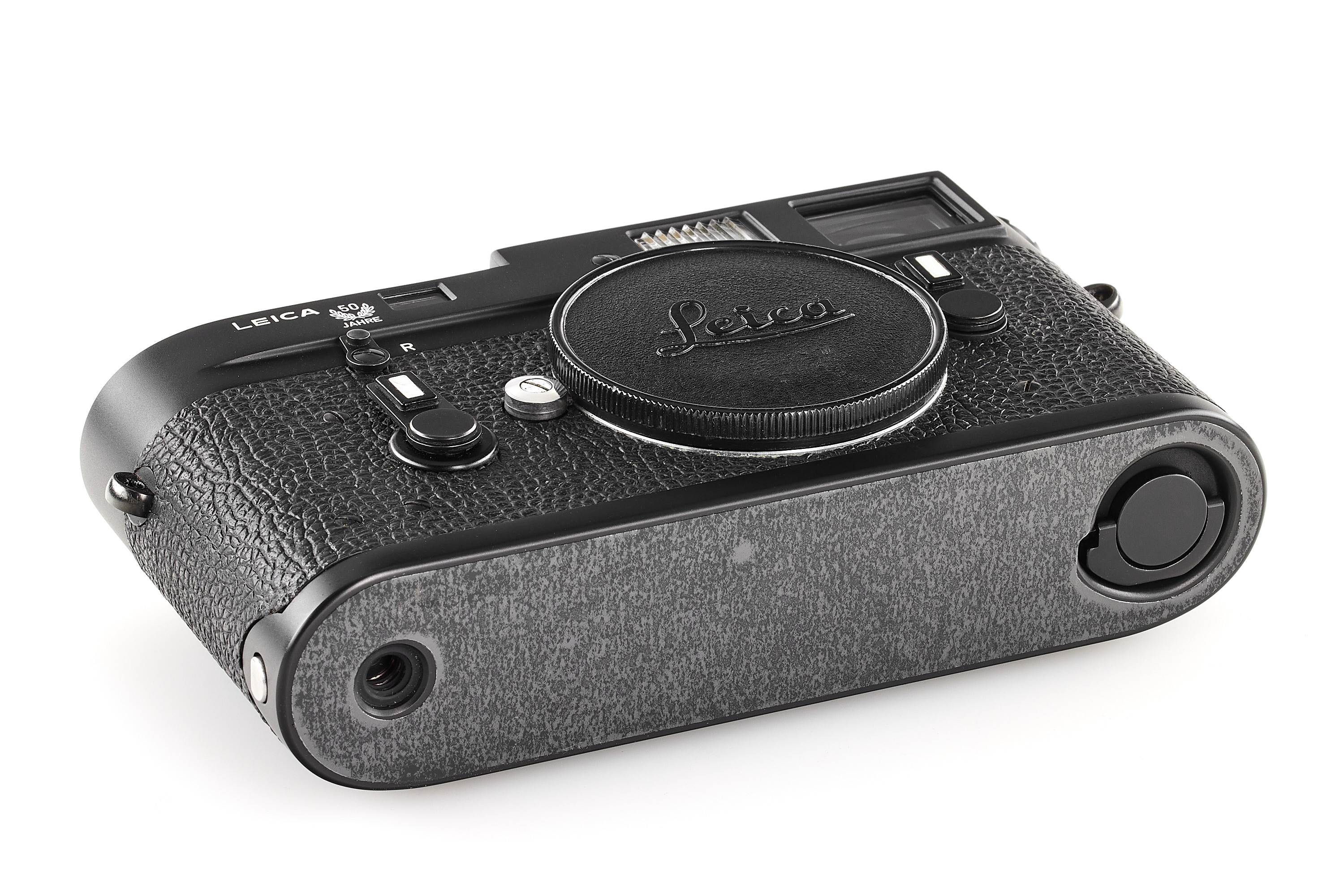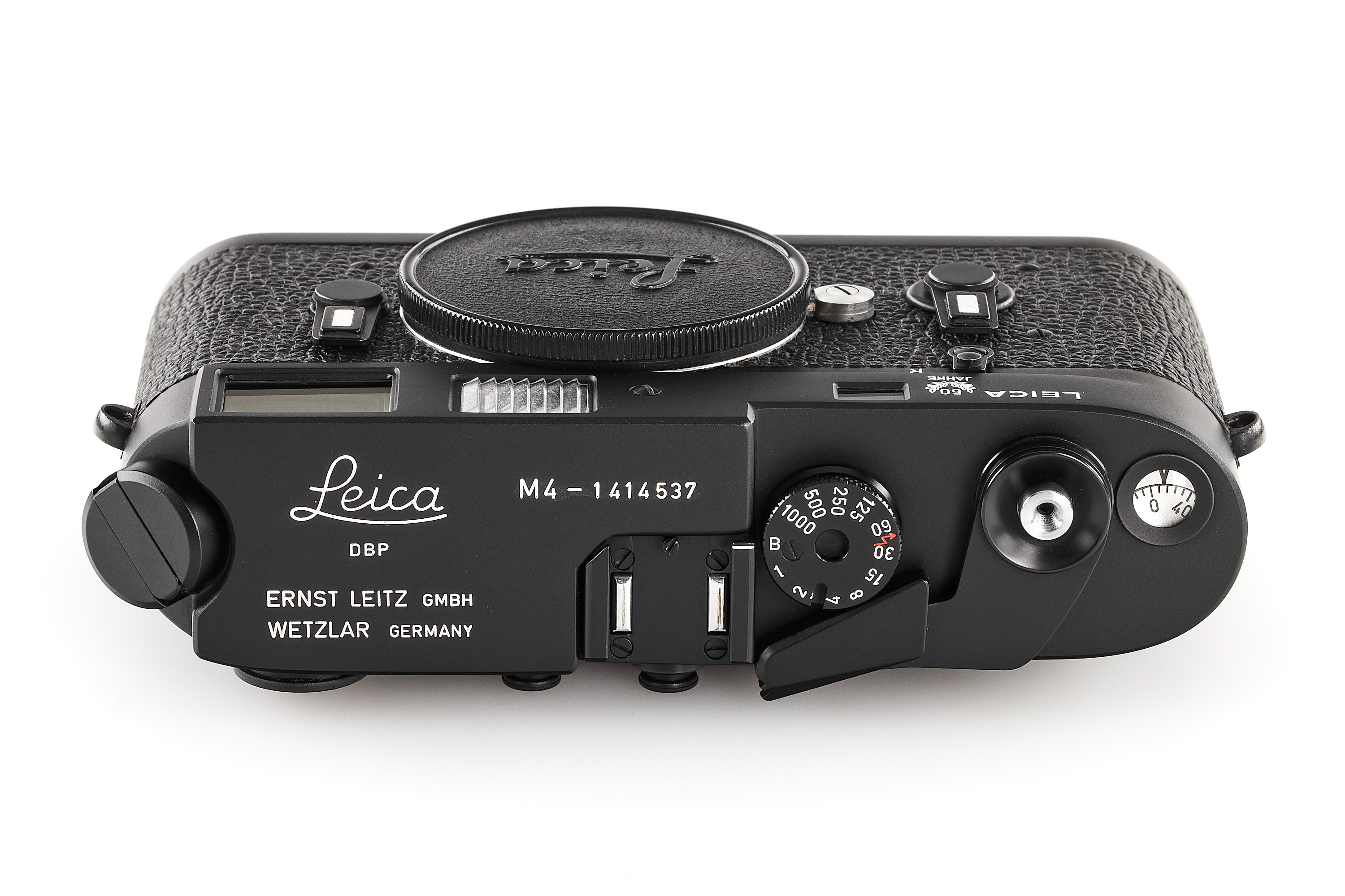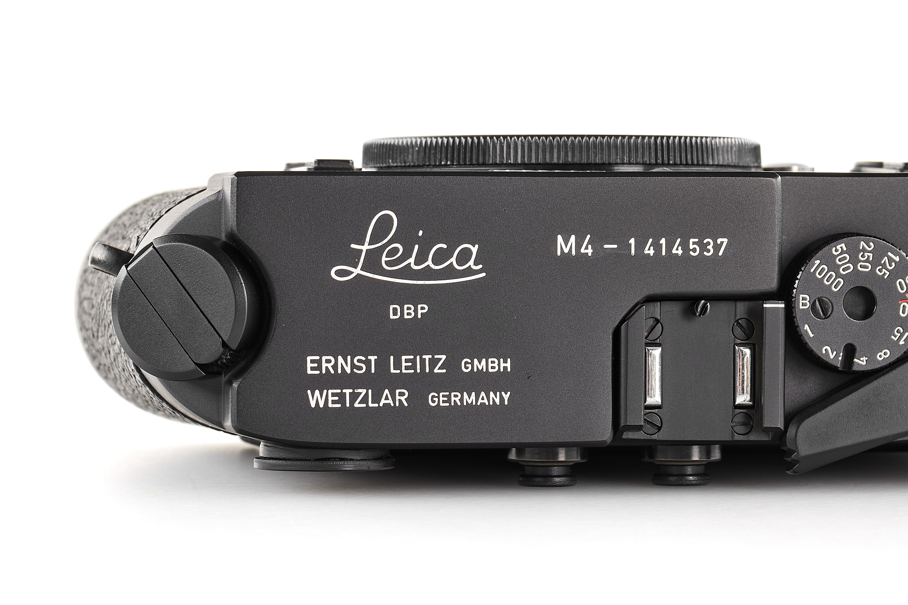 A special edition Leica M4 no.1414537 in black finish, celebrating the 50th anniversary of the first production Leicas, with special engraving 187-C on the back, only 1400 produced in Germany, in near-mint condition, showing some traces of repair in the vulcanite (rear door), with body cap.