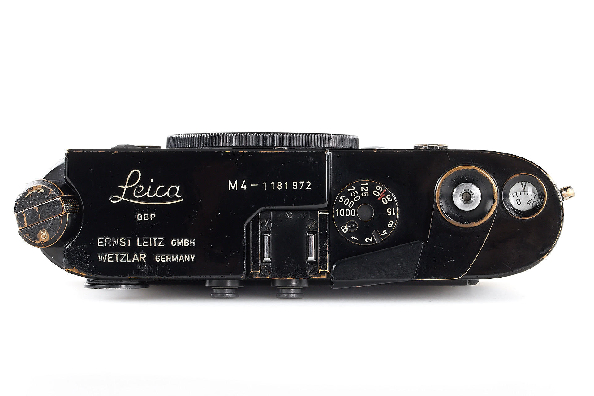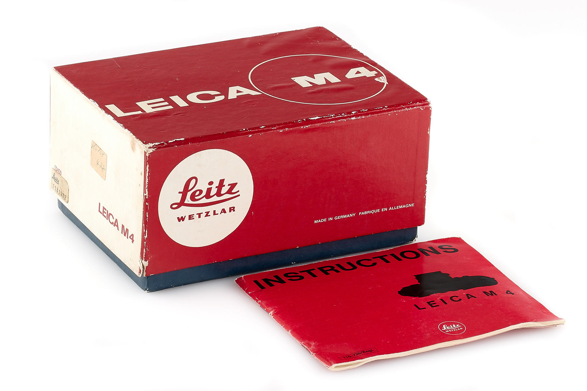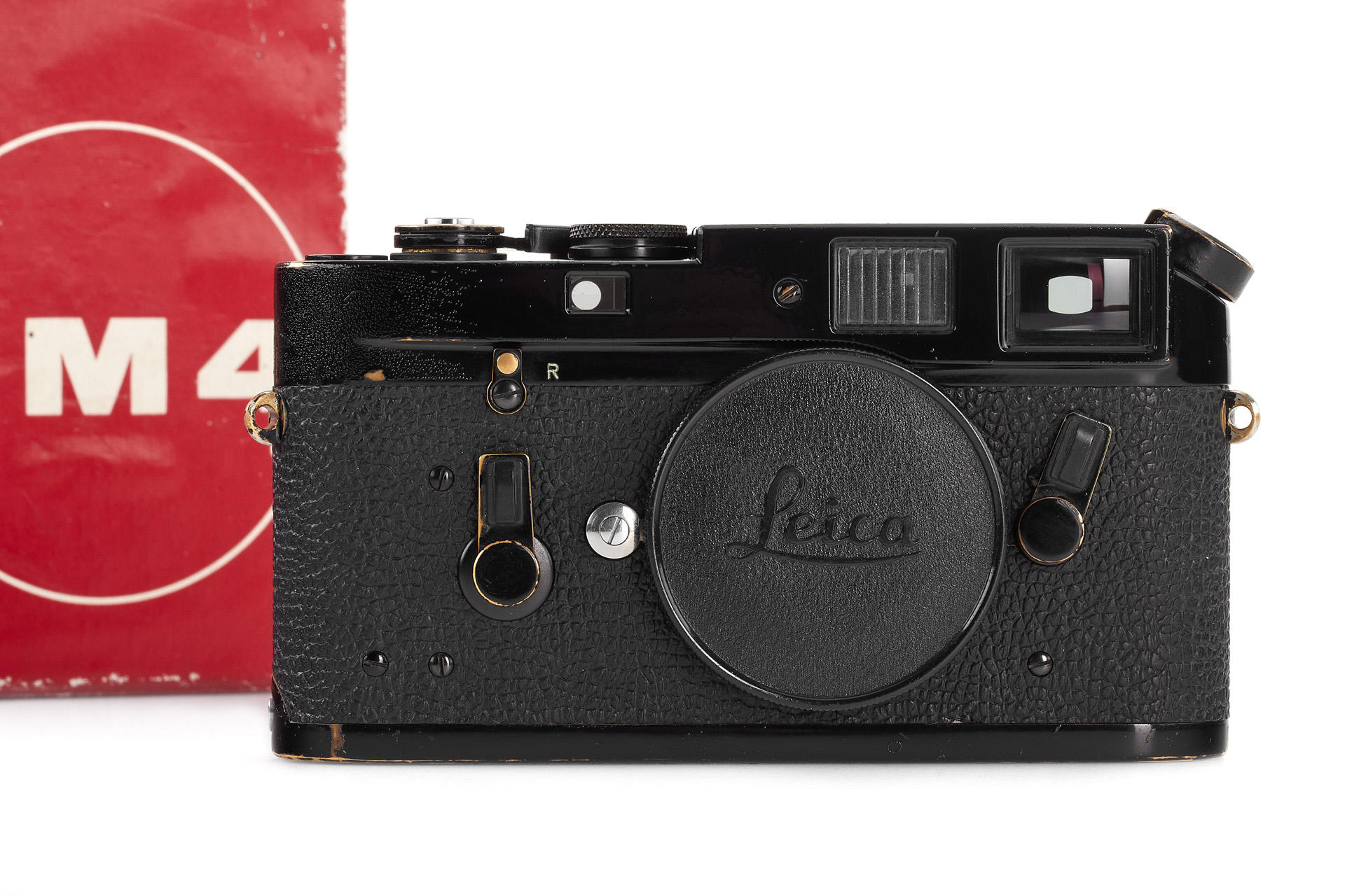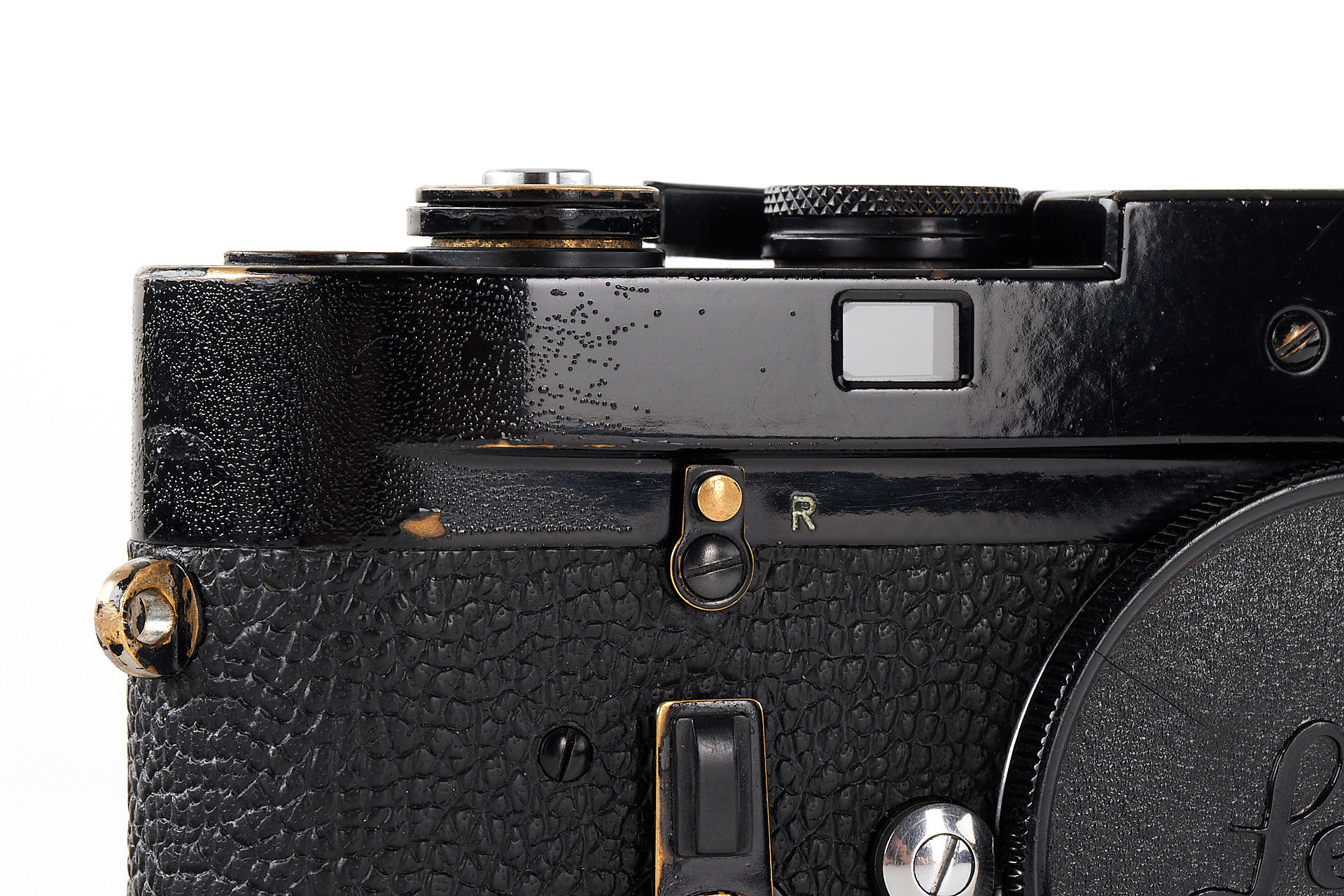 rare black paint M4 from the first production batch, in very good cosmetic condition, only minimal brassing around the edges, top plate replaced by Leitz around 1970, brass rewind knob and levers on the front, in perfect working order, including English instructions and maker's box with matching number