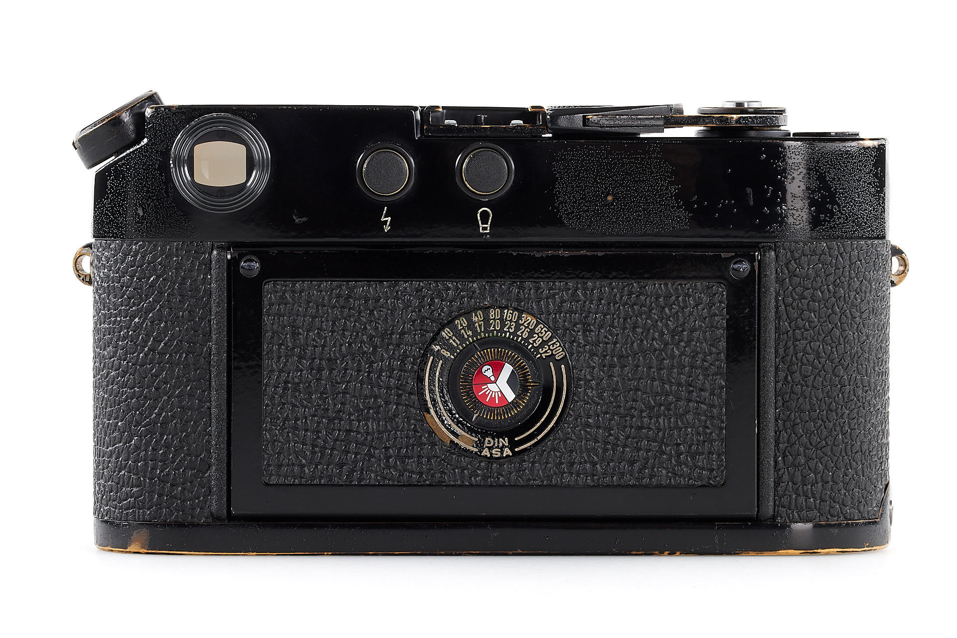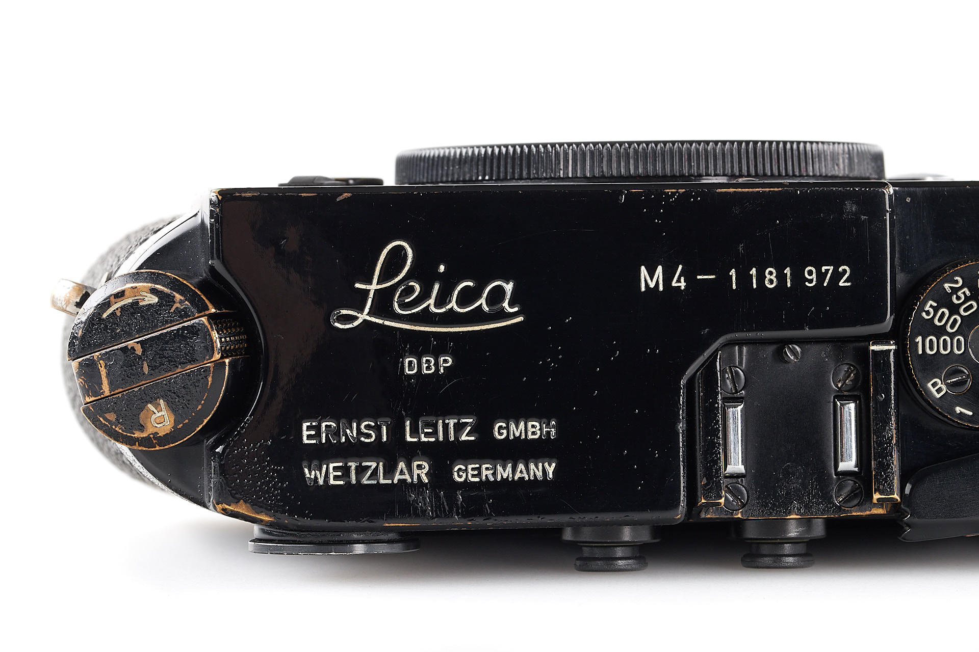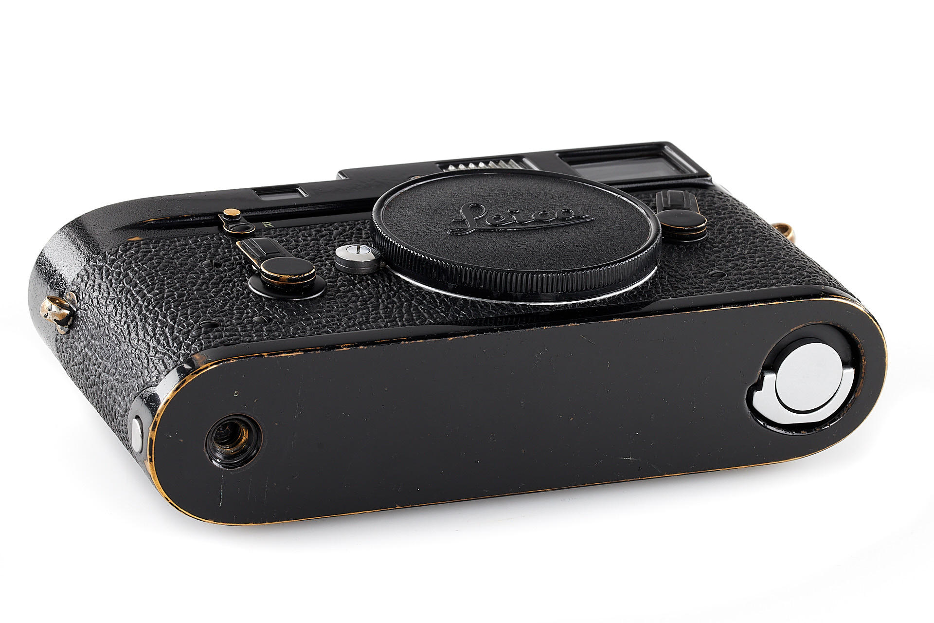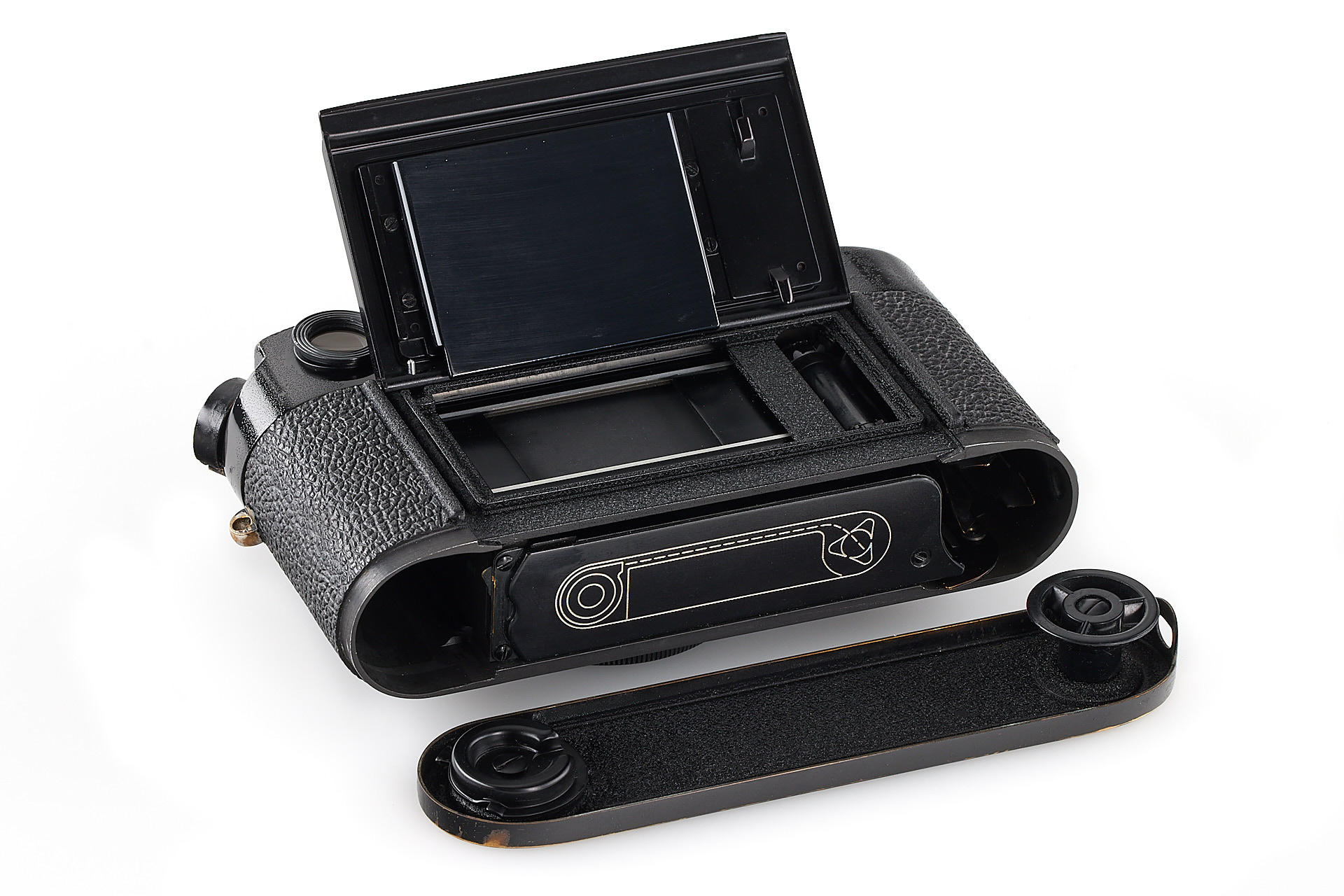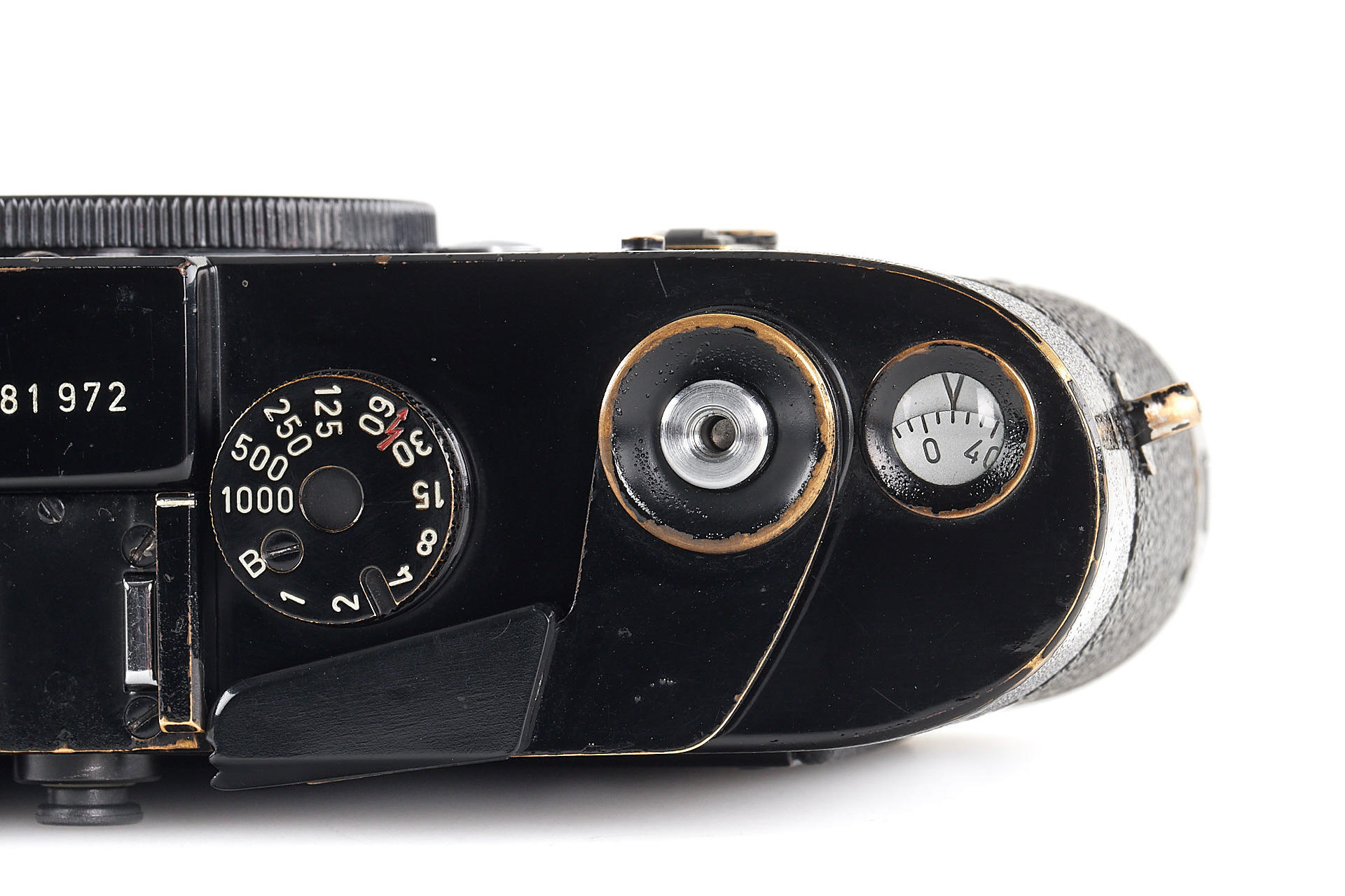 rare black paint M4 from the first production batch, in very good cosmetic condition, only minimal brassing around the edges, top plate replaced by Leitz around 1970, brass rewind knob and levers on the front, in perfect working order, including English instructions and maker's box with matching number