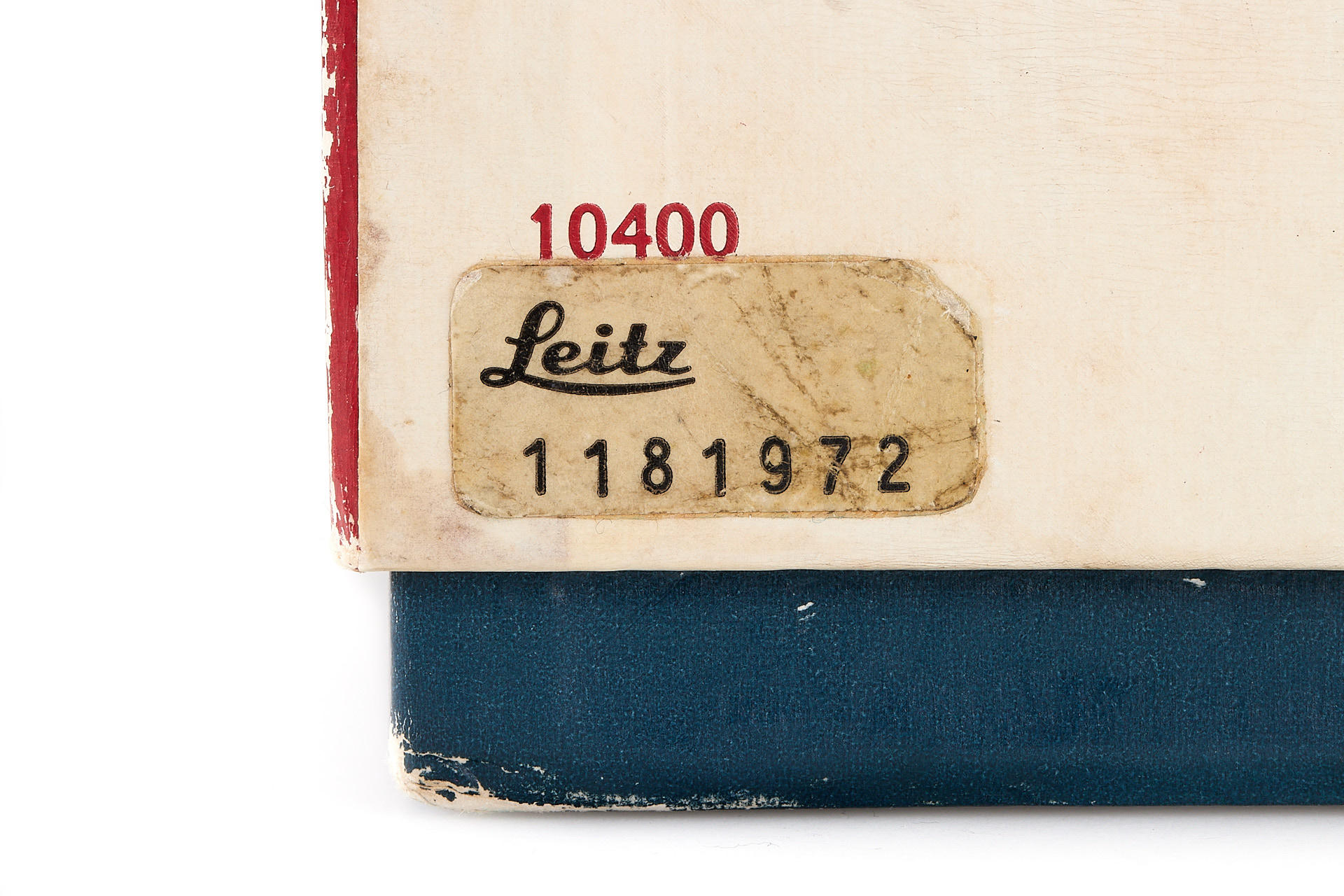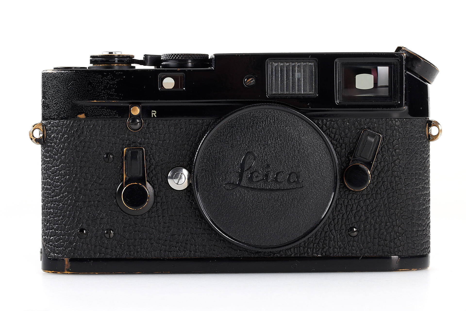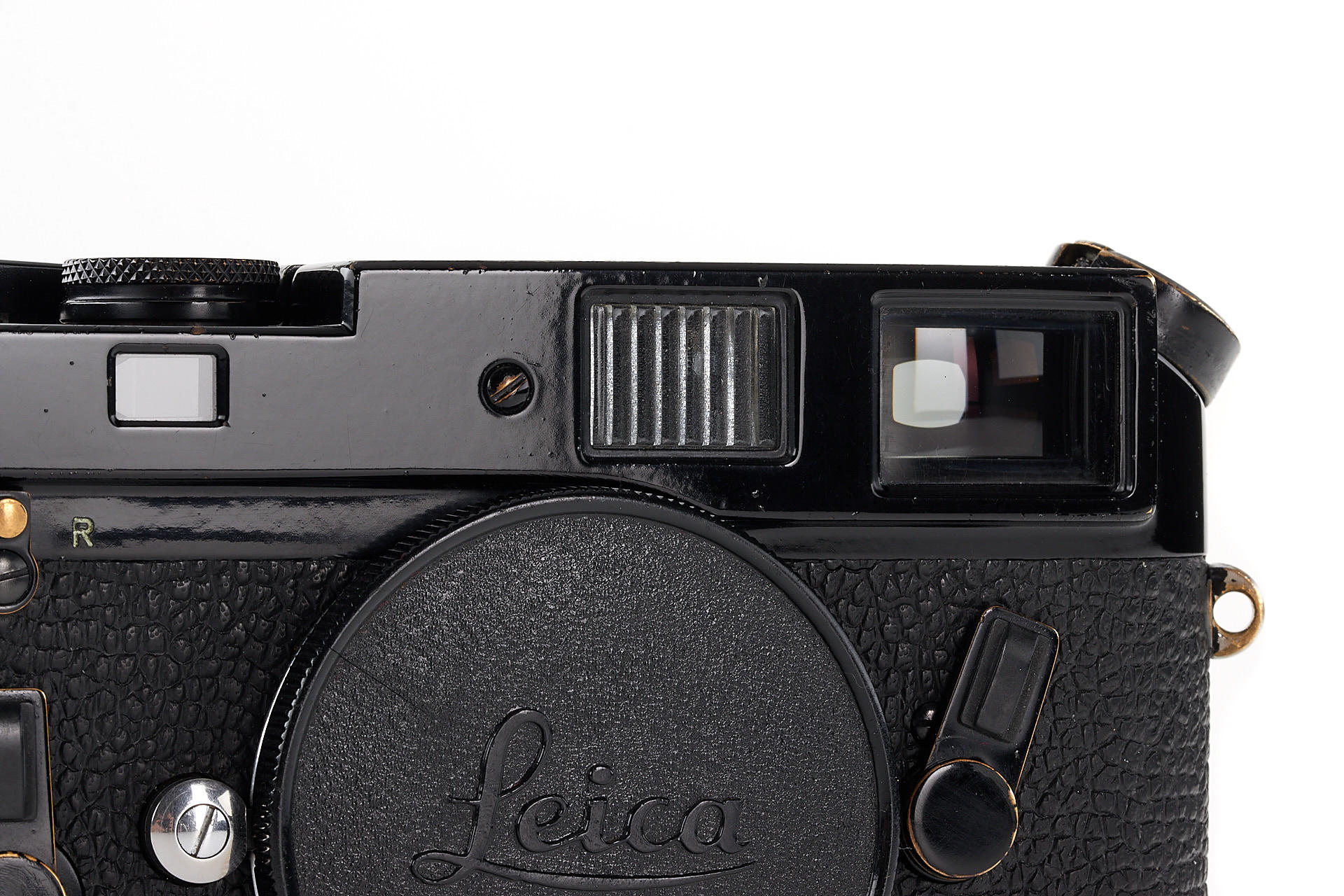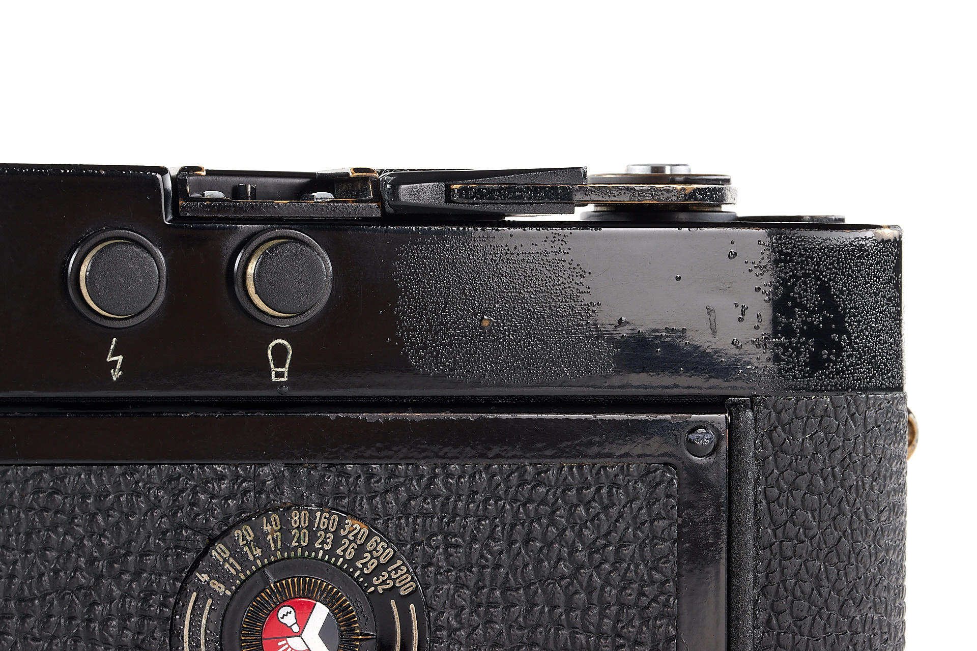 rare black paint M4 from the first production batch, in very good cosmetic condition, only minimal brassing around the edges, top plate replaced by Leitz around 1970, brass rewind knob and levers on the front, in perfect working order, including English instructions and maker's box with matching number