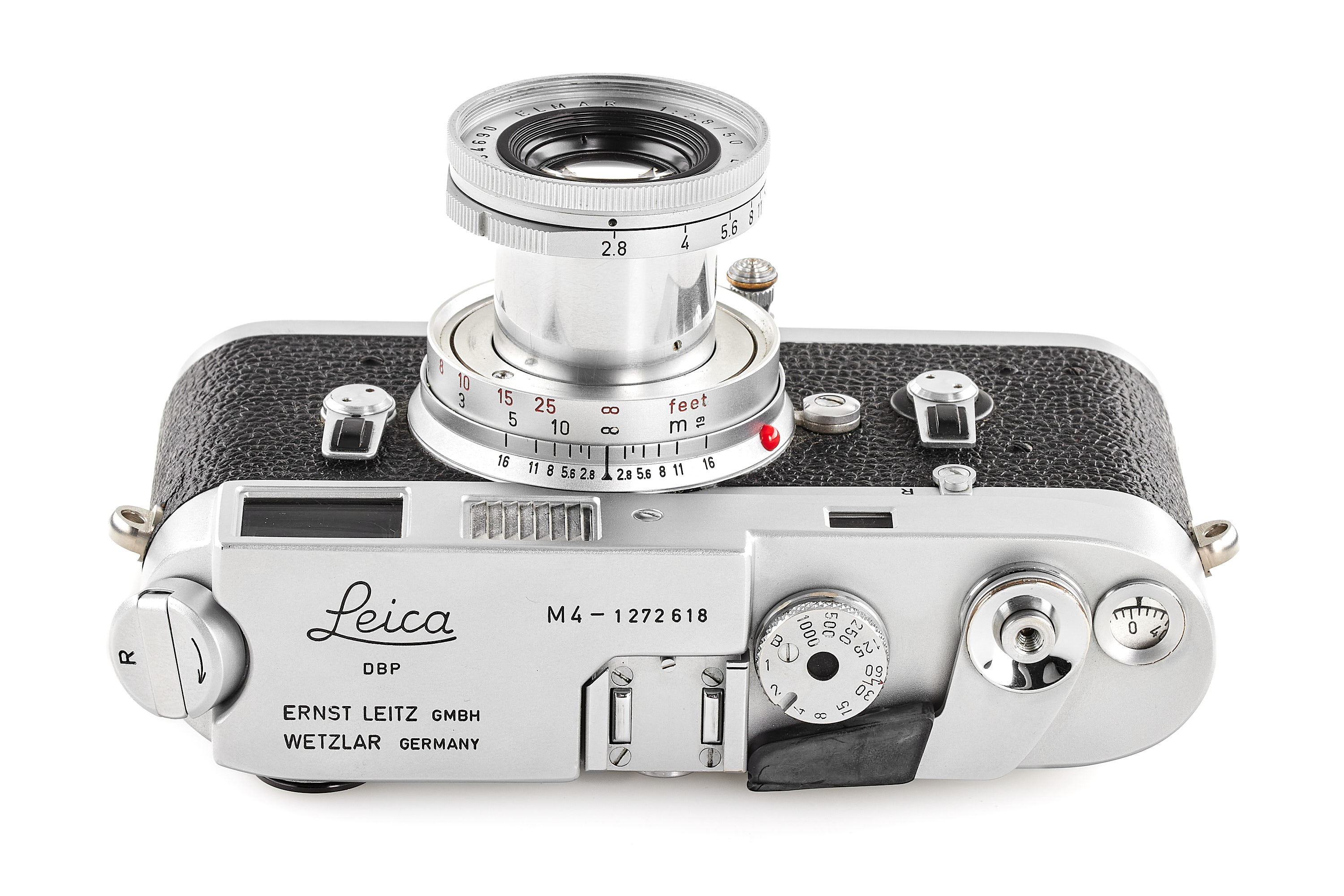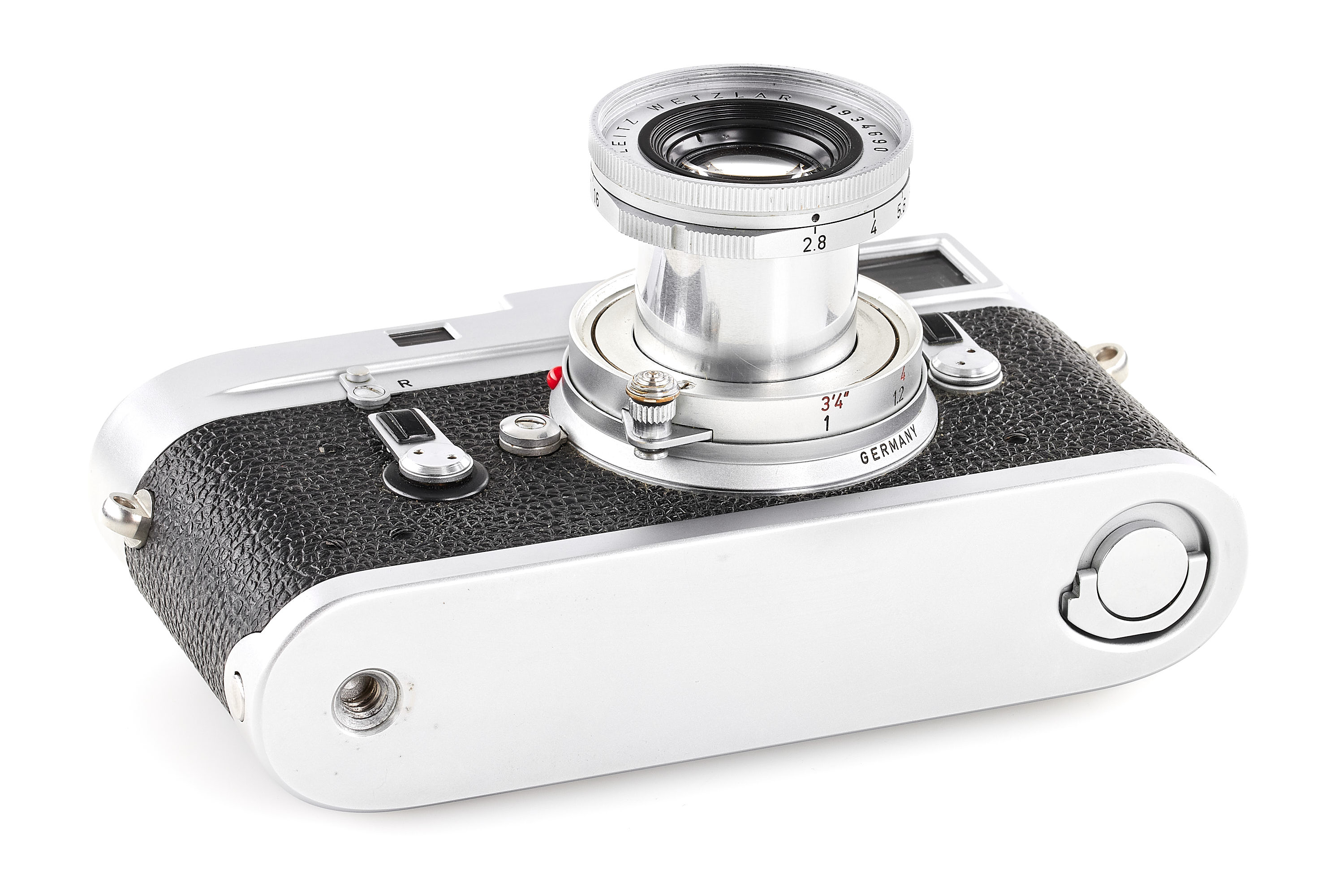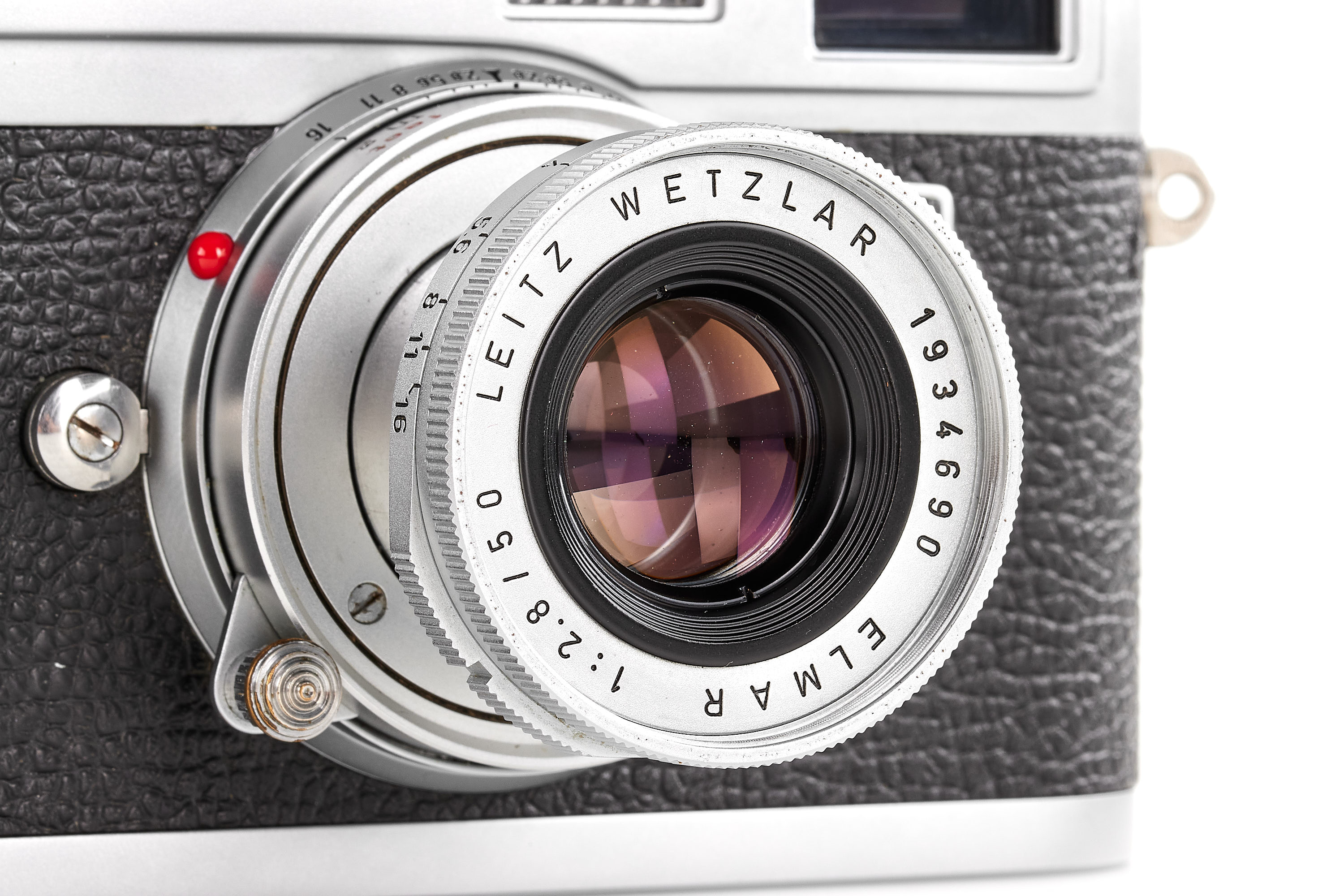 Very nice chrome M4 in near-mint condition and working order, with Elmar 2.8/50mm no1934690, optics only showing a light haze, with unusual skylight filter E. Leitz New York.