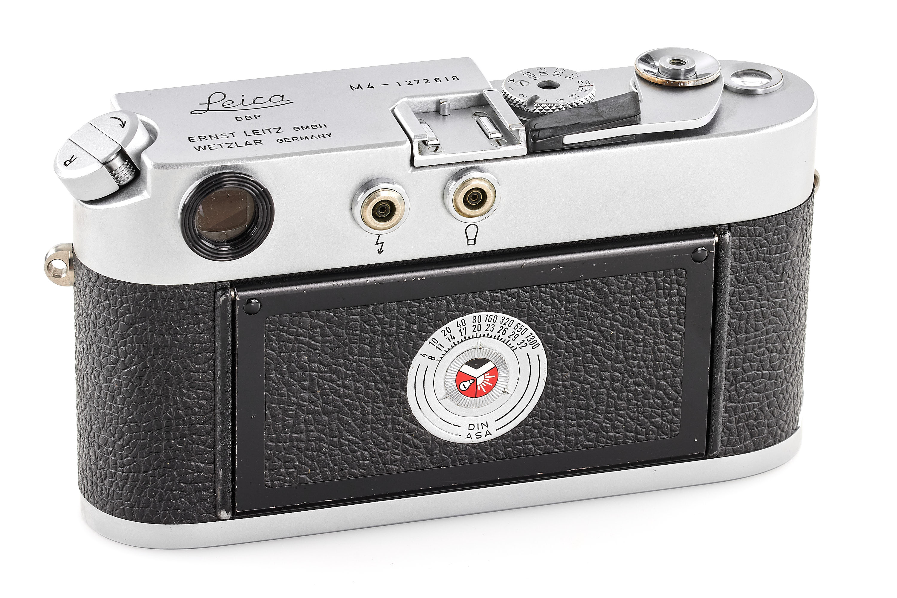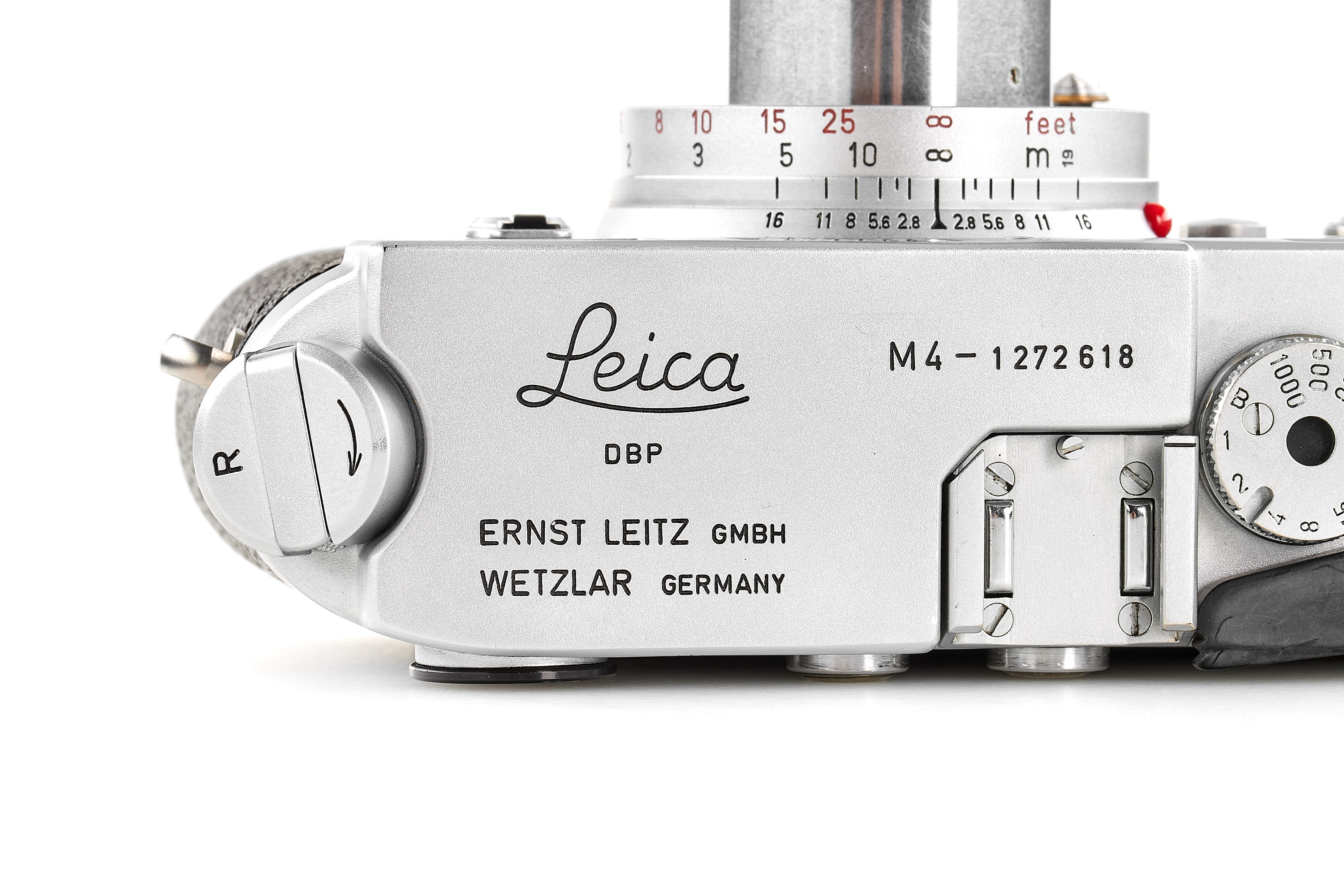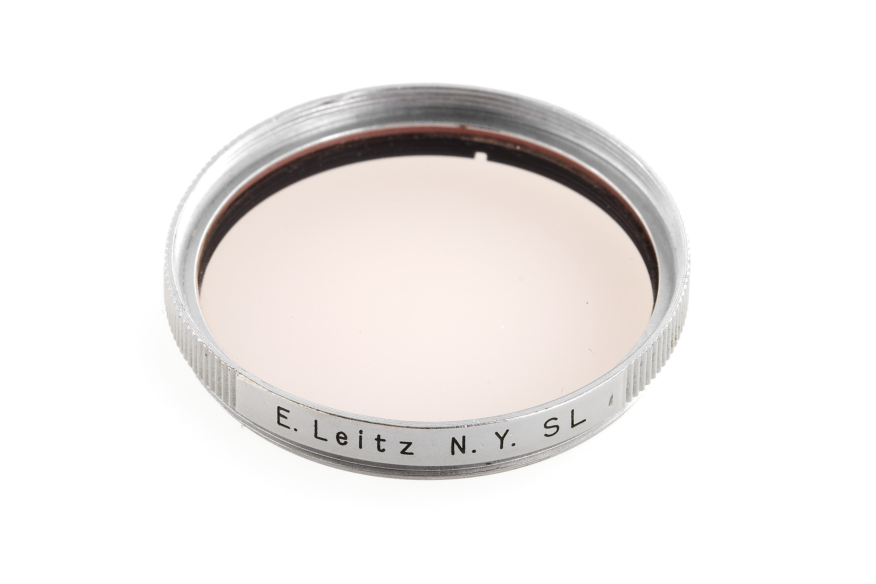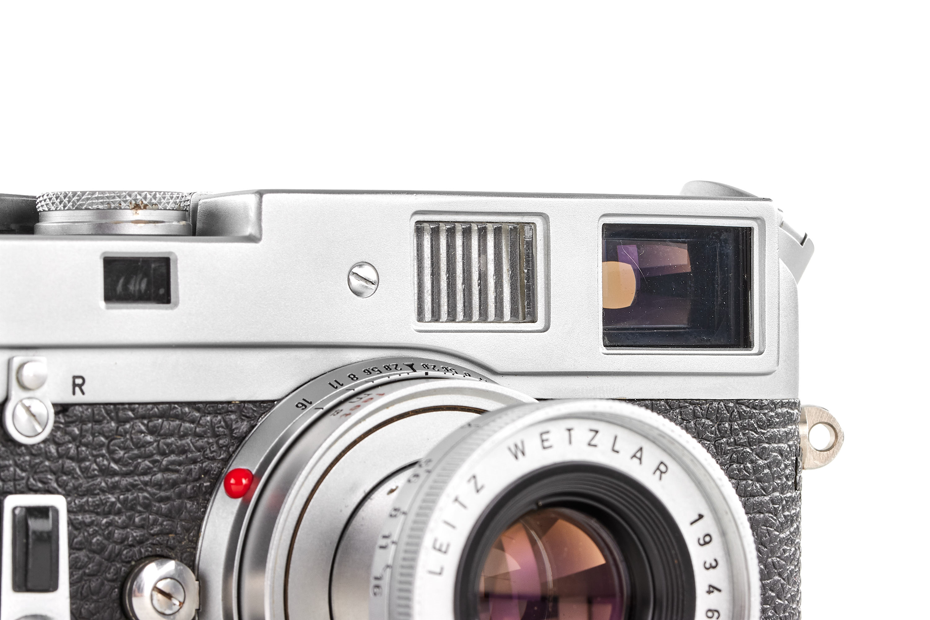 Very nice chrome M4 in near-mint condition and working order, with Elmar 2.8/50mm no1934690, optics only showing a light haze, with unusual skylight filter E. Leitz New York.