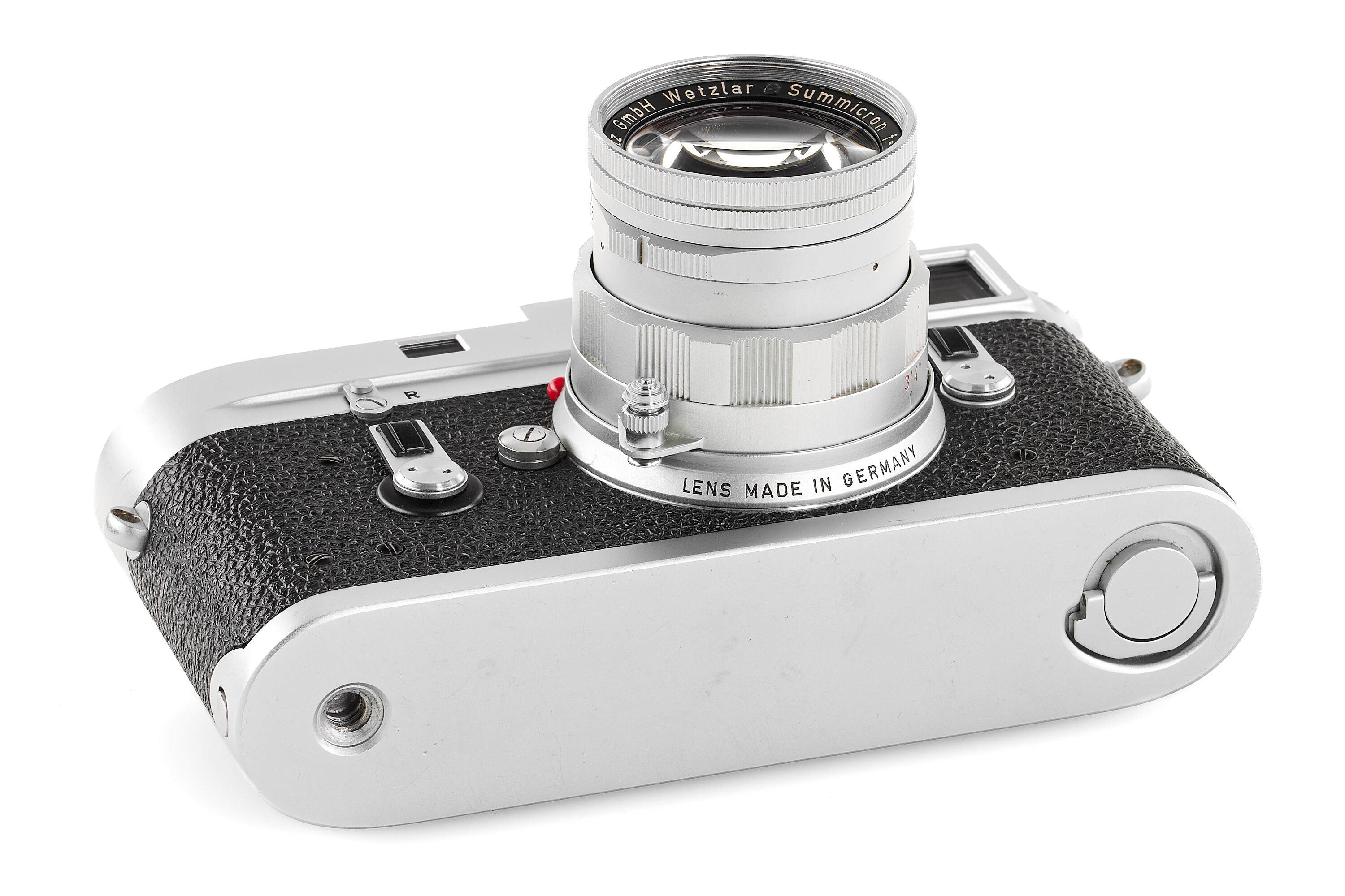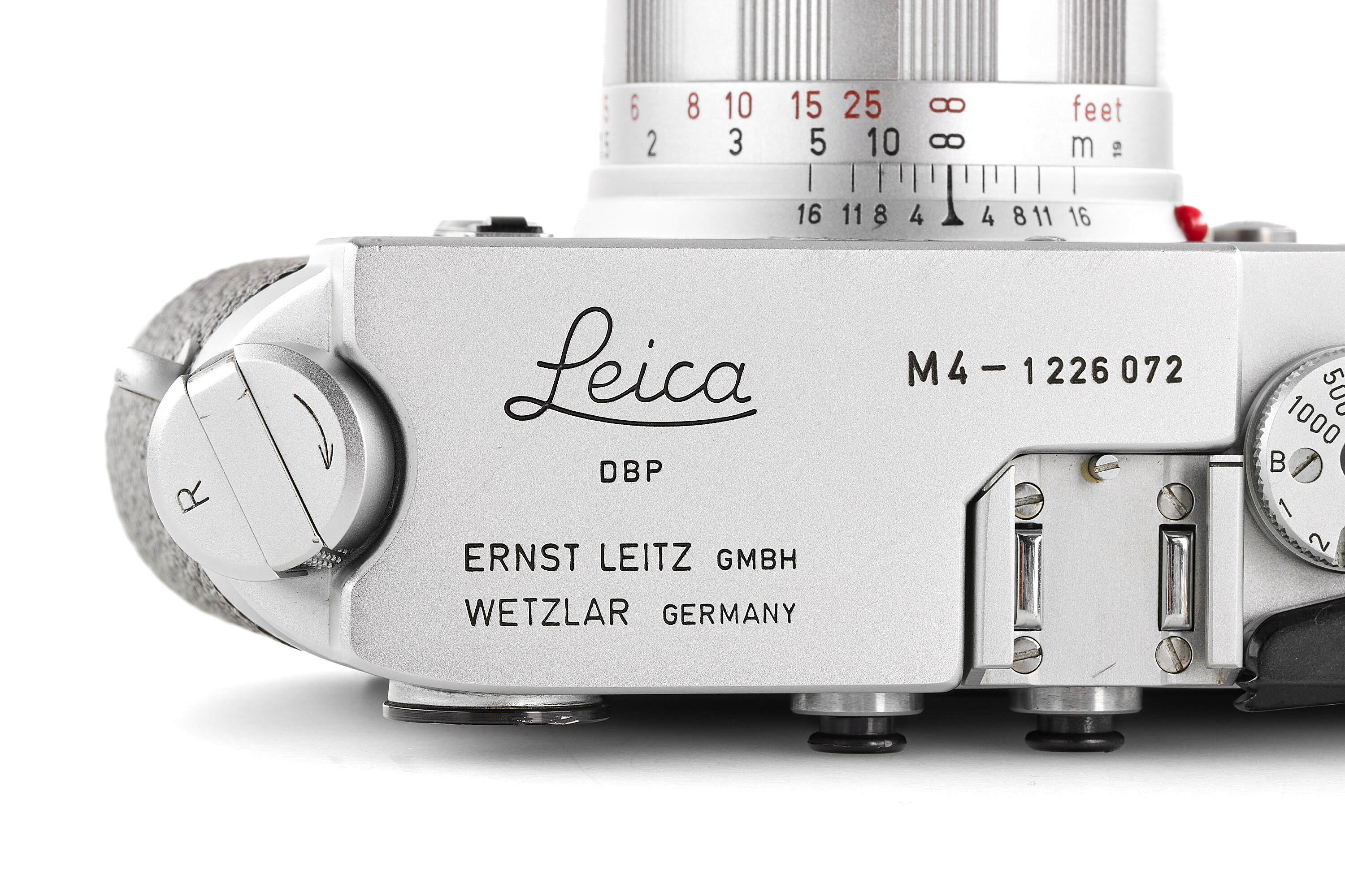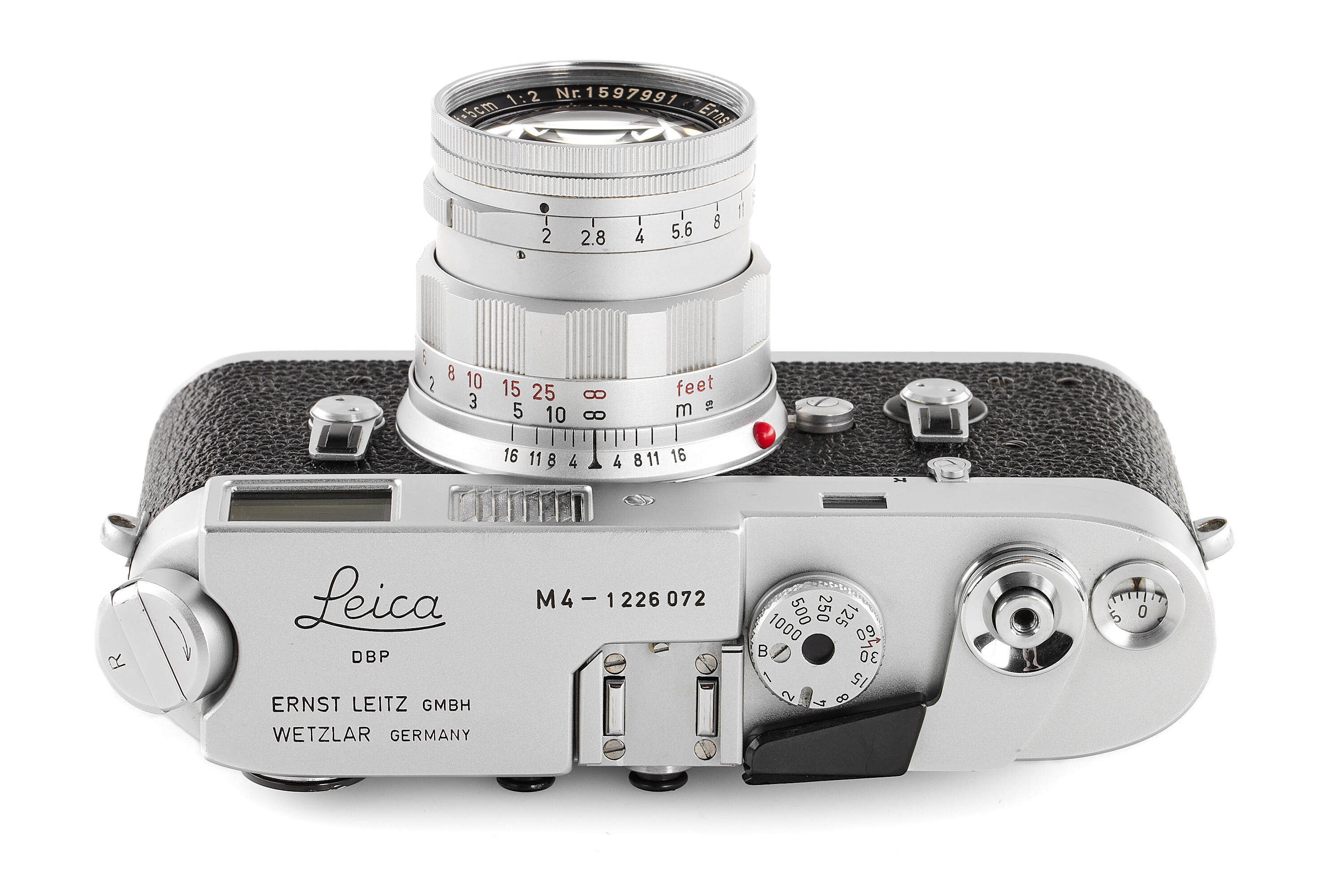 A classic, chrome Leica M4 in beautiful condition and working order, with rigid Summicron 2/5cm no.1597991, good optics.