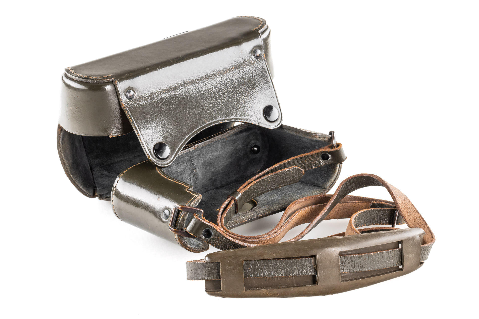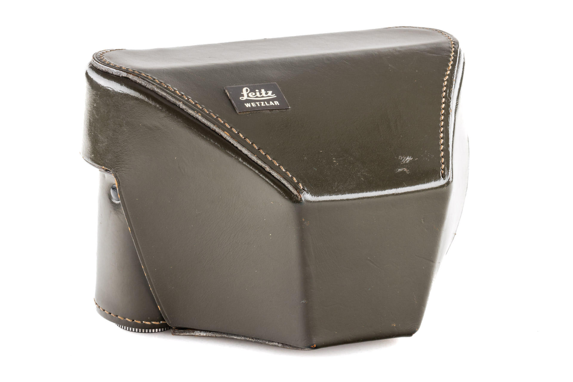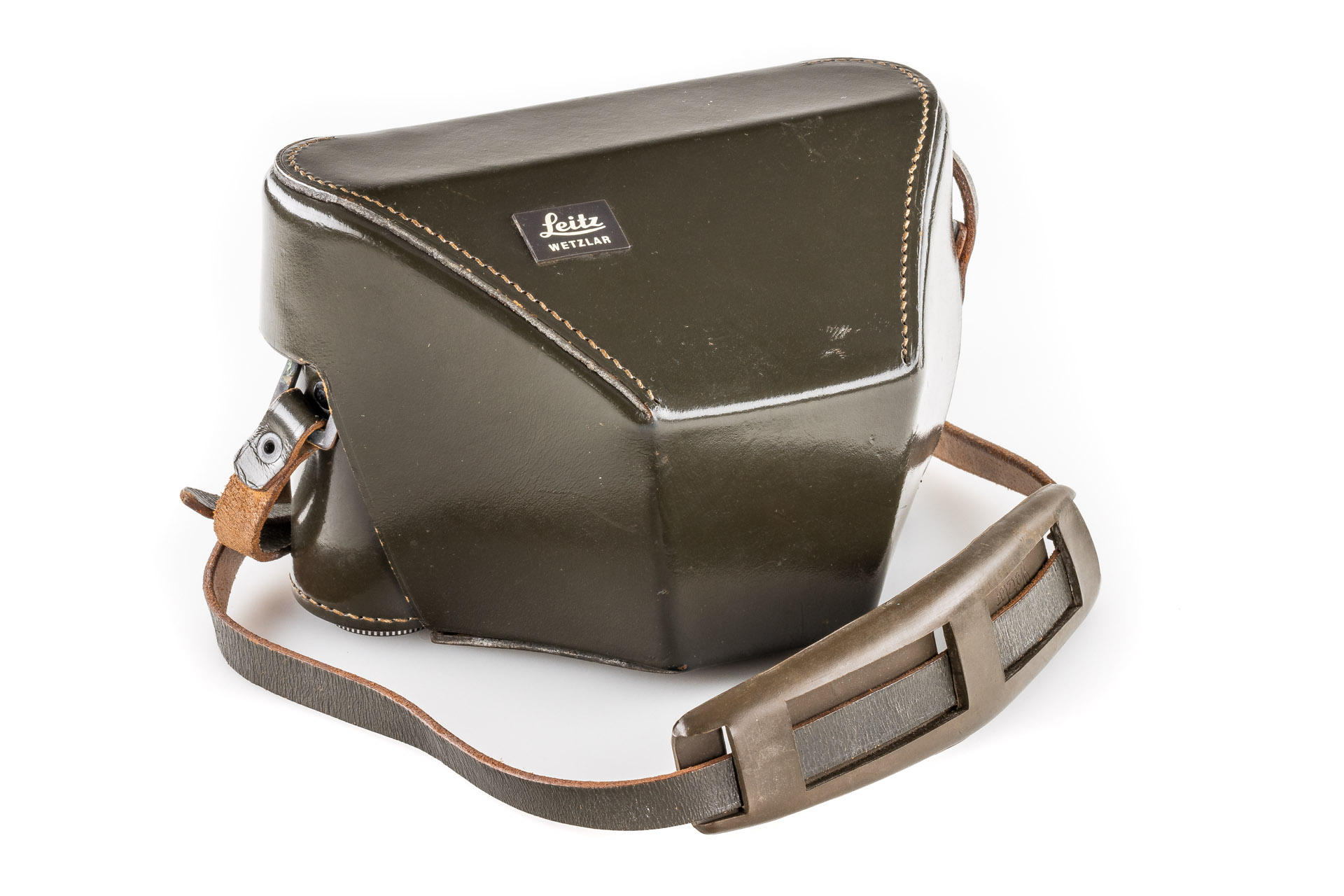 an original olive-green eveready case for the famous Leica M4 olive, in beautiful condition, only minimal signs of use, original strap with green shoulder pad