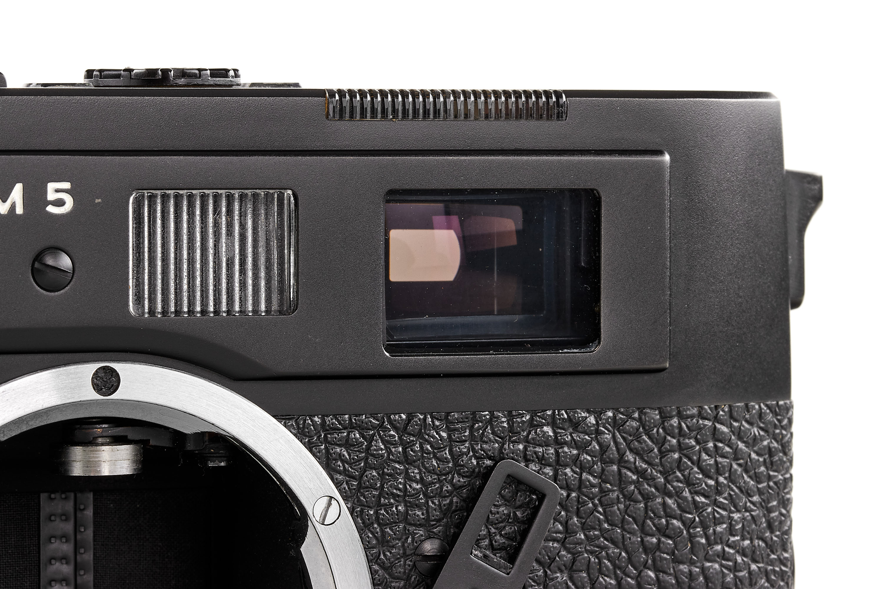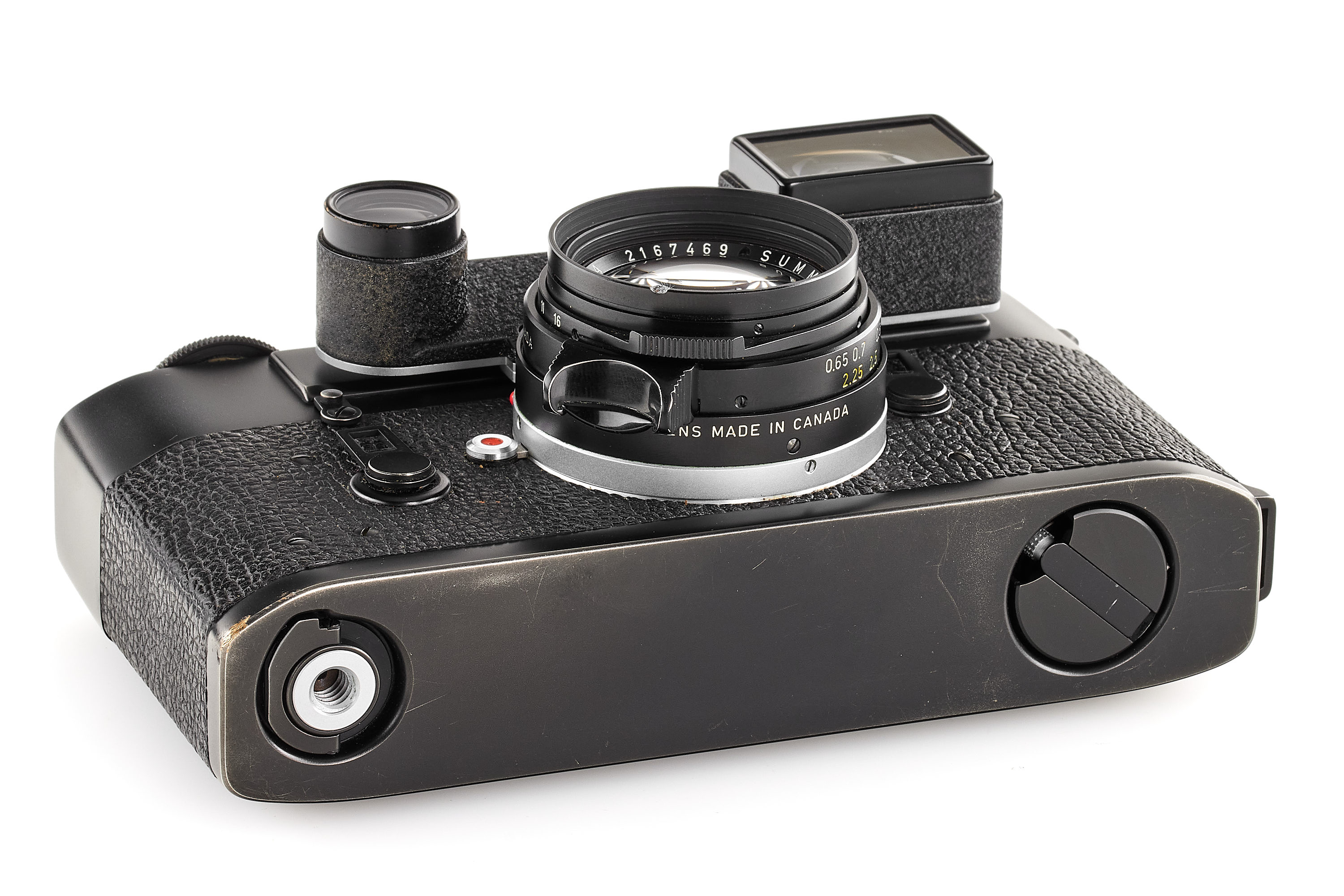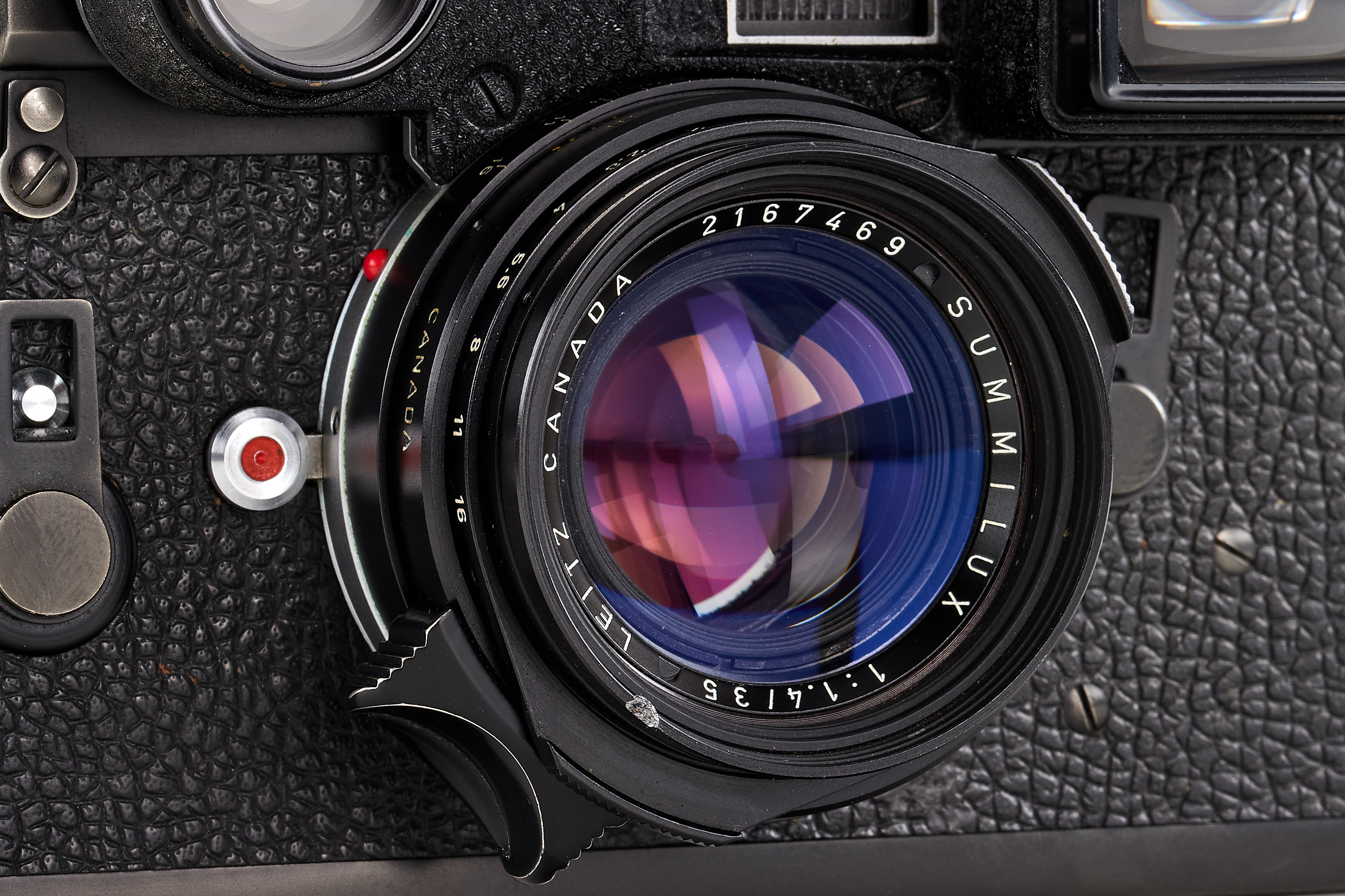 Nice Leica M5 black, 2-lug version in very good condition and working order, interesting combination with rare Summilux 1.4/35mm 11872 with black painted goggles and infinity lock, only showing a light dent on the front (not affecting the operation), clean and clear optics, with leather pouch and strap.