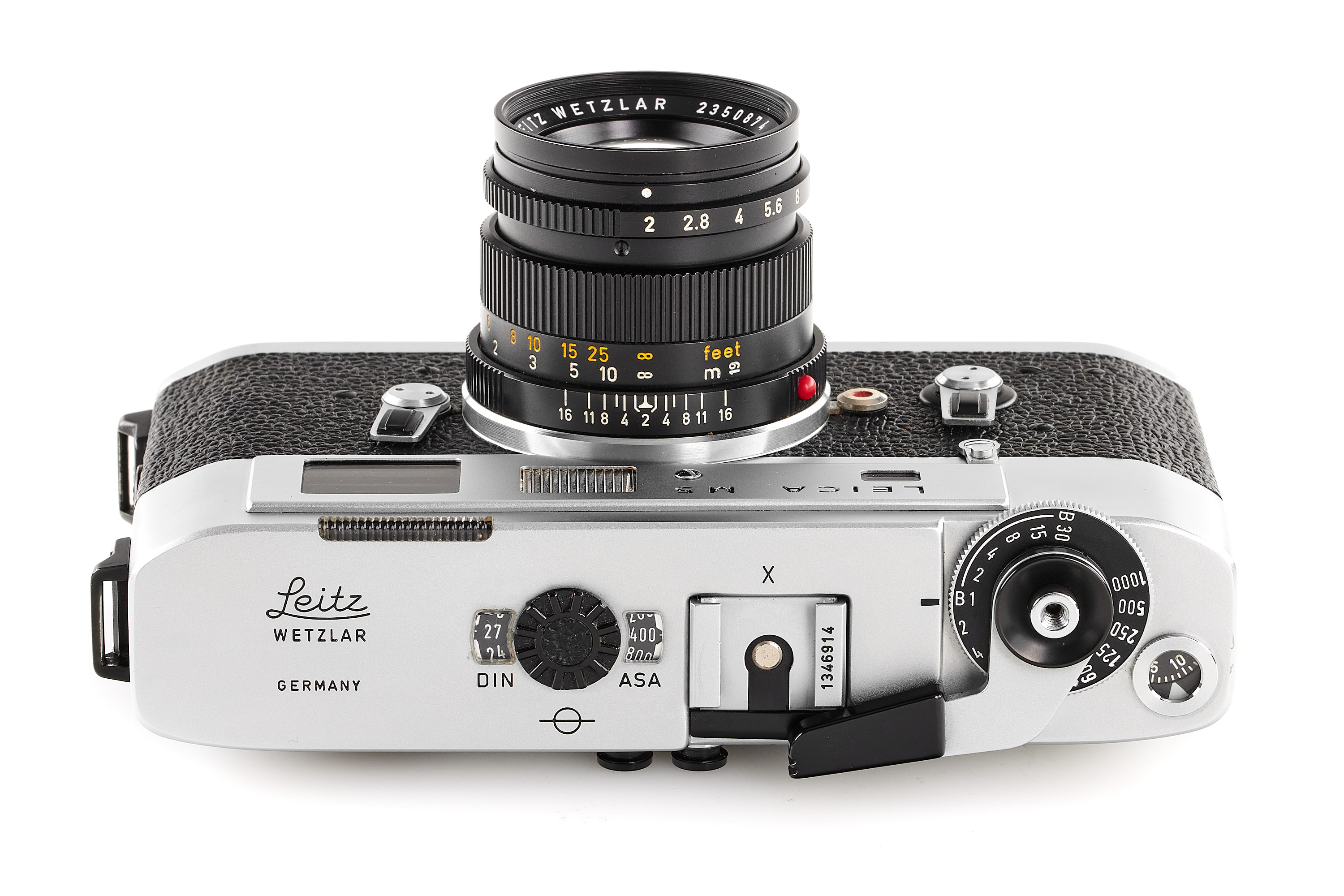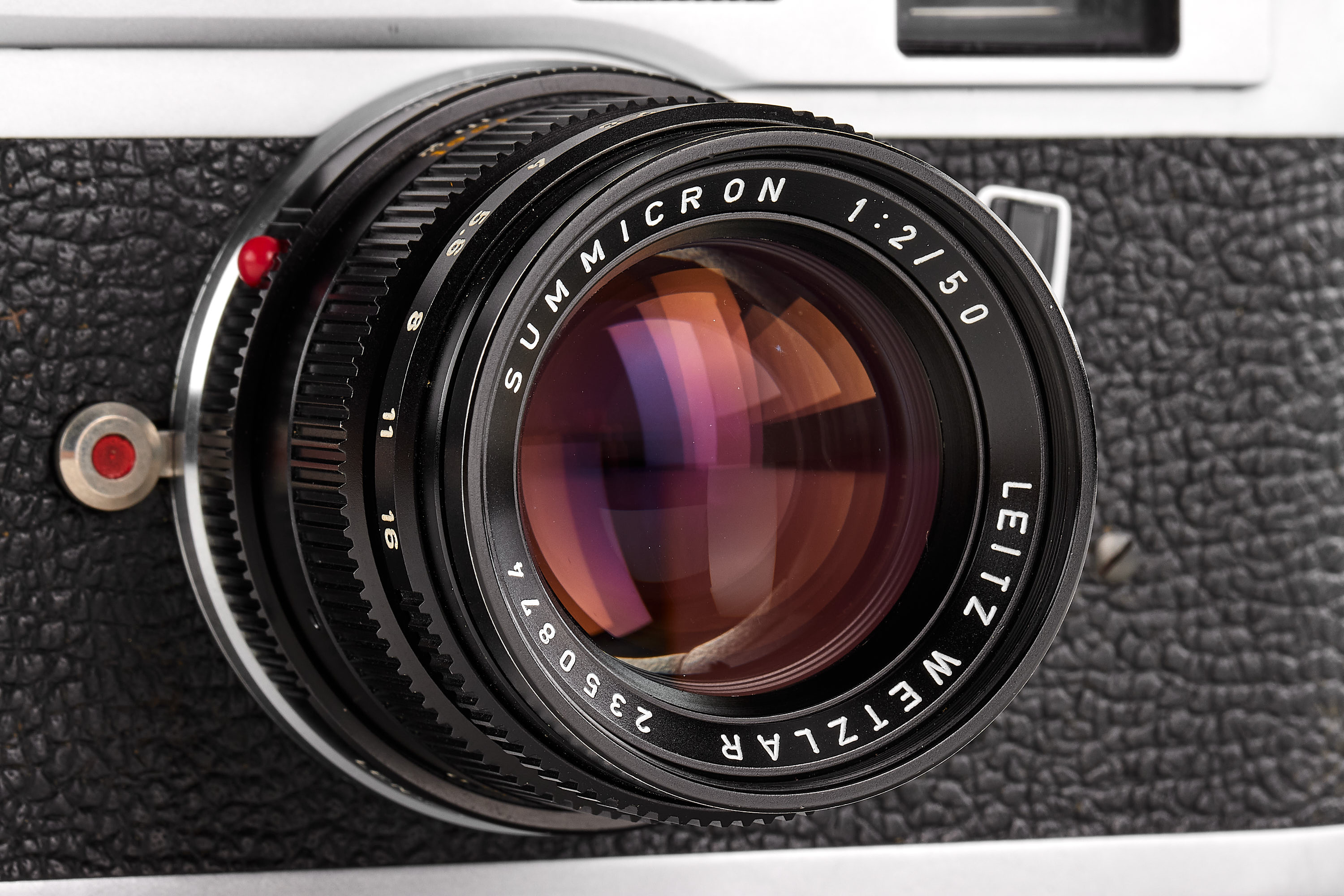 Beautiful early version with only 2 strap lugs, in mint condition and working order, modified M6 finder with 28mm frame, together with matching Summicron 2/50mm 11817 no.2350874, clean and clear optics, with front lens cap, strap, leather case and French instructions.
