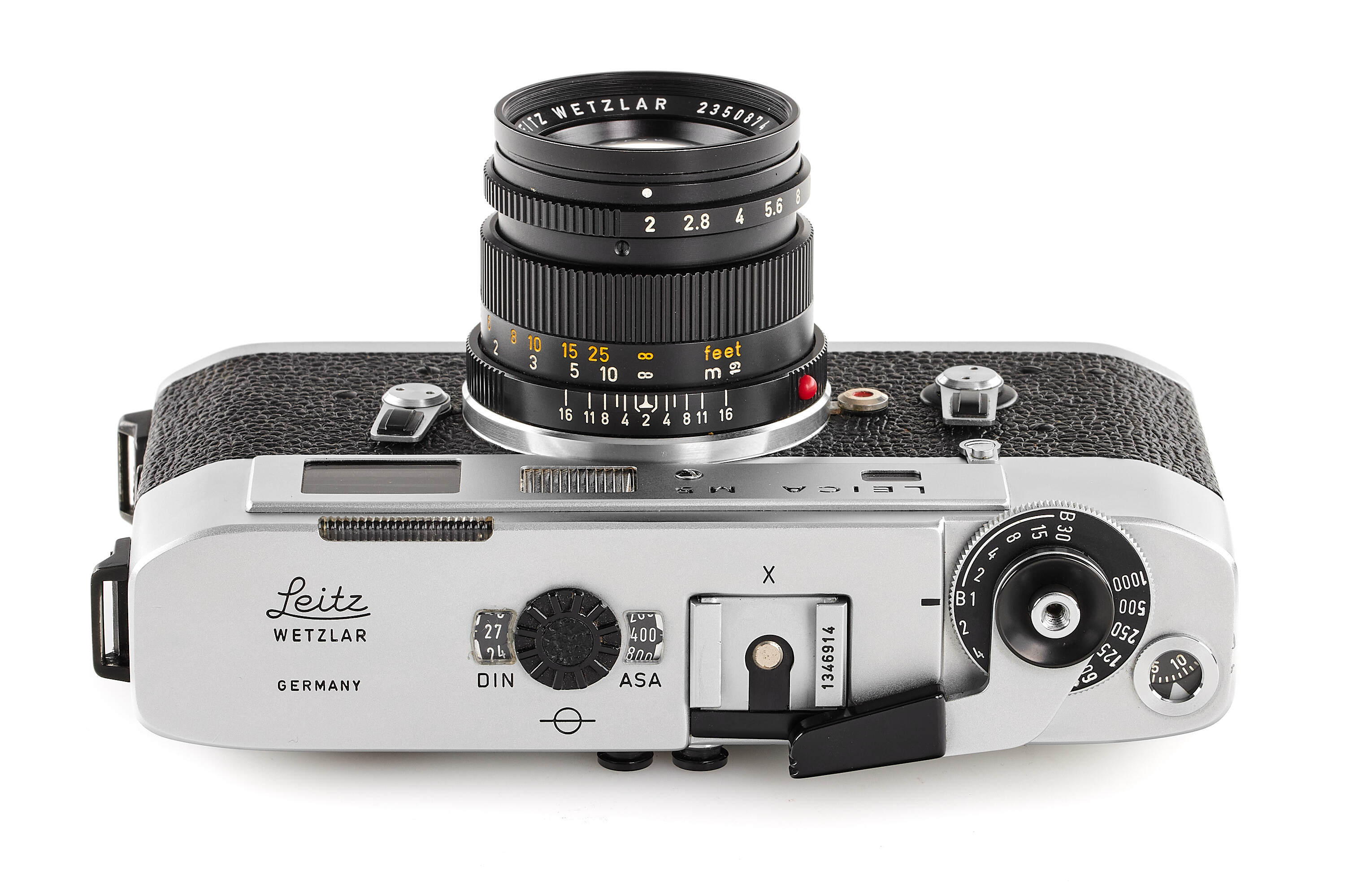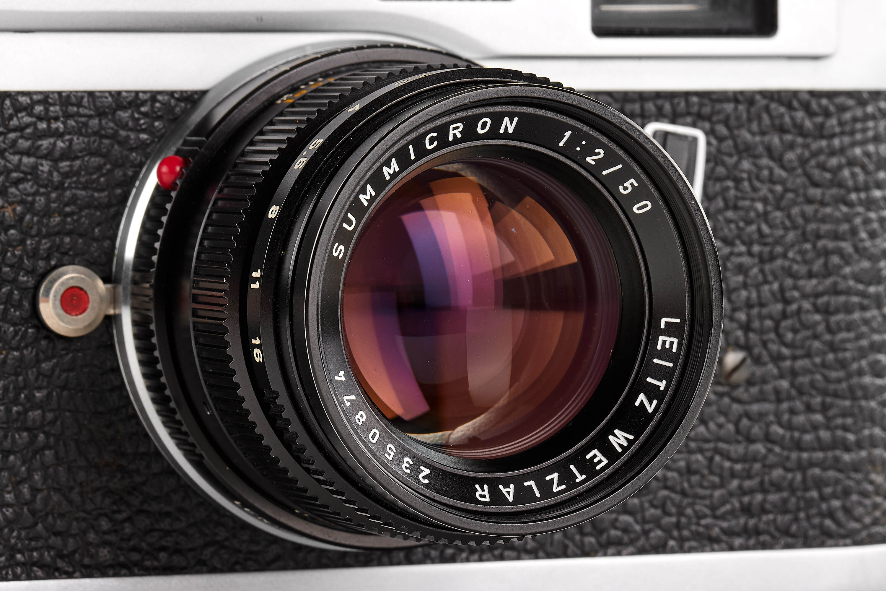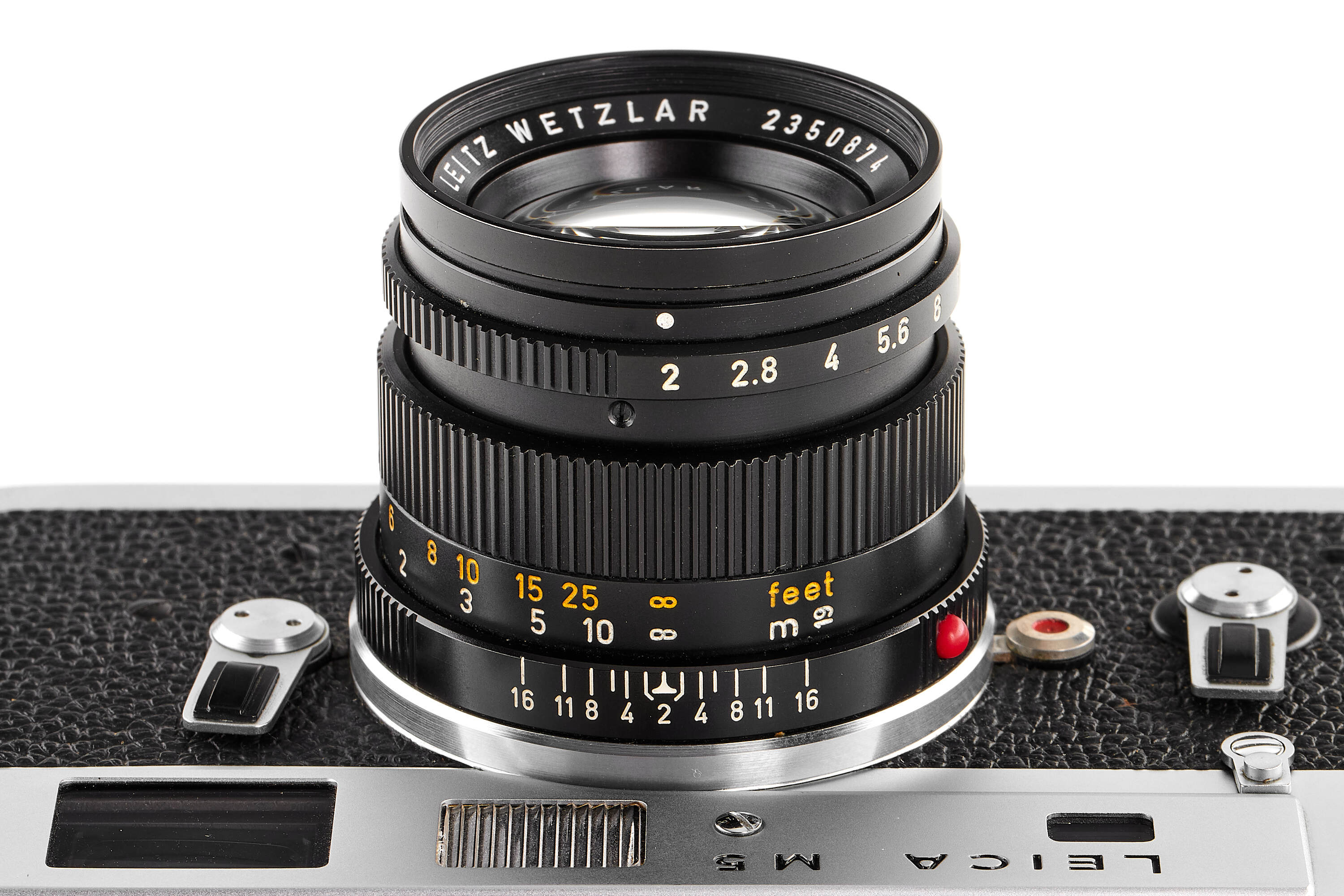 Beautiful early version with only 2 strap lugs, in mint condition and working order, modified M6 finder with 28mm frame, together with matching Summicron 2/50mm 11817 no.2350874, clean and clear optics, with front and rear lens caps, hood 12585, lens maker's box (not matching serial number), strap, body cap, leather case and French instructions.
