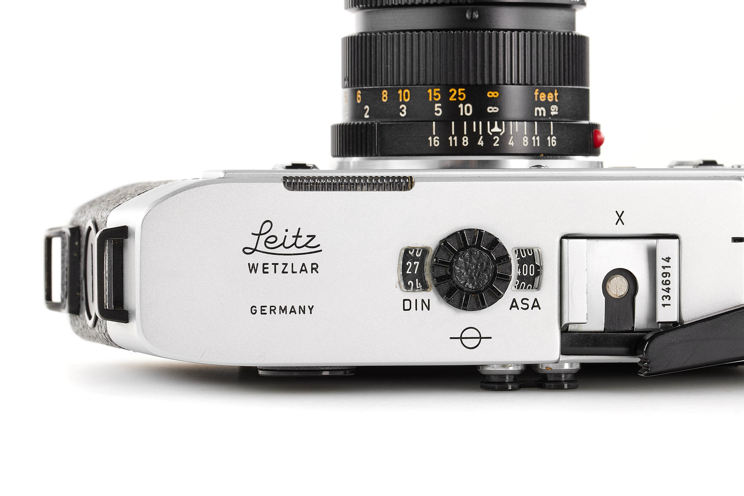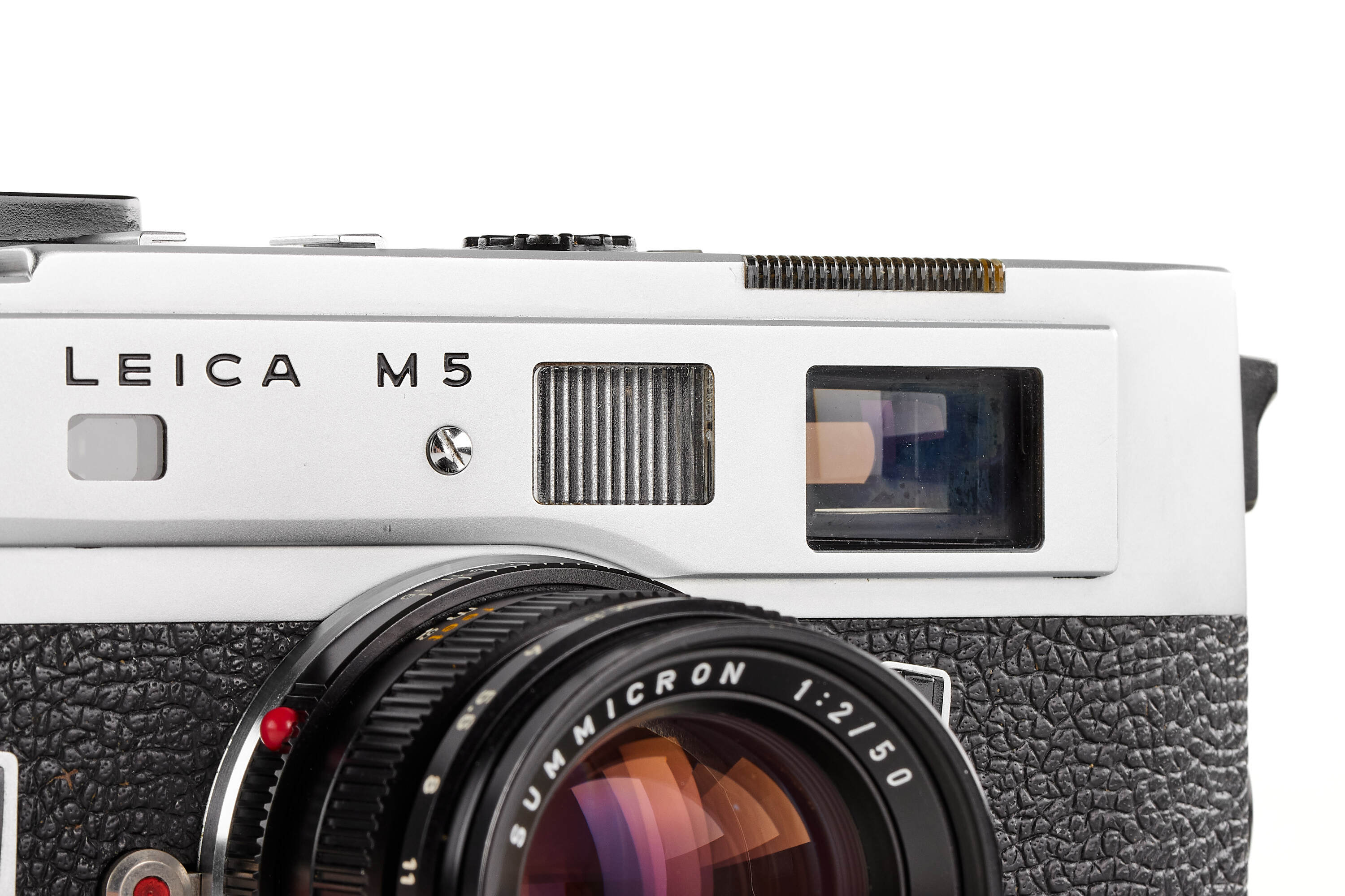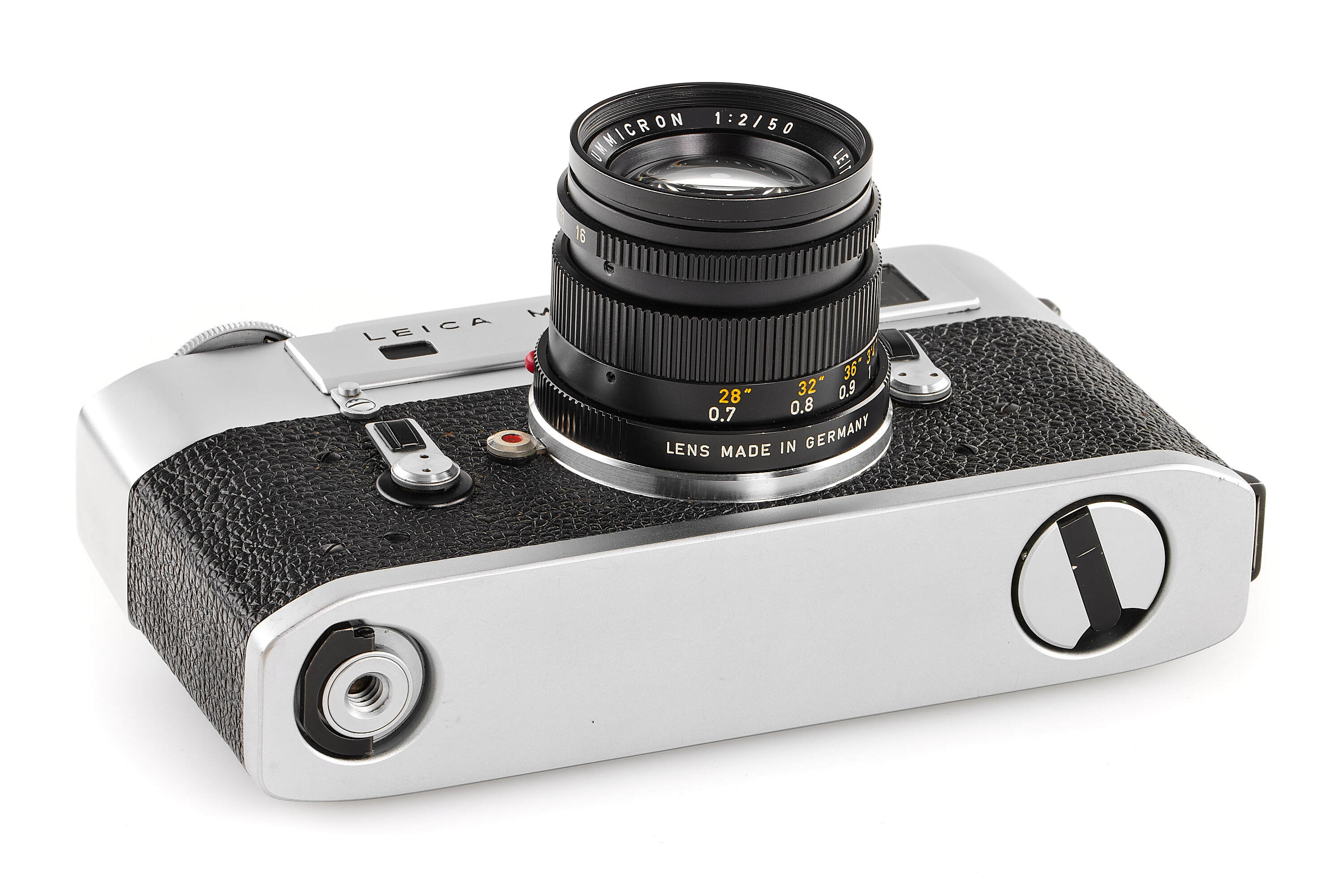 Beautiful early version with only 2 strap lugs, in mint condition and working order, modified M6 finder with 28mm frame, together with matching Summicron 2/50mm 11817 no.2350874, clean and clear optics, with front and rear lens caps, hood 12585, lens maker's box (not matching serial number), strap, body cap, leather case and French instructions.