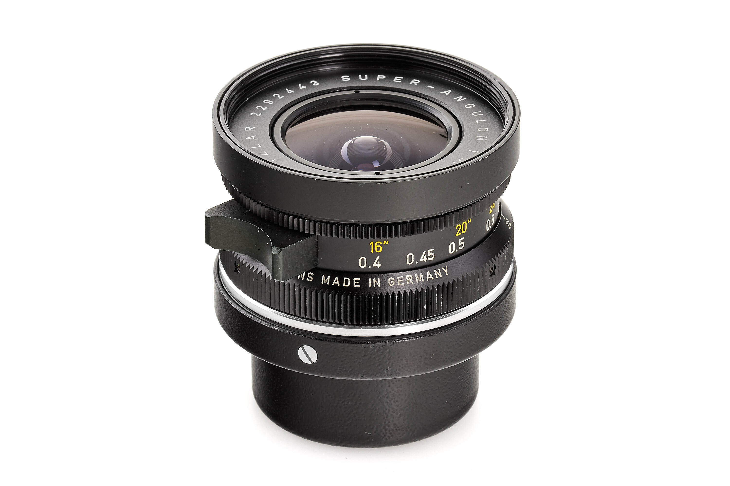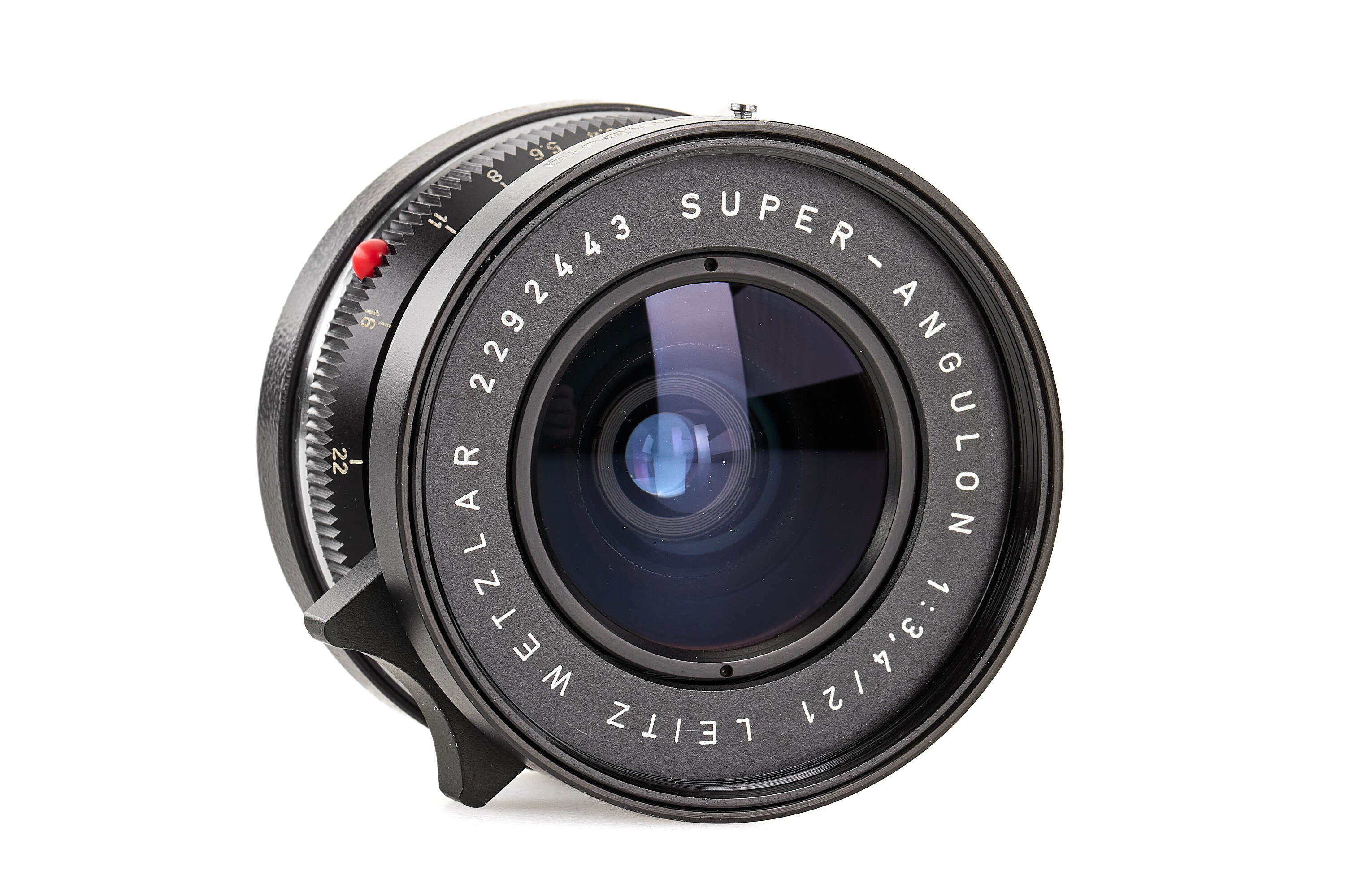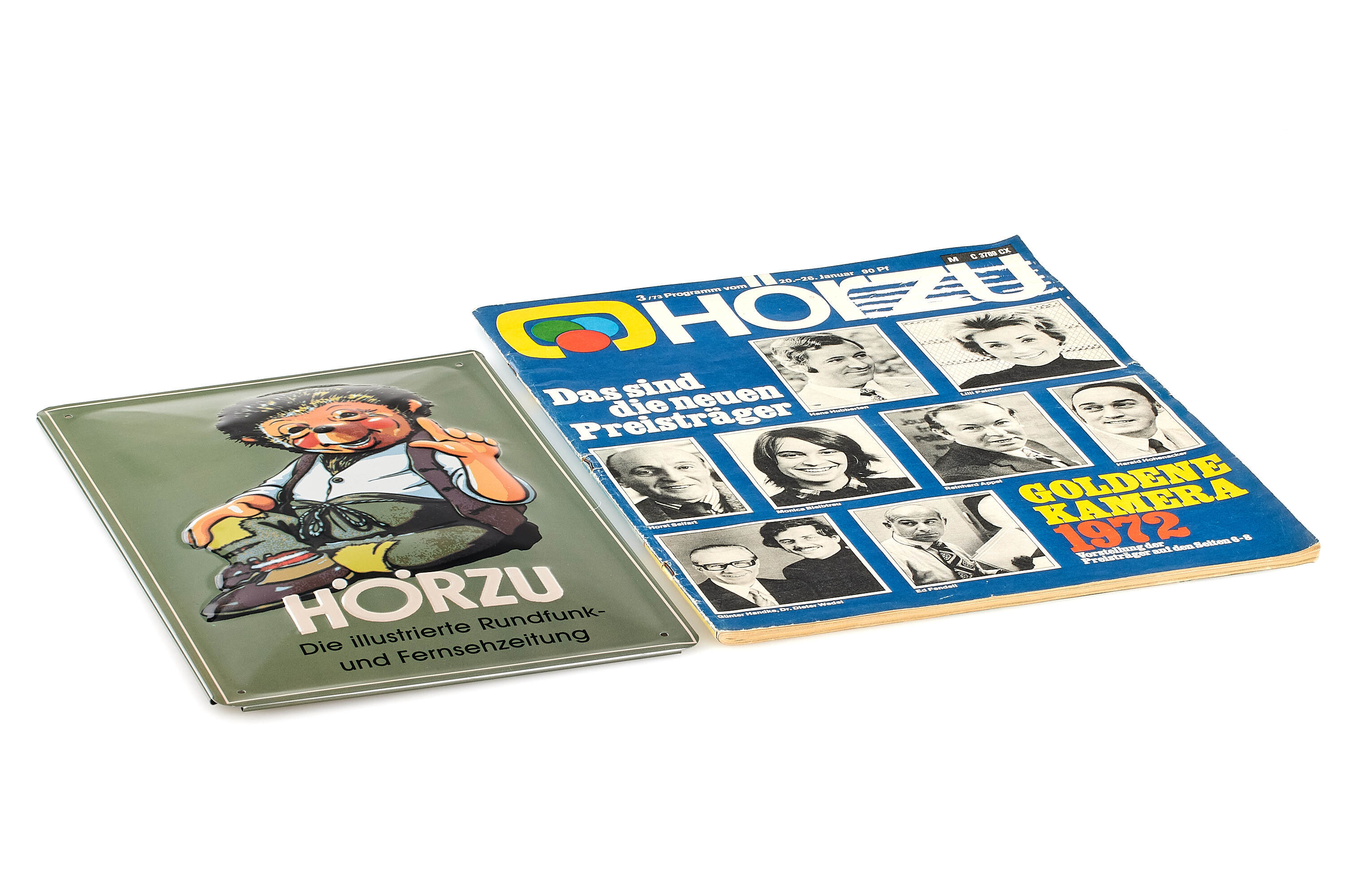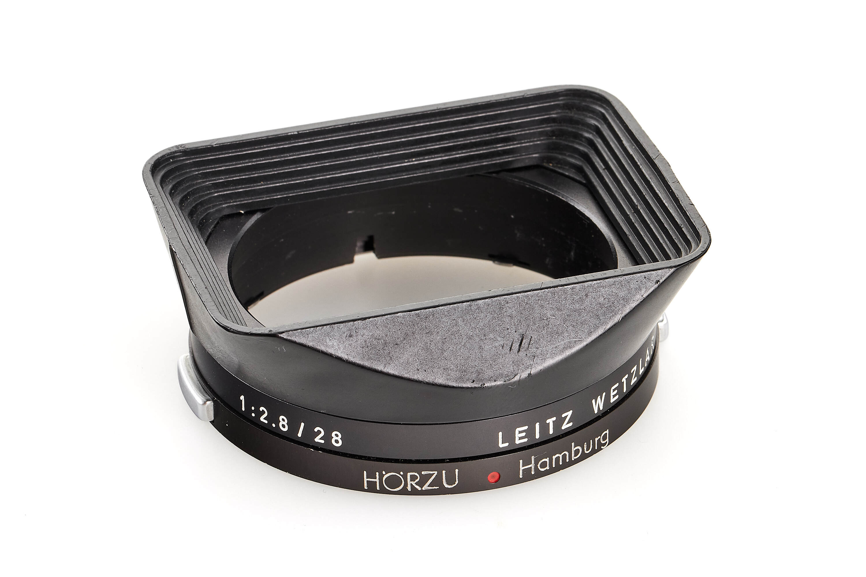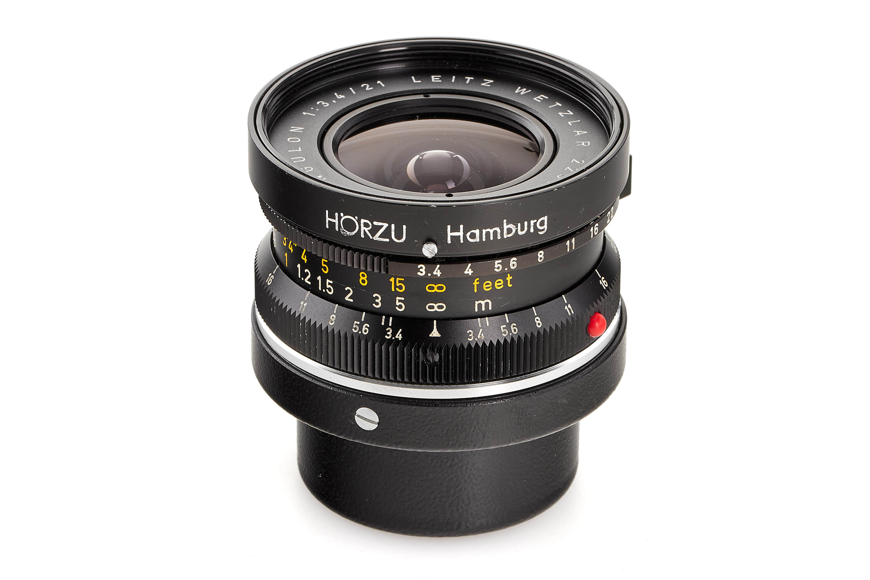 Interesting set used by Hörzu (German for listen), famous weekly German TV guide based in Hamburg, including a black Leica M5 2 lugs version no.1356680 in good condition, Super-Angulon 3.4/21mm no2292443 modified to be mounted on a M5 with rear cap and hood engraved 'HÖRZU Hamburg', Summicron 2/35mm no.2394041 with hood, both lenses also with 'HÖRZU Hamburg' engravings, with leather strap, together with a 20-26th January 1972 Hörzu magazine and Hörzu 20x30cm painted metal plate.