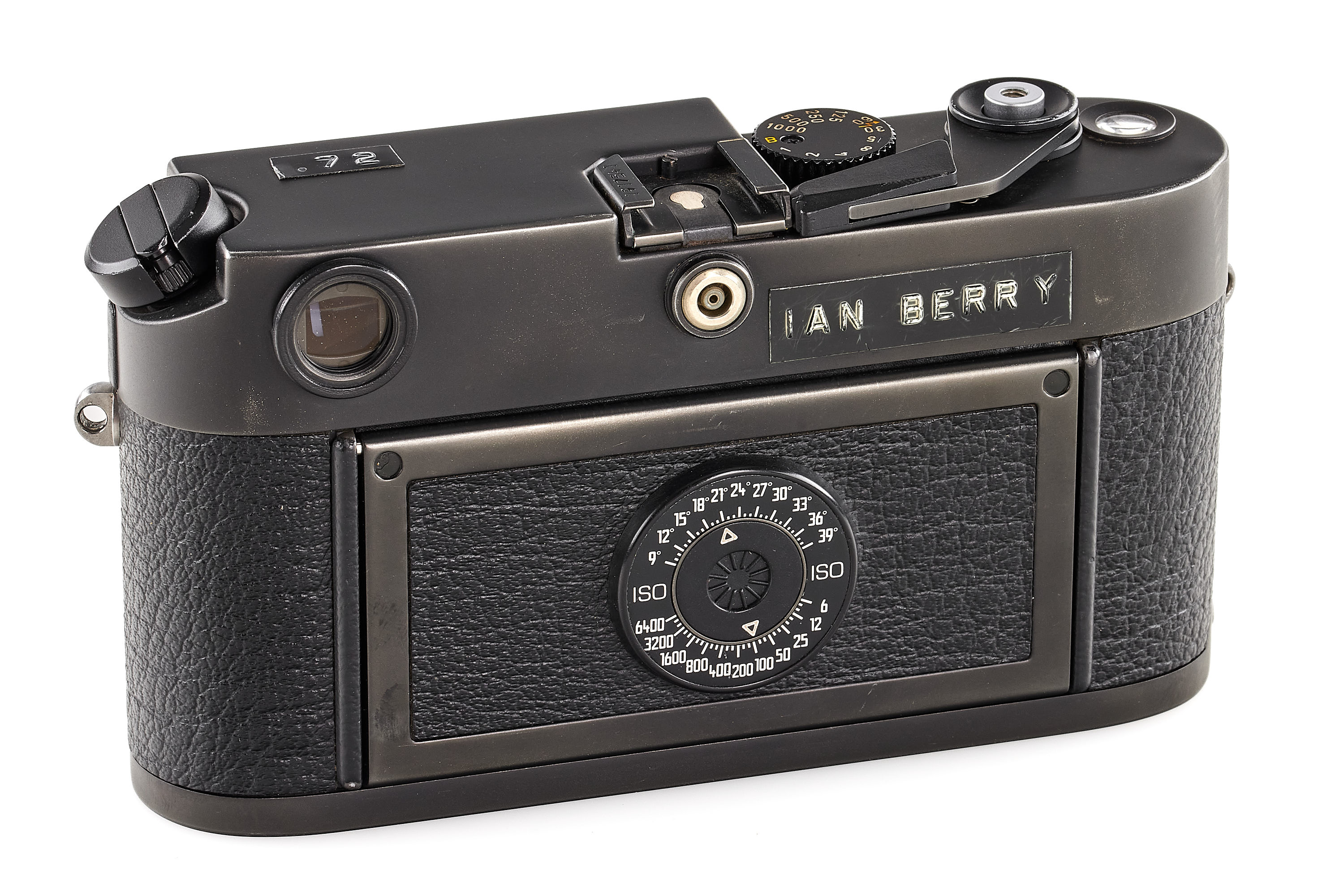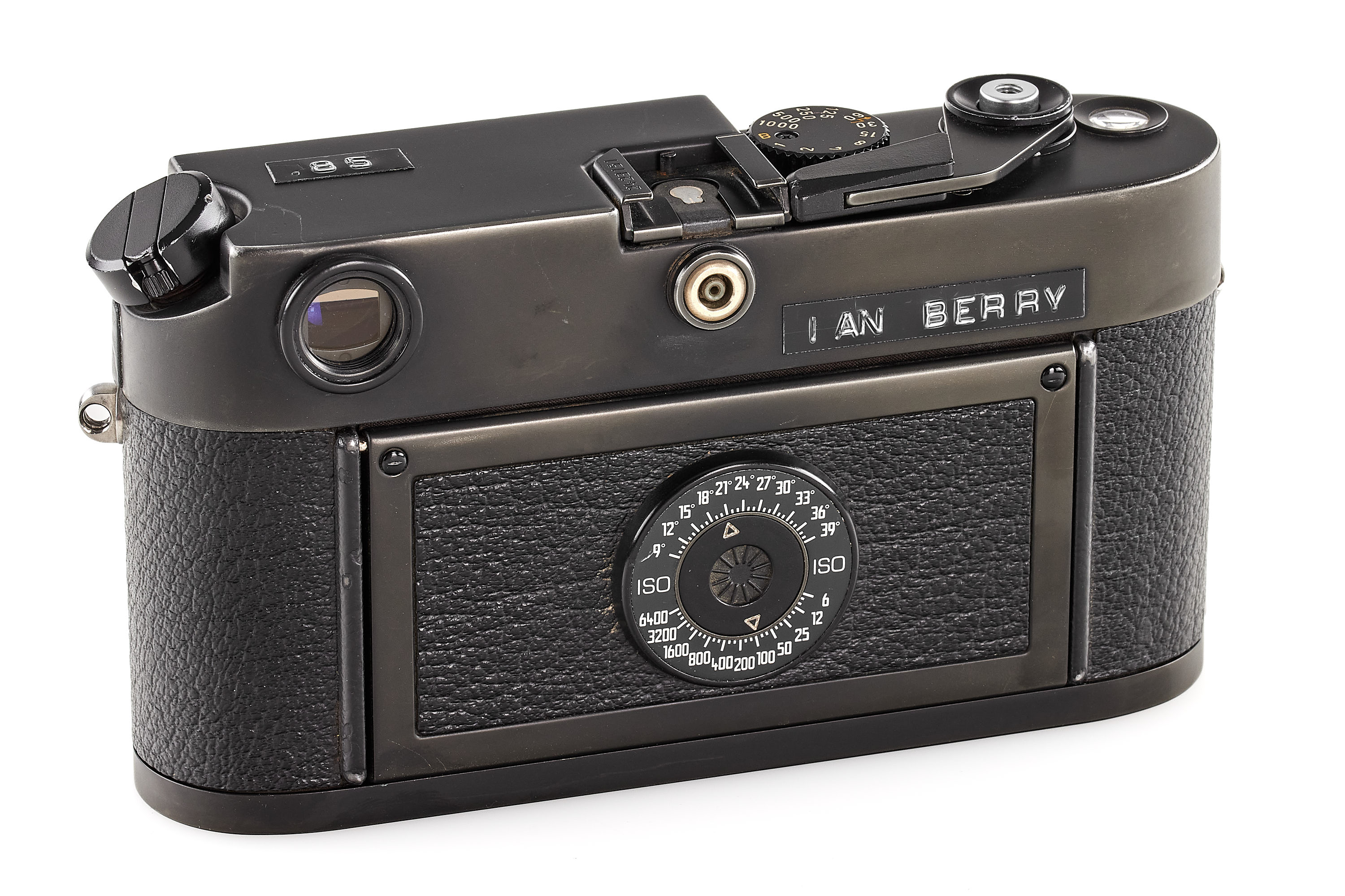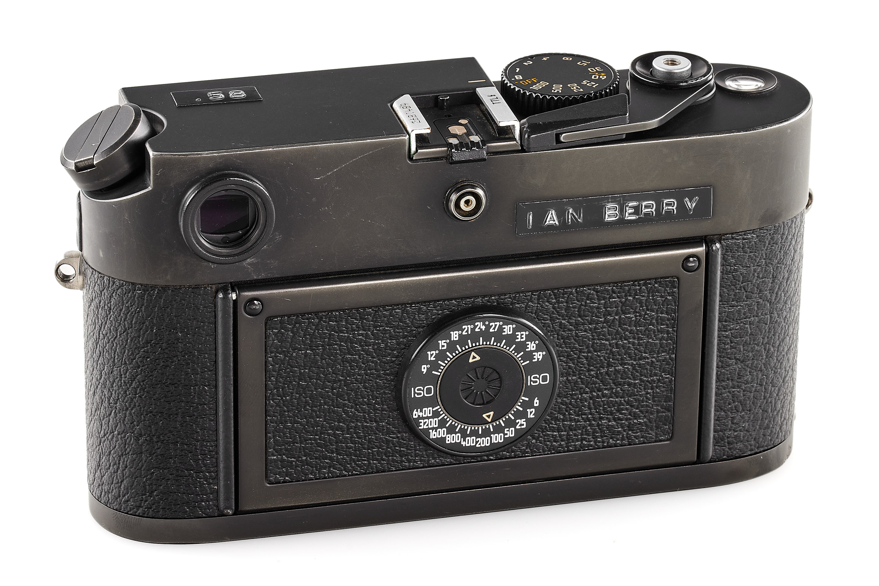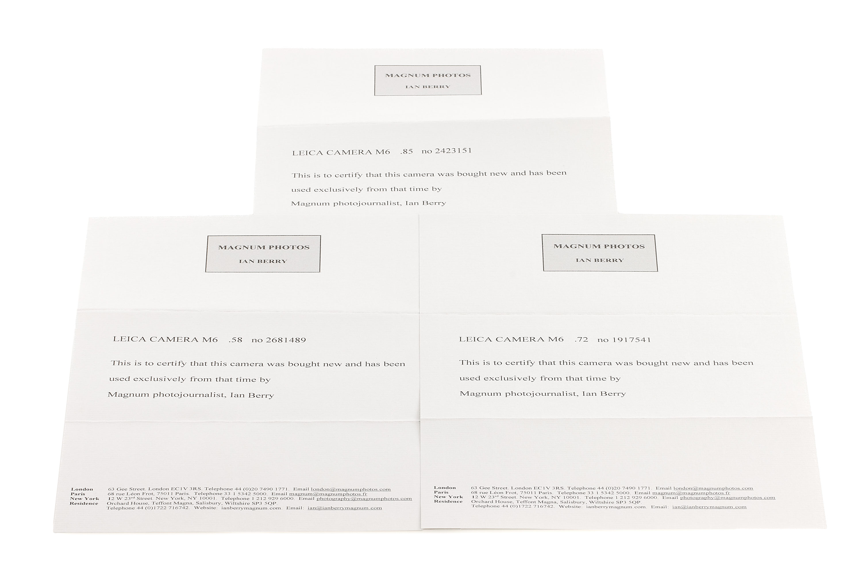 A set of three Leica M cameras, owned and used by the famous Magnum photographer Ian Berry. The set includes a Leica M6 TTL no.2681489 with 0.58 finder, Leica M6 no.1917541 with 0.72 finder, and Leica M6 no.2423151 with 0.85 finder. All cameras show visible signs of professional use. Each bears a distinctive sticker with the photographer's name on the back of the top plate. The set also includes two Rapidwinders, owned and used by the photographer. Three letters of provenance (one for each camera), and an example of the photographer's newest book 'Water'.