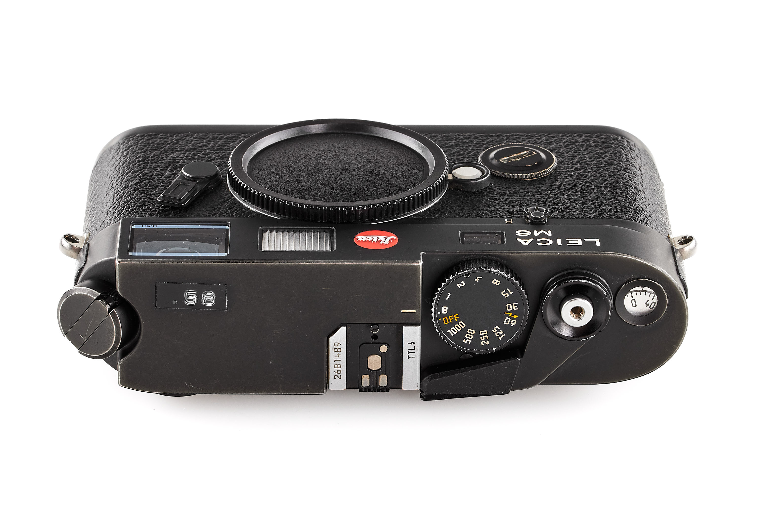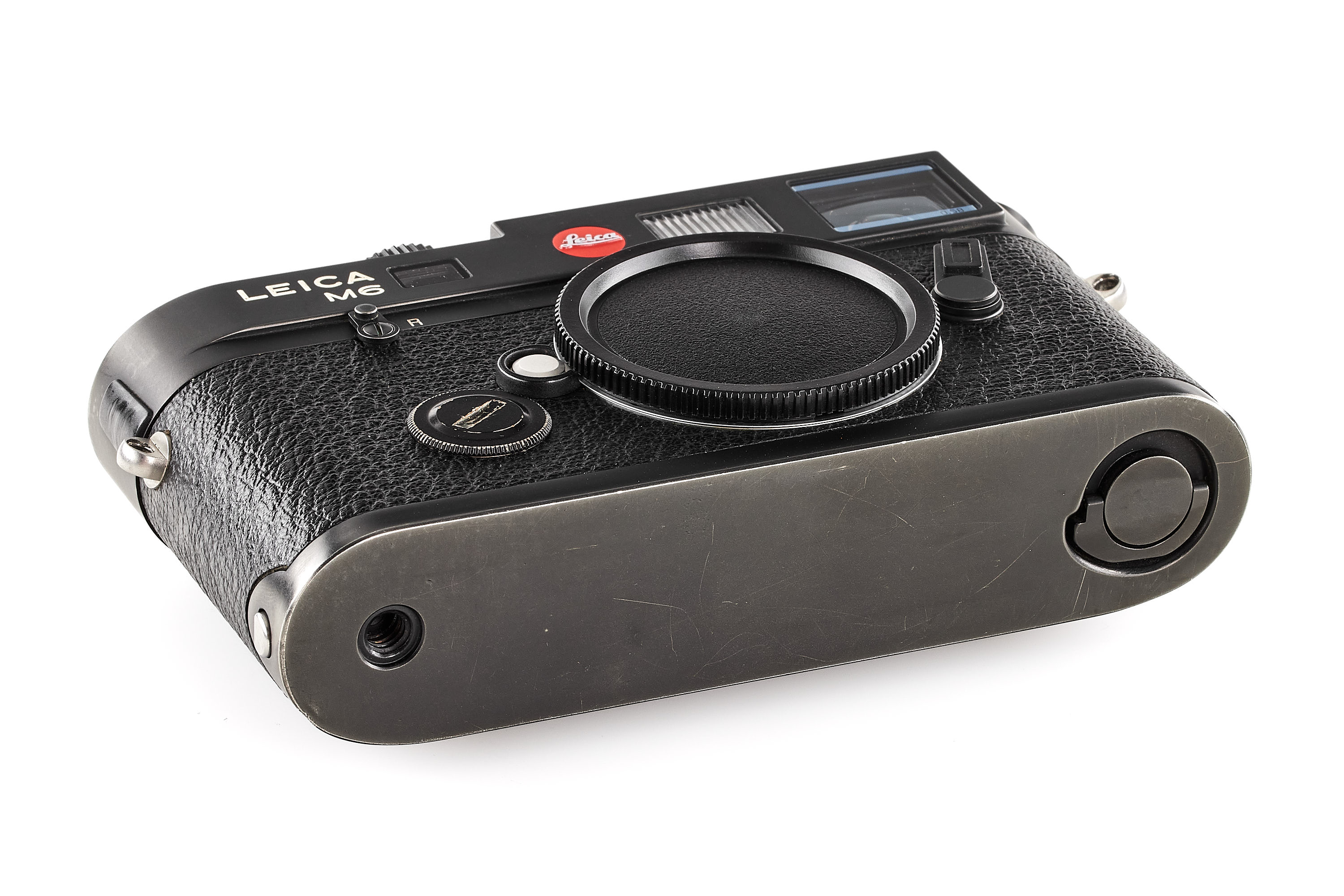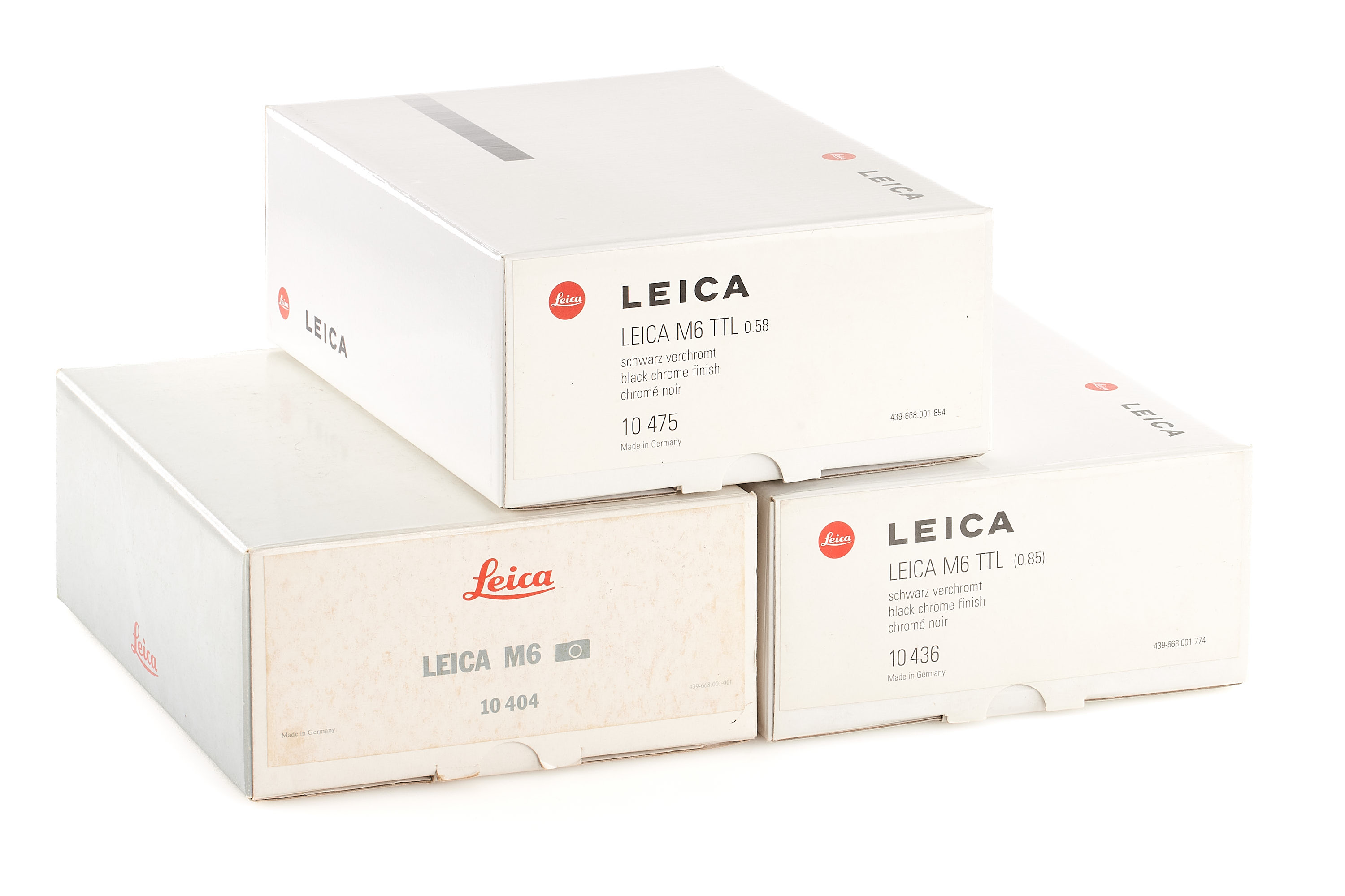 A set of three Leica M cameras, owned and used by the famous Magnum photographer Ian Berry. The set includes a Leica M6 TTL no.2681489 with 0.58 finder, Leica M6 no.1917541 with 0.72 finder, and Leica M6 no.2423151 with 0.85 finder. All cameras show visible signs of professional use. Each bears a distinctive sticker with the photographer's name on the back of the top plate. The set also includes two Rapidwinders, owned and used by the photographer. Three letters of provenance (one for each camera), and an example of the photographer's newest book 'Water'.