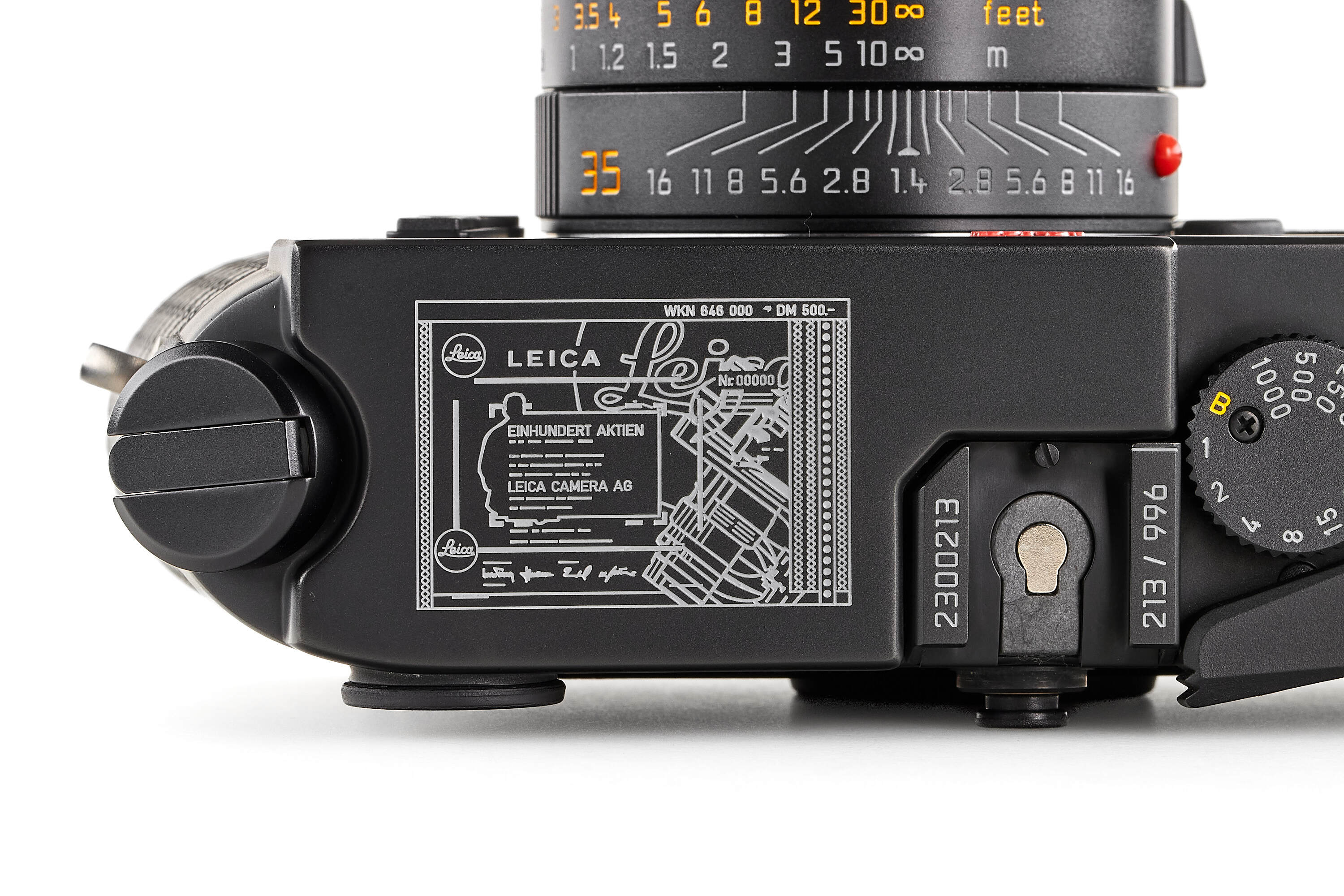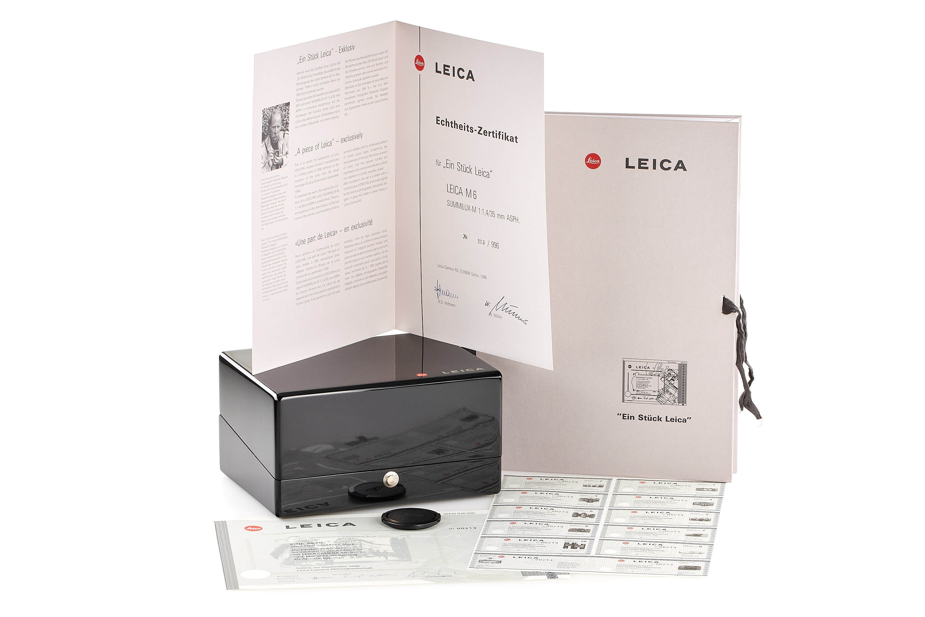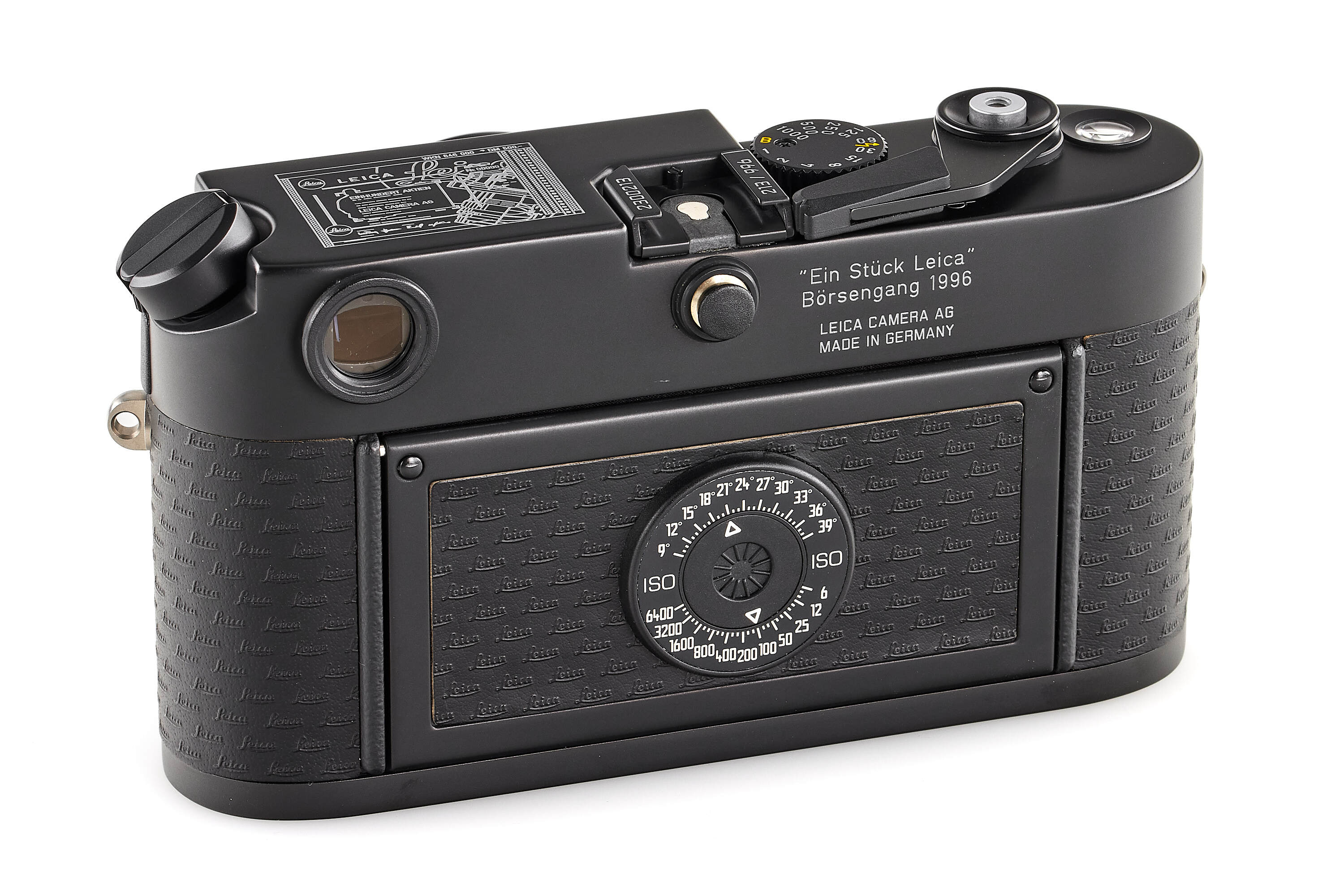 Limited edition of 996 cameras issued in 1996 to celebrate Leica Camera AG entering the public stock exchange, 'Ein Stück Leica' (A Piece of Leica) engraved on the back, serial number 2300213 and special number 213/996, in unused condition, with matching Summilux-M Asph.1.4/35mm no.3758213, complete with Leica share certificate, all papers and accessories, with wooden presentation box and maker's box.
