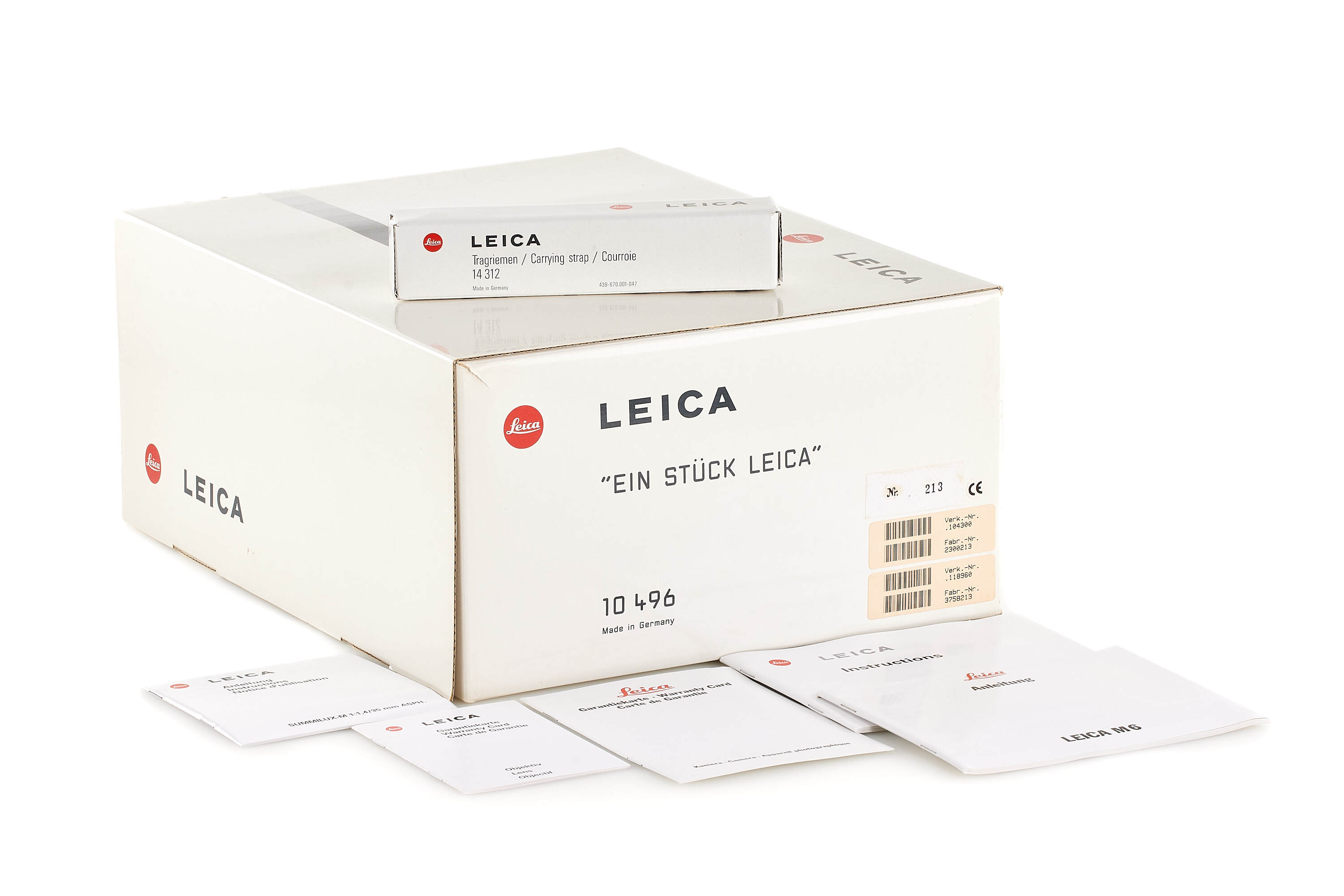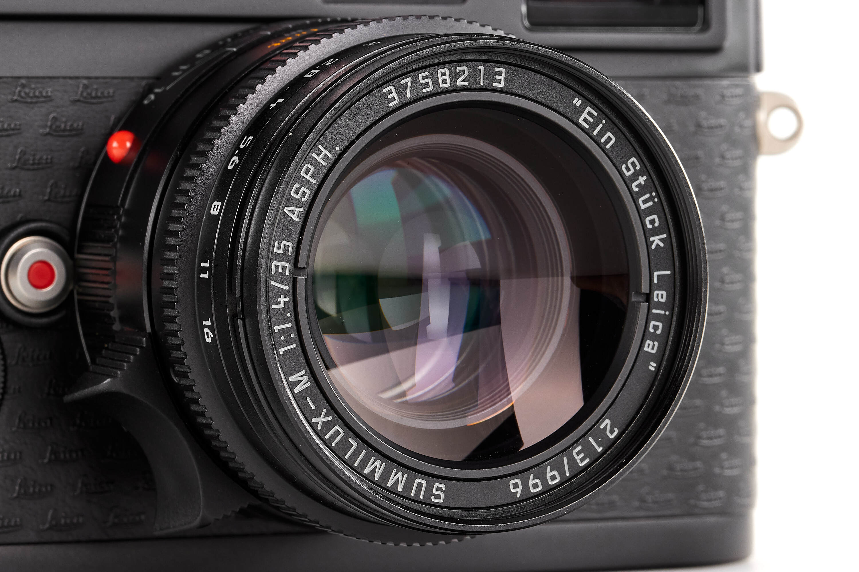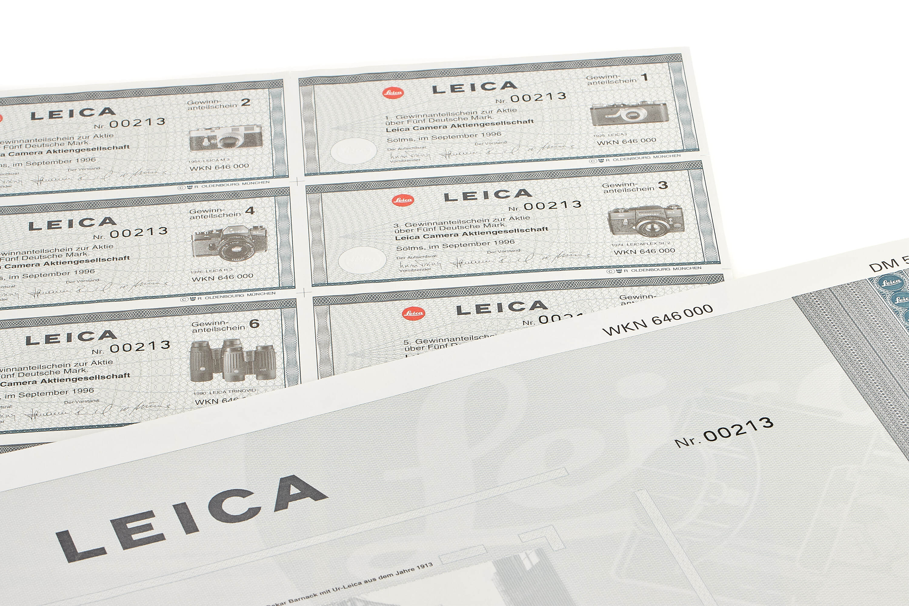 Limited edition of 996 cameras issued in 1996 to celebrate Leica Camera AG entering the public stock exchange, 'Ein Stück Leica' (A Piece of Leica) engraved on the back, serial number 2300213 and special number 213/996, in unused condition, with matching Summilux-M Asph.1.4/35mm no.3758213, complete with Leica share certificate, all papers and accessories, with wooden presentation box and maker's box.