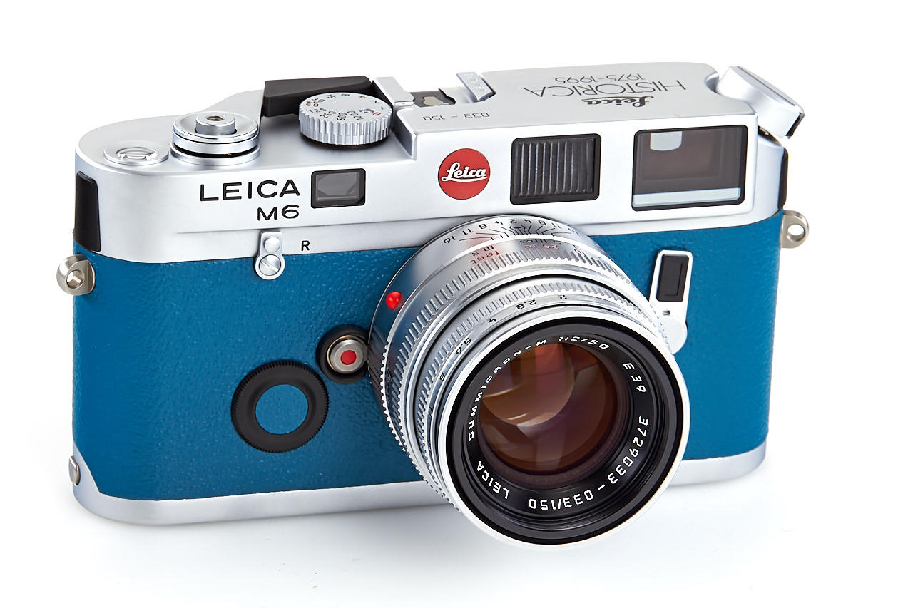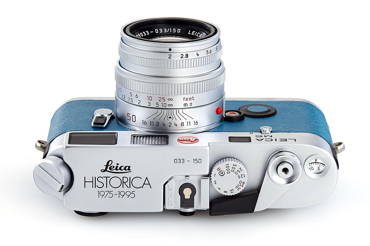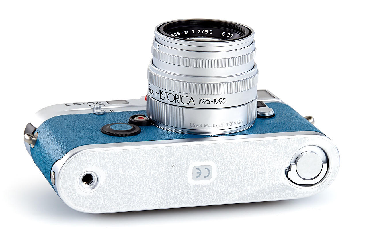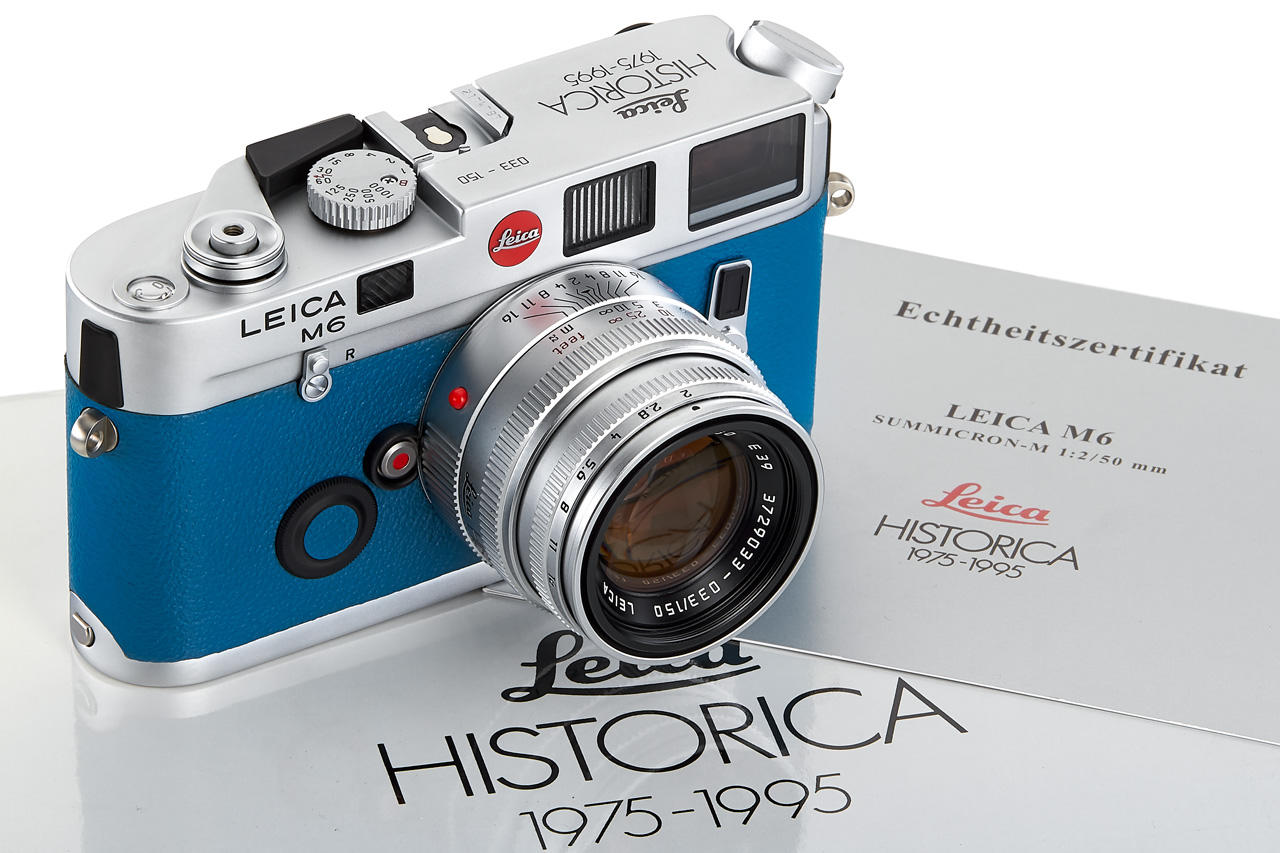 special edition for the 20th anniversary of Leica Historica Germany, only 150 sets have been produced, chrome body no.2174787 with blue leather covering, chrome Summicron-M 2/50mm no.3729033, complete with all papers, wooden presentation box, in maker's box