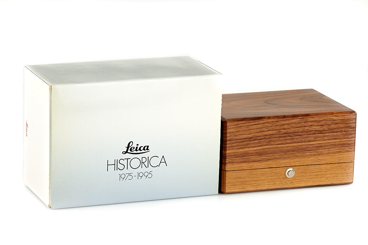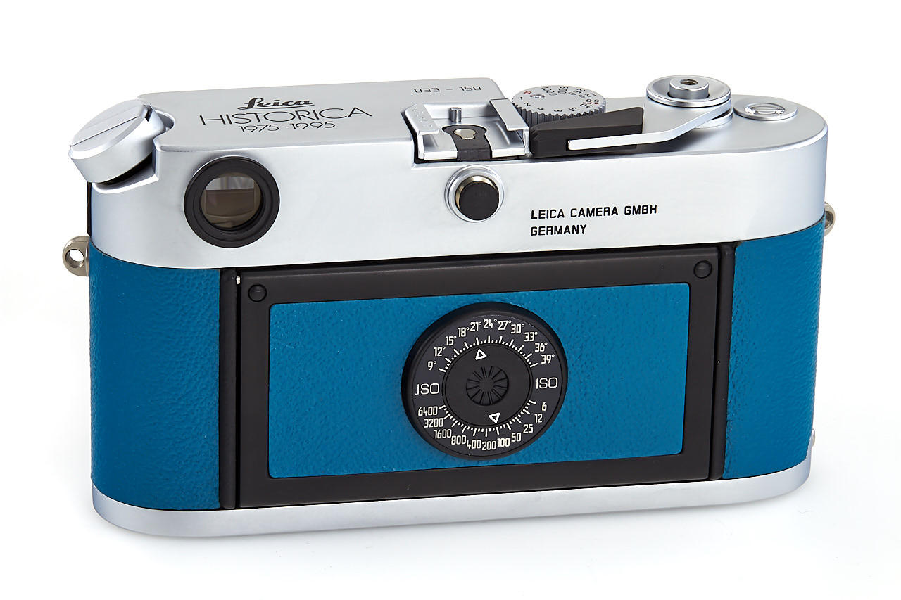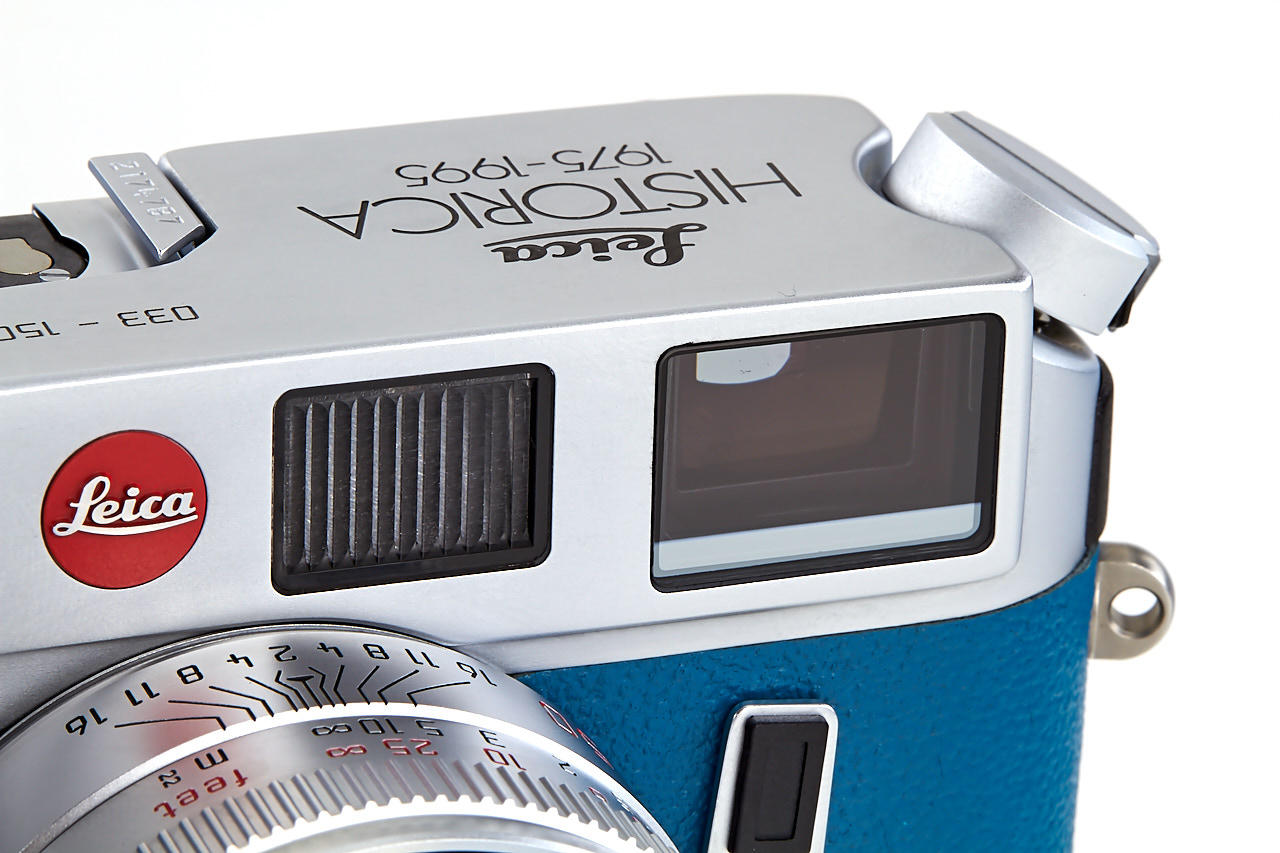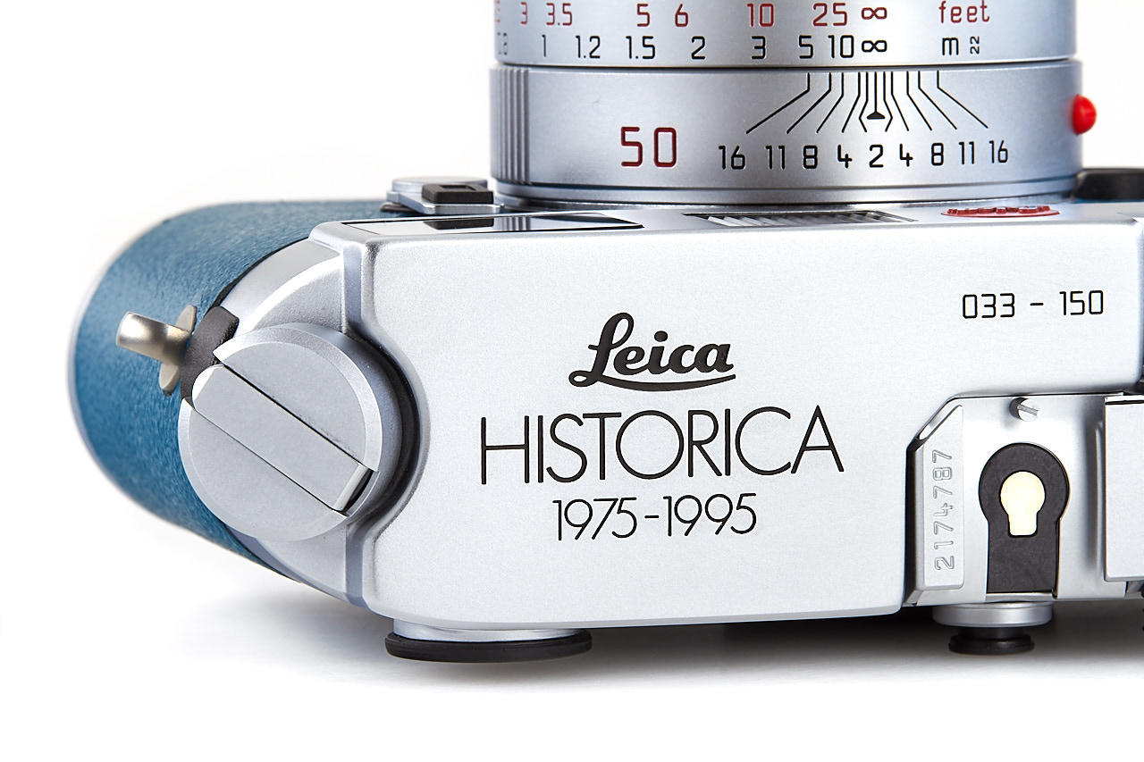 special edition for the 20th anniversary of Leica Historica Germany, only 150 sets have been produced, chrome body no.2174787 with blue leather covering, chrome Summicron-M 2/50mm no.3729033, complete with all papers, wooden presentation box, in maker's box