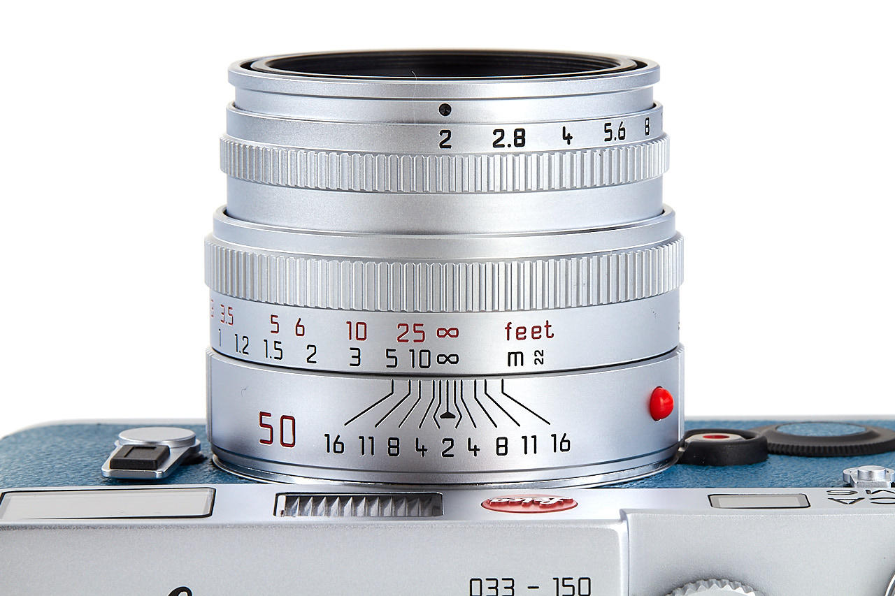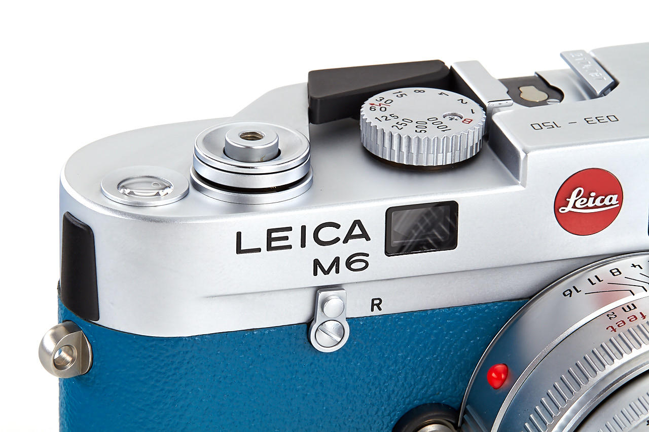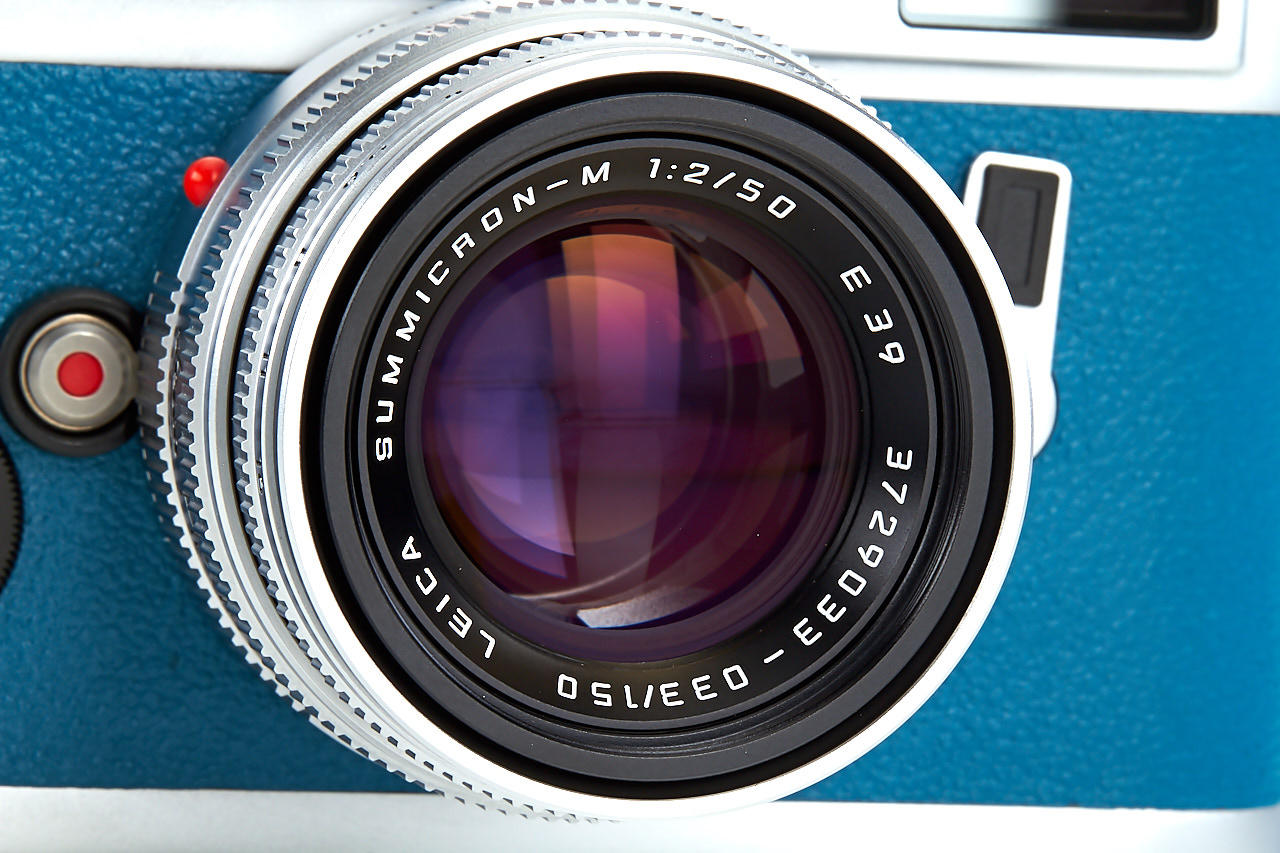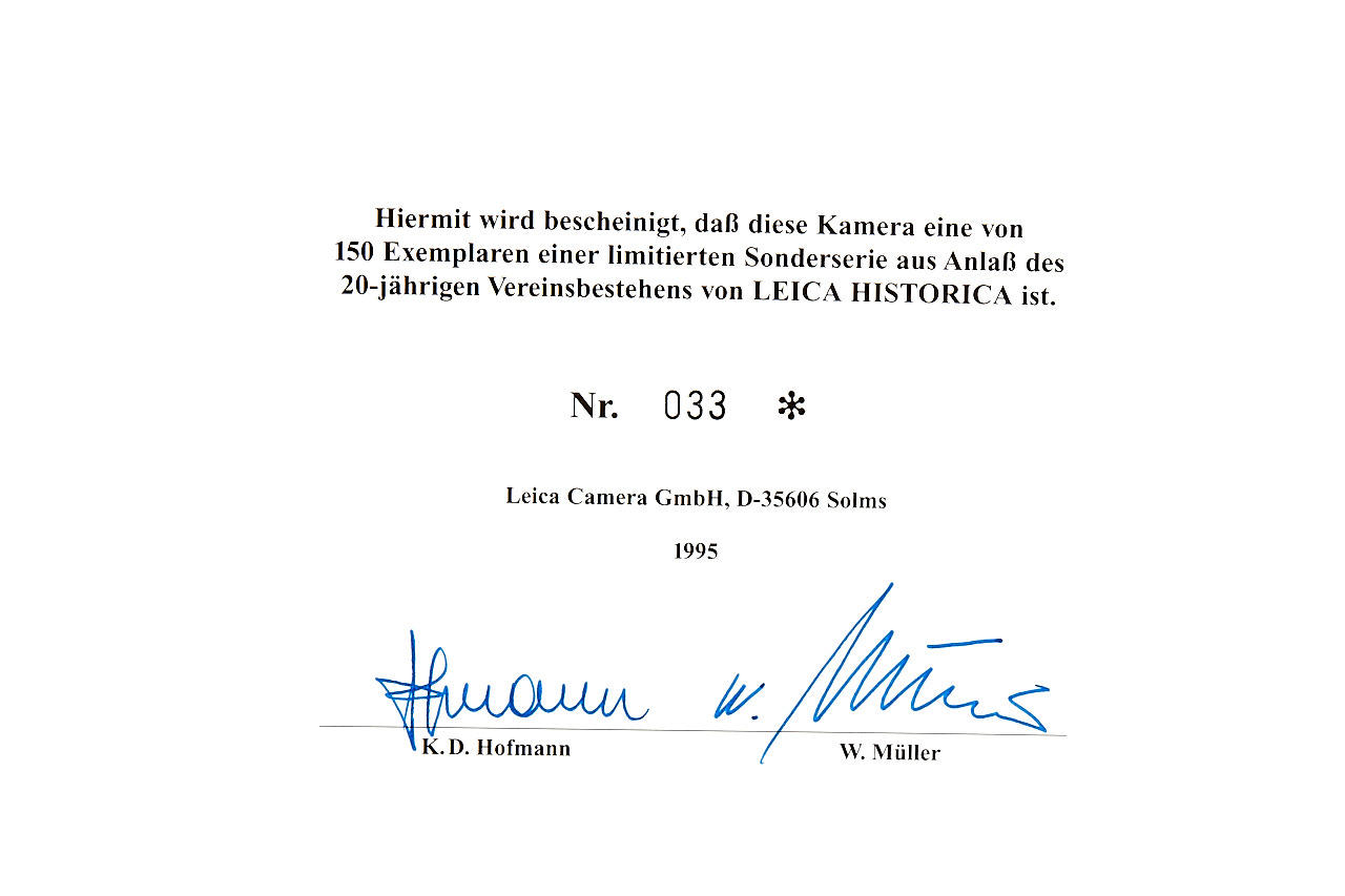 special edition for the 20th anniversary of Leica Historica Germany, only 150 sets have been produced, chrome body no.2174787 with blue leather covering, chrome Summicron-M 2/50mm no.3729033, complete with all papers, wooden presentation box, in maker's box