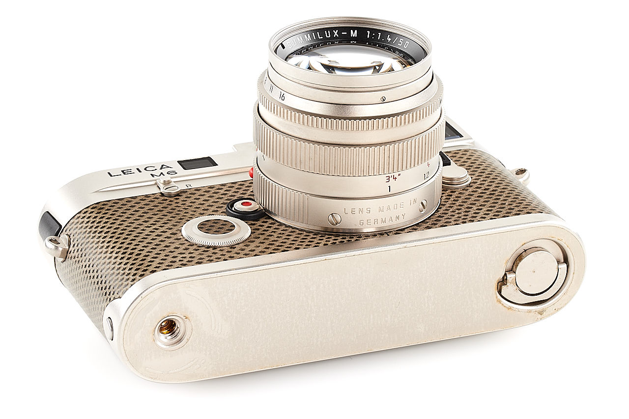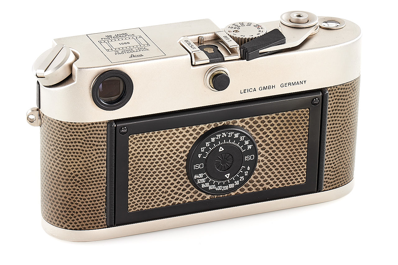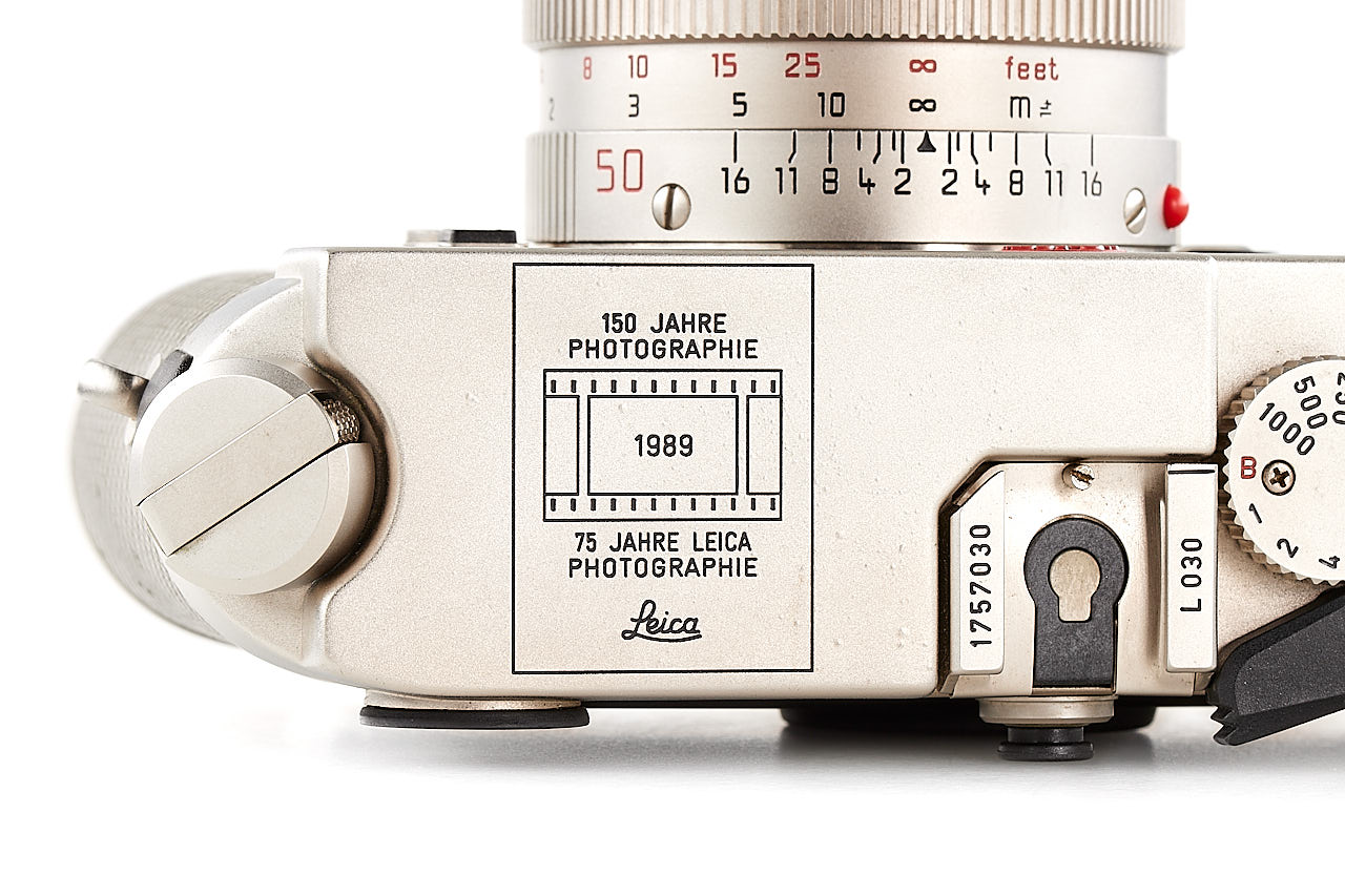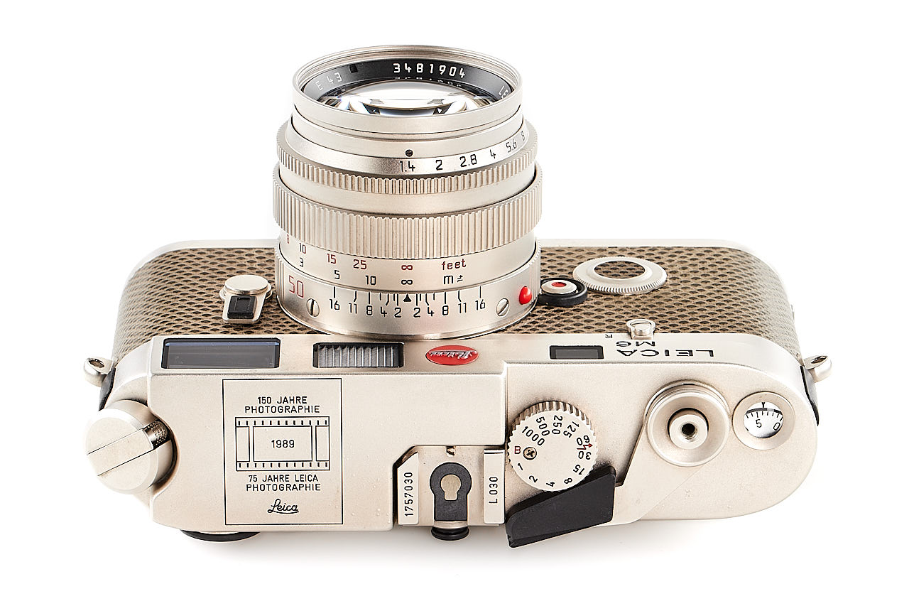Special edition issued for 150 years of photography and 75 years of Leica photography, limited to 1250 pieces, including a platin plated M6 body no.1757030, in very good condition and working order, some bubbles in the finish can be seen on the top plate, shutter curtains showing some light discolouration (still perfectly lightproof), with matching platinum Summilux-M 1.4/50mm no.3481904 (clean and clean lenses), with front cap and hood.