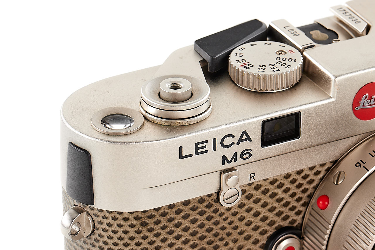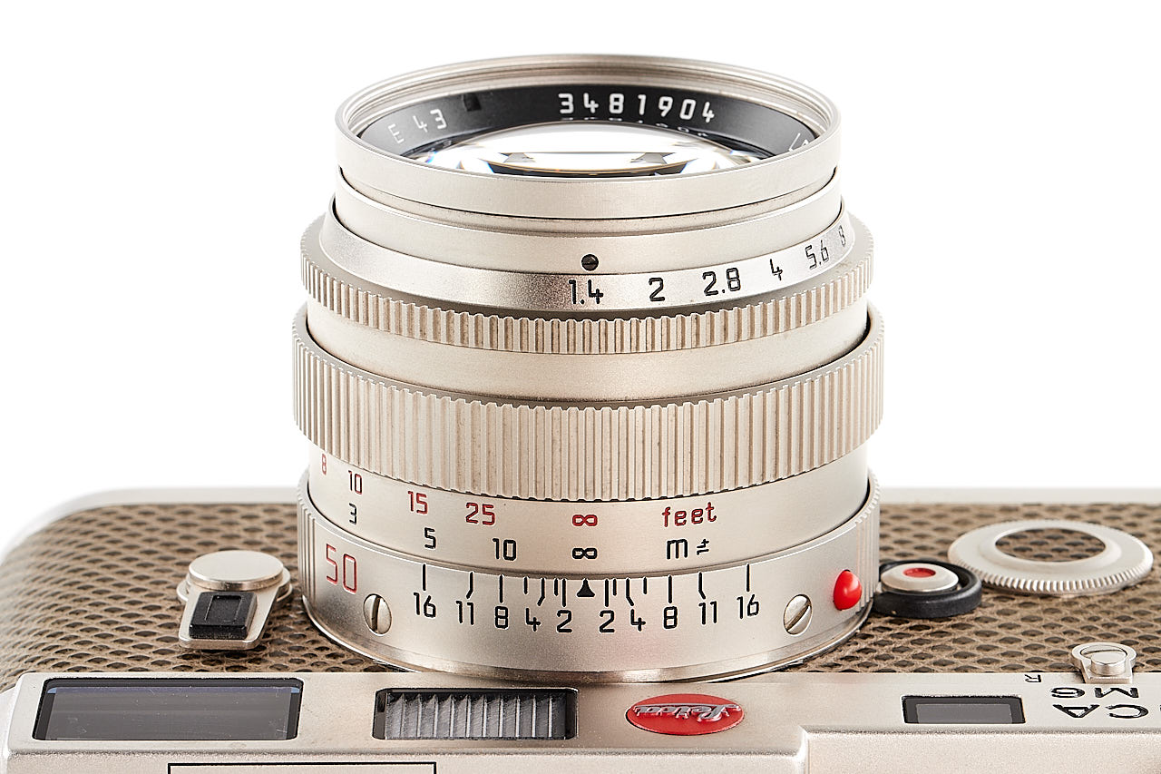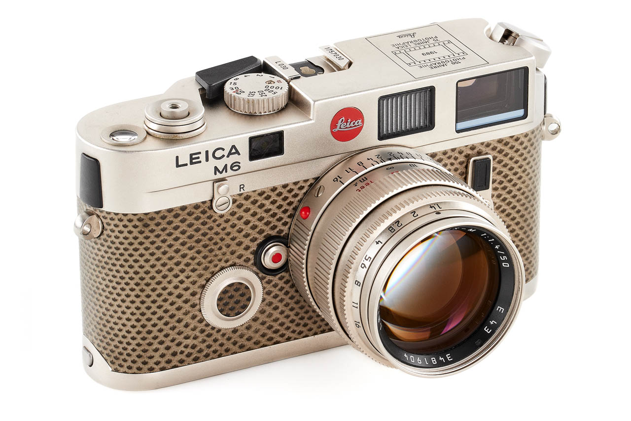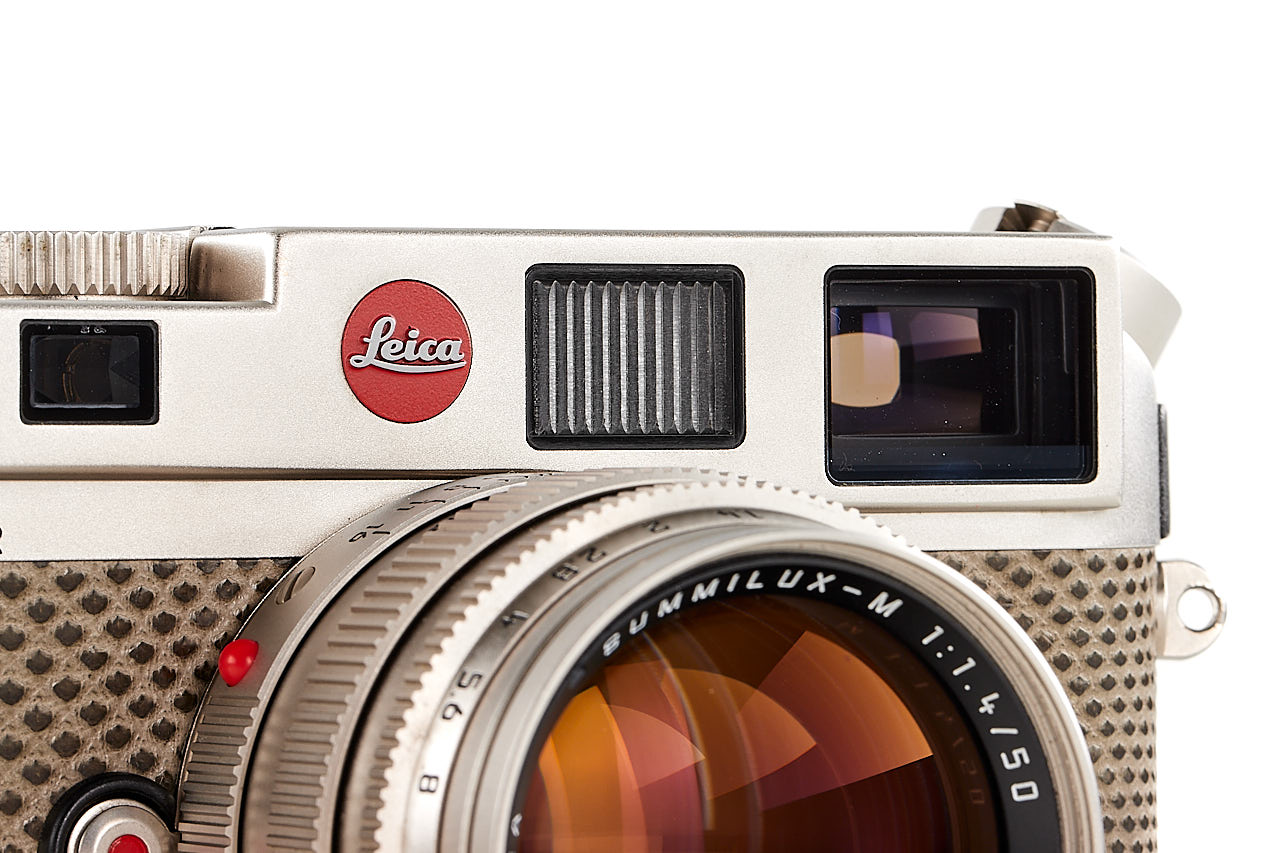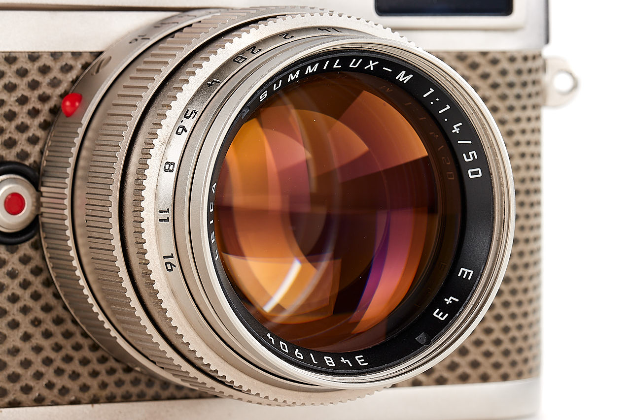 Special edition issued for 150 years of photography and 75 years of Leica photography, limited to 1250 pieces, including a platin plated M6 body no.1757030, in very good condition and working order, some bubbles in the finish can be seen on the top plate, shutter curtains showing some light discolouration (still perfectly lightproof), with matching platinum Summilux-M 1.4/50mm no.3481904 (clean and clean lenses), with front cap and hood.