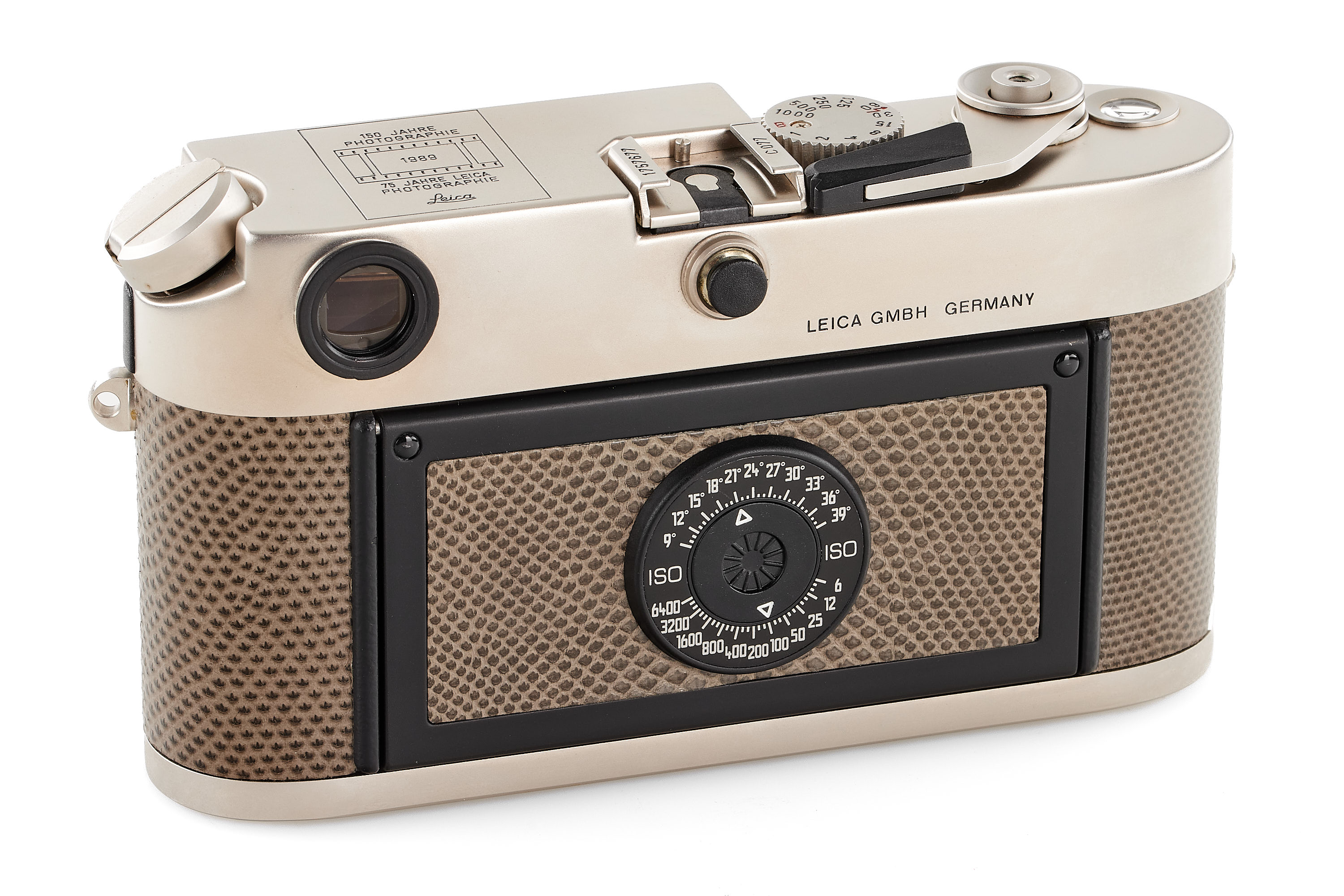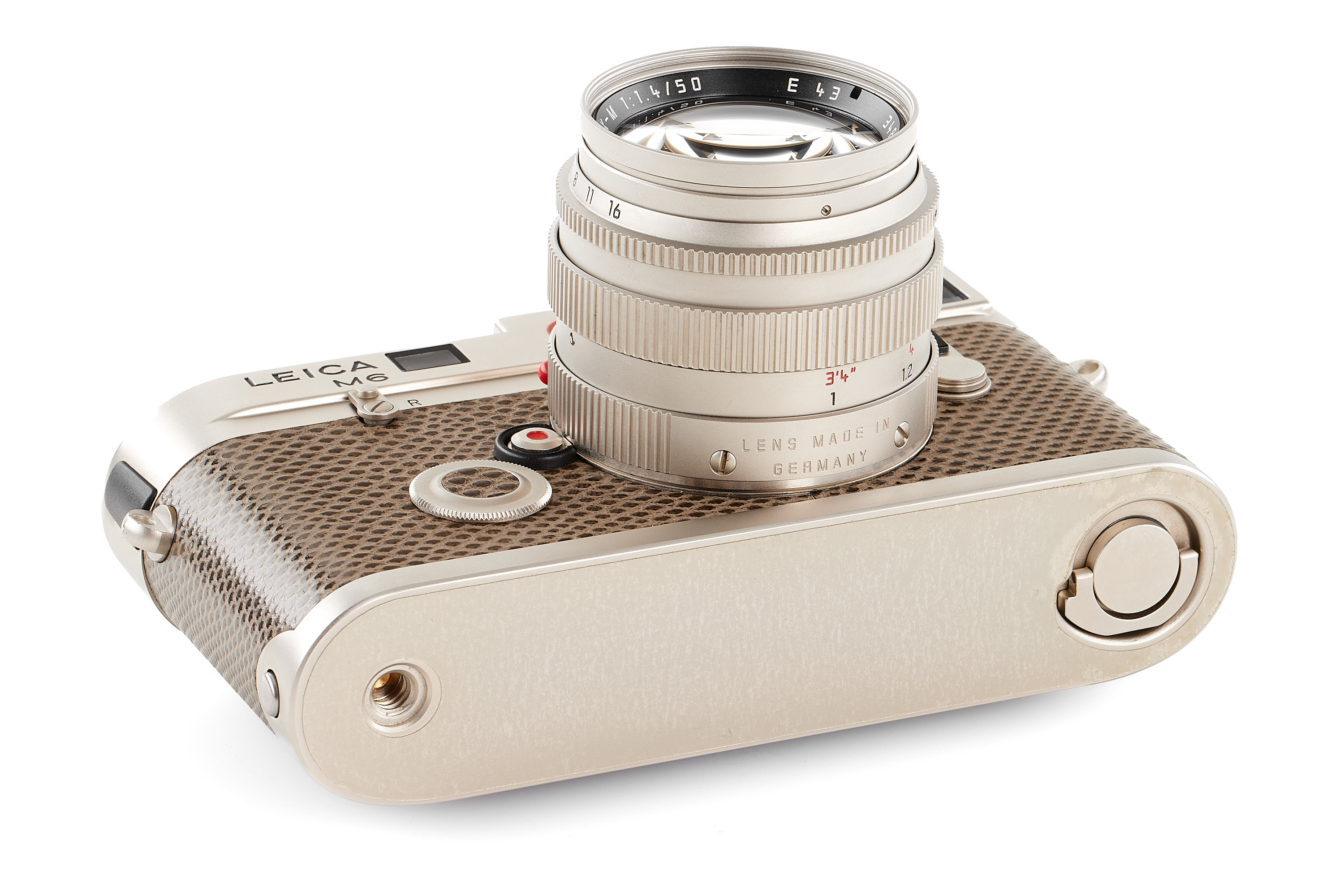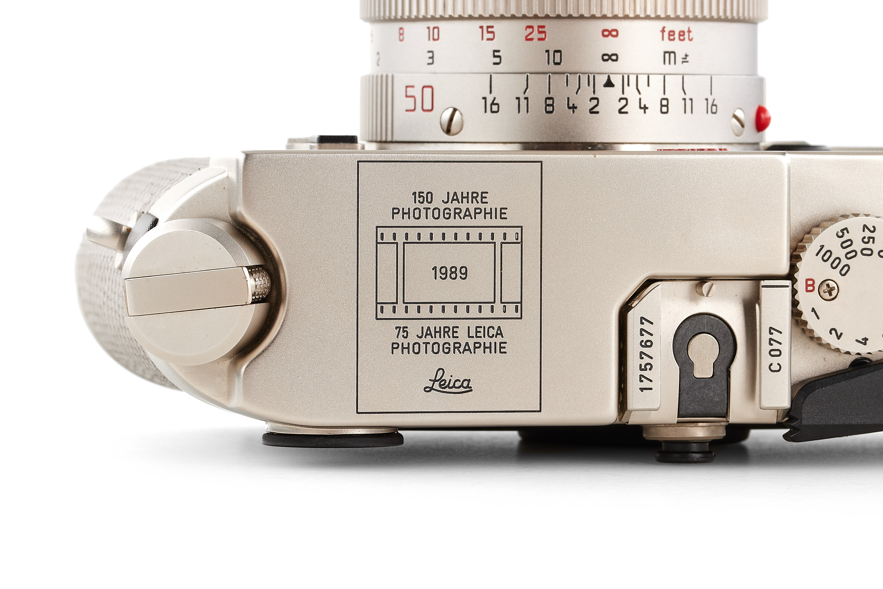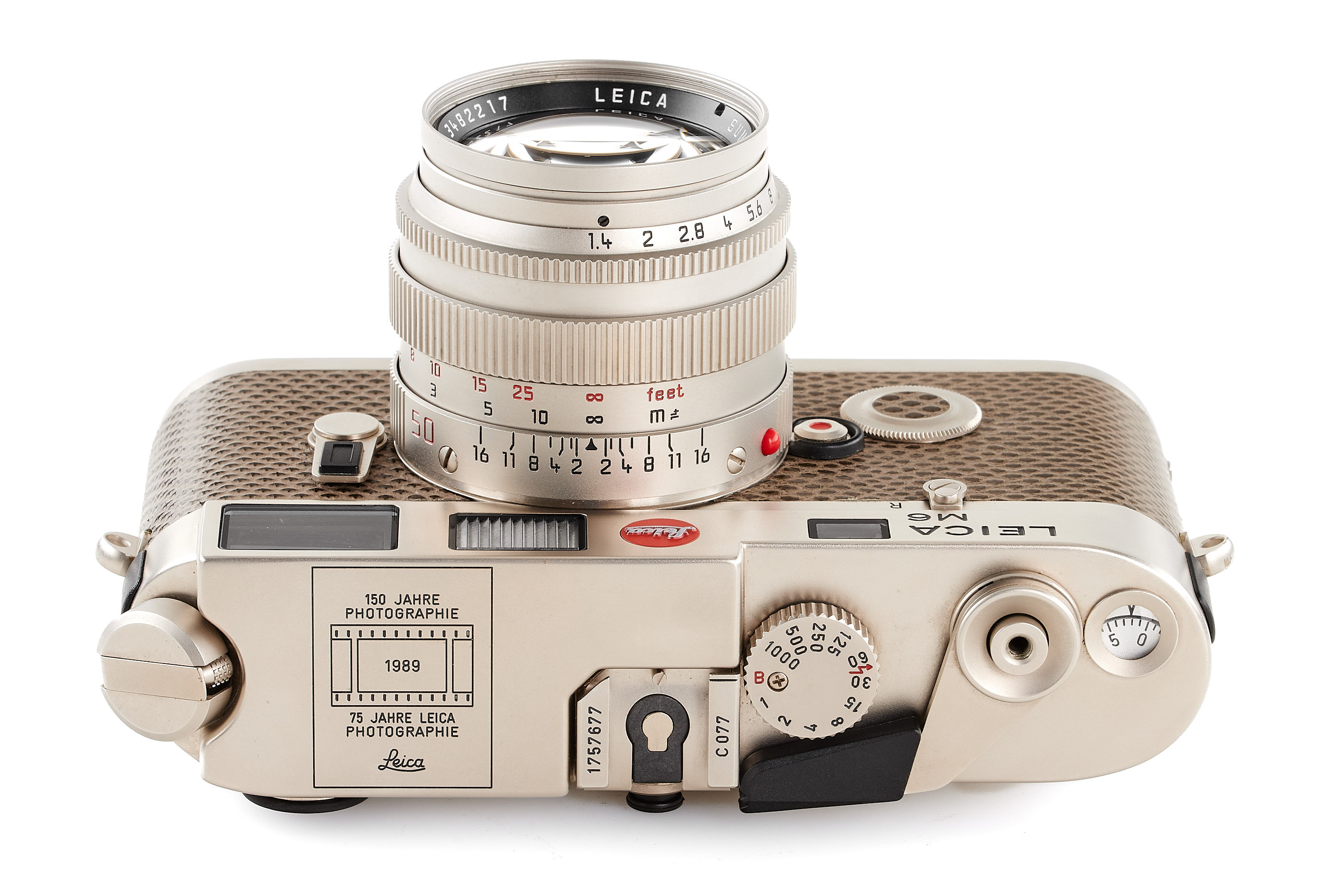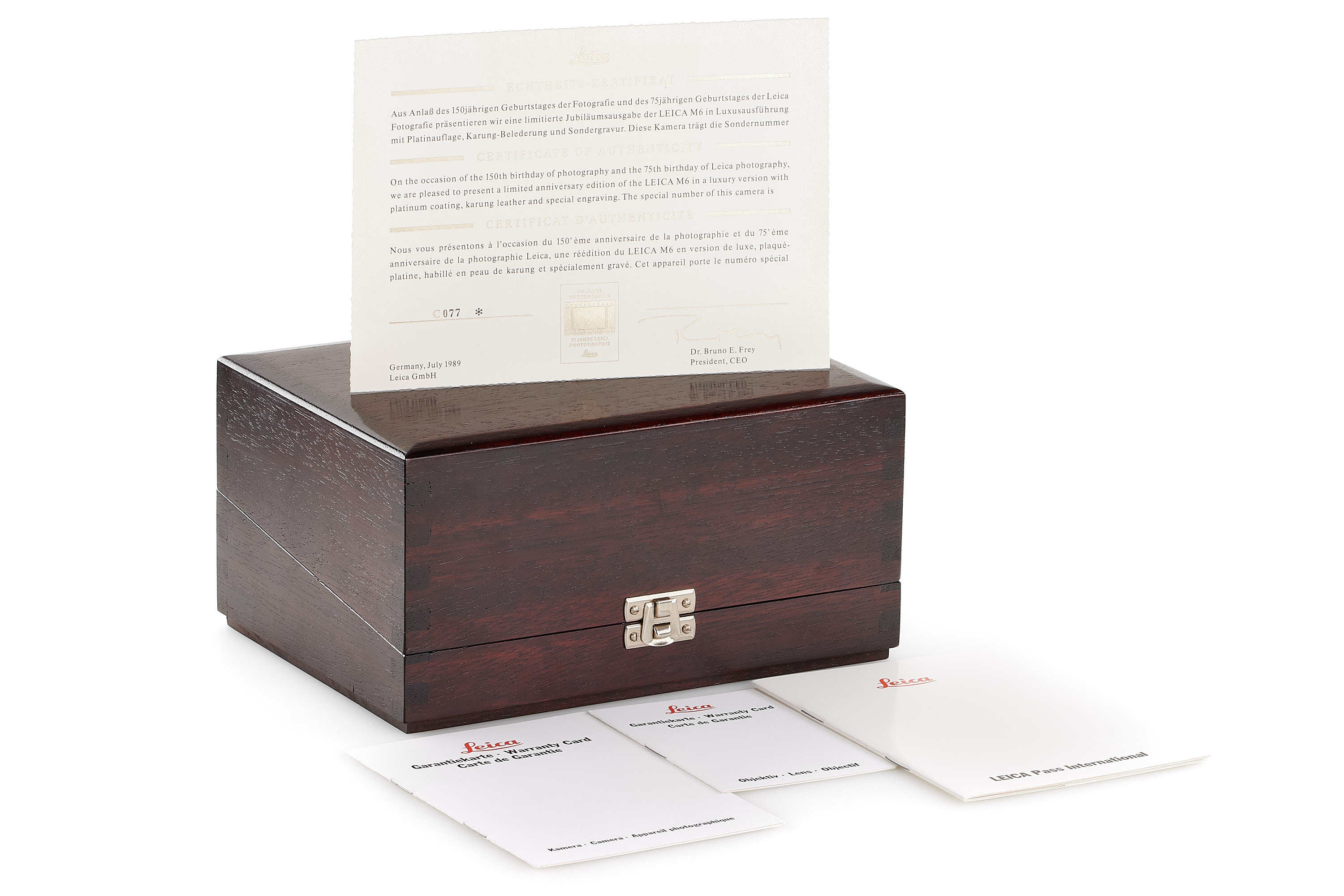 Special edition issued for 150 years of photography and 75 years of Leica photography, limited to 1250 pieces, including a very nice platin plated M6 body no.1757677, in absolutely mint condition and working order, with matching platinum Summilux-M 1.4/50mm no.3482217 (clean and clear lenses), with all papers, certificate of authenticity and wooden presentation box.