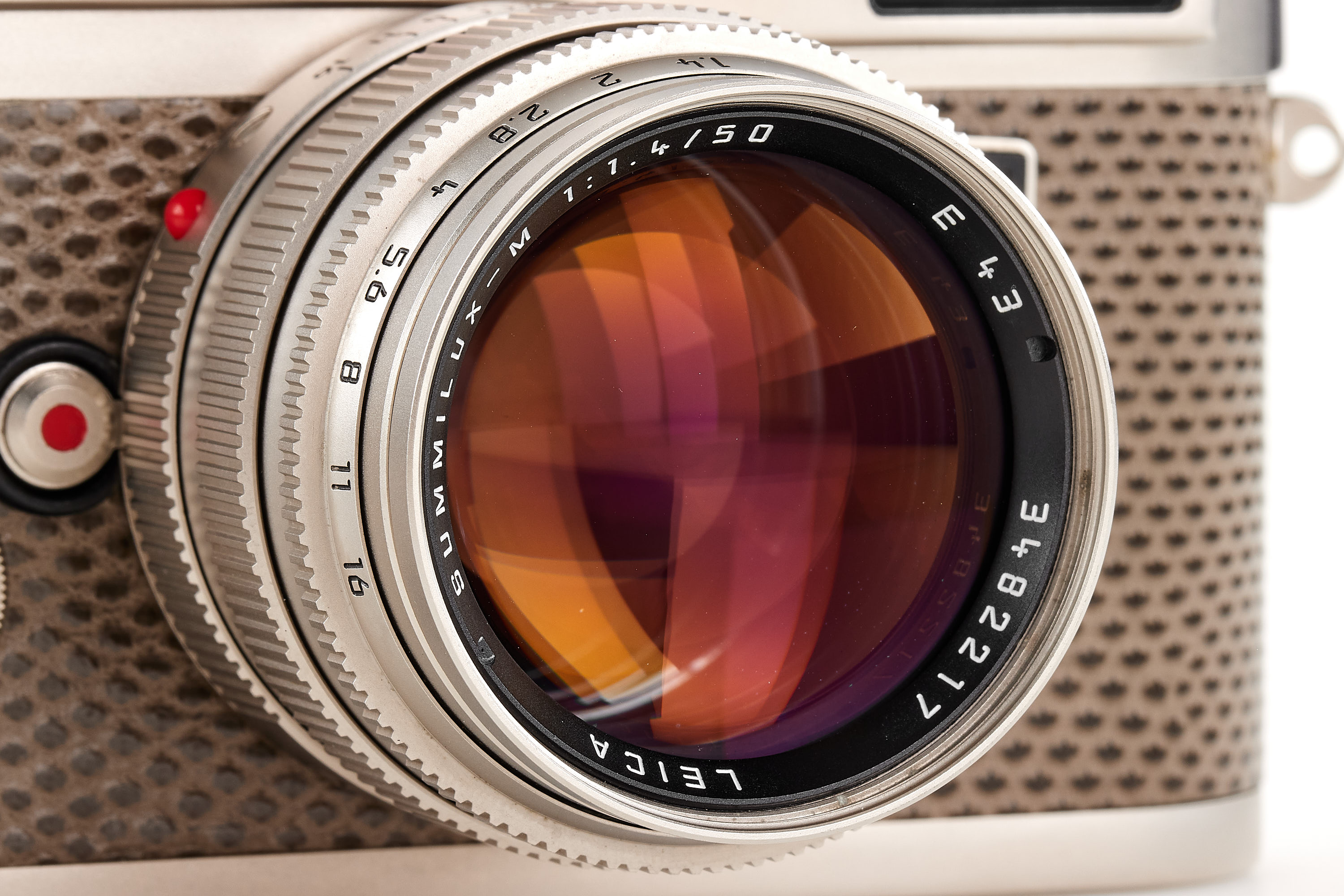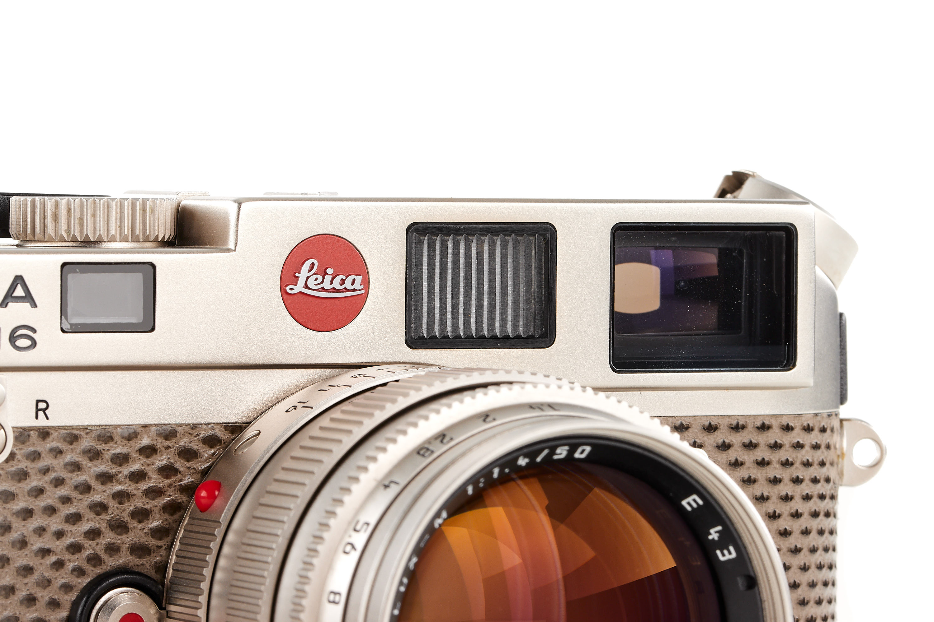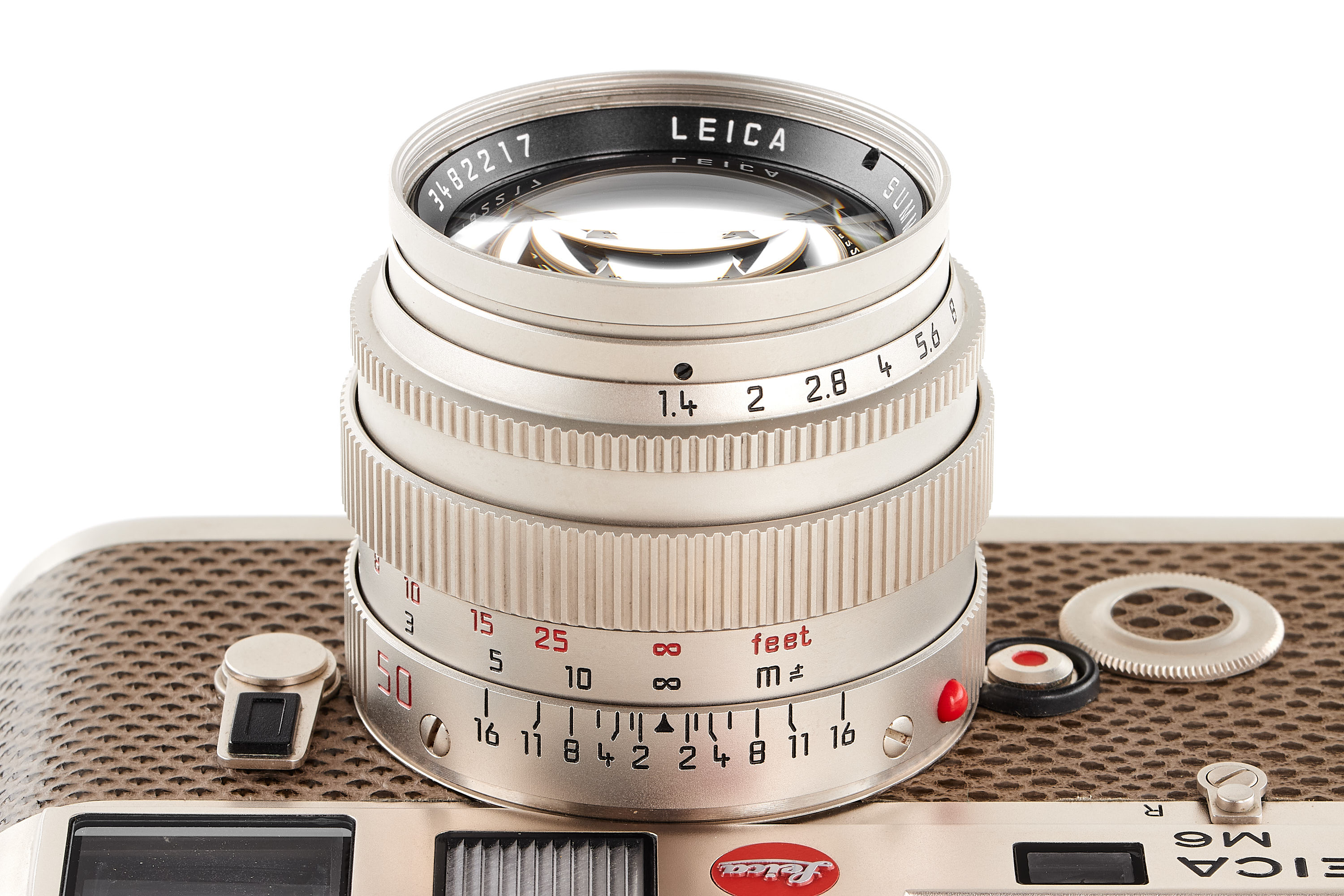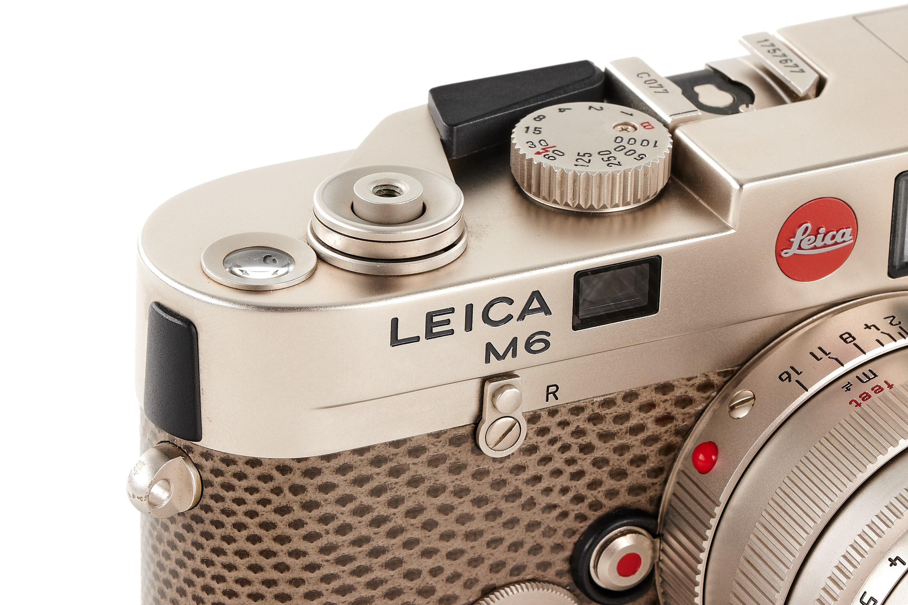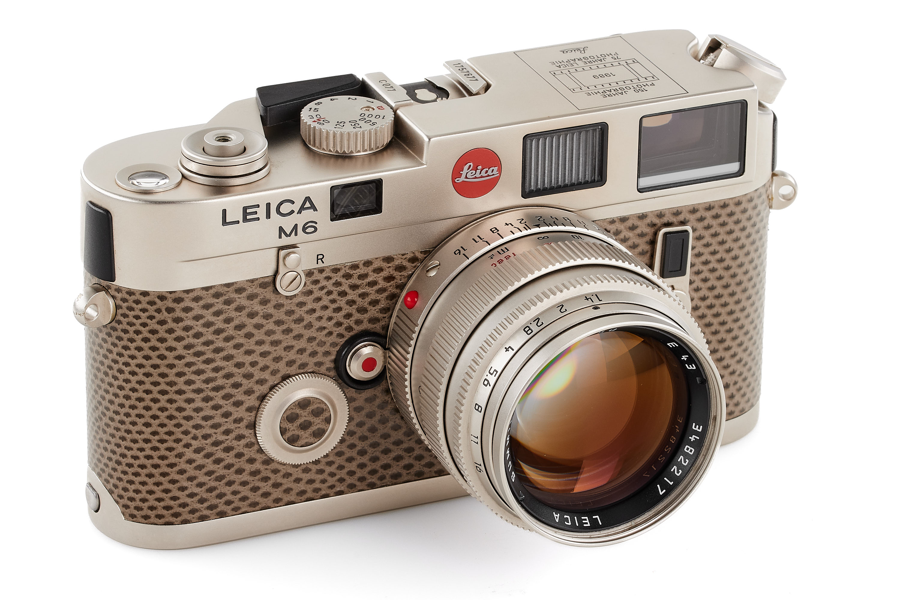 Special edition issued for 150 years of photography and 75 years of Leica photography, limited to 1250 pieces, including a very nice platin plated M6 body no.1757677, in absolutely mint condition and working order, with matching platinum Summilux-M 1.4/50mm no.3482217 (clean and clear lenses), with all papers, certificate of authenticity and wooden presentation box.