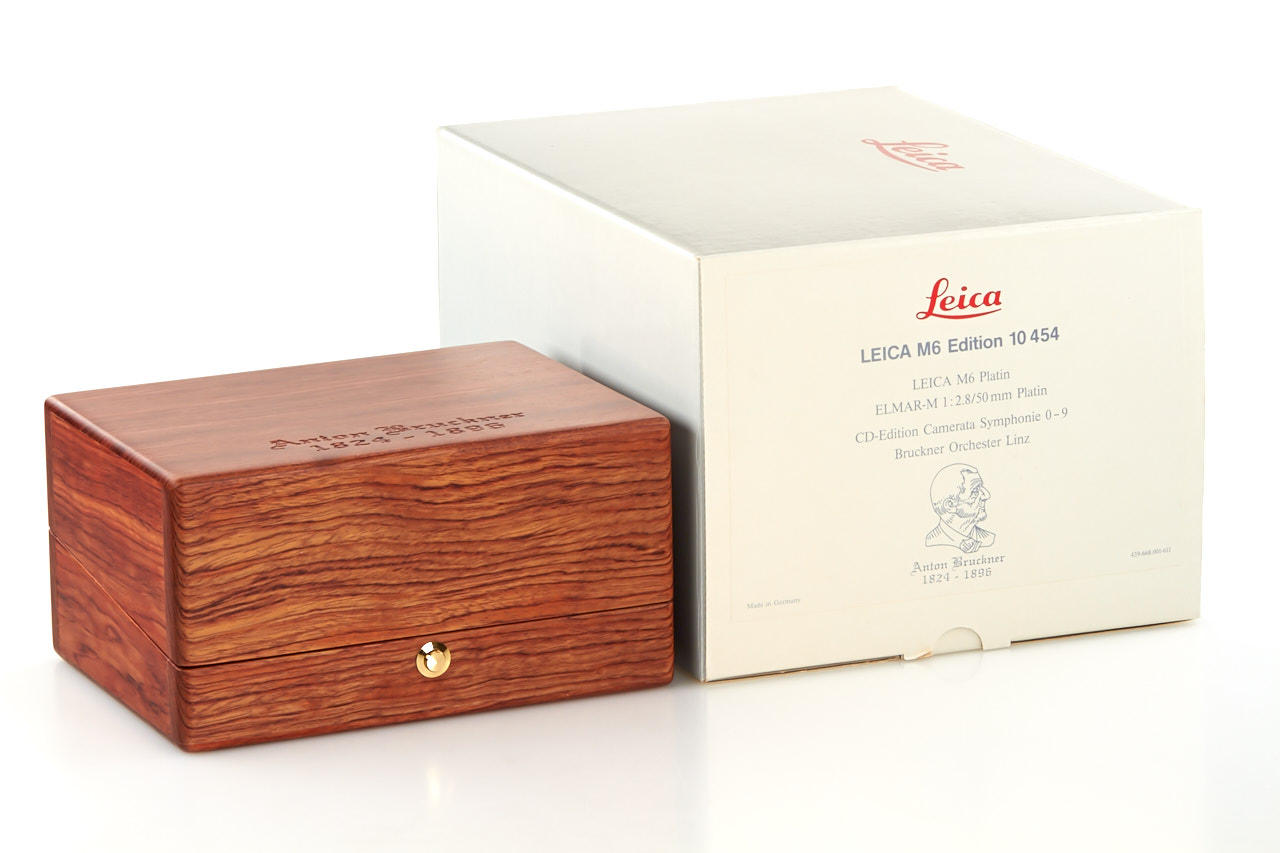 edition of 200 cameras in new condition for the Austrian composer Anton Bruckner, platinum finish with special Elmar 2.8/50mm, in wooden box, with a collection of Bruckner CD's, all complete in maker's boxes