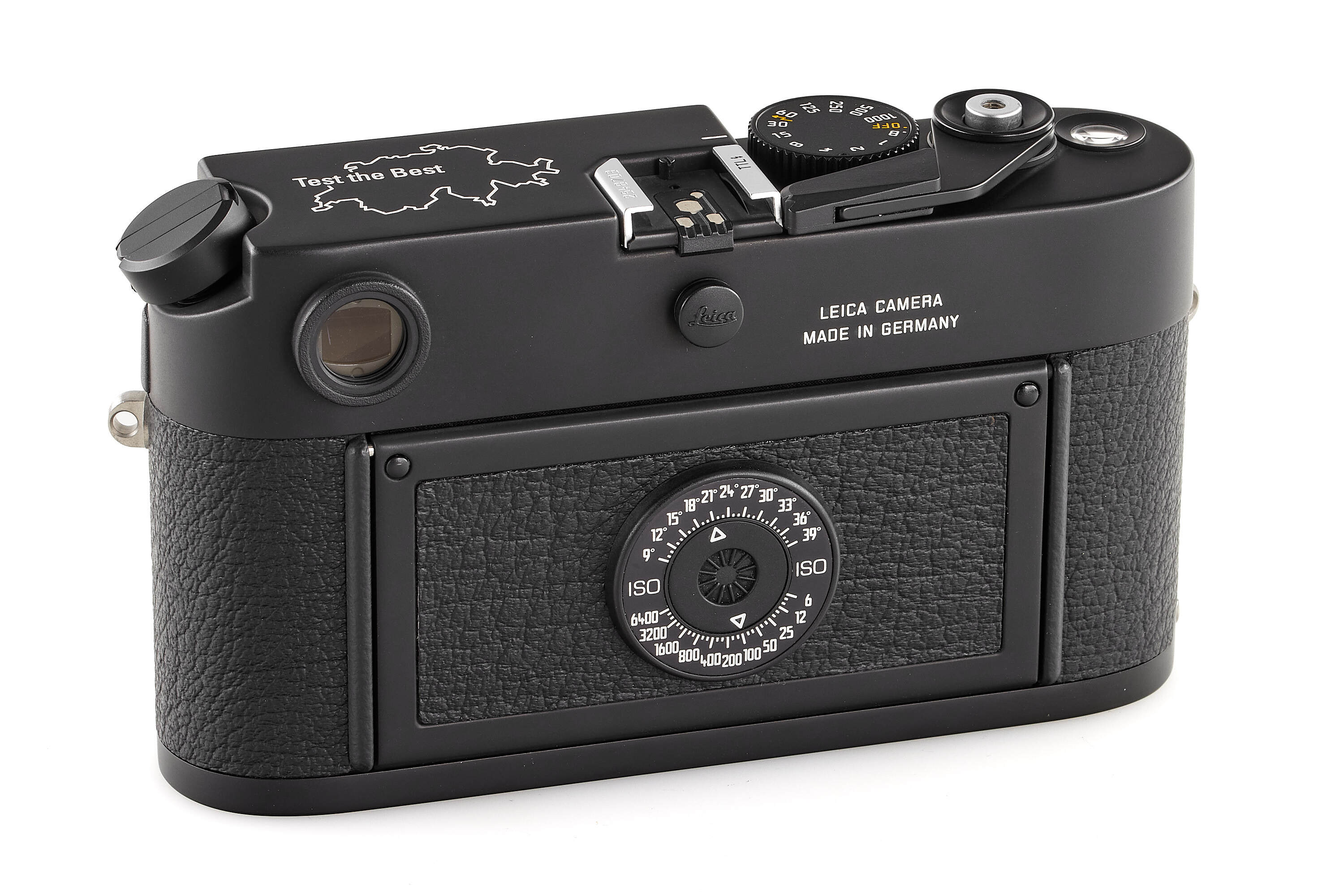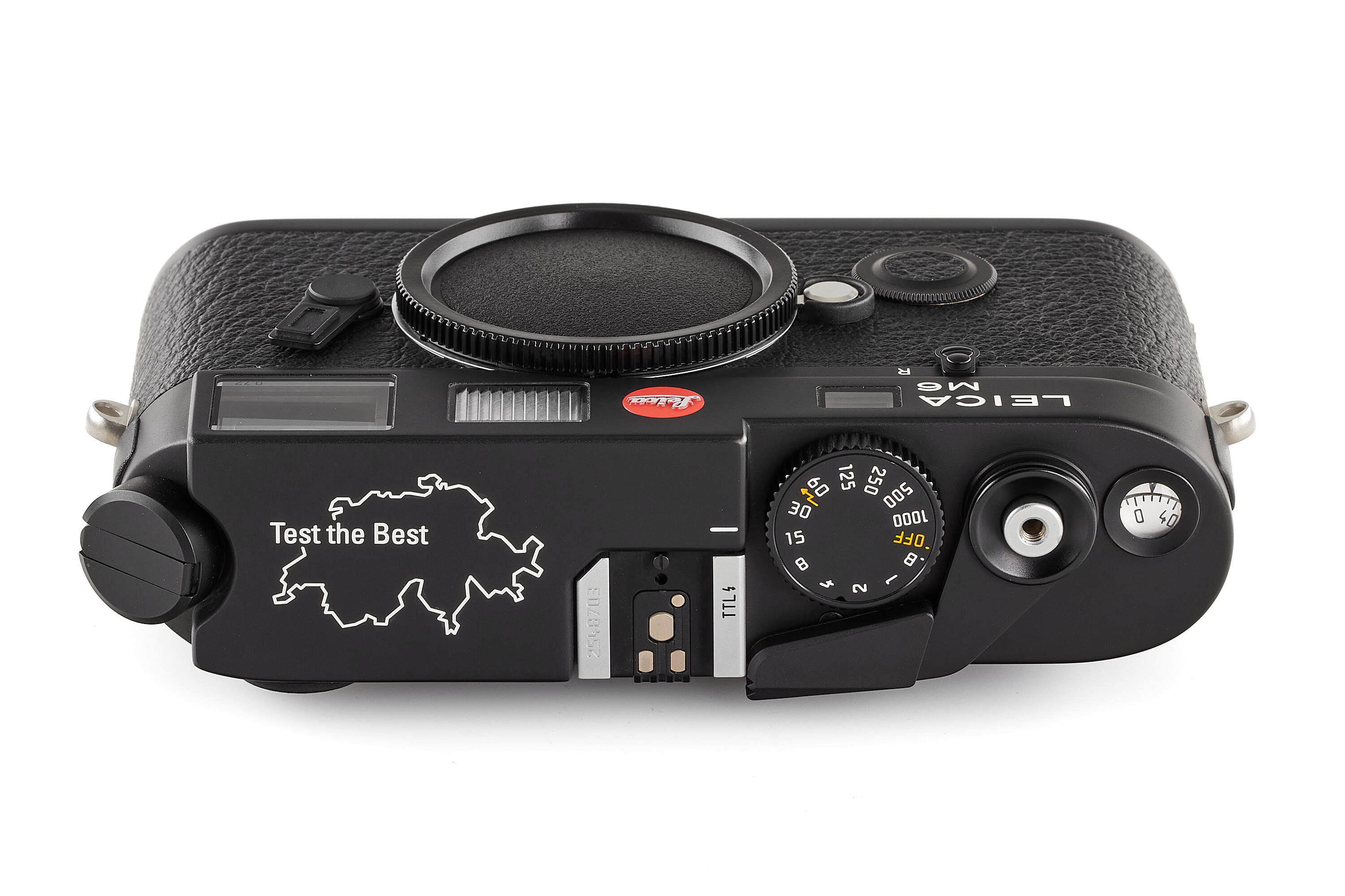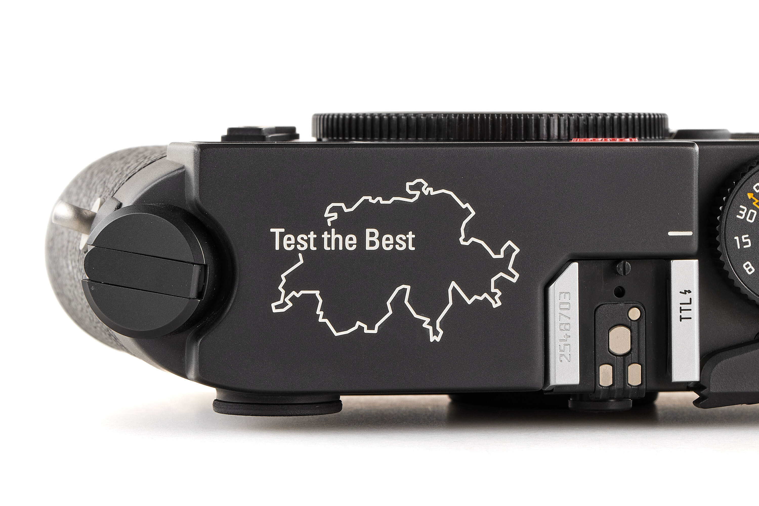 Very rare demonstration camera with 0.72 finder, only 40 units released on the Swiss market, black version with 'Test the Best' and an outline map of Switzerland engraved on the top plate, here in mint condition, with French and German instructions, body cap, strap, Leica Winder M no.20992 (maker's box), presentation and maker's boxes.