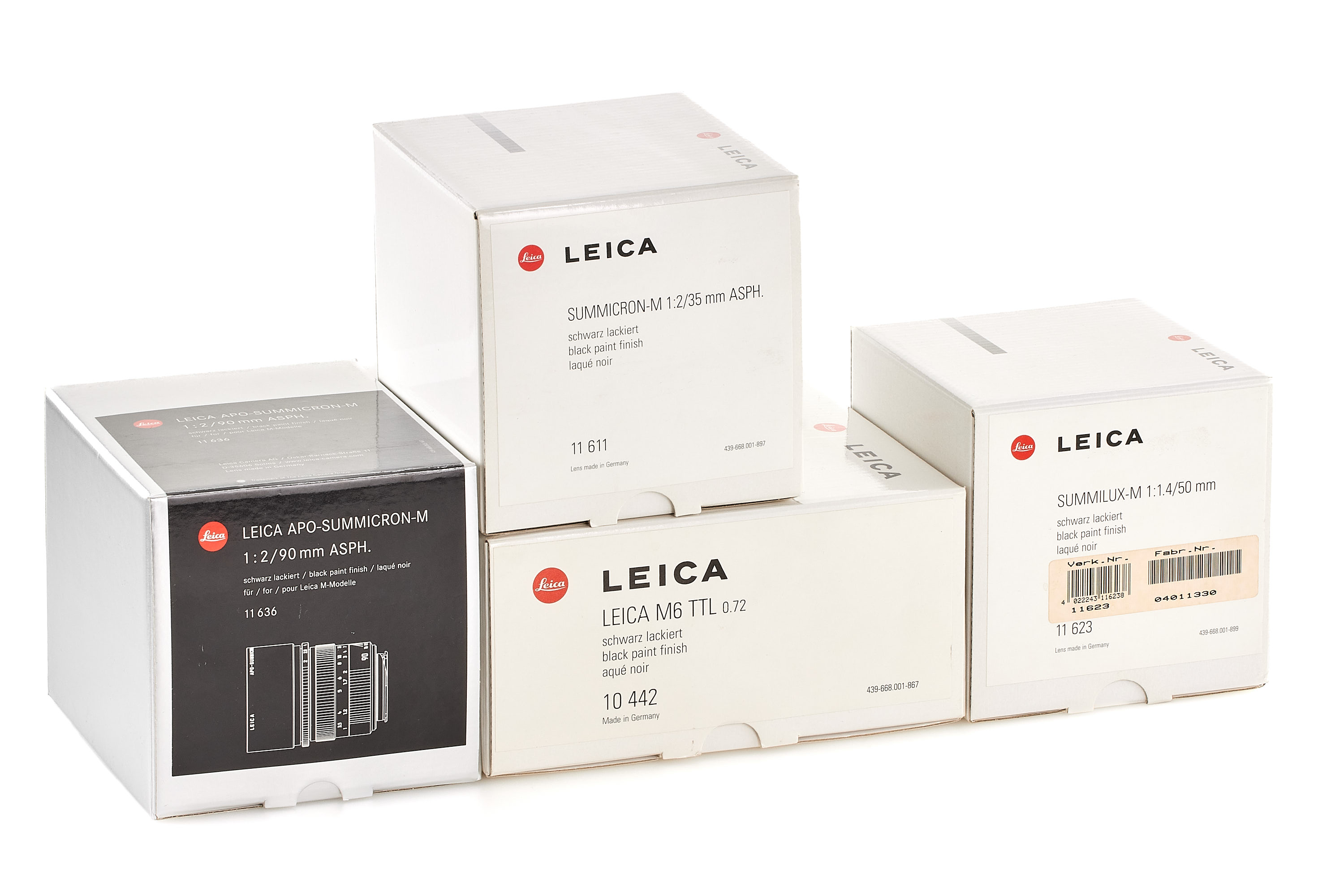 The 1330th of only 2000 M6 TTL black paint issued to mark the year 2000 and 75 years since the launch of Leica in 1925, special engraving 1330/2000, note the rewind knob and wind lever inherited from the M3, in absolutely perfect, unused condition, together with matching Summicron-M 2/35mm Asph. black paint 11611 no.4001330, matching Summilux-M 1.4/50mm black paint 11623 no.4011330 and Apo-Summicron-M 2/90mm Asph. black paint 11636 no.4002151, all complete with all accessories, papers and maker's boxes.