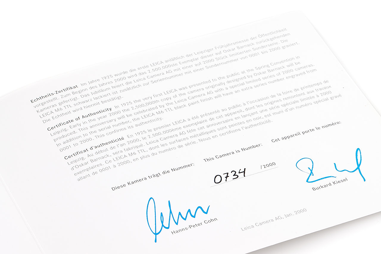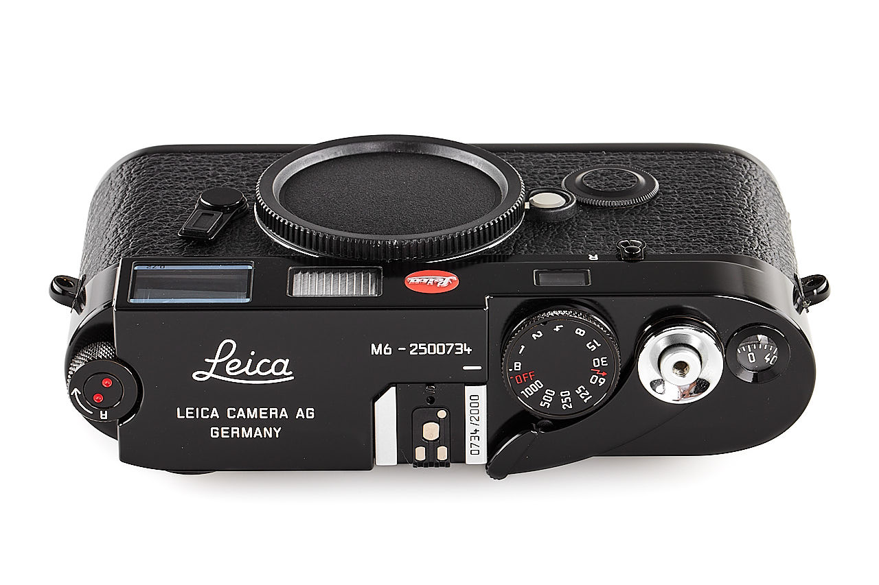 The 734th of 2000 M6 TTL black paint issued to mark the year 2000 and 75 years since the launch of Leica in 1925, special engraving 0734/2000, note the rewind knob and wind lever inherited from the M3, in absolutely mint condition and good working order, with body cap, papers, certificate and presentation box.