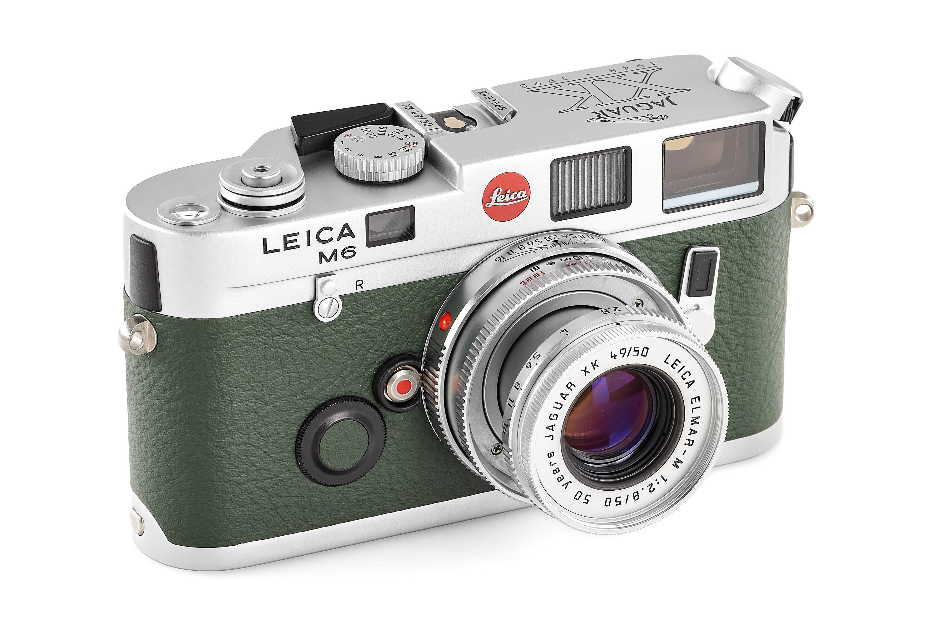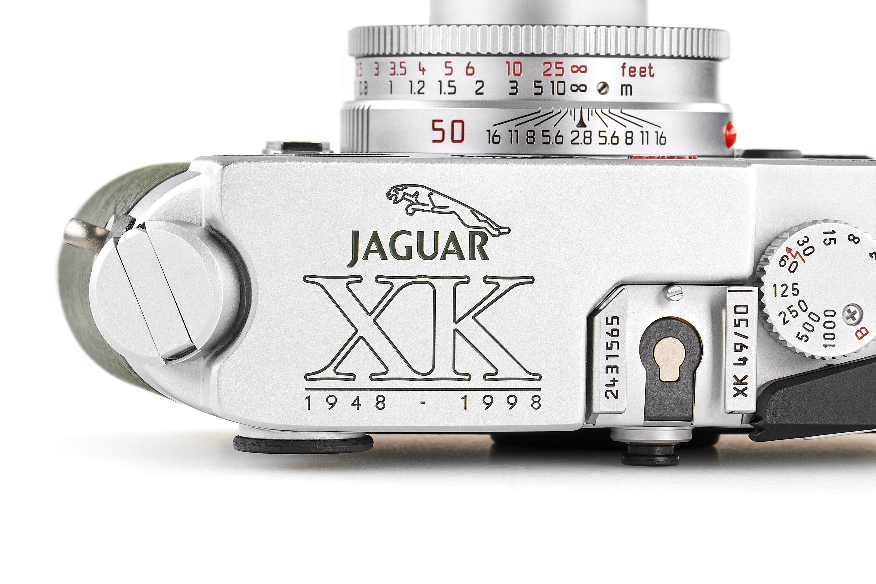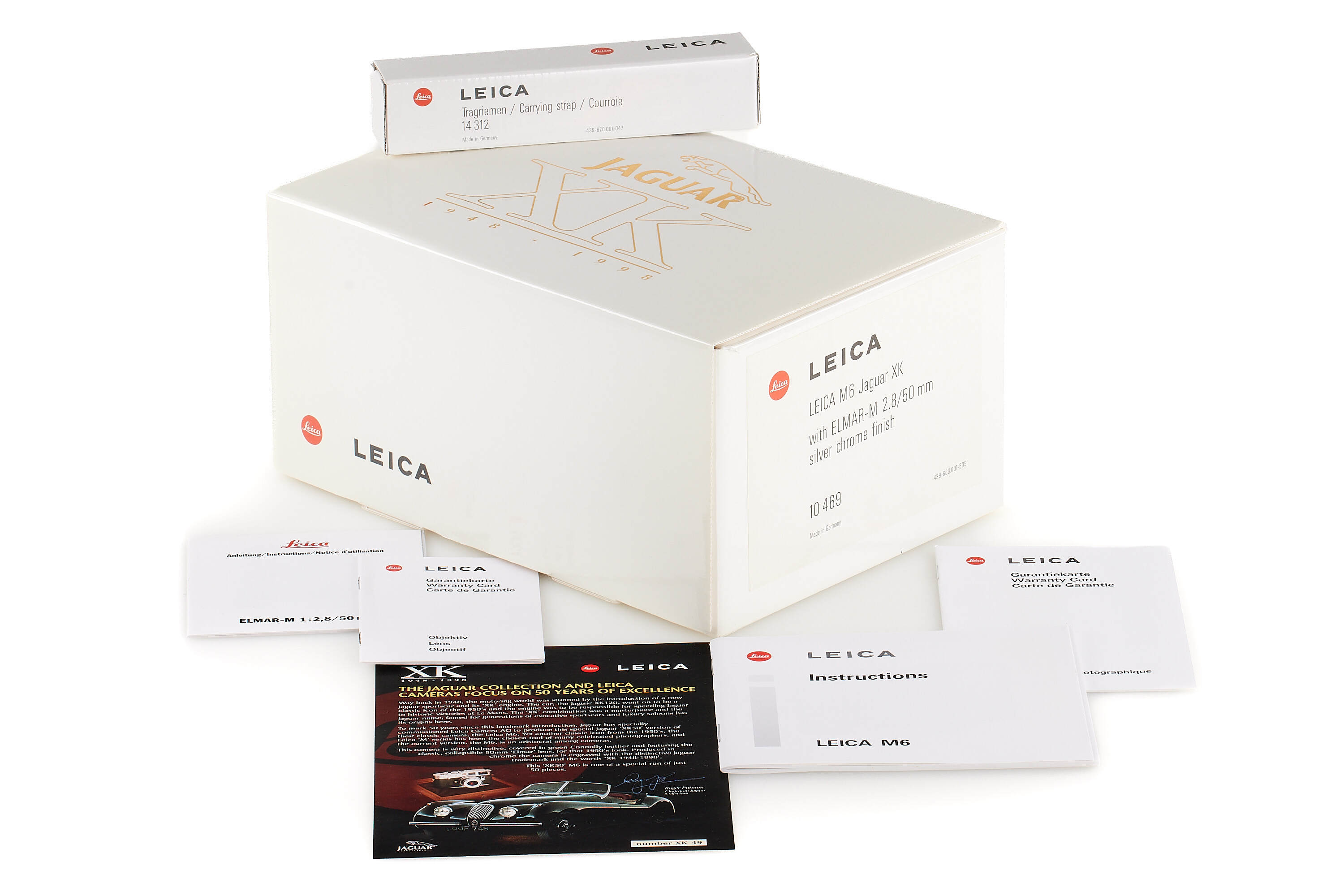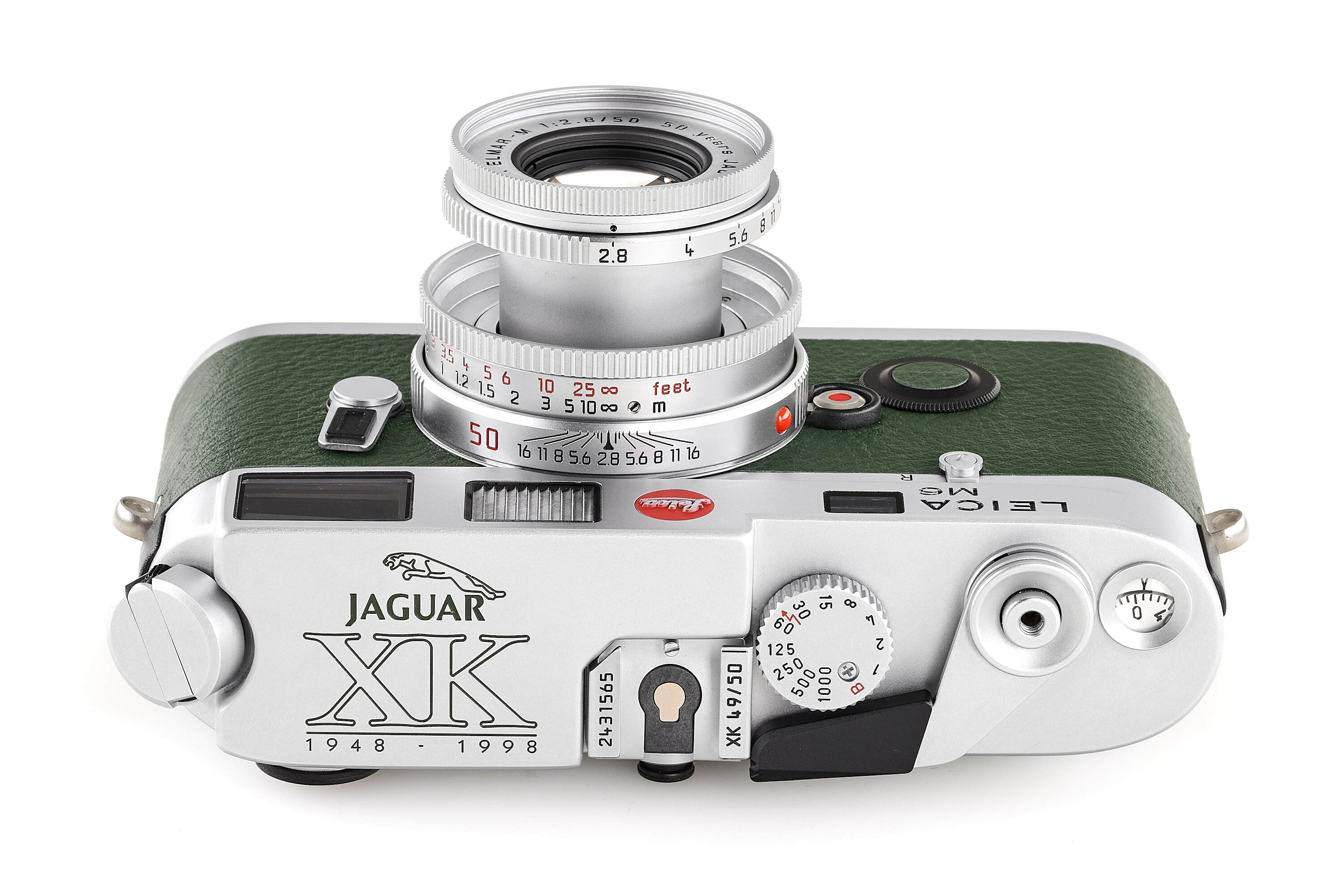 Beatiful limited edition Leica M6 chrome covered in Connolly leather in British Racing Green, celebrating 50 years of the Jaguar XK, serial number 2431565 and special engraving '49/50' on the hot shoe, in unused condition, together with matching Elmar-M 2.8/50mm engraved '50 years JAGUAR XK 49/50', complete set with front lens cap, strap, certificates and papers, wooden presentation box and maker's box.