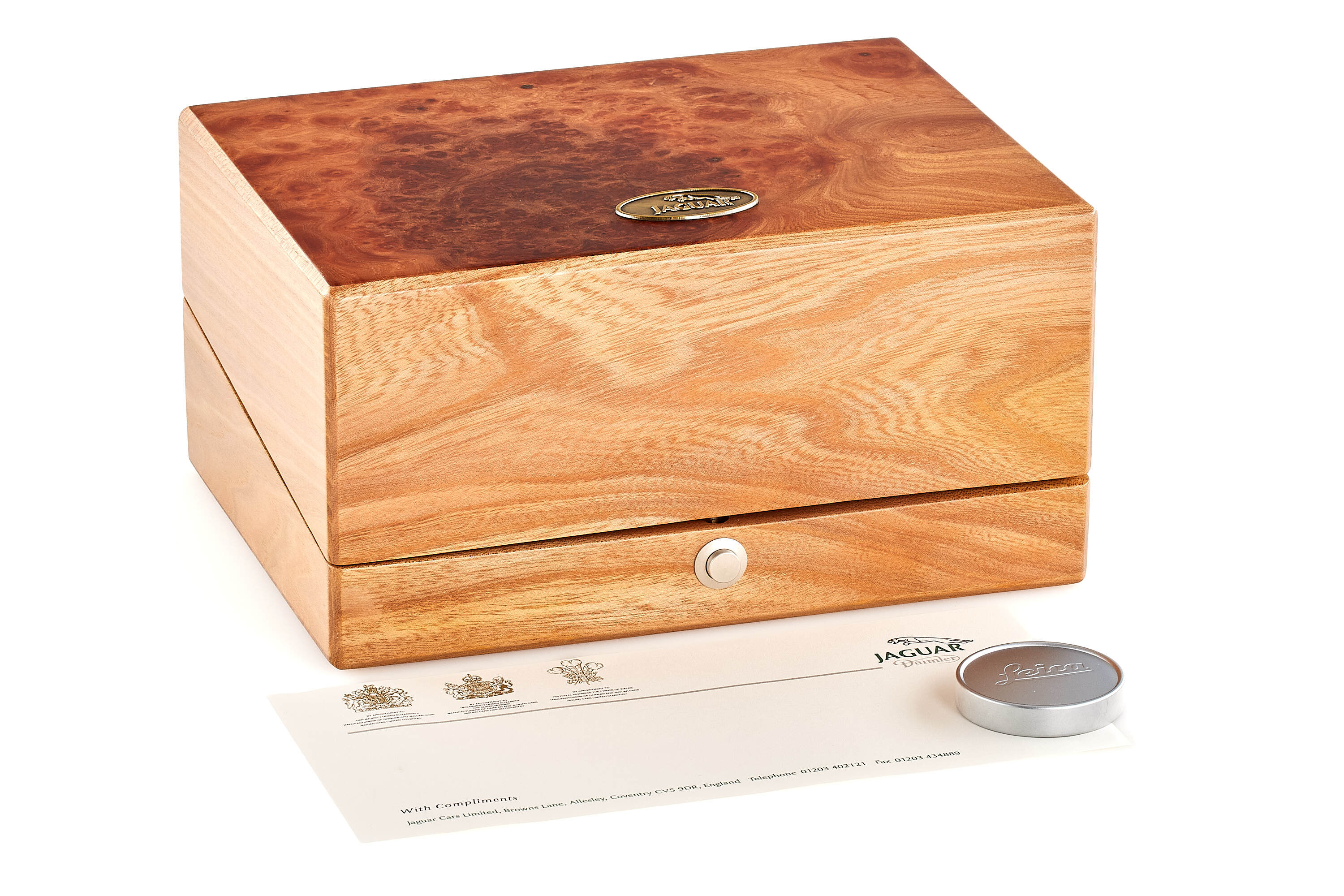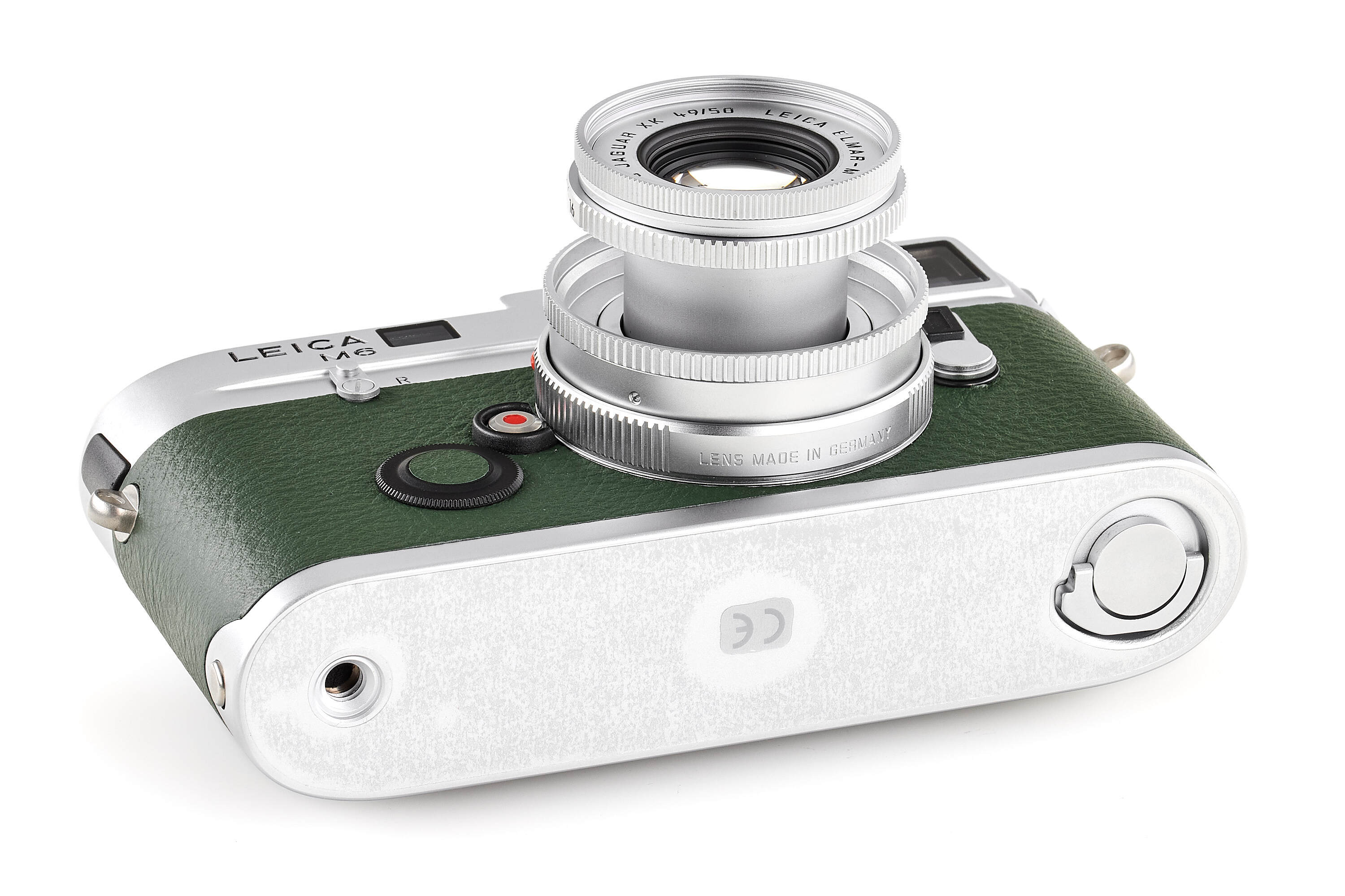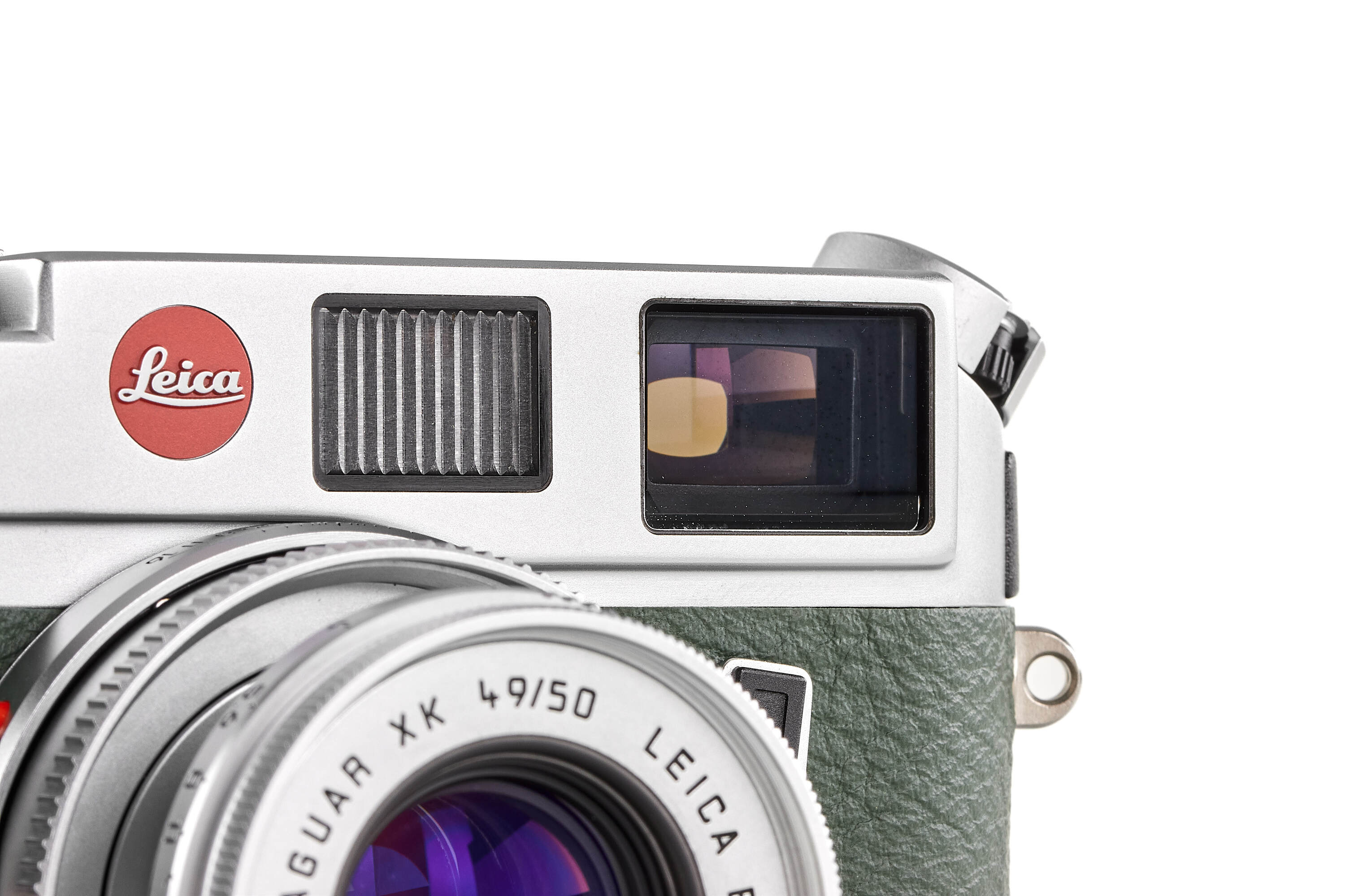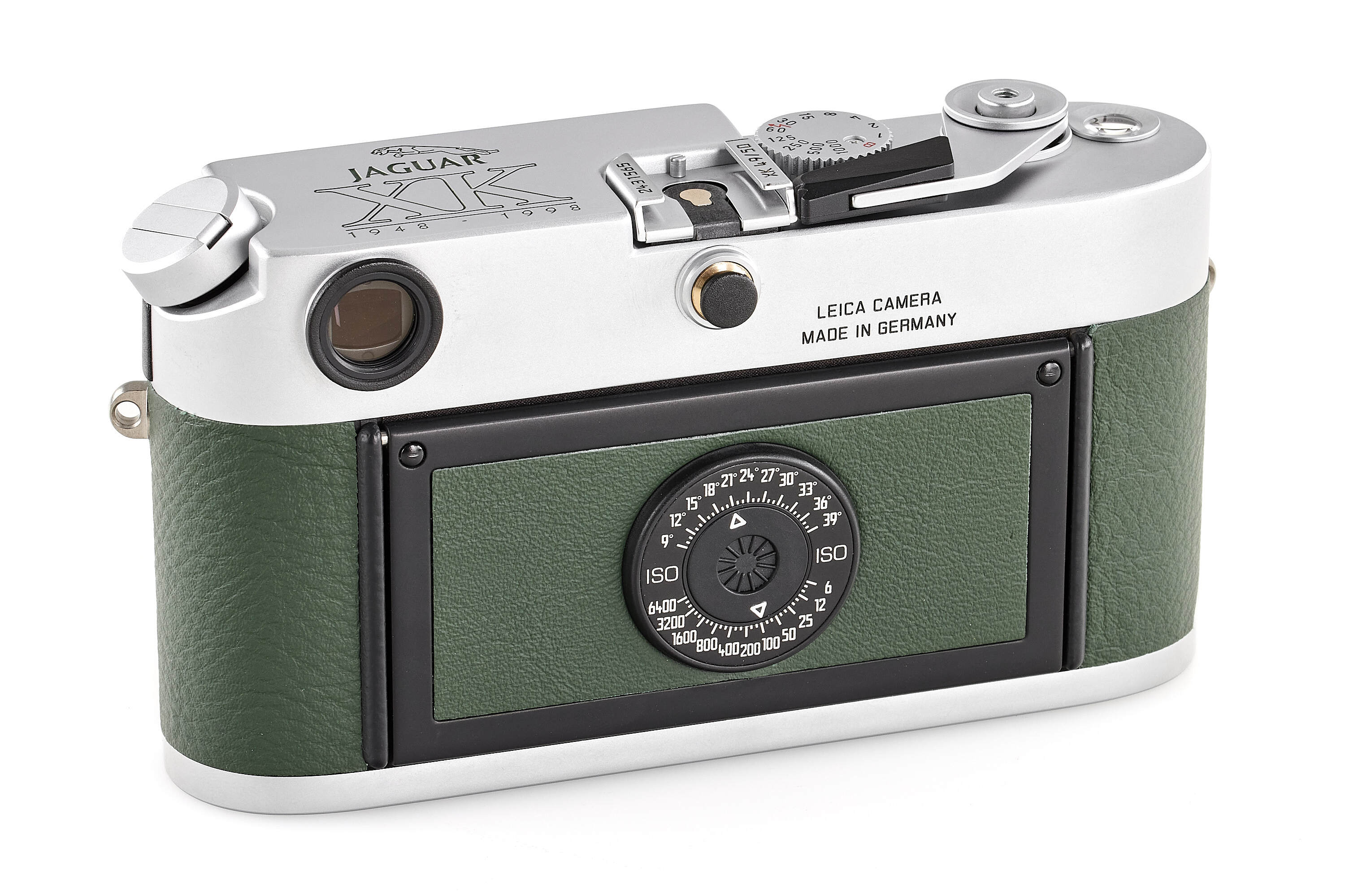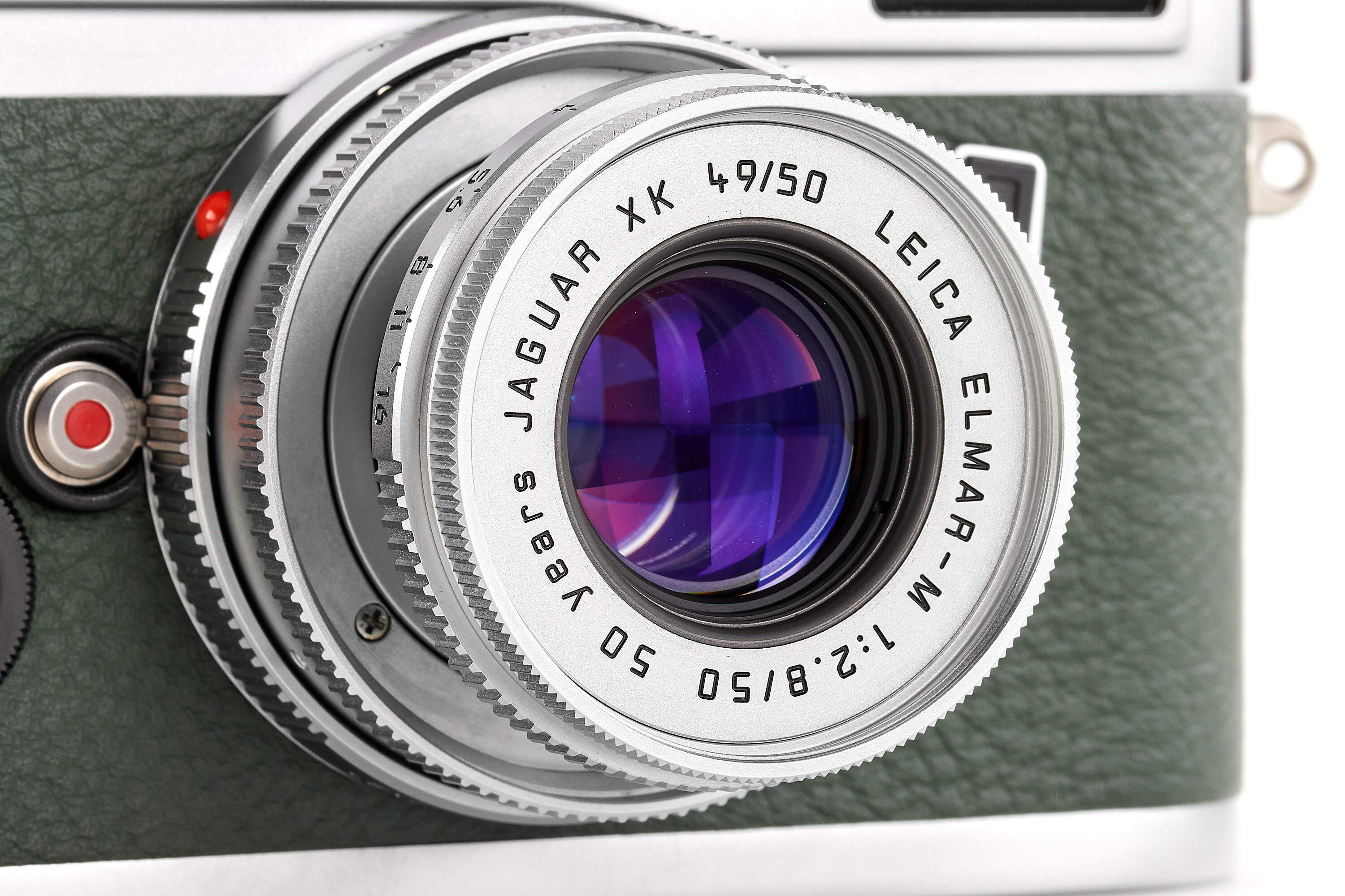 Beatiful limited edition Leica M6 chrome covered in Connolly leather in British Racing Green, celebrating 50 years of the Jaguar XK, serial number 2431565 and special engraving '49/50' on the hot shoe, in unused condition, together with matching Elmar-M 2.8/50mm engraved '50 years JAGUAR XK 49/50', complete set with front lens cap, strap, certificates and papers, wooden presentation box and maker's box.
