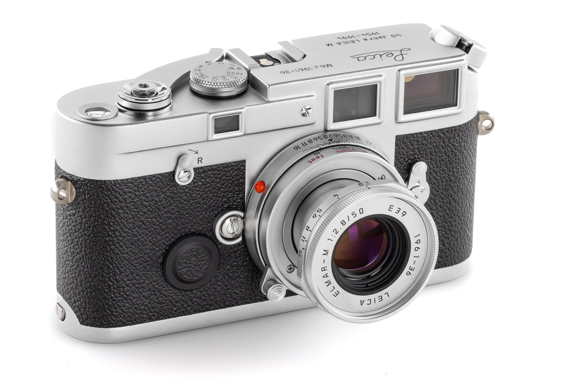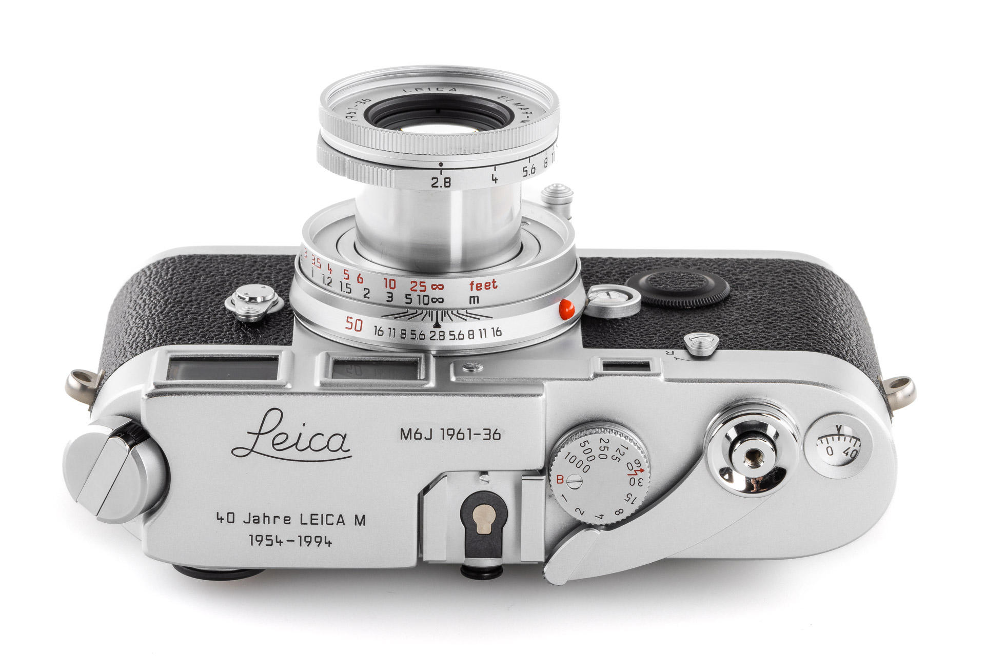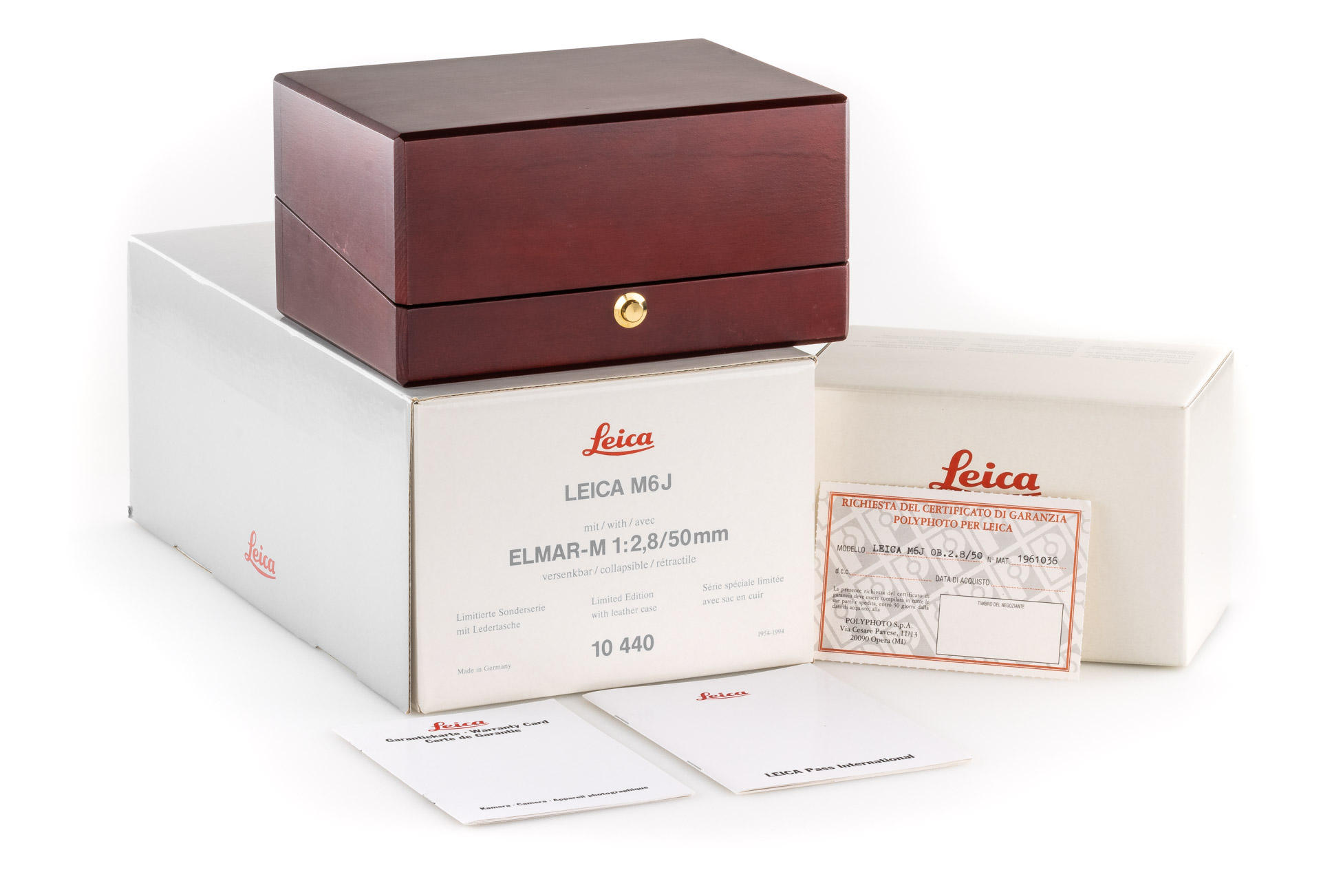 one of 1640 cameras made to celebrate 40th anniversary of Leica M (40 pieces for each production year), the camera combines features of the M3 and M6 cameras, complete matching set with body, collapsible Elmar 2.8/50mm, all in unused condition, with caps, leather case, papers, wooden presentation box and maker's box