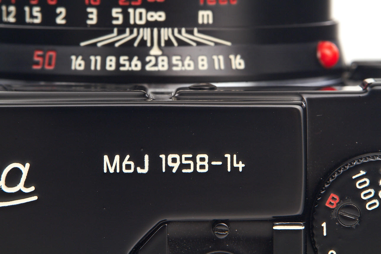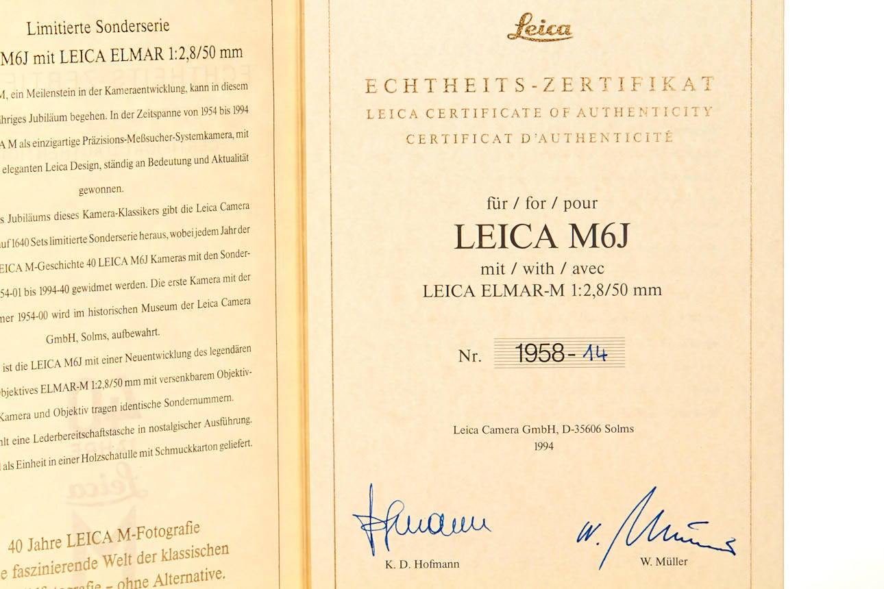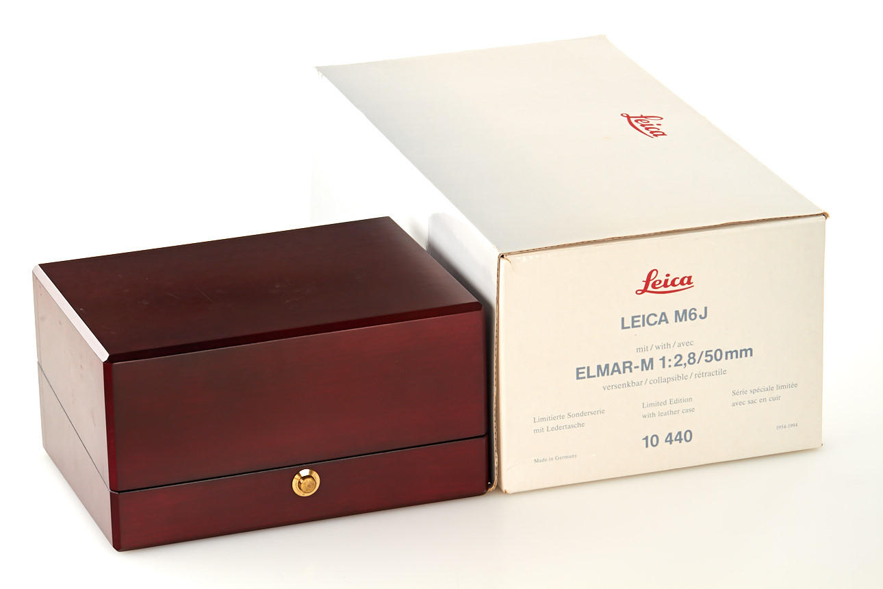 unique black paint version, custom made by special order, edition of 1640 cameras made to celebrate 40th anniversary of Leica M (40 pieces for each production year), the camera combines features od the M3 and M6 cameras, complete set (special number 1958-14) with matching black Elmar 2.8/50mm, brand new with case, papers, wooden presentation box, maker's boxes