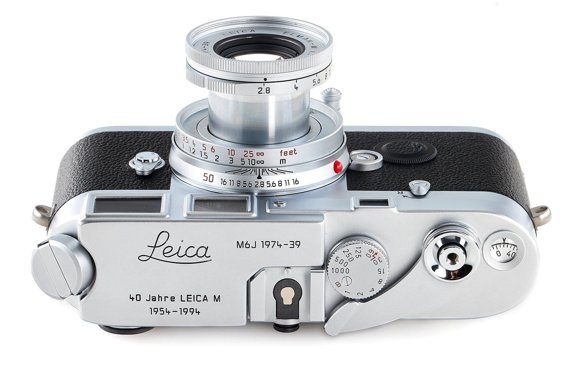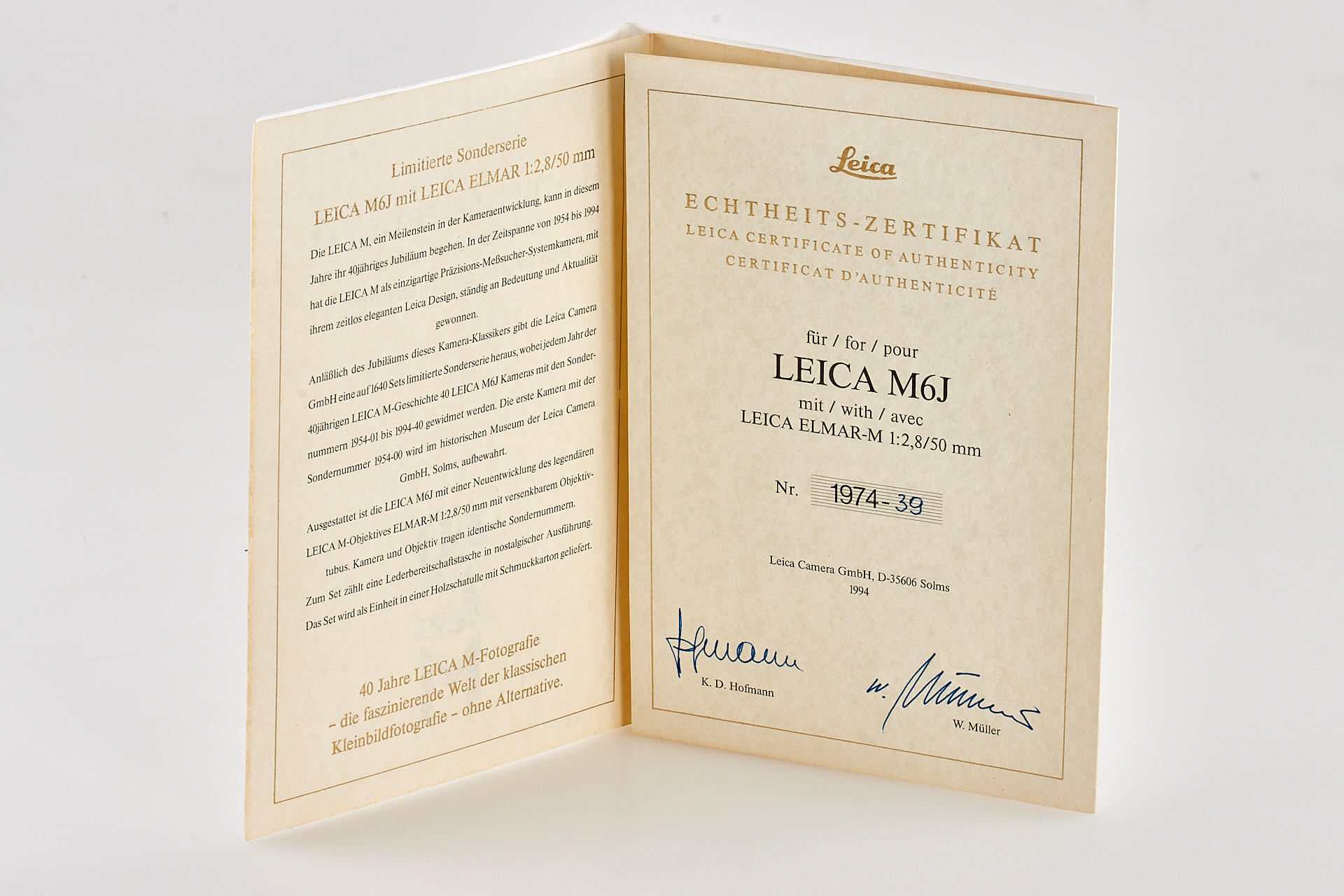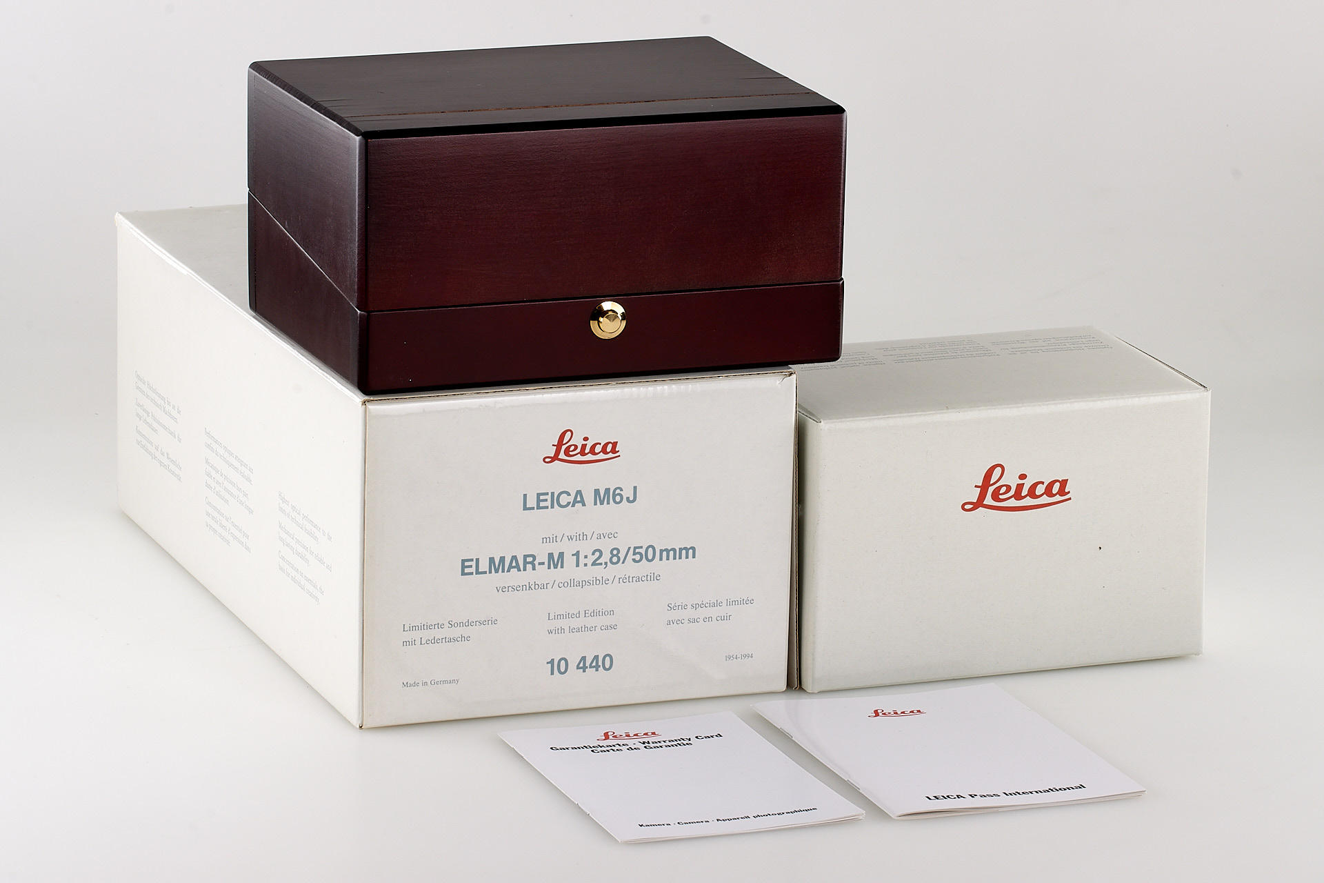 one of 1640 cameras made to celebrate 40th anniversary of Leica M (40 pieces for each production year), the camera combines features of the M3 and M6 cameras, complete matching set with body, collapsible Elmar 2.8/50mm, all in unused condition, with caps, hood, leather case, papers, certificate, wooden presentation box (with a crack) and maker's box