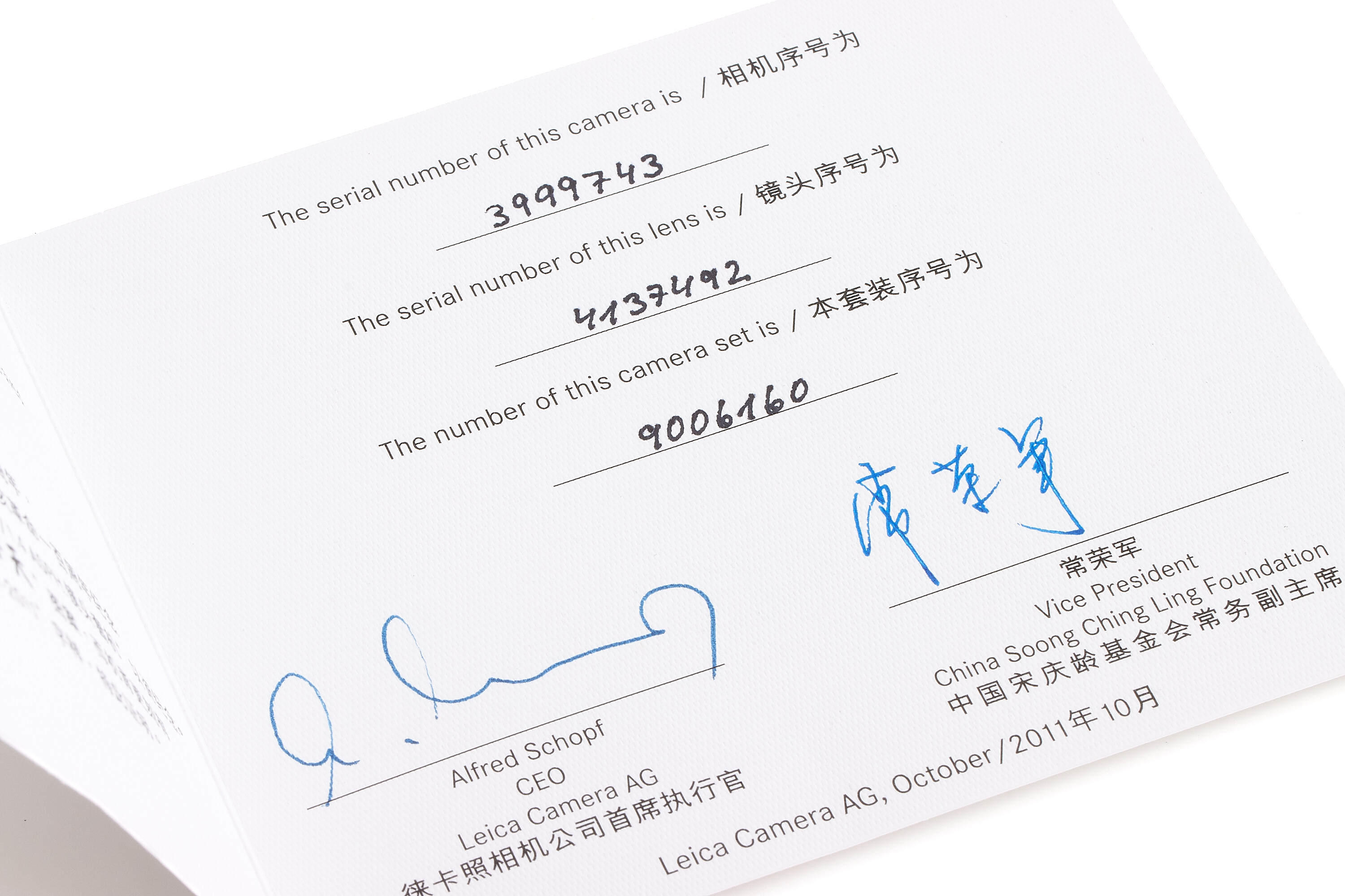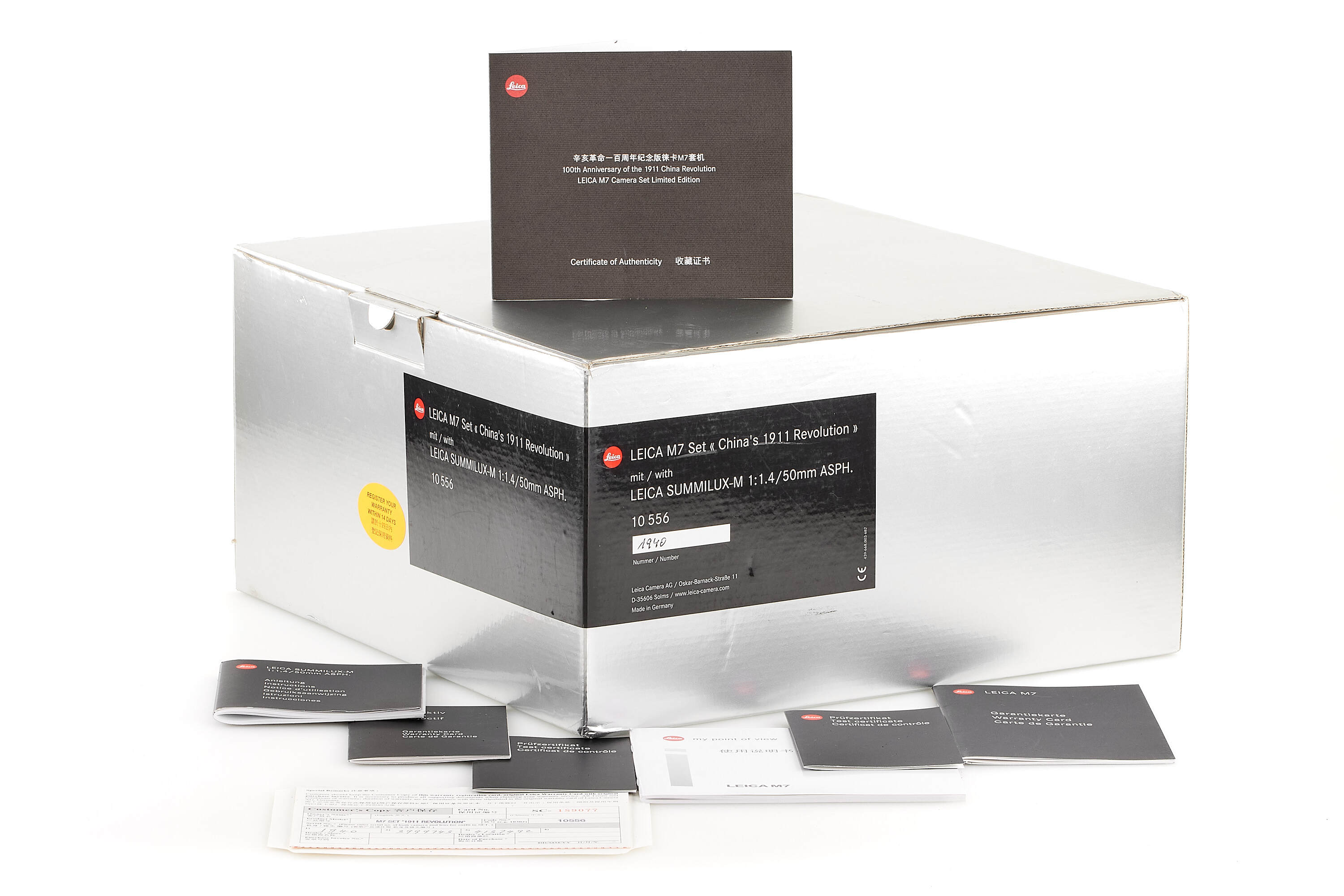 Only 101 sets were produced, the offered set bearing the edition number of the year 1940. It includes the body no.3999743, and comes with the matching black finish Summilux-M 1.4/50mm no.413749, it is in mint condition, complete with presentation box and all accessories.