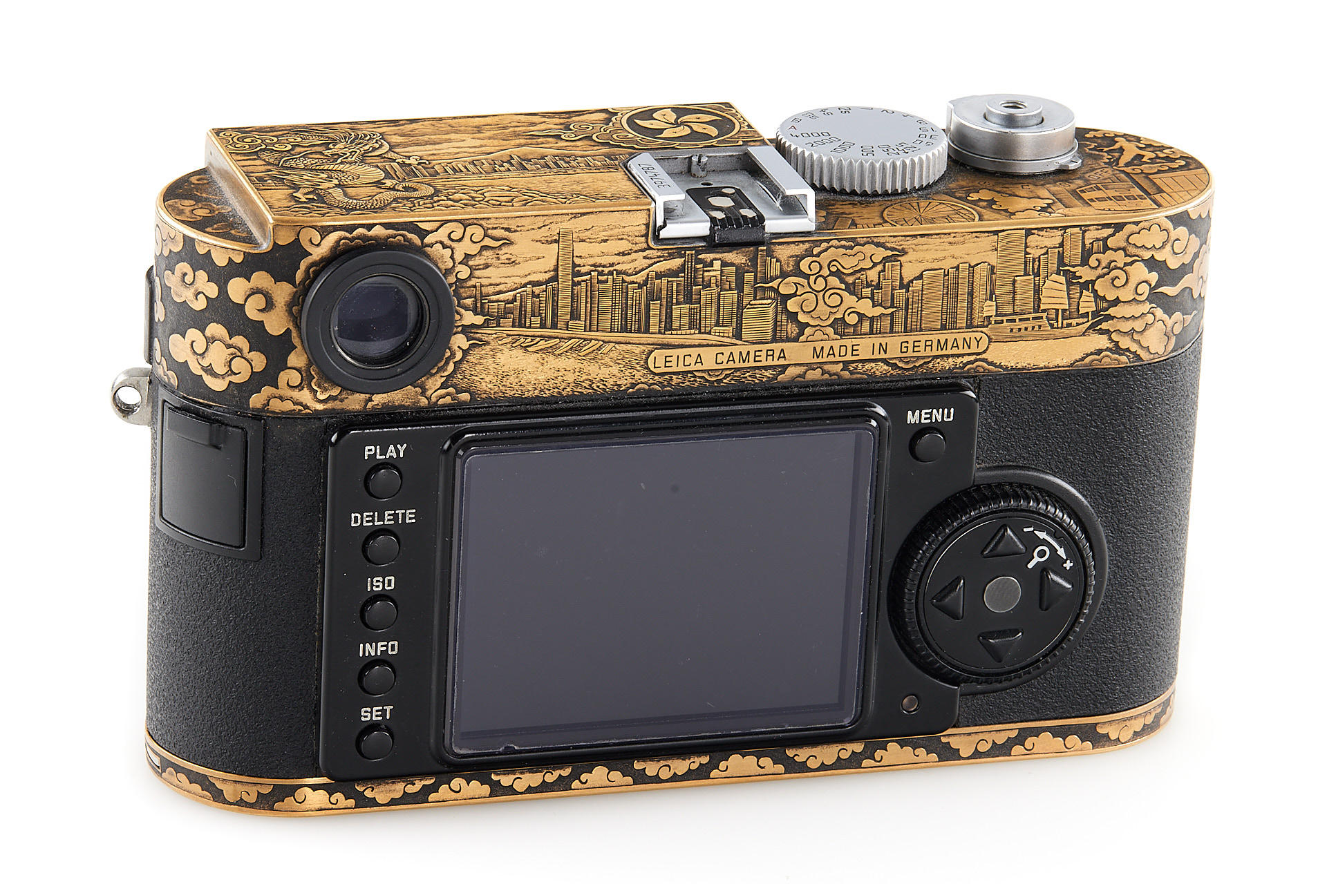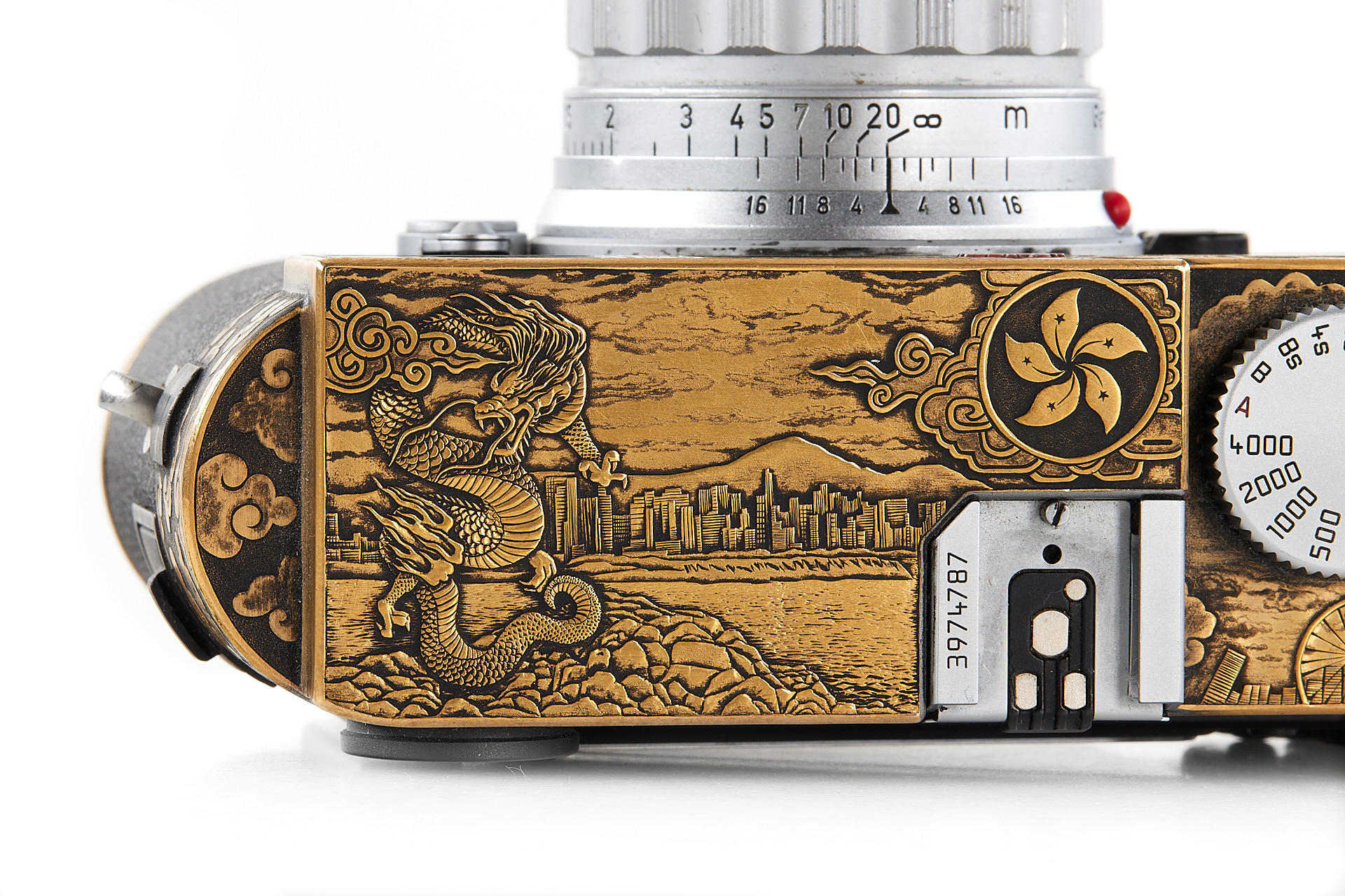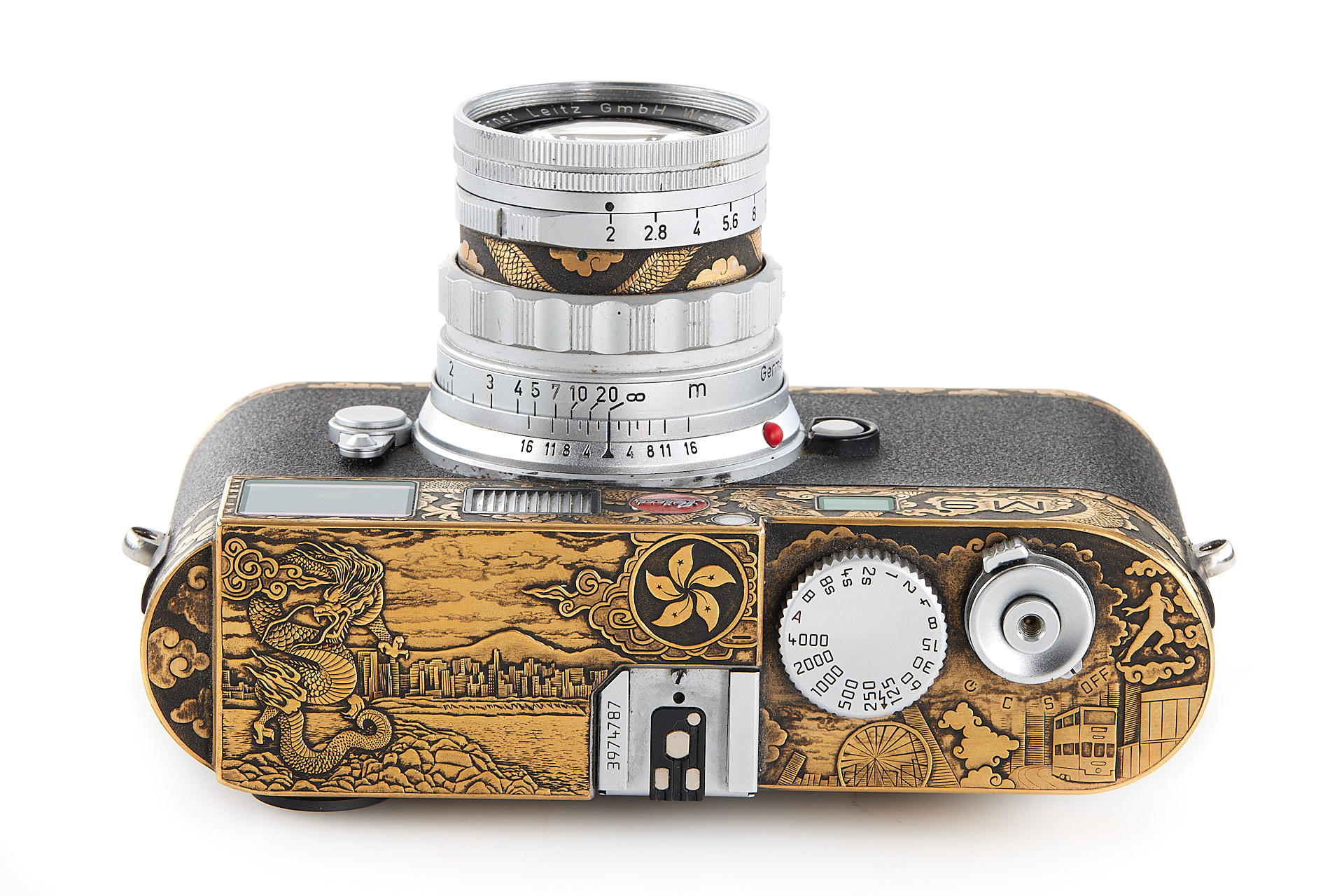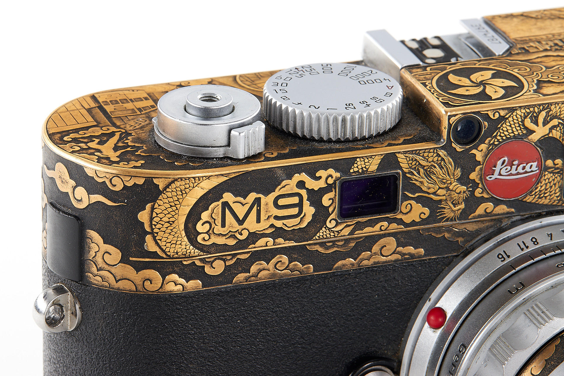 A unique, beautiful Leica M9, with the top plate and the base plate engraved with typical Hong Kong motives, it took more than one year for a skilled engraver to finish this masterpiece, the camera is in very good cosmetic condition, the sensor shows slight corrosion and some scratches, it comes with a rigid Summicron 2/5cm no.1511386 (middle part of the barrel also beautifully engraved).