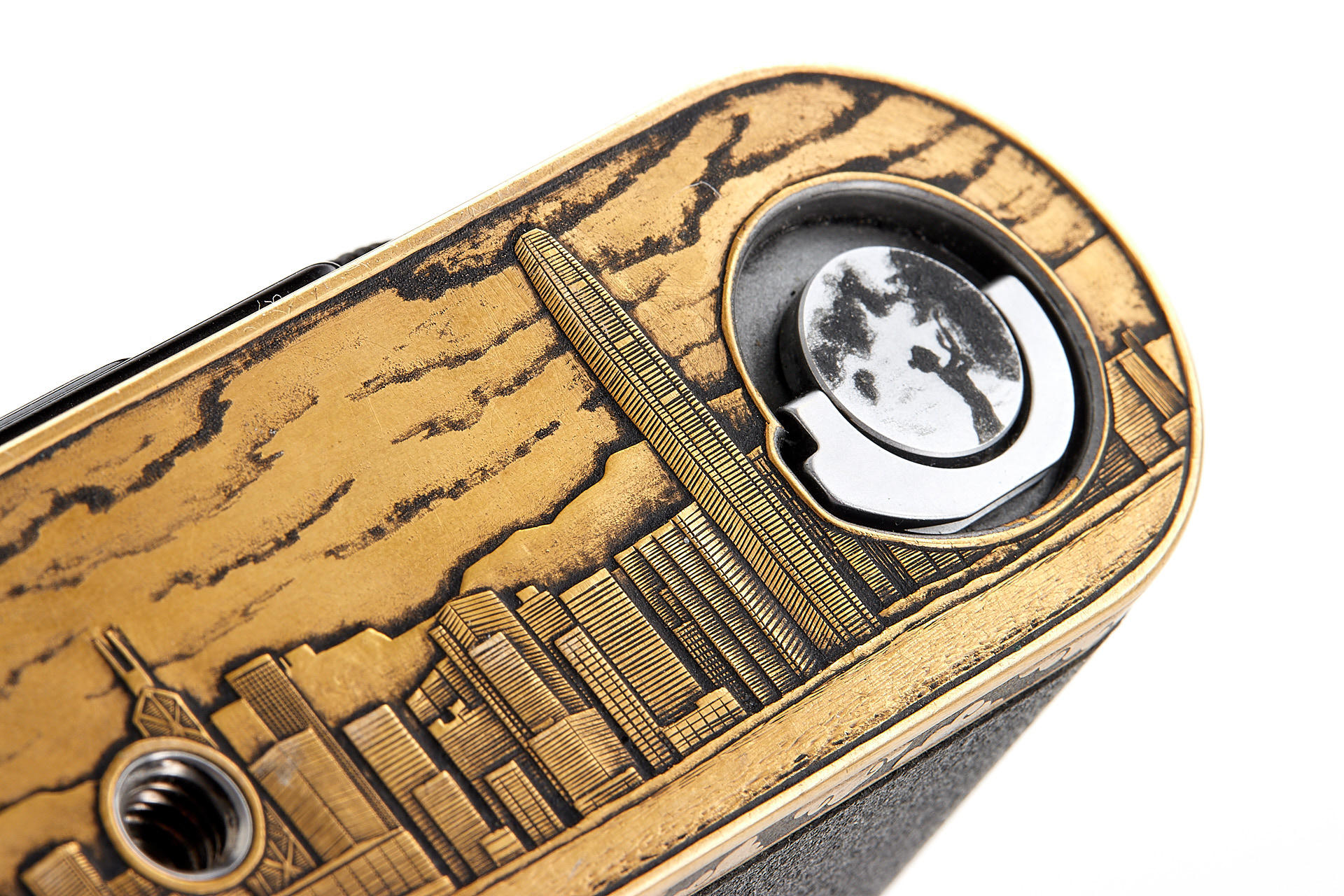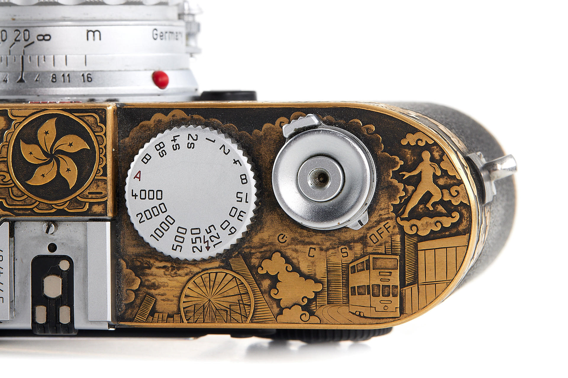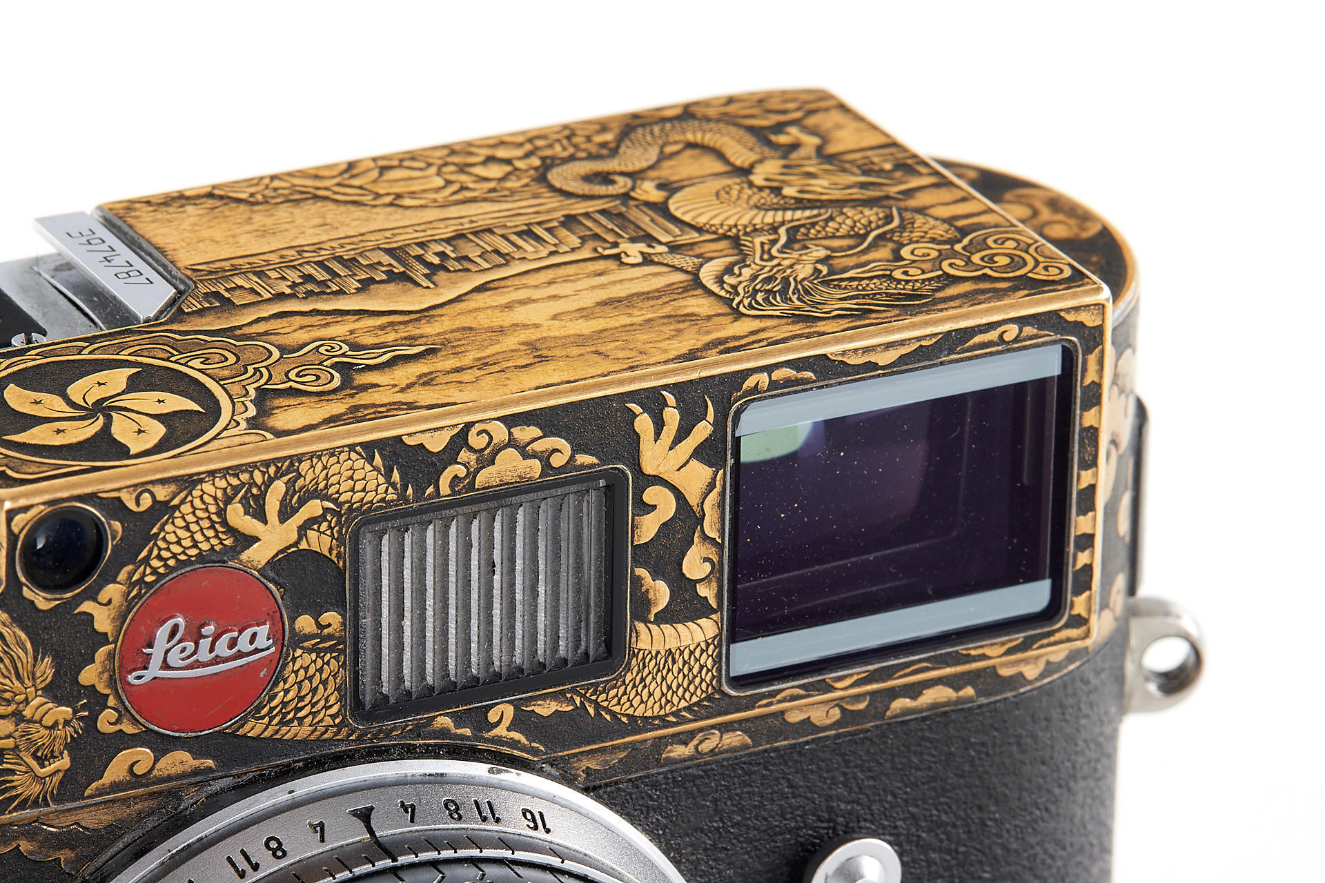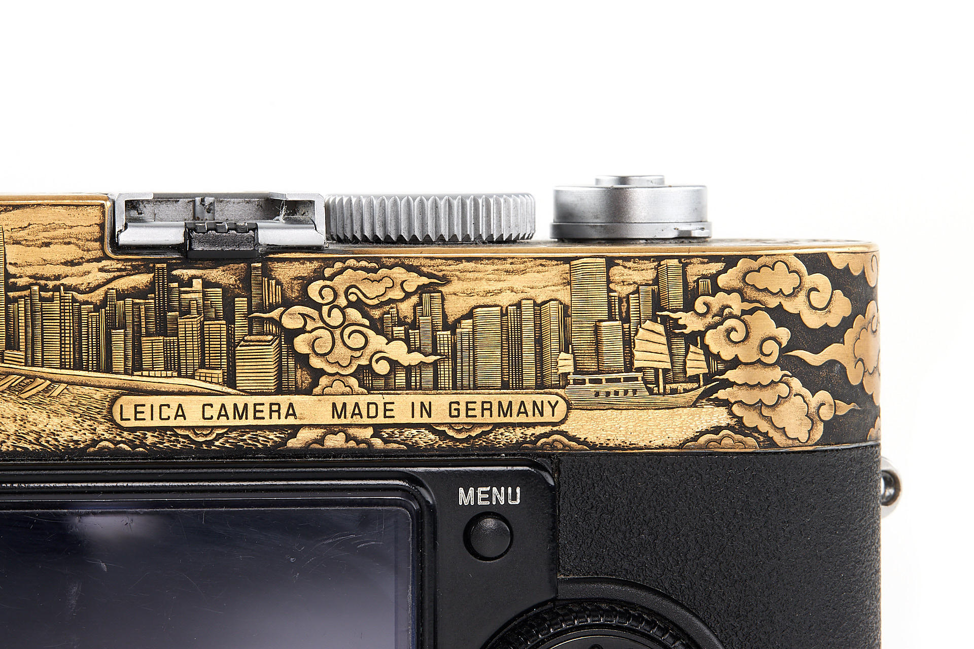 A unique, beautiful Leica M9, with the top plate and the base plate engraved with typical Hong Kong motives, it took more than one year for a skilled engraver to finish this masterpiece, the camera is in very good cosmetic condition, the sensor shows slight corrosion and some scratches, it comes with a rigid Summicron 2/5cm no.1511386 (middle part of the barrel also beautifully engraved).
