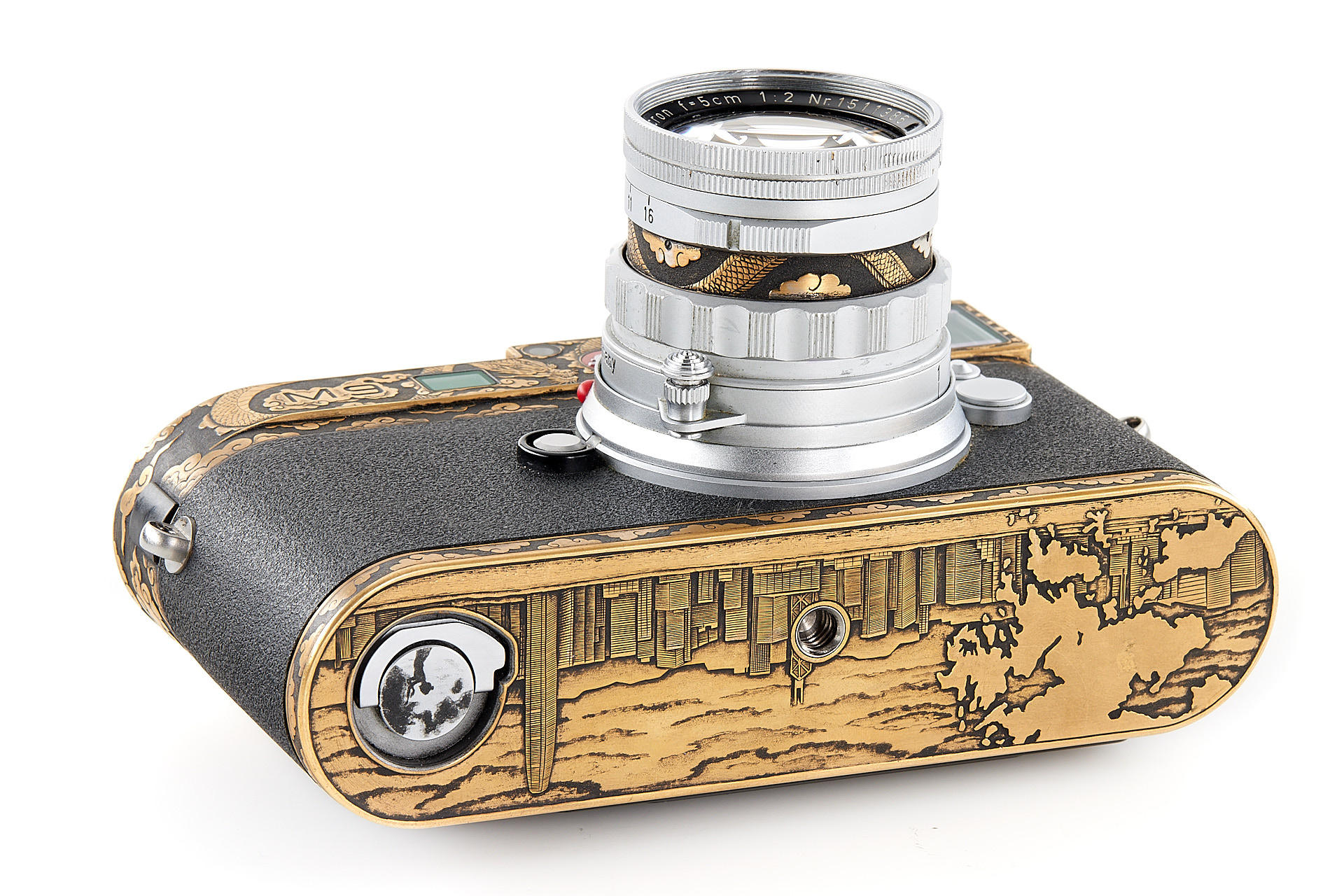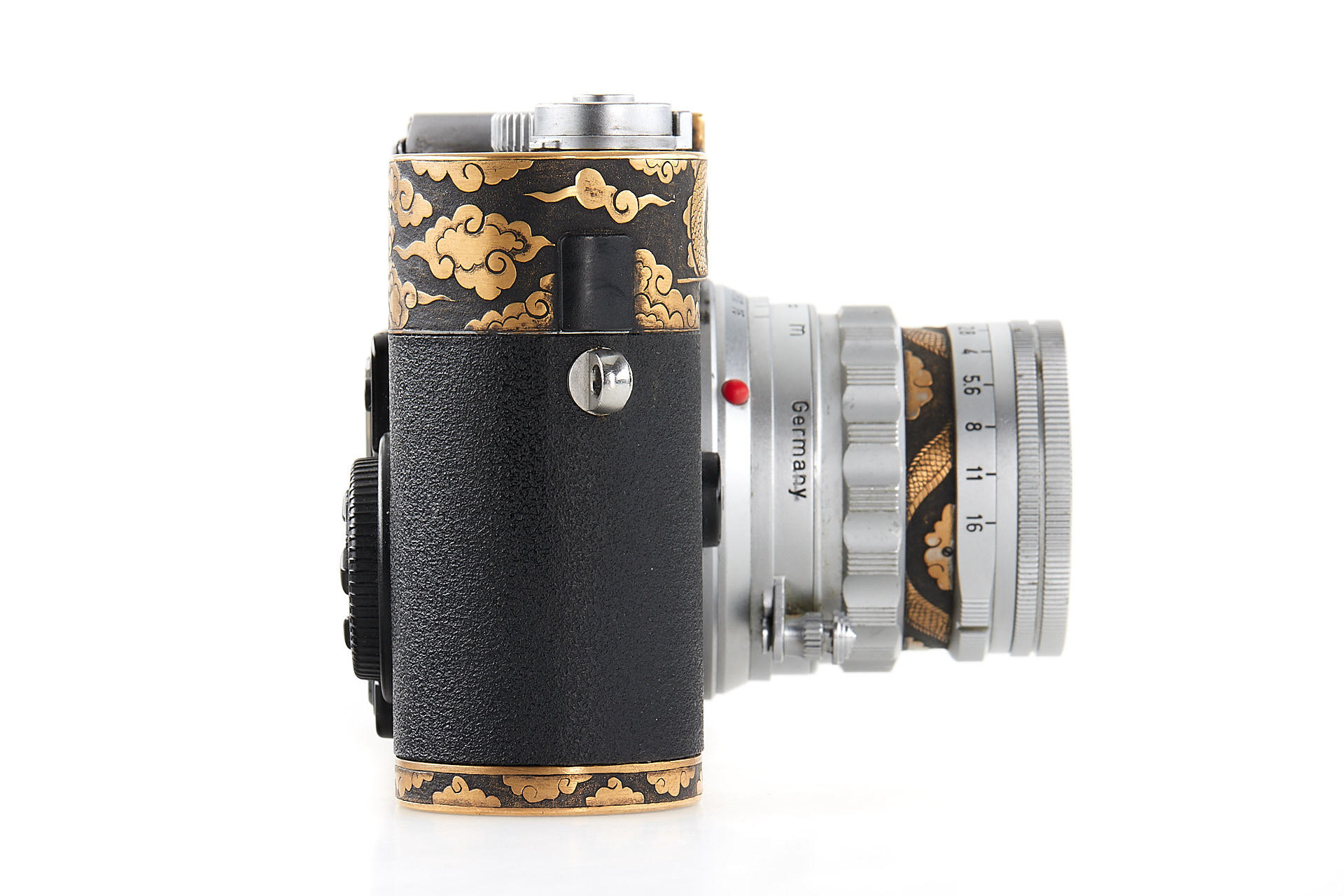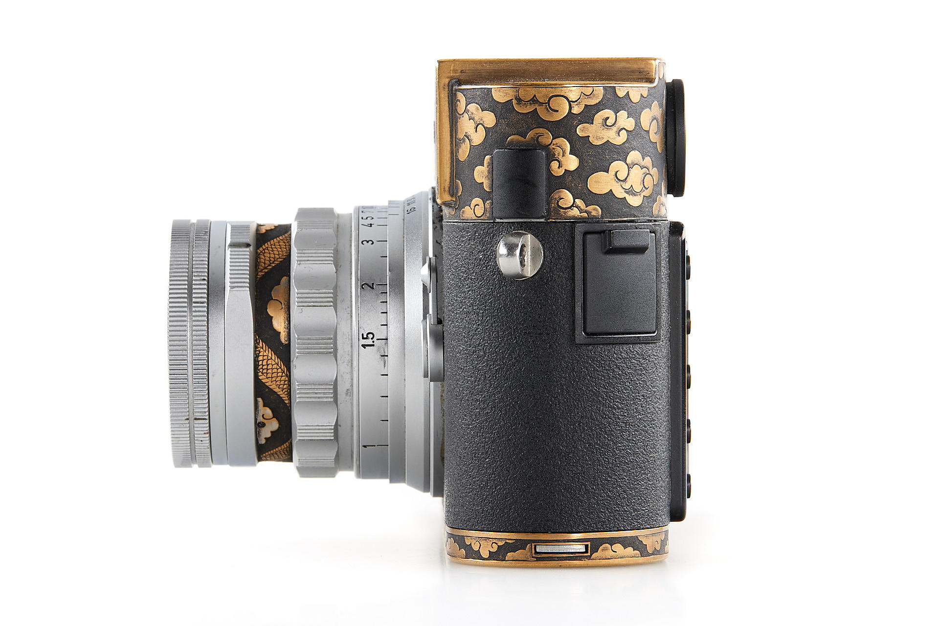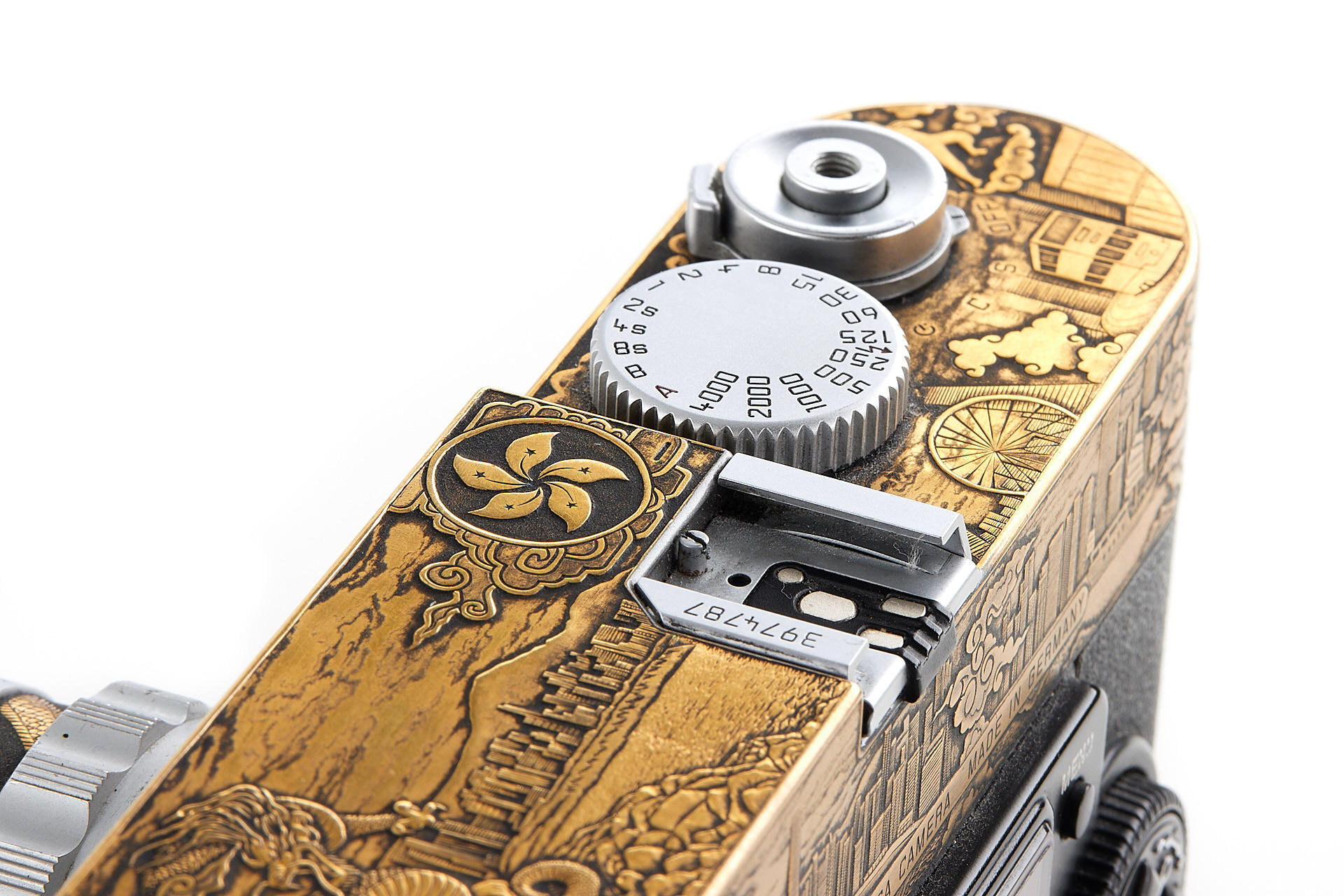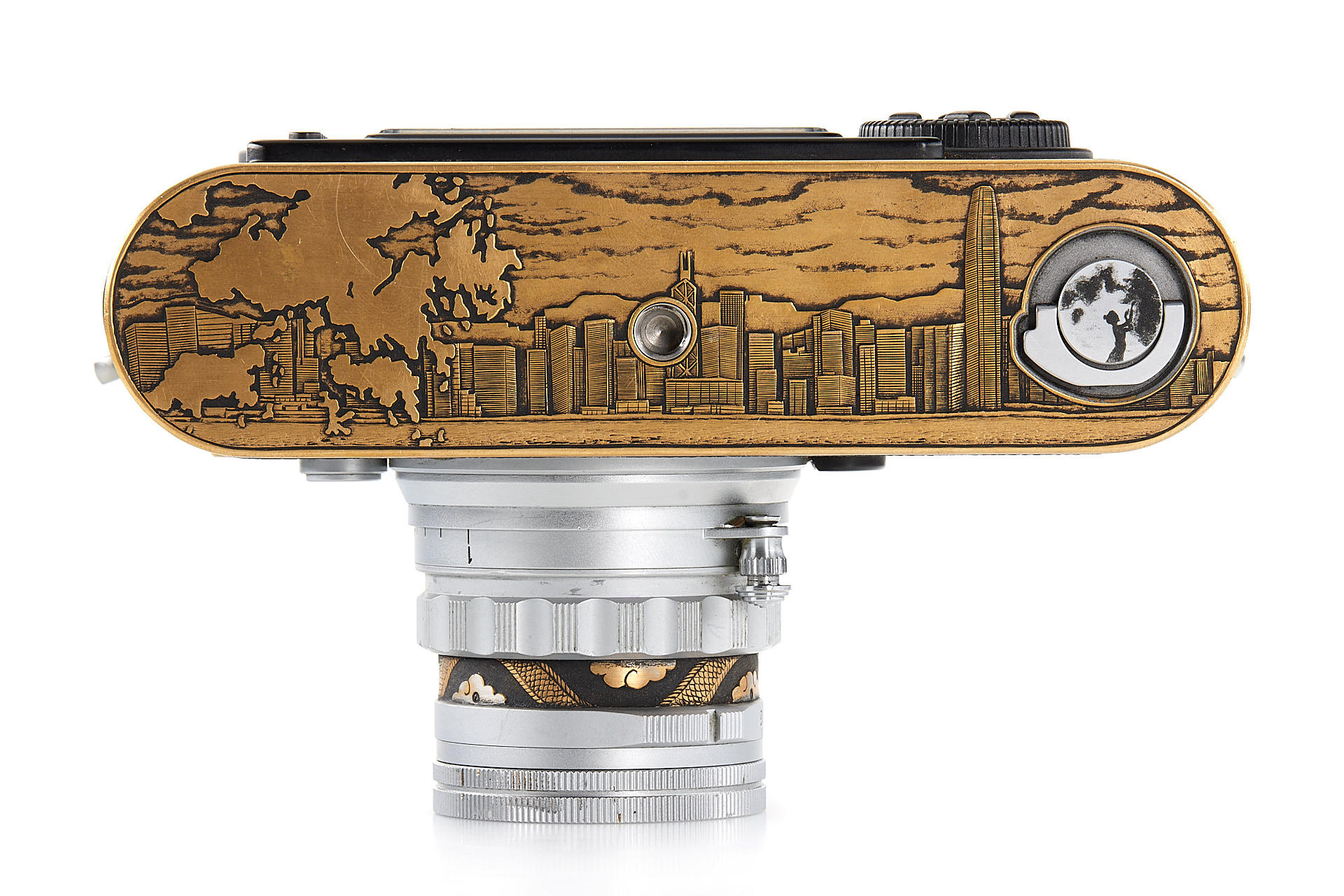 A unique, beautiful Leica M9, with the top plate and the base plate engraved with typical Hong Kong motives, it took more than one year for a skilled engraver to finish this masterpiece, the camera is in very good cosmetic condition, the sensor shows slight corrosion and some scratches, it comes with a rigid Summicron 2/5cm no.1511386 (middle part of the barrel also beautifully engraved).