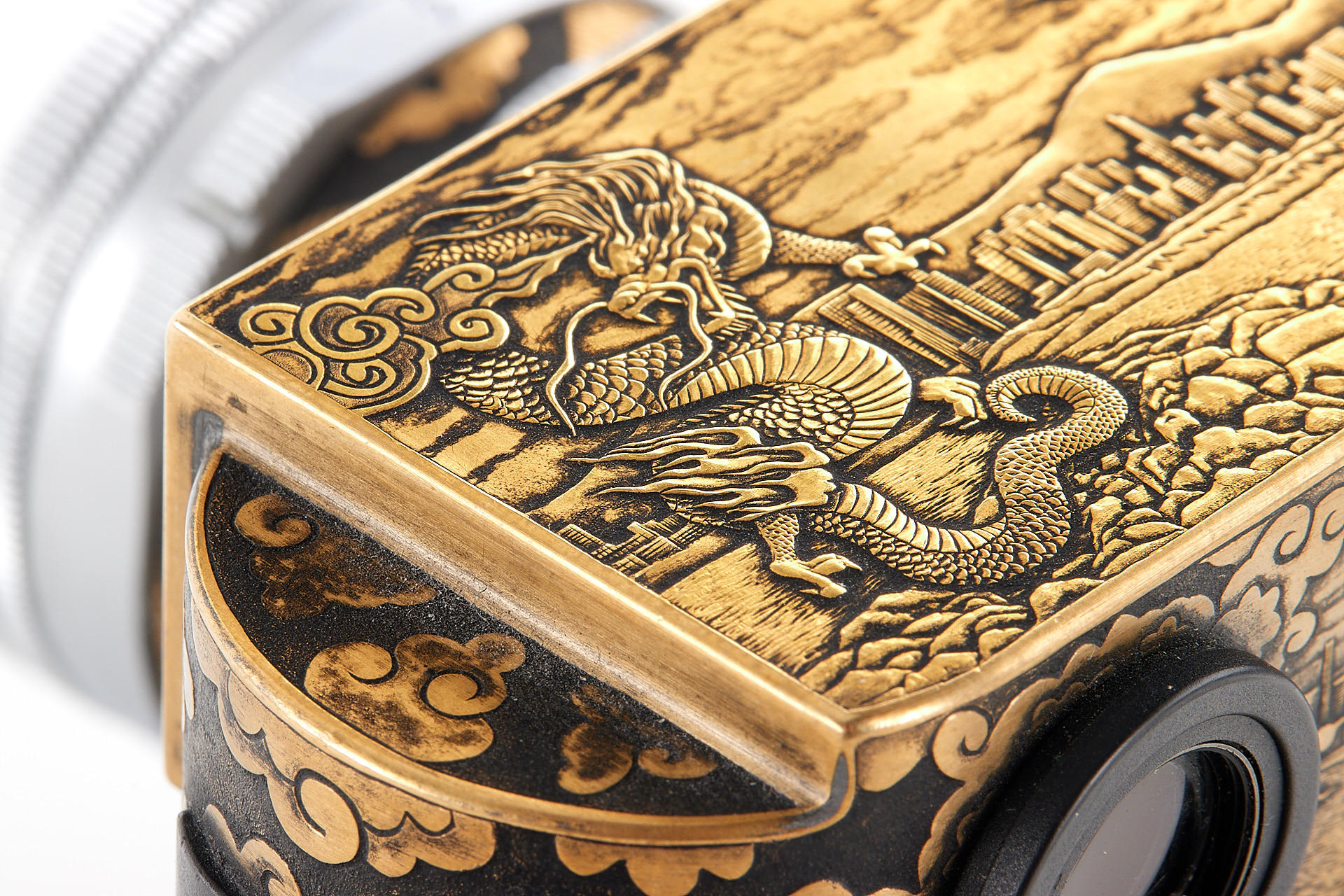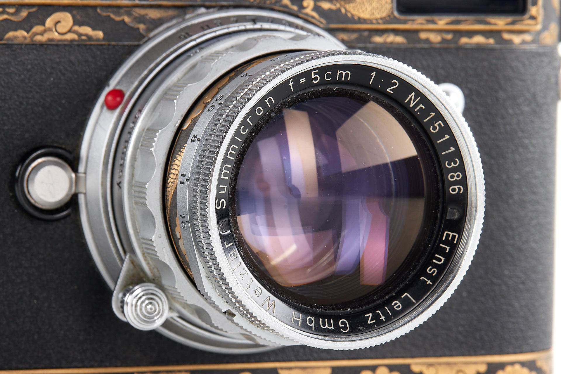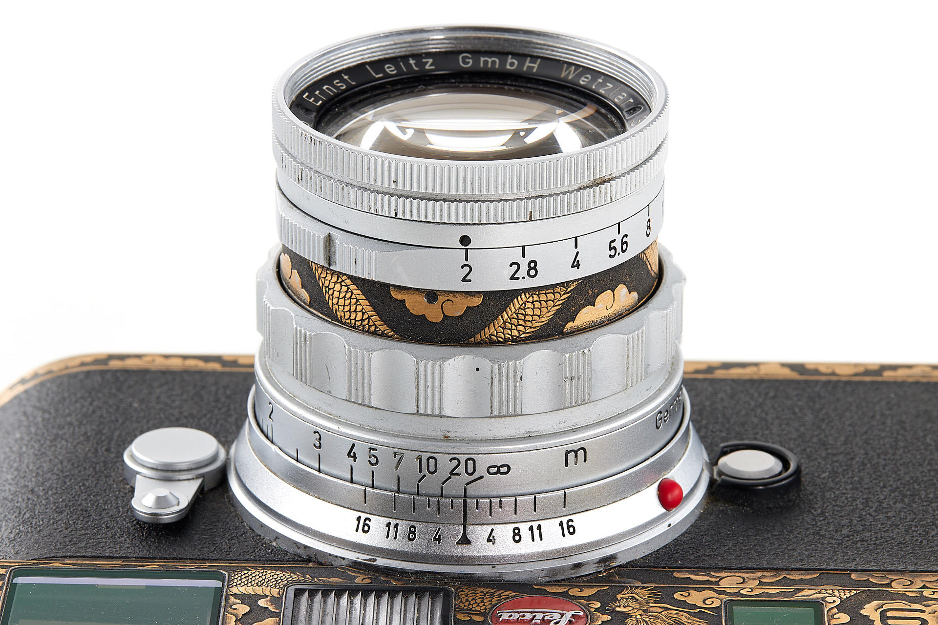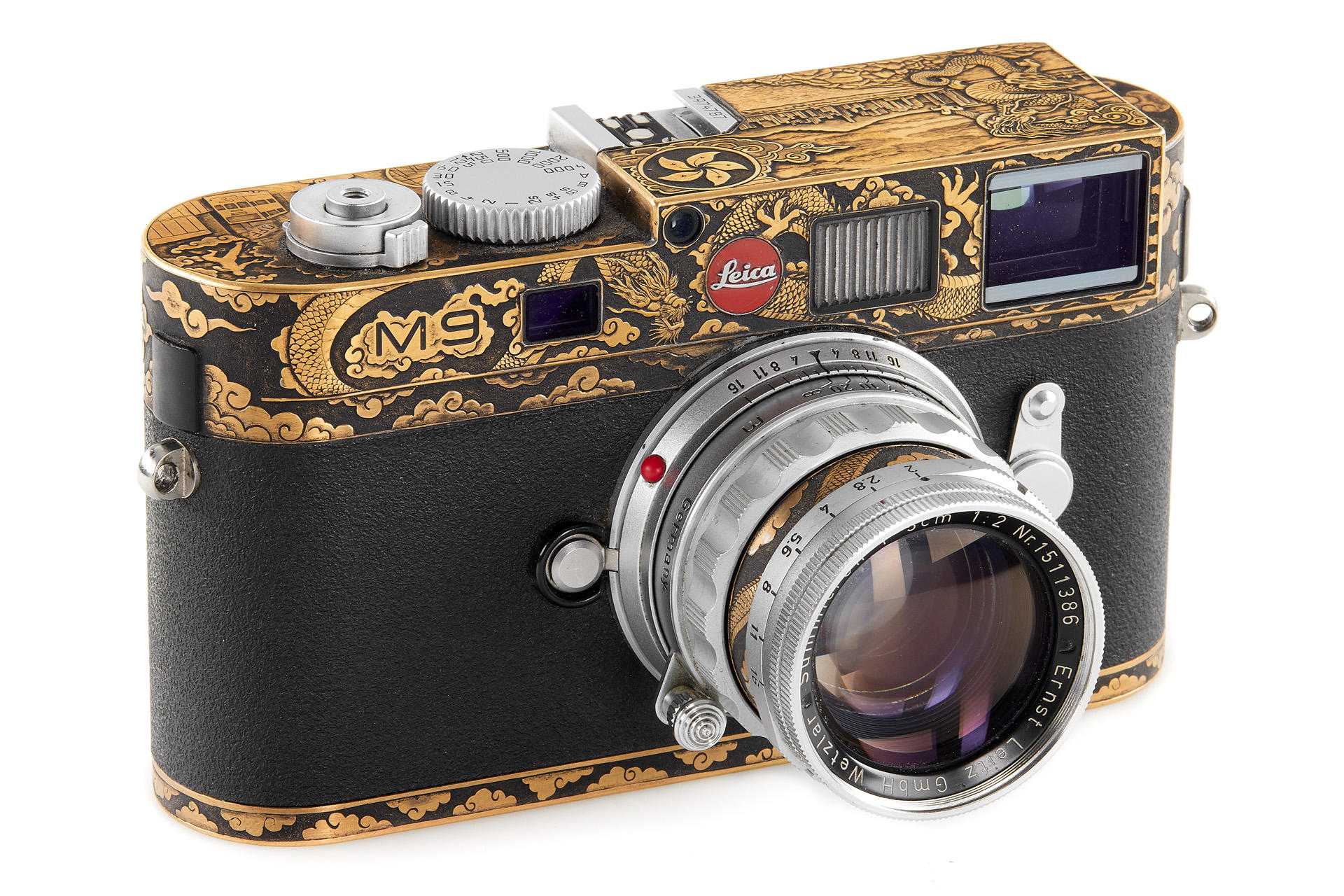 A unique, beautiful Leica M9, with the top plate and the base plate engraved with typical Hong Kong motives, it took more than one year for a skilled engraver to finish this masterpiece, the camera is in very good cosmetic condition, the sensor shows slight corrosion and some scratches, it comes with a rigid Summicron 2/5cm no.1511386 (middle part of the barrel also beautifully engraved).