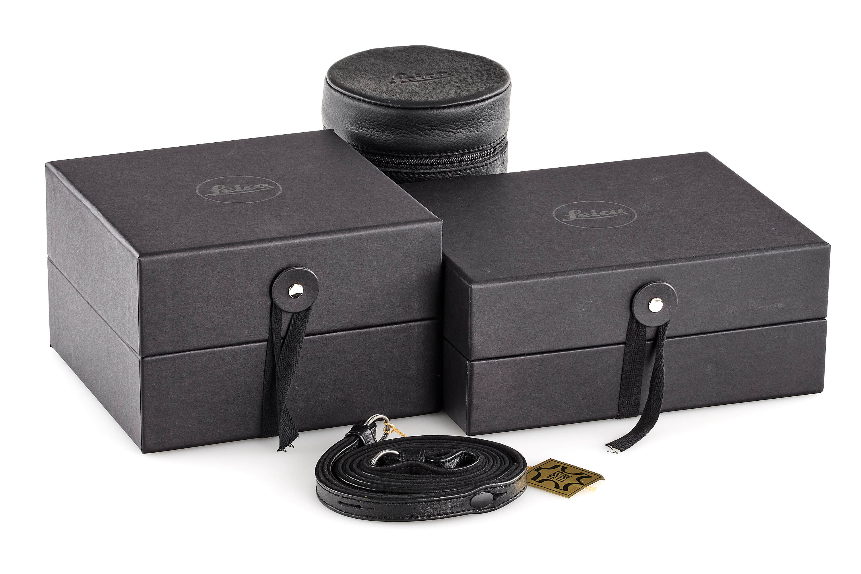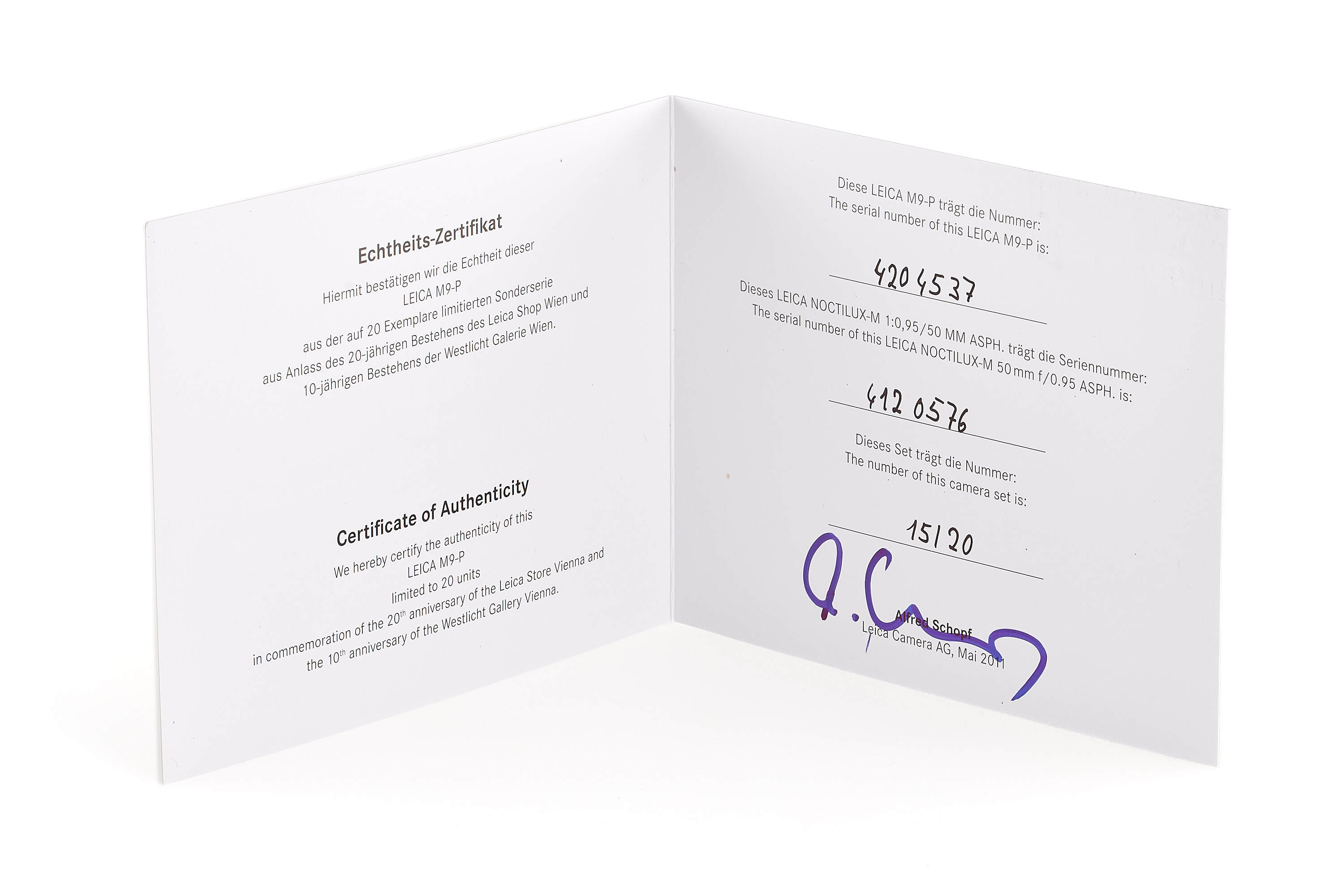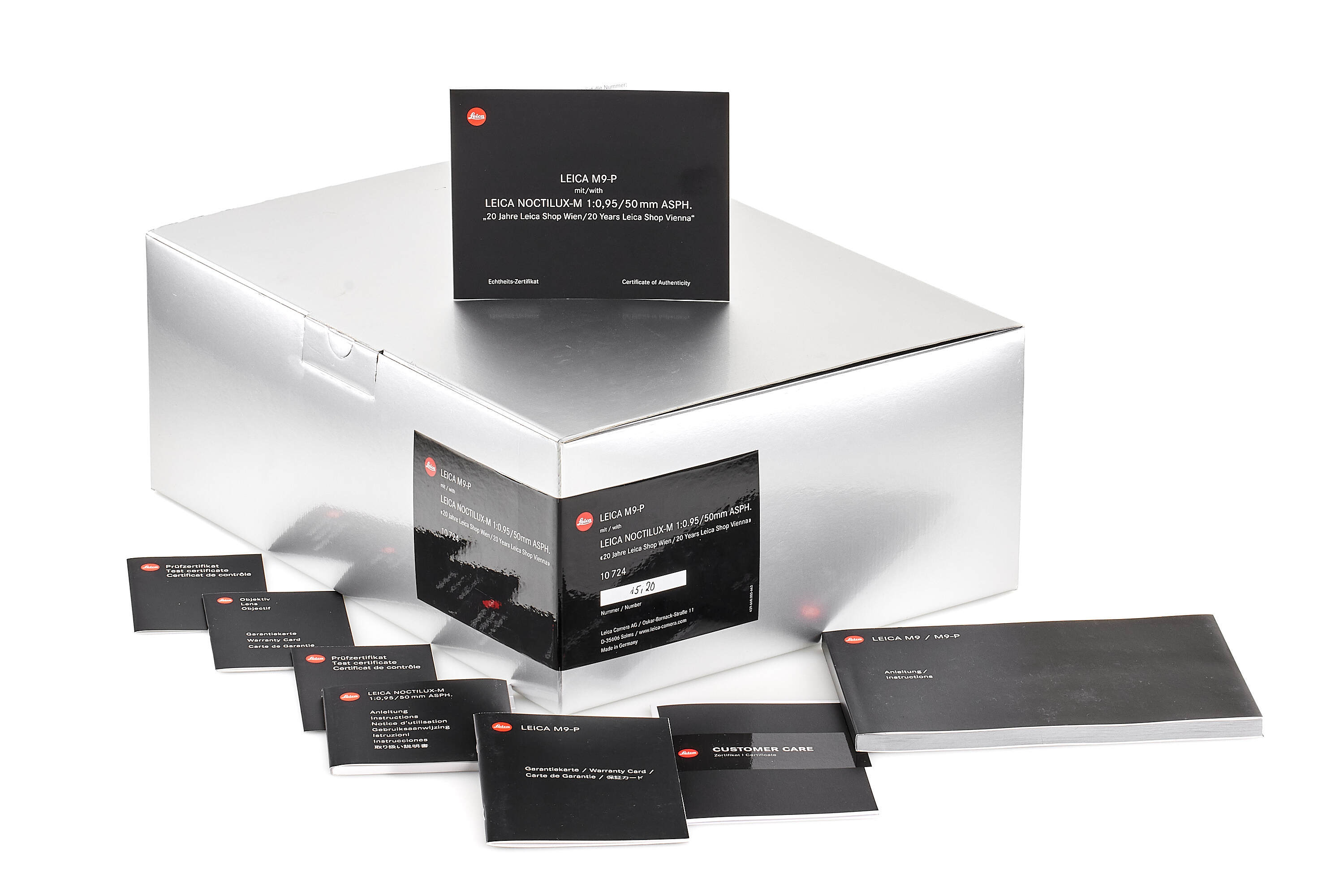 Very rare special edition set released in 2011 to celebrate the 20th anniversary of Leica Shop Vienna, limited to 20 pieces, including M9-P chrome body with black leather covering, engraved '15/20' on the hot shoe, serial number 4204537, with special chrome Noctilux-M 0.95/50mm Asph. no.4120576, in unused condition, new sensor, complete with all accessories, papers, certificates of authenticity, in maker's box.