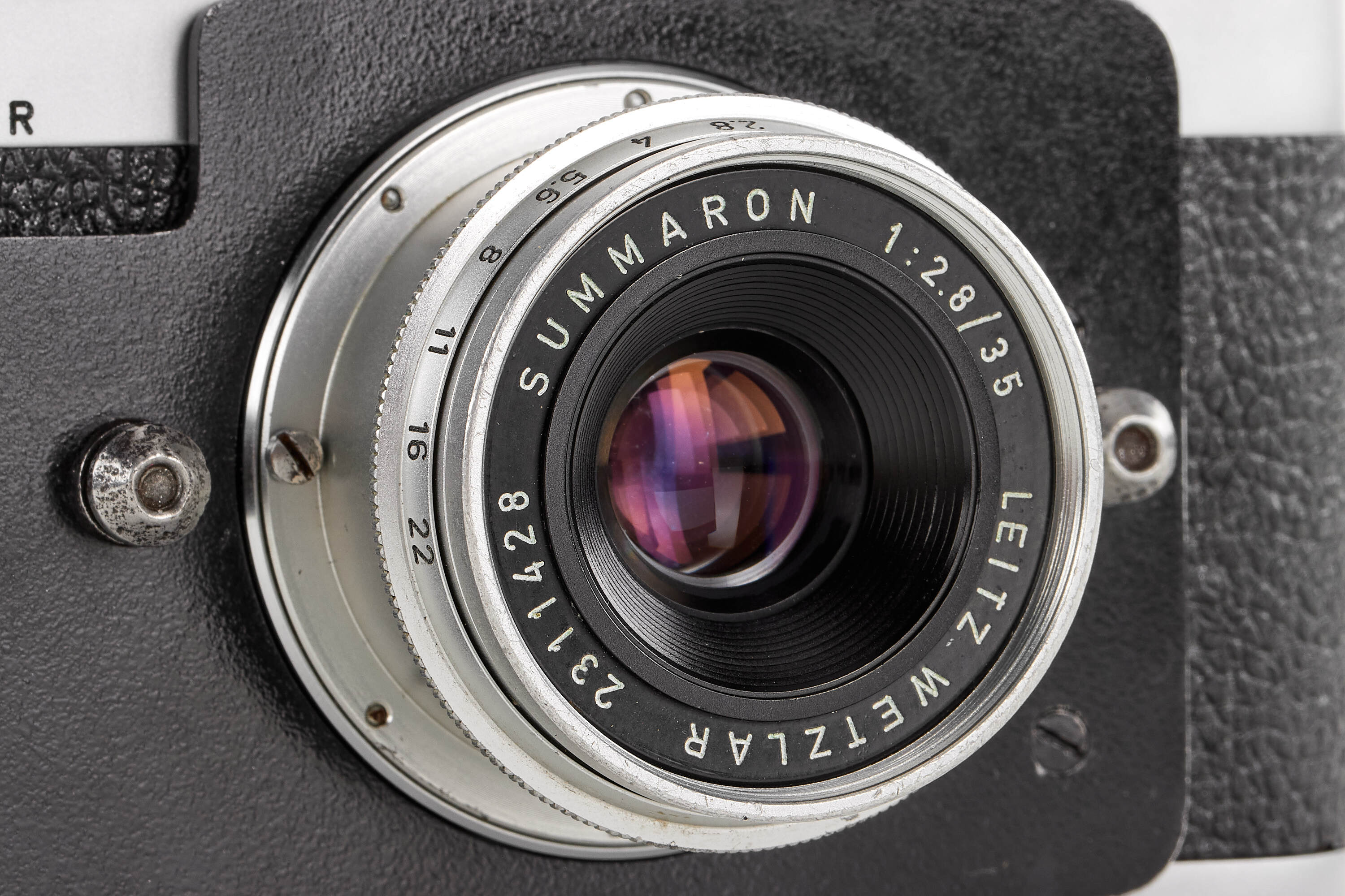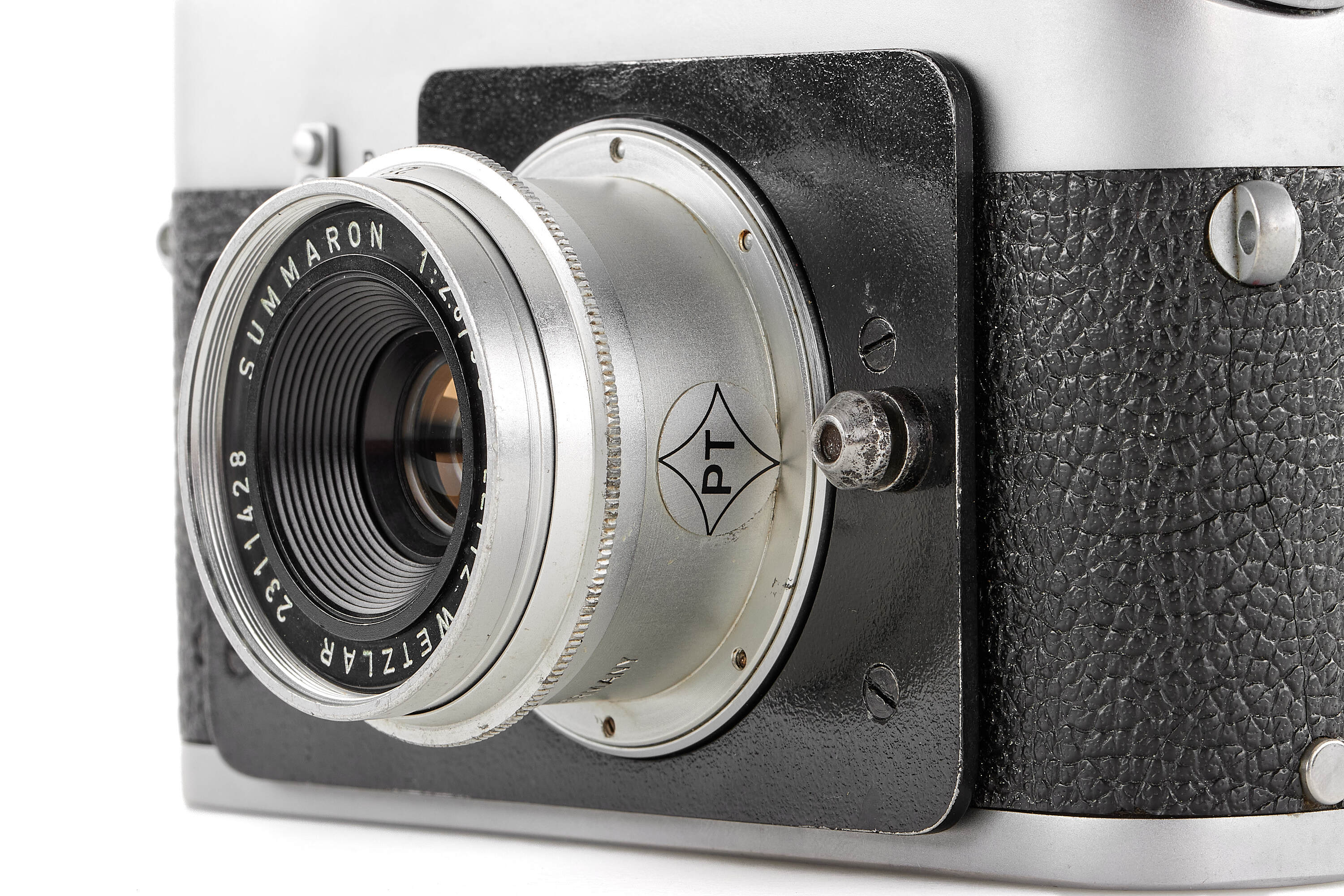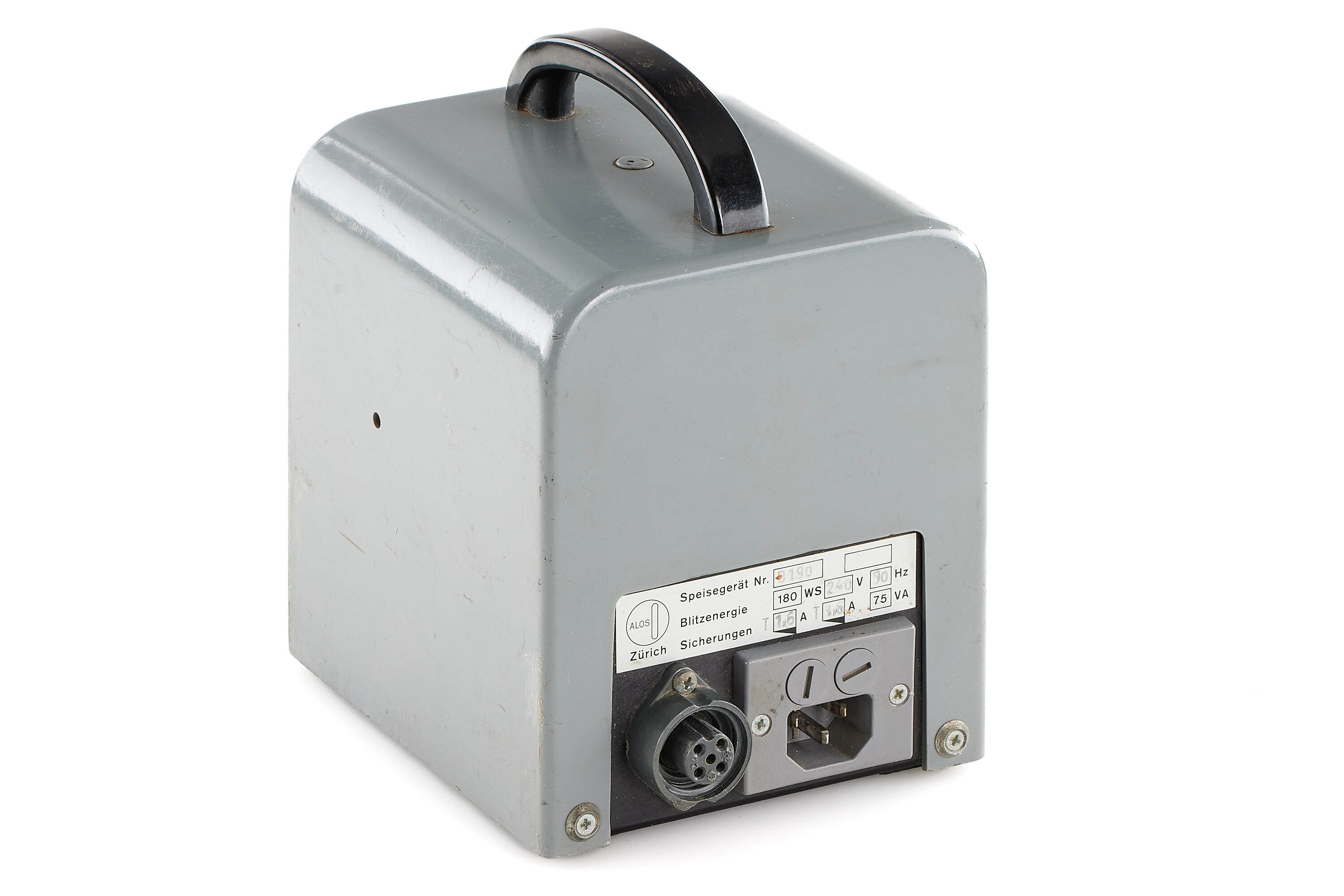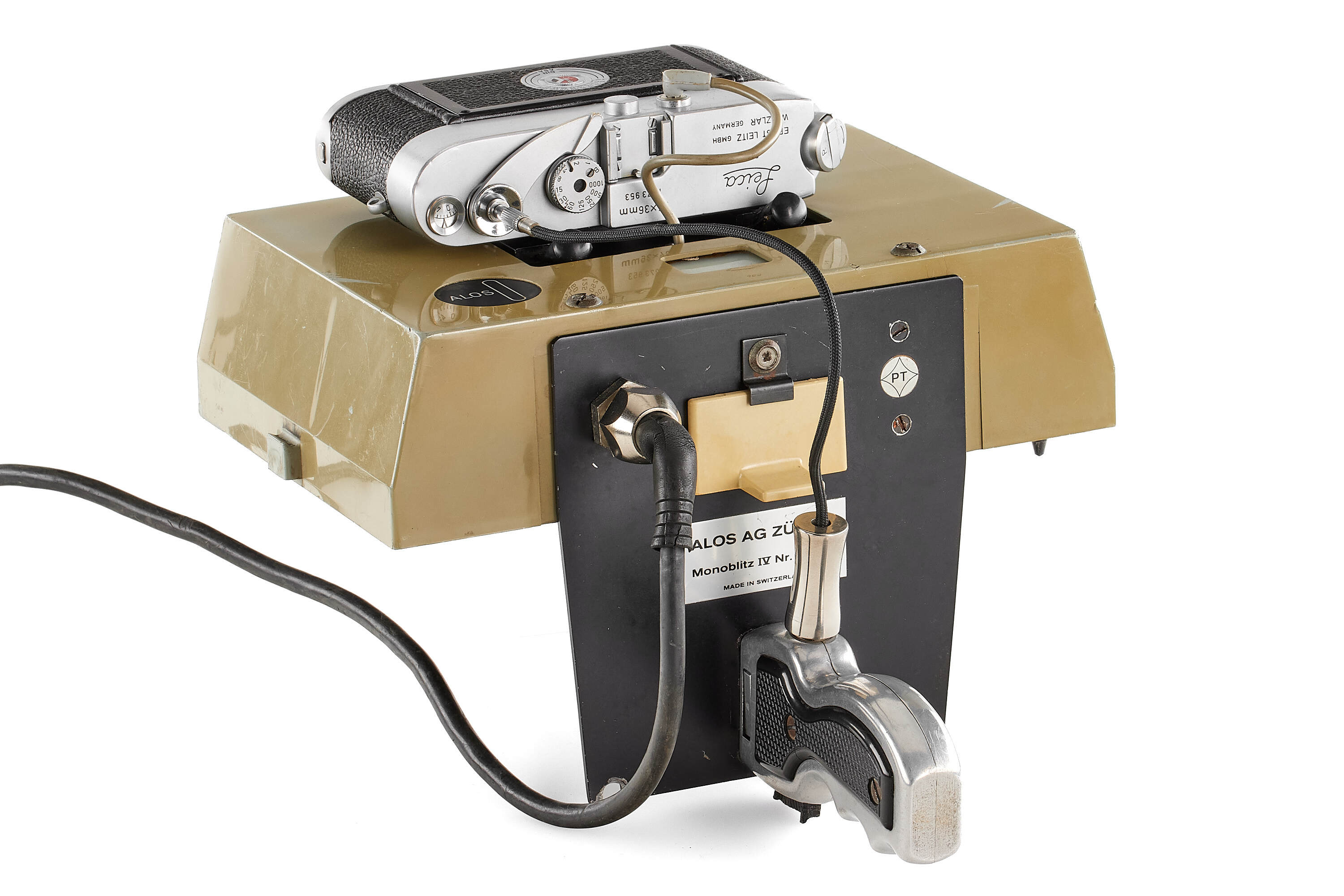 Rare Post camera delivered to the South-African Post-Office, with fixed focus Summaron 2.8/35mm no.2311428, in good condition, shutter only firing at flash sync. and B, an interesting model with blanked bulb sync. connection, no 'MDa' engraved on the top plate, with standard bottom plate, from th last batch of 24x36mm MDa cameras, also note the 'PT' logo on the side of the lens, with rare Swiss ALOS flash set with transformer, cables and transport case.