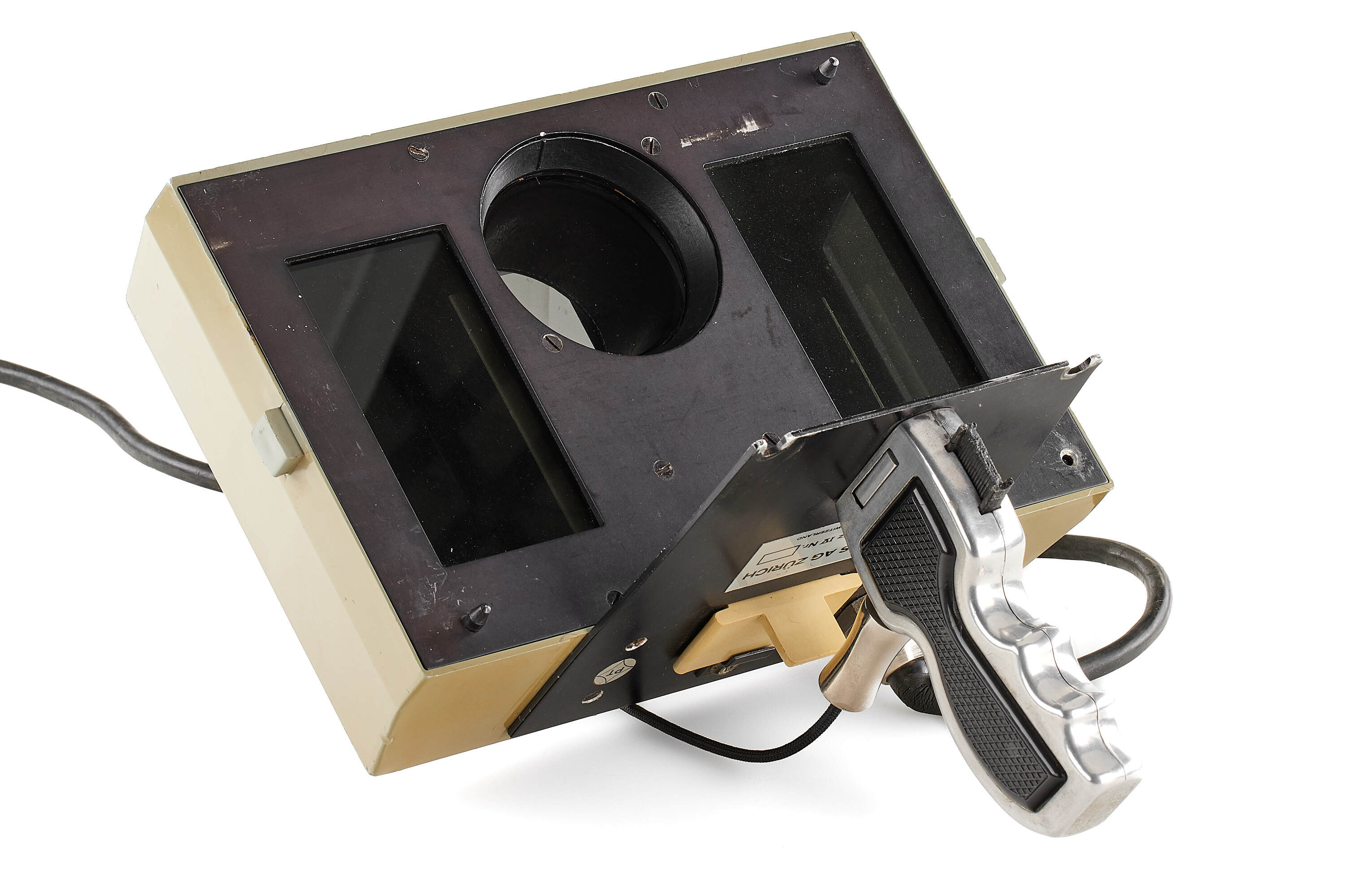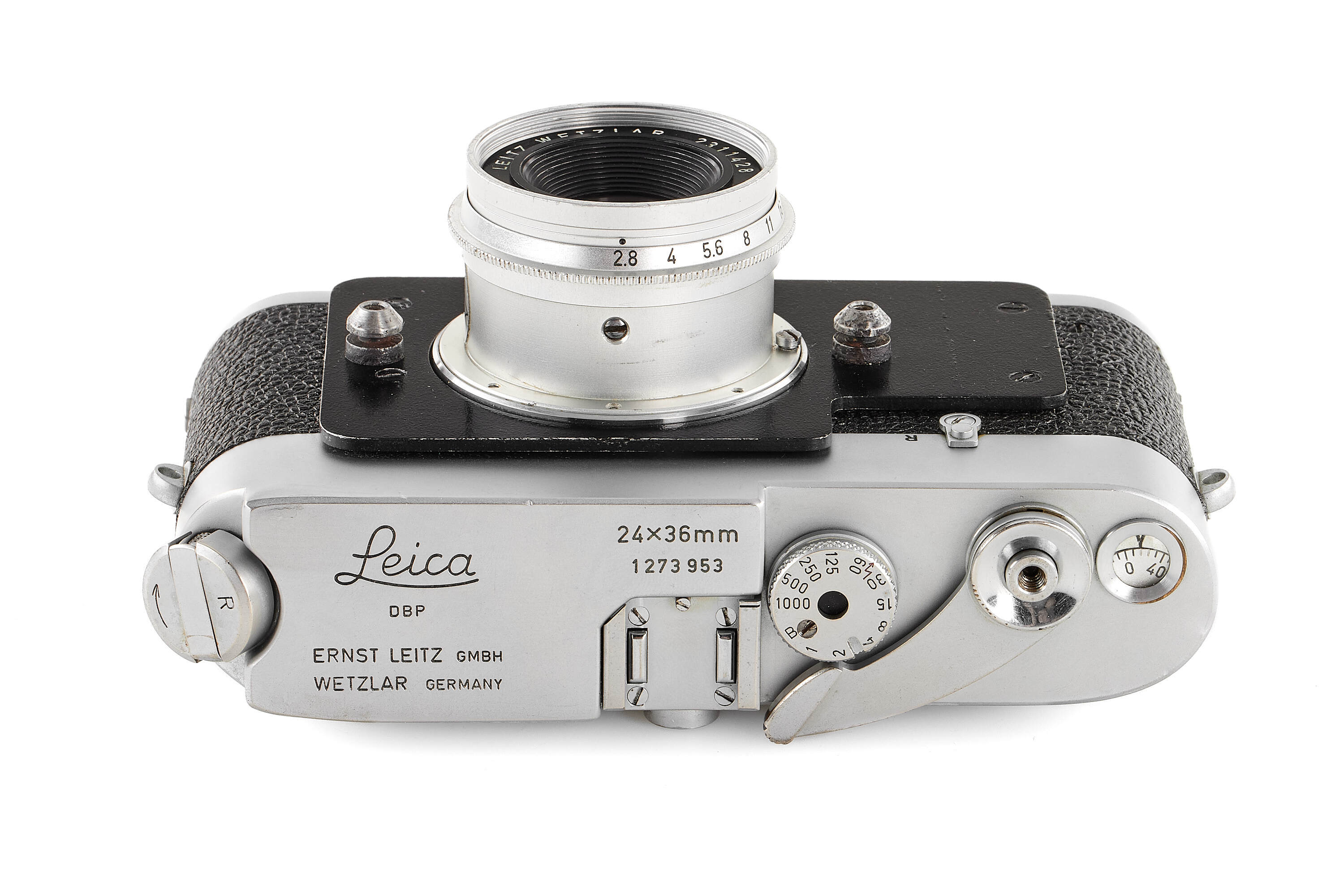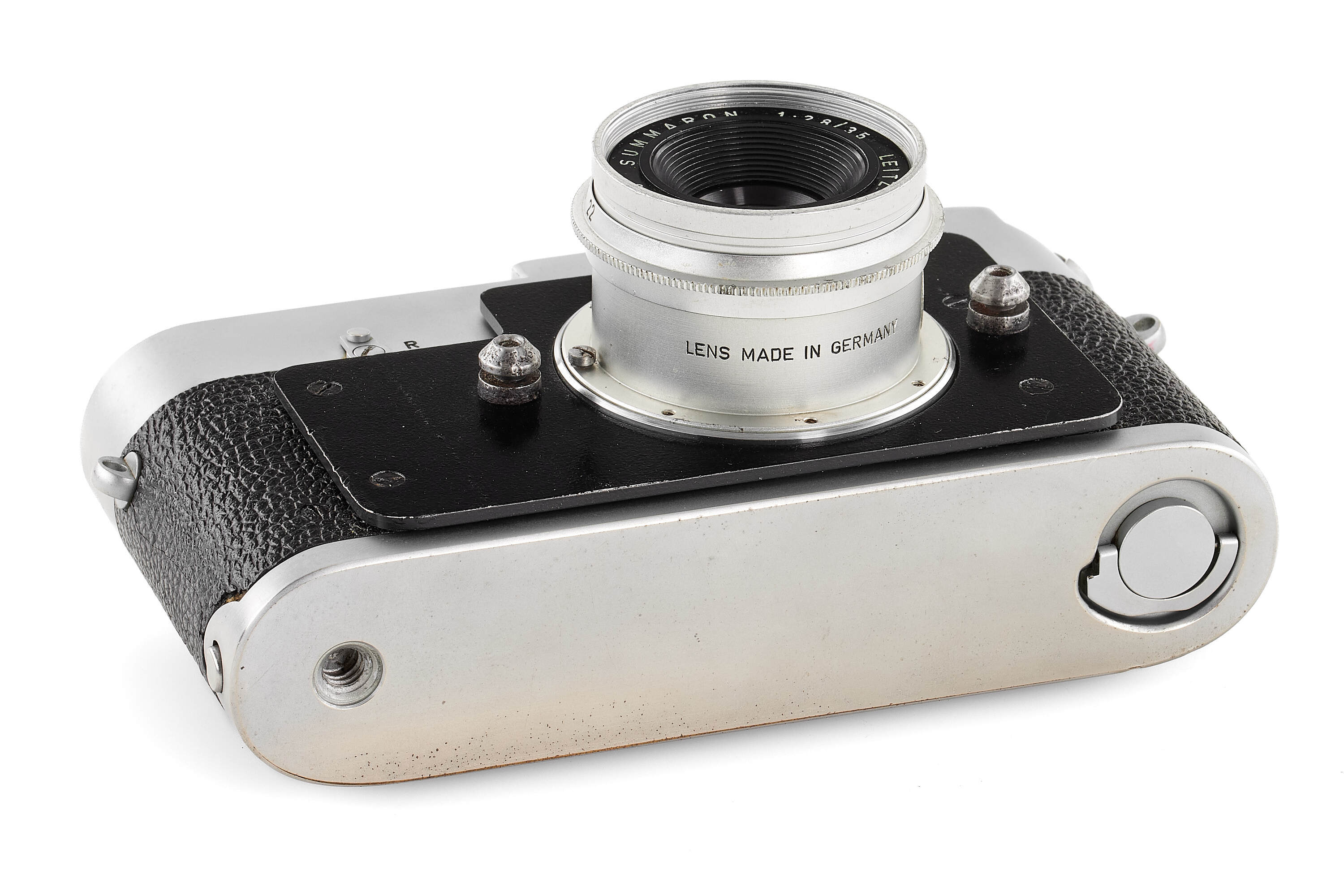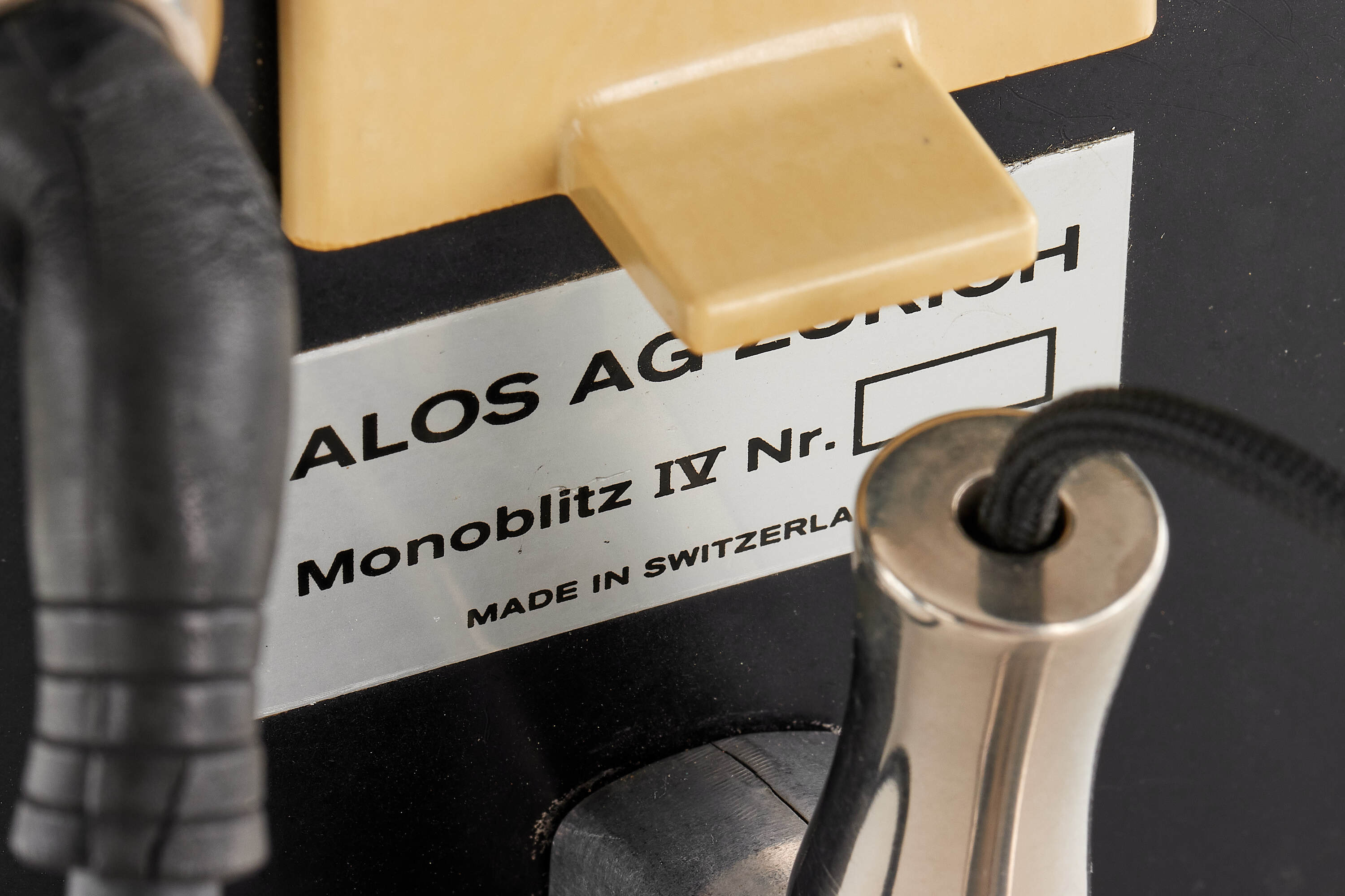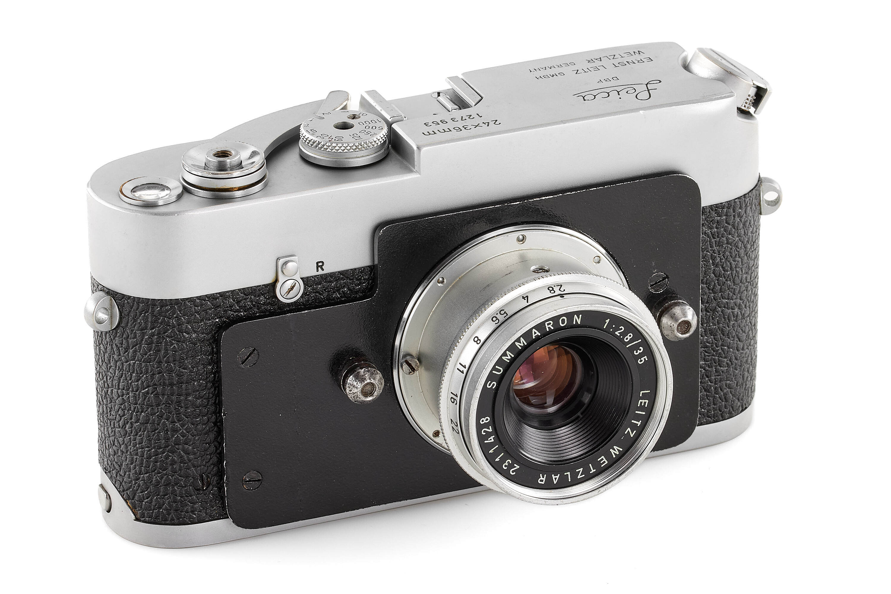 Rare Post camera delivered to the South-African Post-Office, with fixed focus Summaron 2.8/35mm no.2311428, in good condition, shutter only firing at flash sync. and B, an interesting model with blanked bulb sync. connection, no 'MDa' engraved on the top plate, with standard bottom plate, from th last batch of 24x36mm MDa cameras, also note the 'PT' logo on the side of the lens, with rare Swiss ALOS flash set with transformer, cables and transport case.