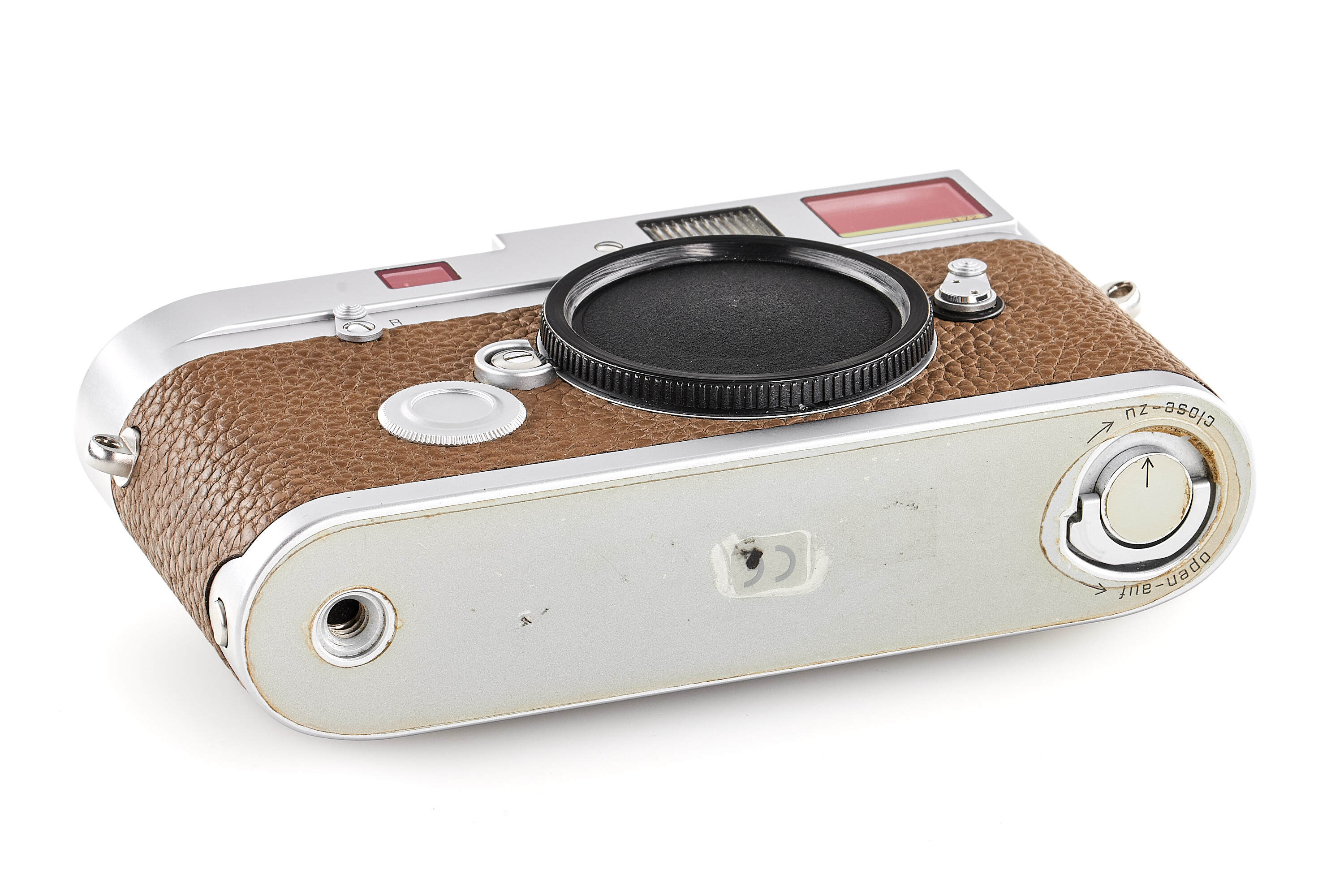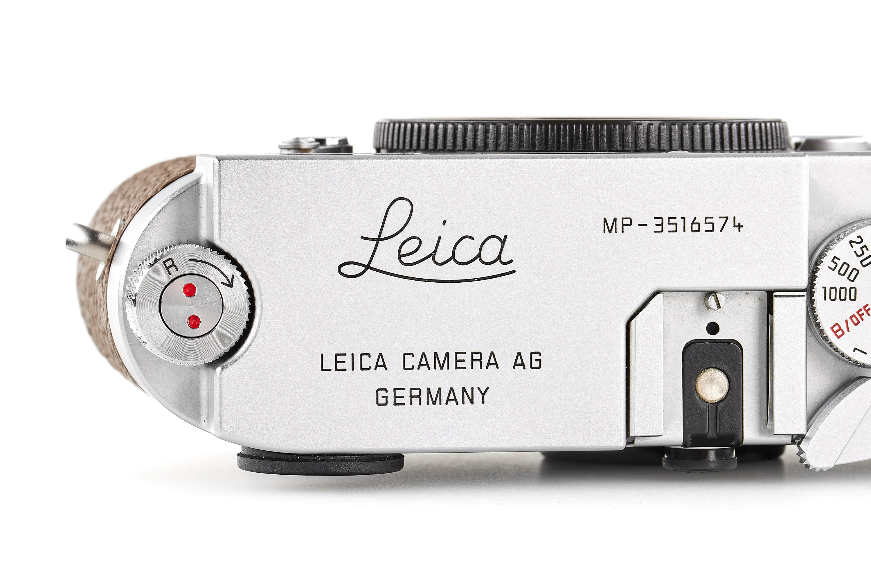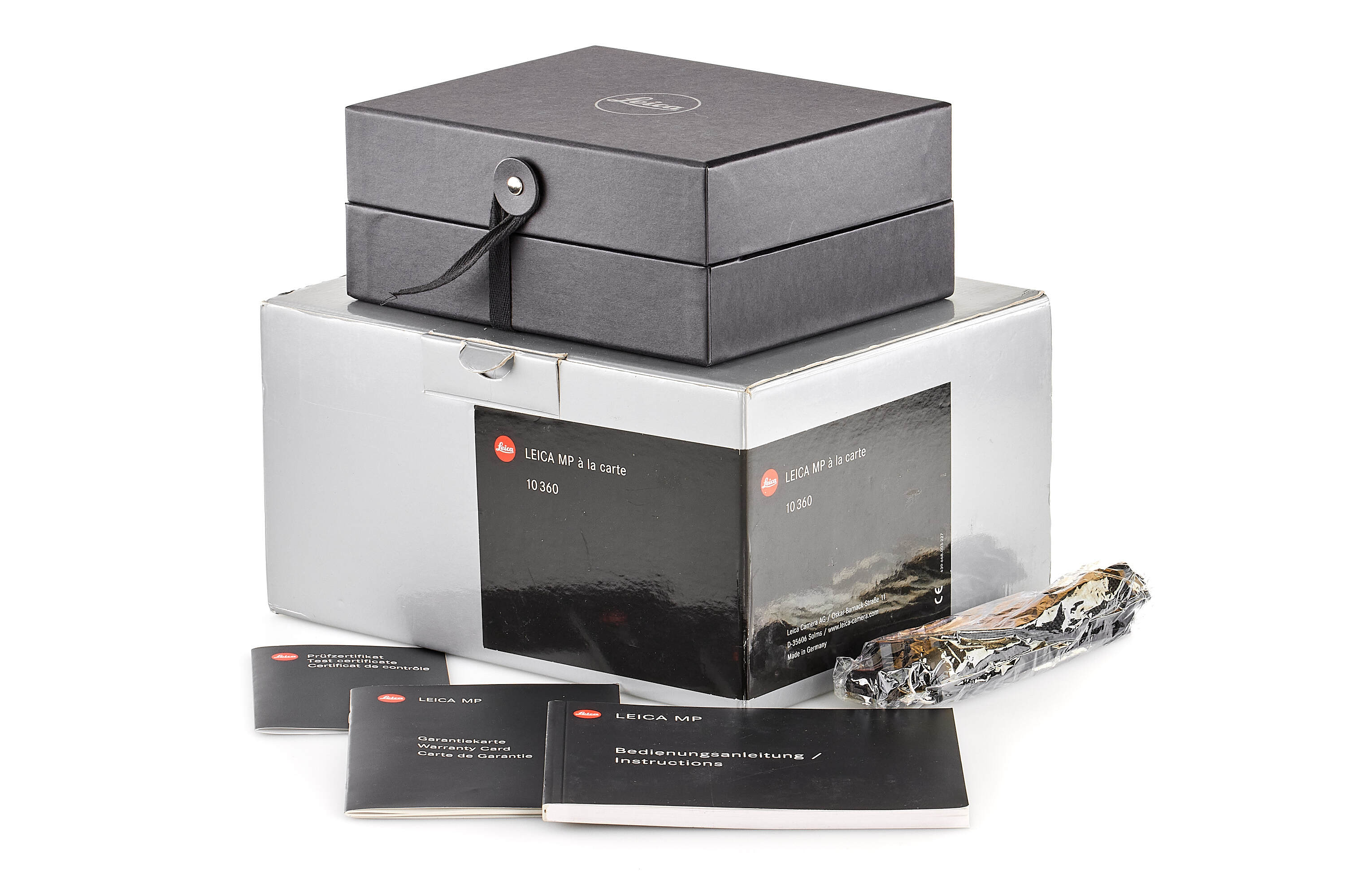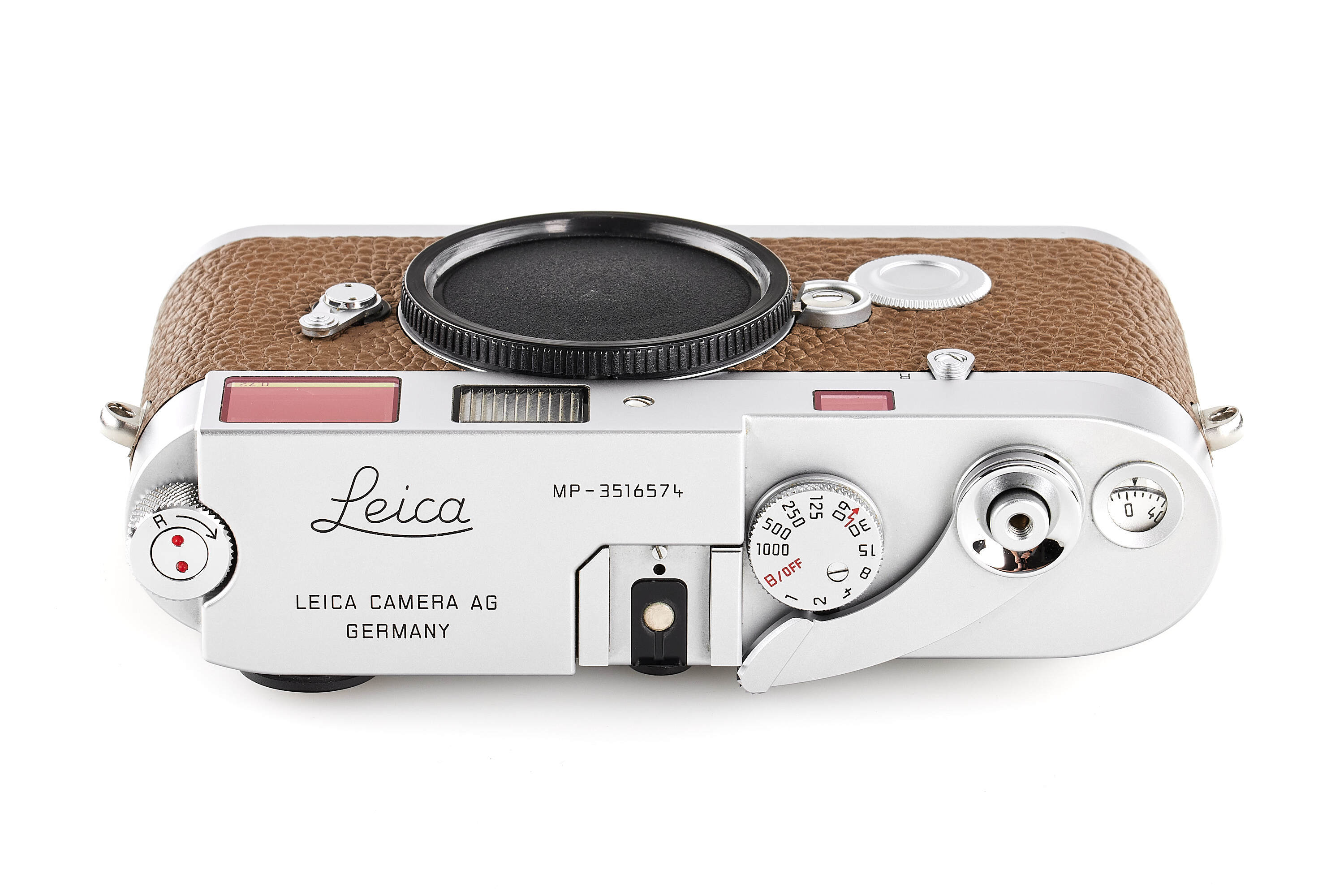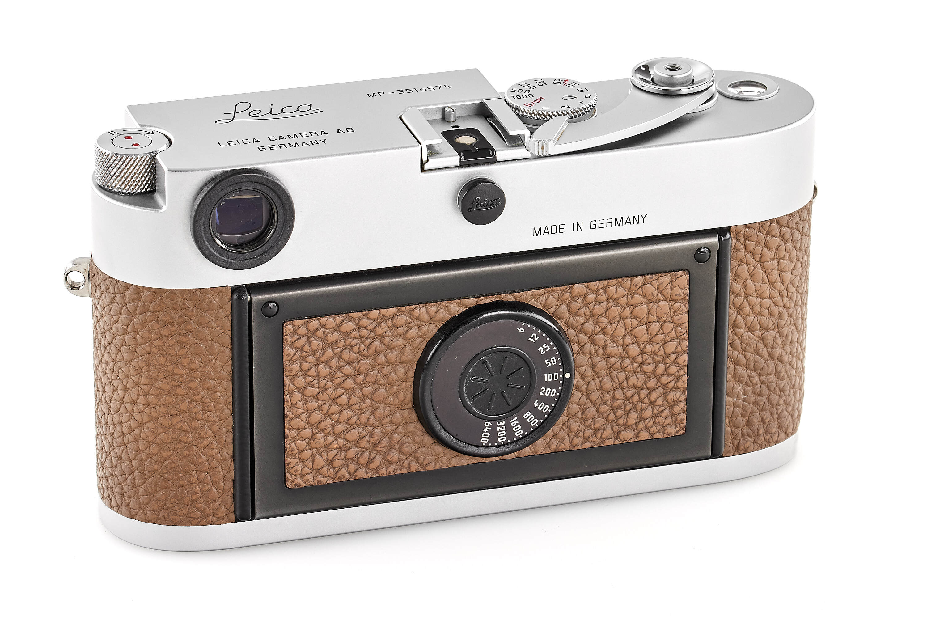 A beautiful, official 'à la carte' version of the Leica MP, featuring a 0.72 finder and special leather covering that resembles the early version of olive M cameras. In near-mint condition, with accessories, papers and maker's box.
