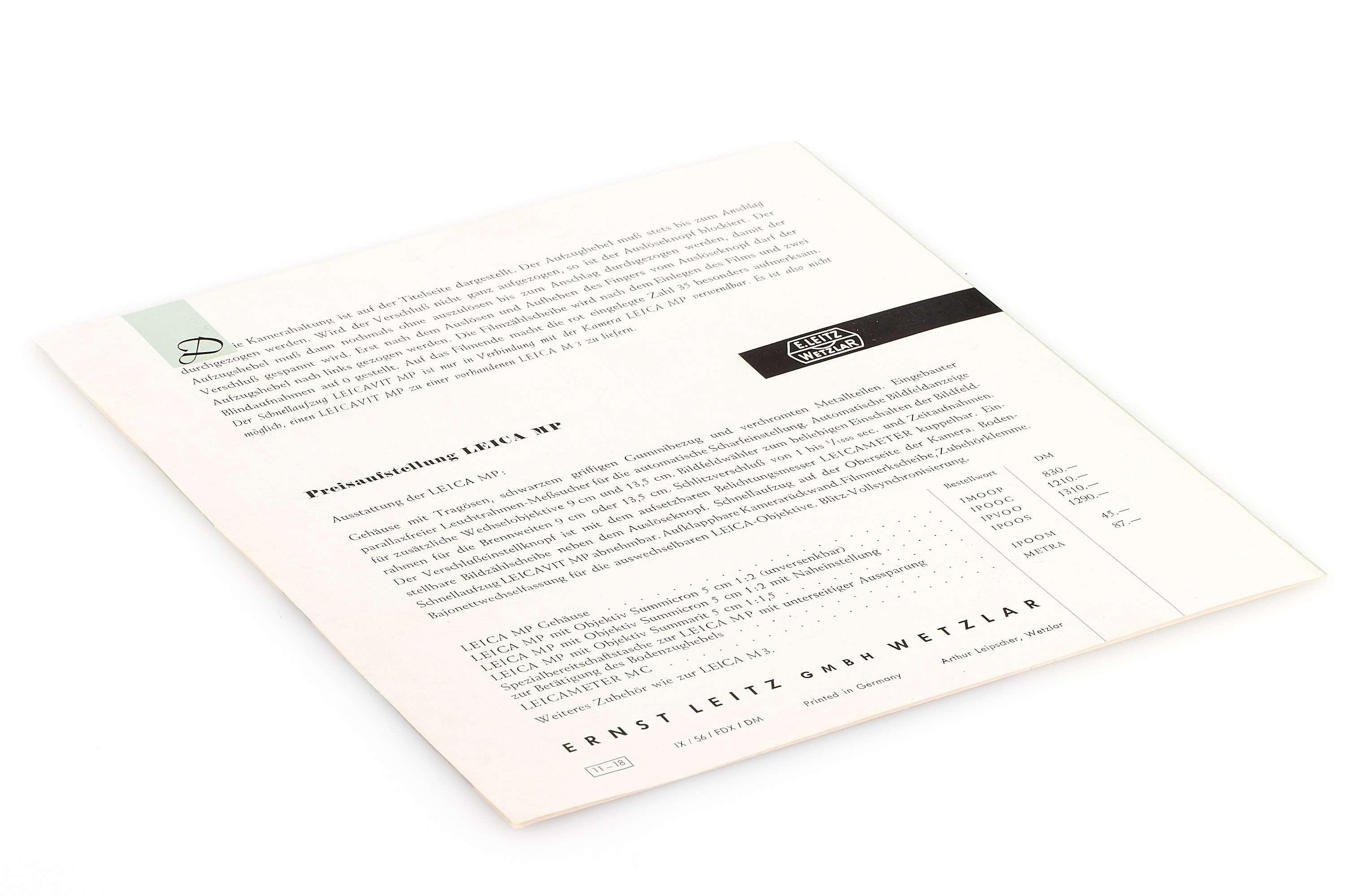 Rare Leica MP brochure, German version in absolutely mint condition, without perforations.