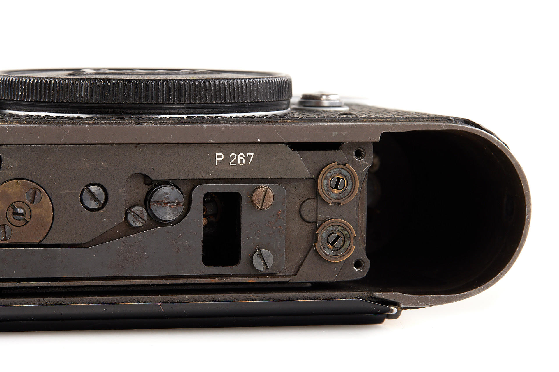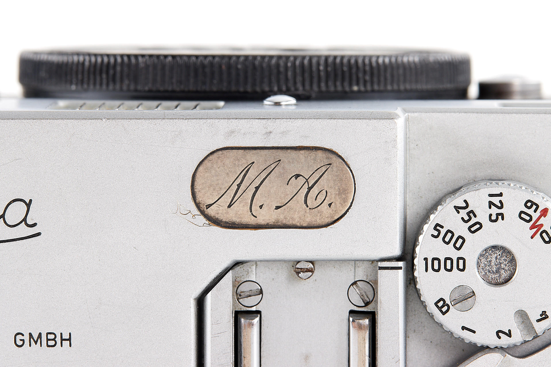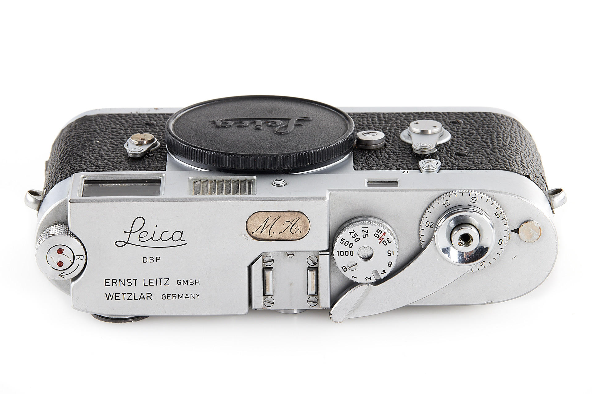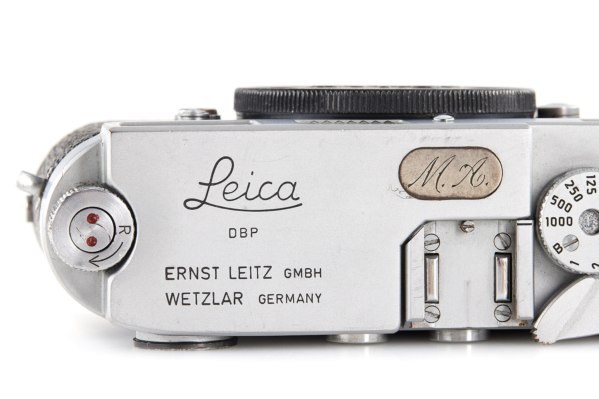 The MP SP was a very rare version of a Leica MP, made exclusively to special order, featuring M2 mechanics with special engraving on the top plate, there is 'P 267' serial number still engraved inside, the number of the top plate has been removed and replaced with a sterling silver plaque with initials 'A.M.'. The camera has been originally delivered to Manca, New York (delivery date 12.08.1957) as a Leica MP chrome and was later converted to a MP SP.