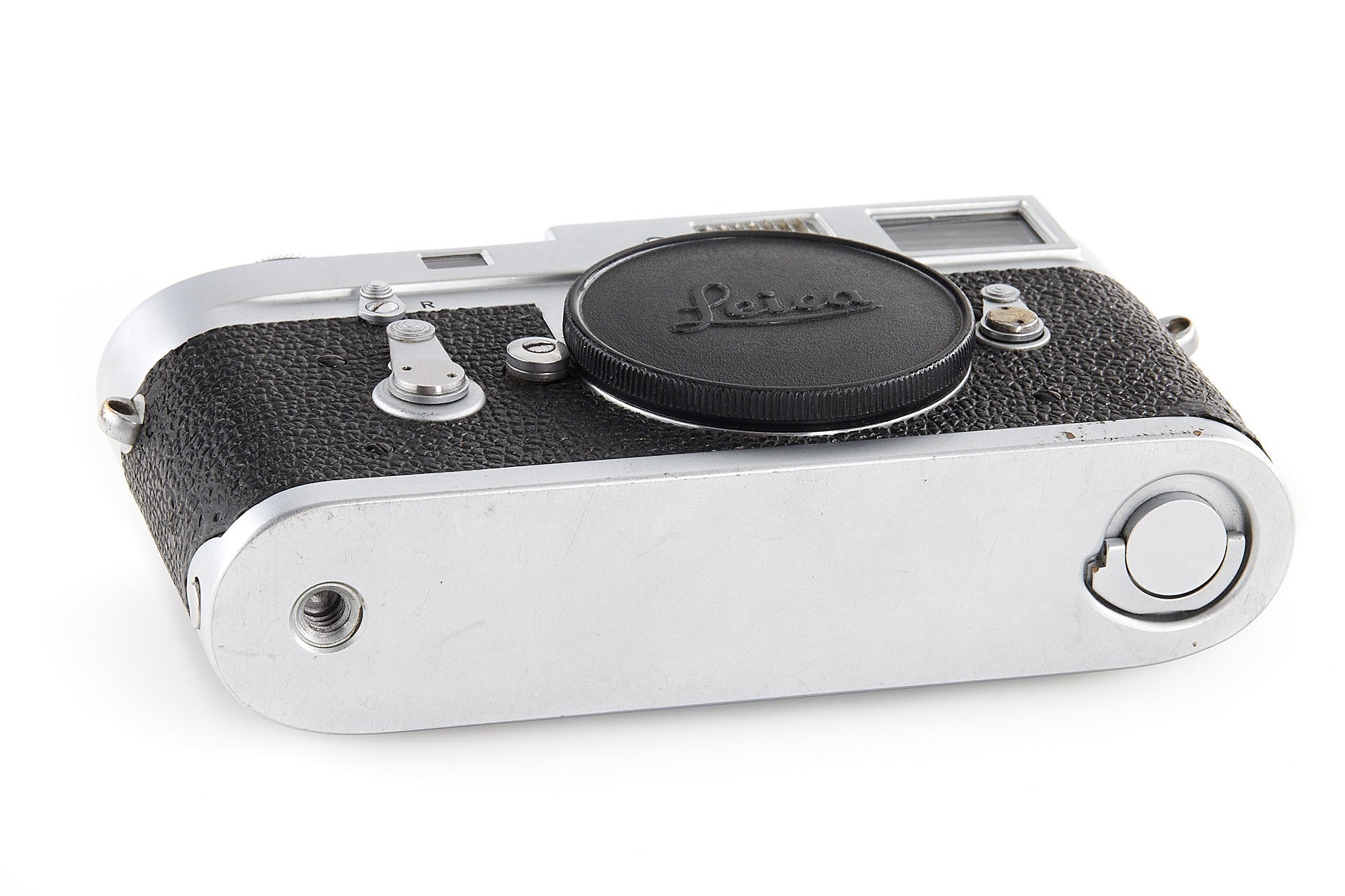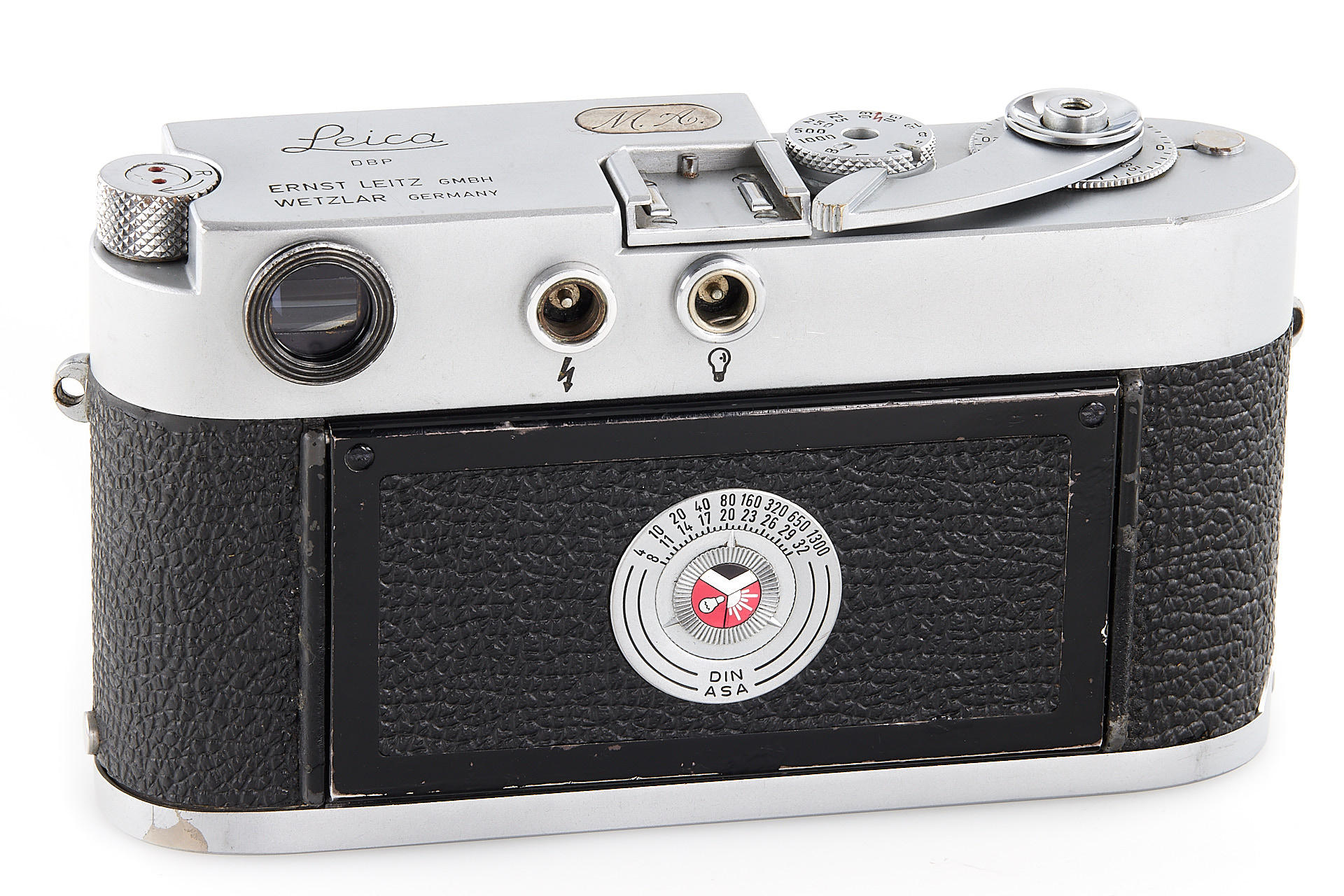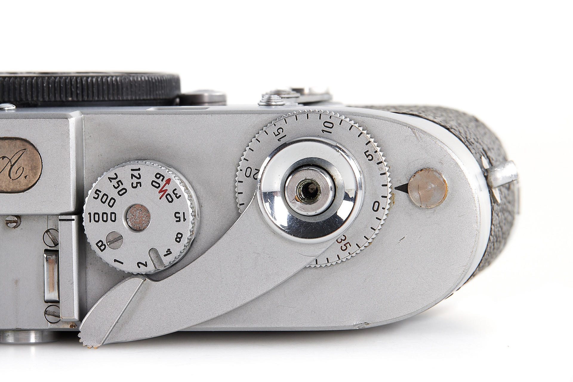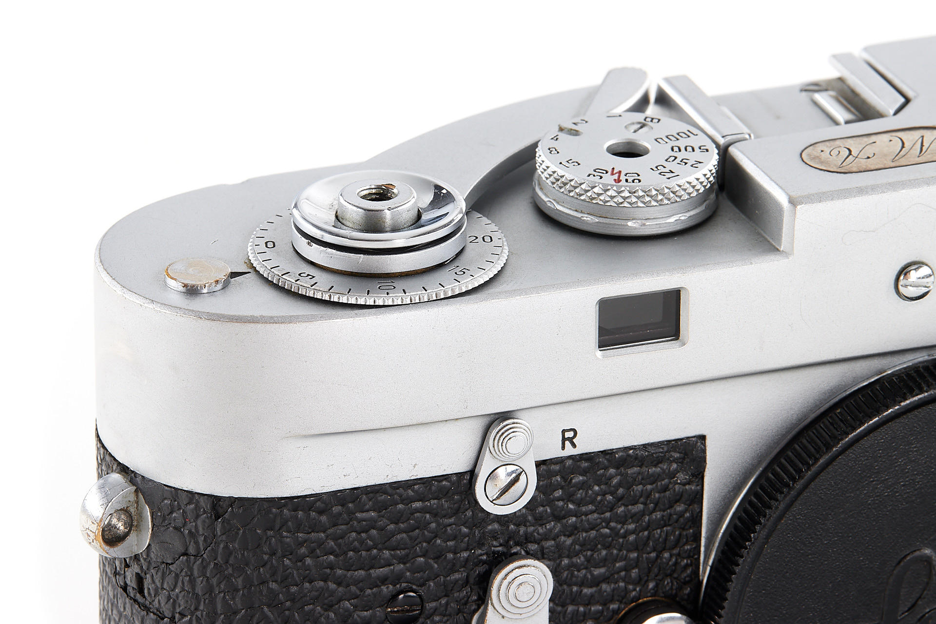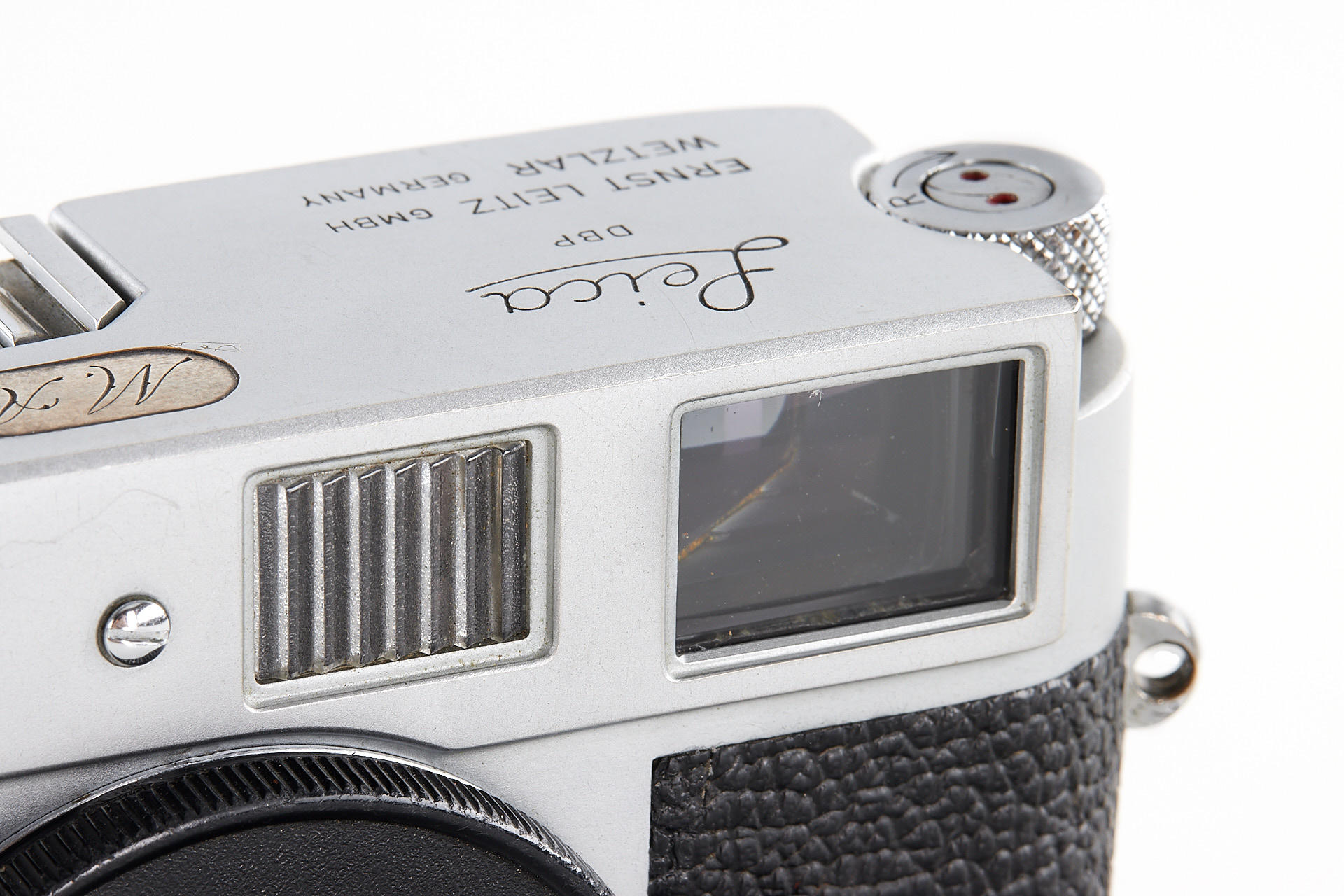 The MP SP was a very rare version of a Leica MP, made exclusively to special order, featuring M2 mechanics with special engraving on the top plate, there is 'P 267' serial number still engraved inside, the number of the top plate has been removed and replaced with a sterling silver plaque with initials 'A.M.'. The camera has been originally delivered to Manca, New York (delivery date 12.08.1957) as a Leica MP chrome and was later converted to a MP SP.