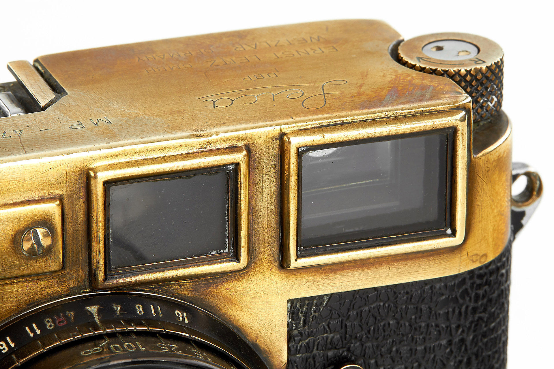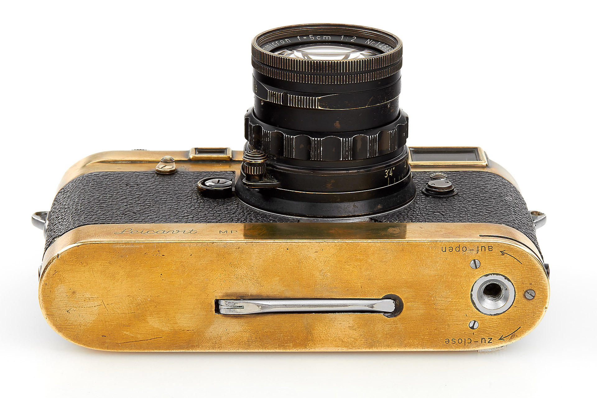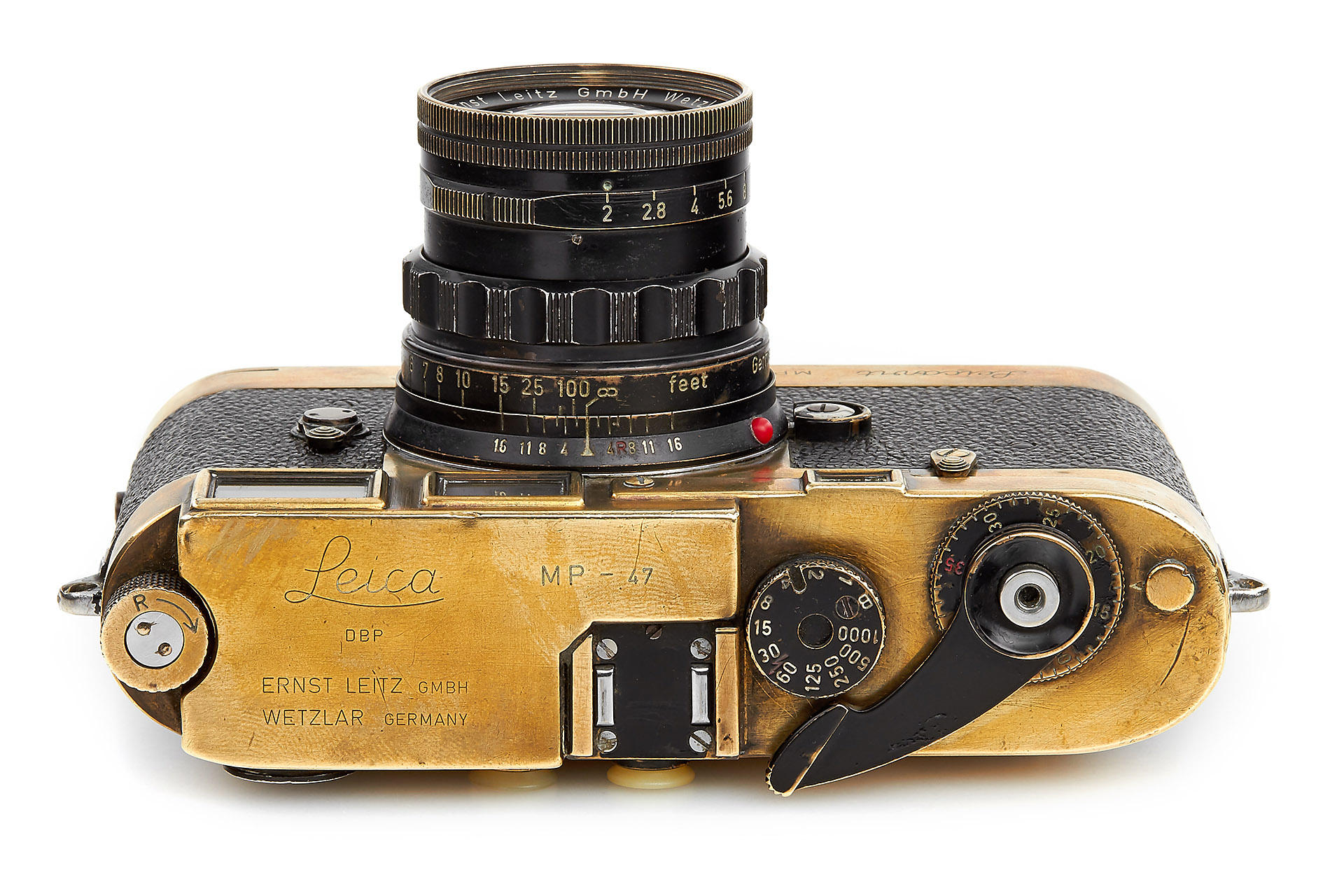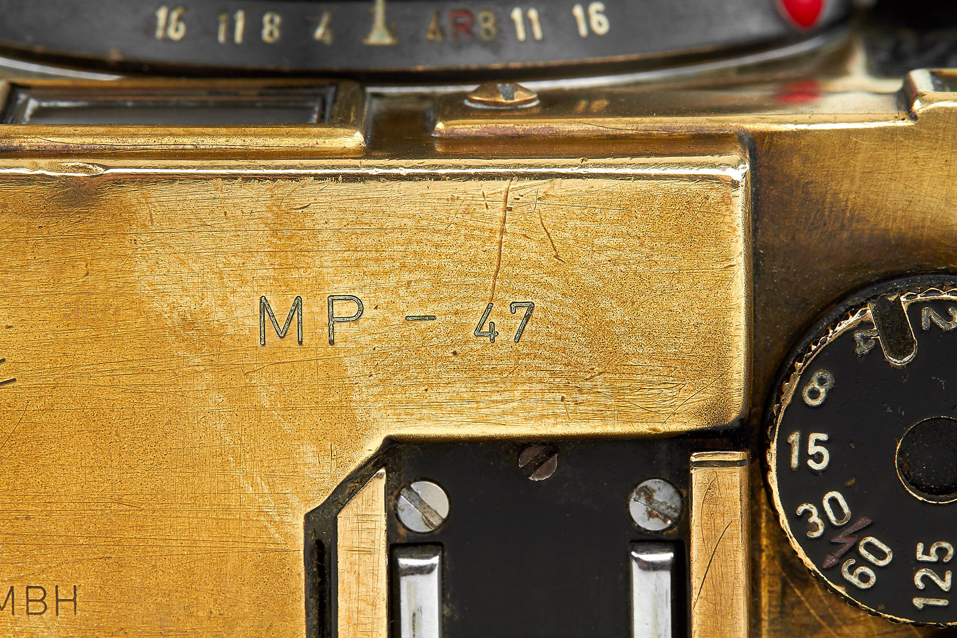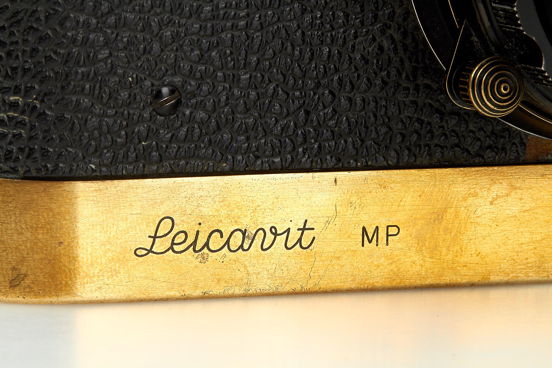 original black paint MP delivered to New York in 1957 (codename IMOOP - Leica MP with Leicavit base), owned and used by French Photographer Gérard Bois (Gérard-Aimé, 1943-2018), known for his press coverage of the volatile period of civil unrest in France 1968, the camera has been in the possession of the photographer over a period of 50 years, he also decided to remove the disappearing rests of black paint from the top plate and from the Leicavit, despite the enormous wear the camera is still in perfect working condition, upgraded to single stroke. Included is a rare black paint, brass mount Summicron 2/5cm no.1468967 (fine original condition, good optics). Only 141 black paint MP cameras have been made, most of them have been sold to professional photographers - it is one of the most iconic Leica cameras.