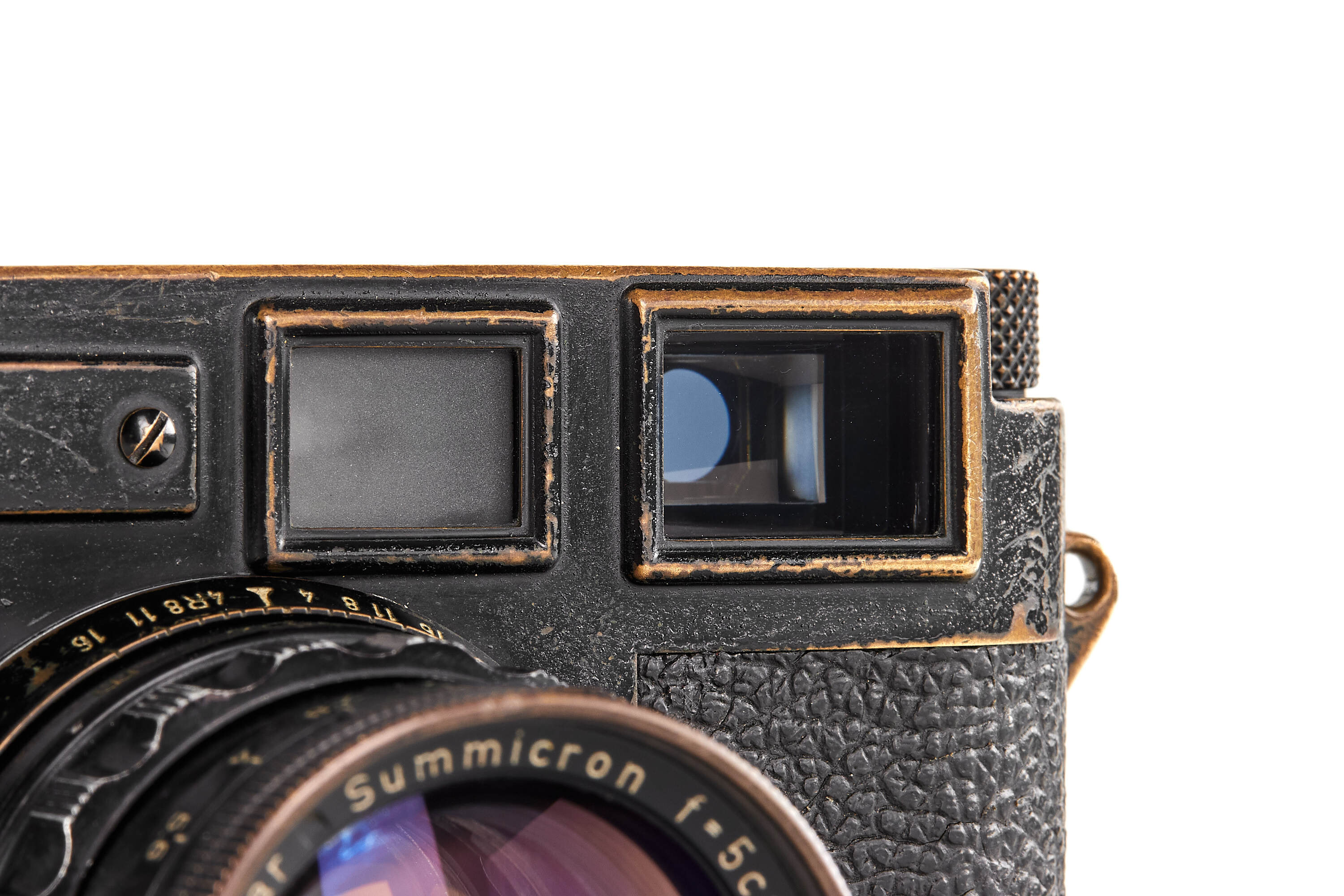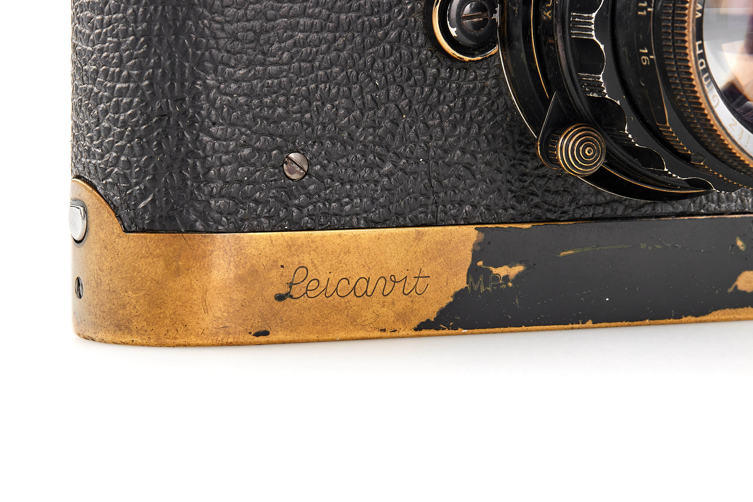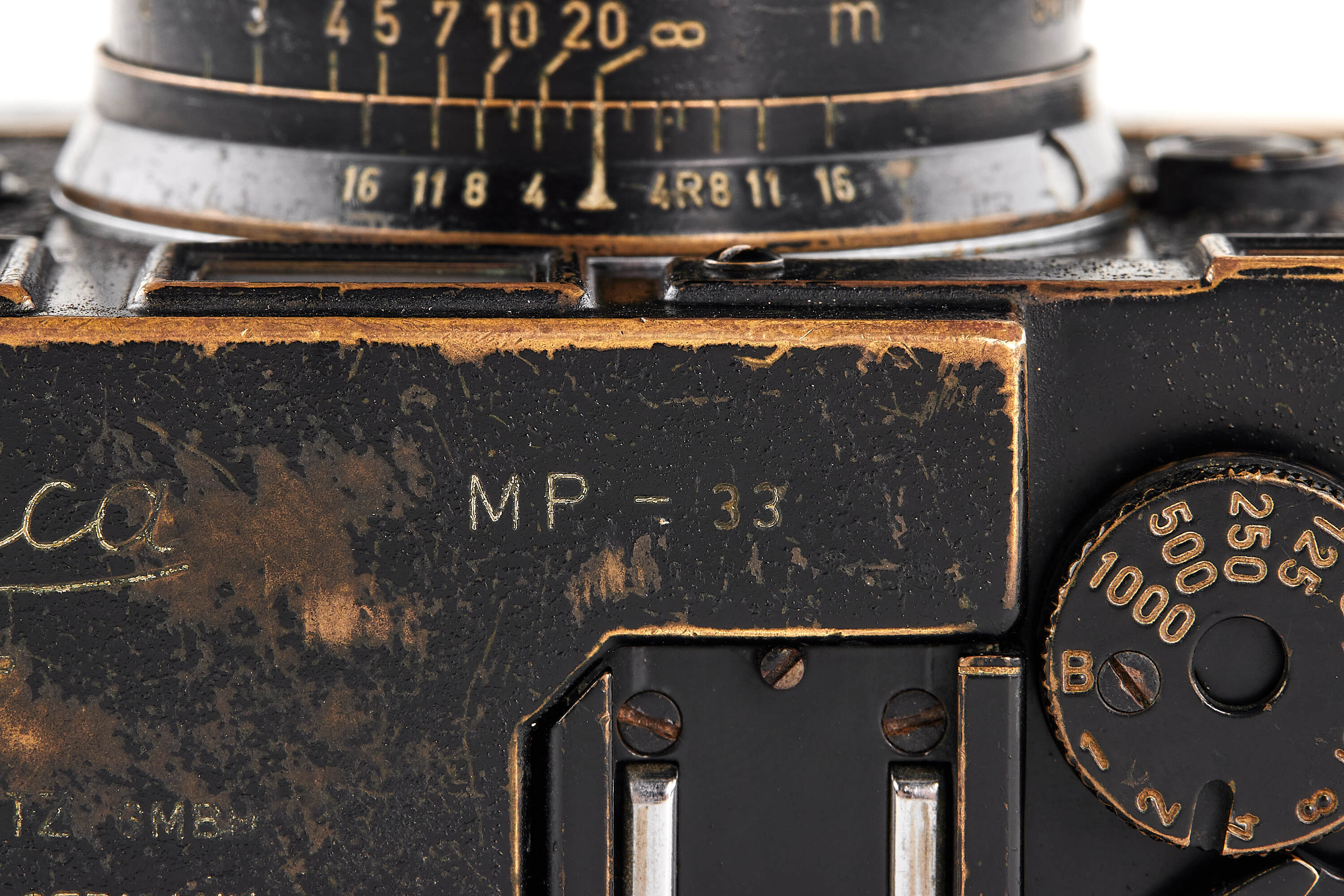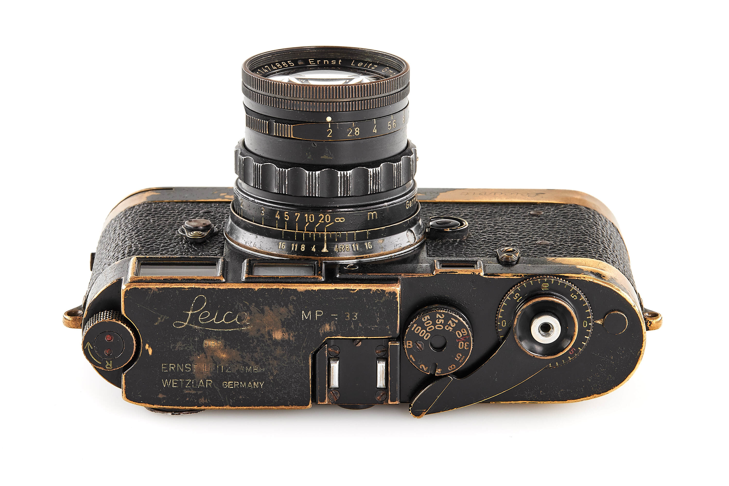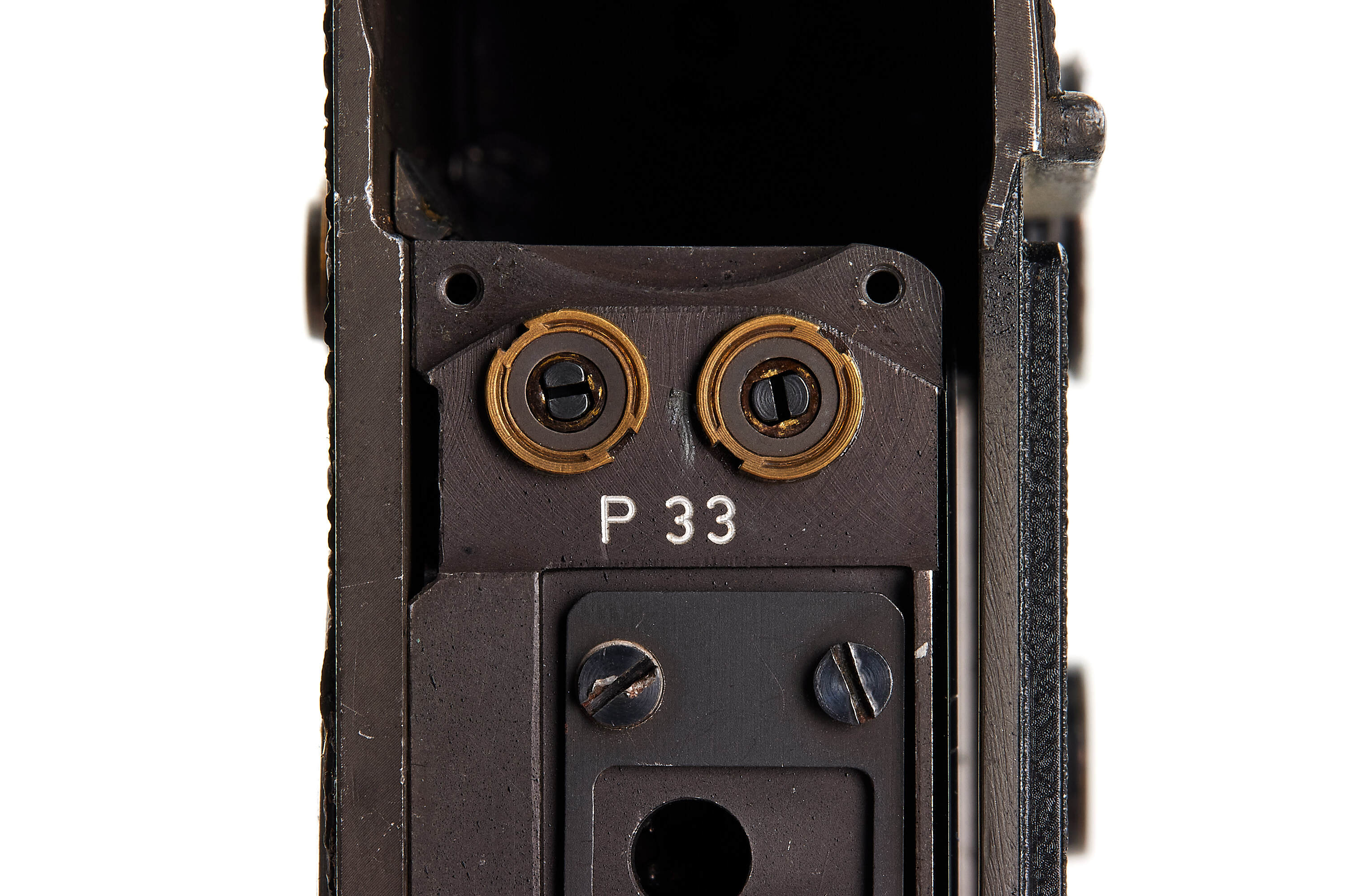 The example offered here, MP no. 33, is a highly desirable black paint version showing the distinctive patina and wear characteristic of years of professional use. Its beautifully aged surface, with subtle paint bubbling and brass highlights, enhances its authentic vintage appeal. The camera was originally delivered to Brandt, Sweden, on 29 July 1957, and is accompanied by a matching black paint Leicavit and a black paint / brass-mount Summicron 2/5cm lens no.1474885, which was delivered to the same dealer only one day later, on 30 July 1957.